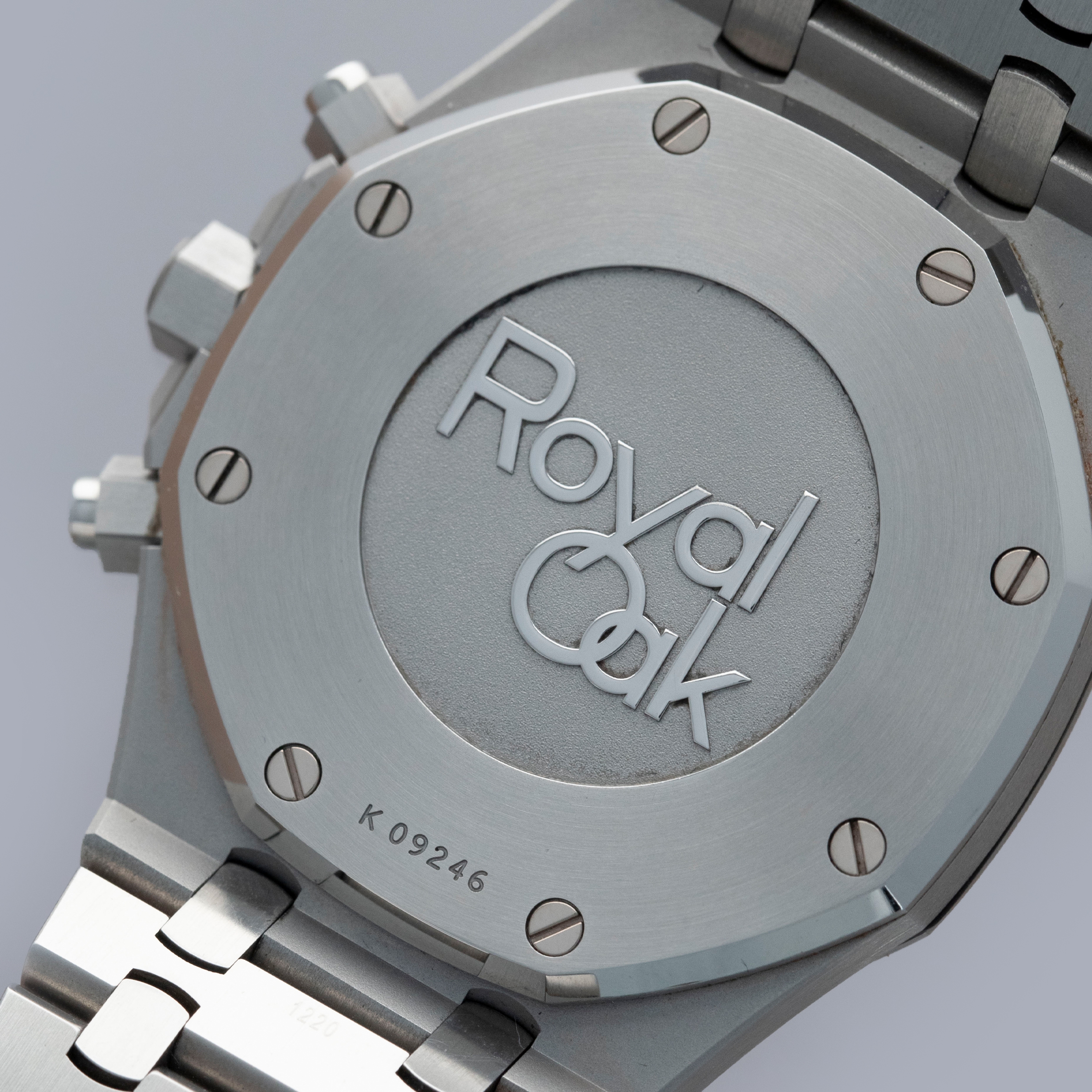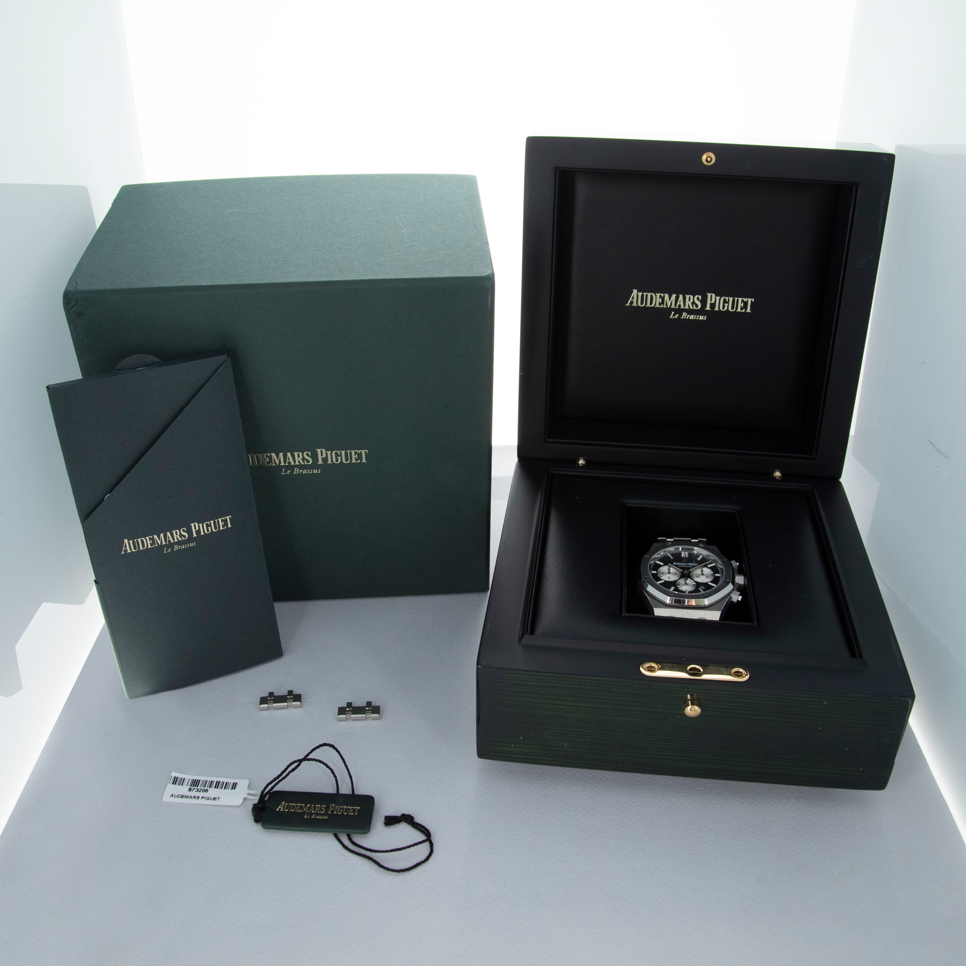 Launched at SIHH 2017 to celebrate the Royal Oak Chronograph's 20th anniversary, the ref. 26331ST features all of the design tenets that have become synonymous with the Royal Oak's construction, such as its angular tonneau-shaped case, octagonal bezel, intricate bracelet and Tappiserie dial. The ref. 26331ST, in particular, features a 'Grande Tapisserie' dial with silver subdials and standing out against a black backdrop that fills the rest of the dial. Presented with its box and papers, and a recent service invoice, this example is a true collector's piece.