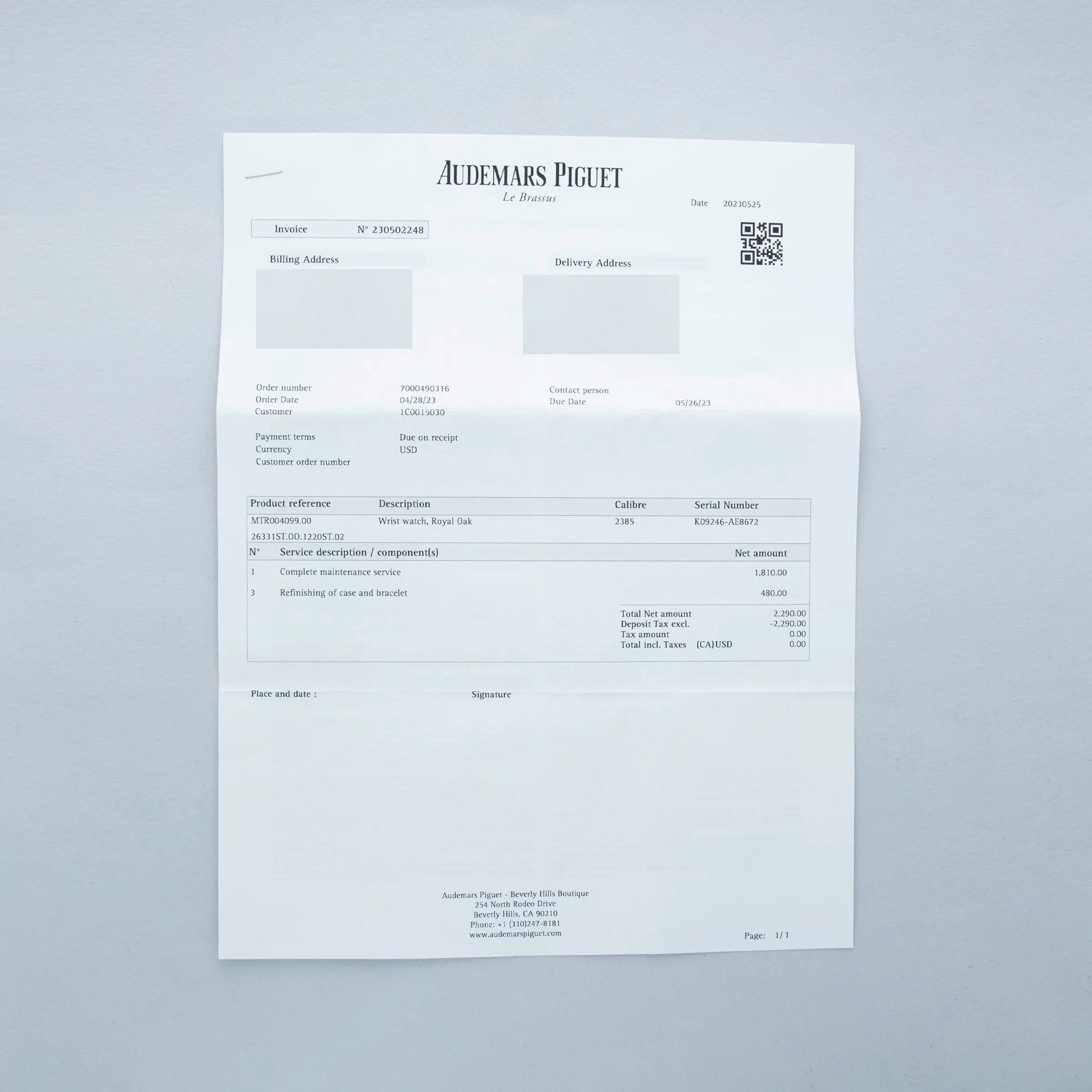The watch is overall in excellent condition. The case is very well defined with good lines, having benefitted from a refinish by AP in 2023 as part of a full service. There are some light marks across the case and bracelet, with some more noticeable scratches and light nicks on the bezel. The dial and hands are near-mint. The bracelet has negligible play between the links. The bracelet currently fits a 7 1/4" wrist and has 19 links, 6 of which are removable. There are 2 additional links included with the watch. Comes with boxes, guarantee, booklets, hangtag and service receipt.