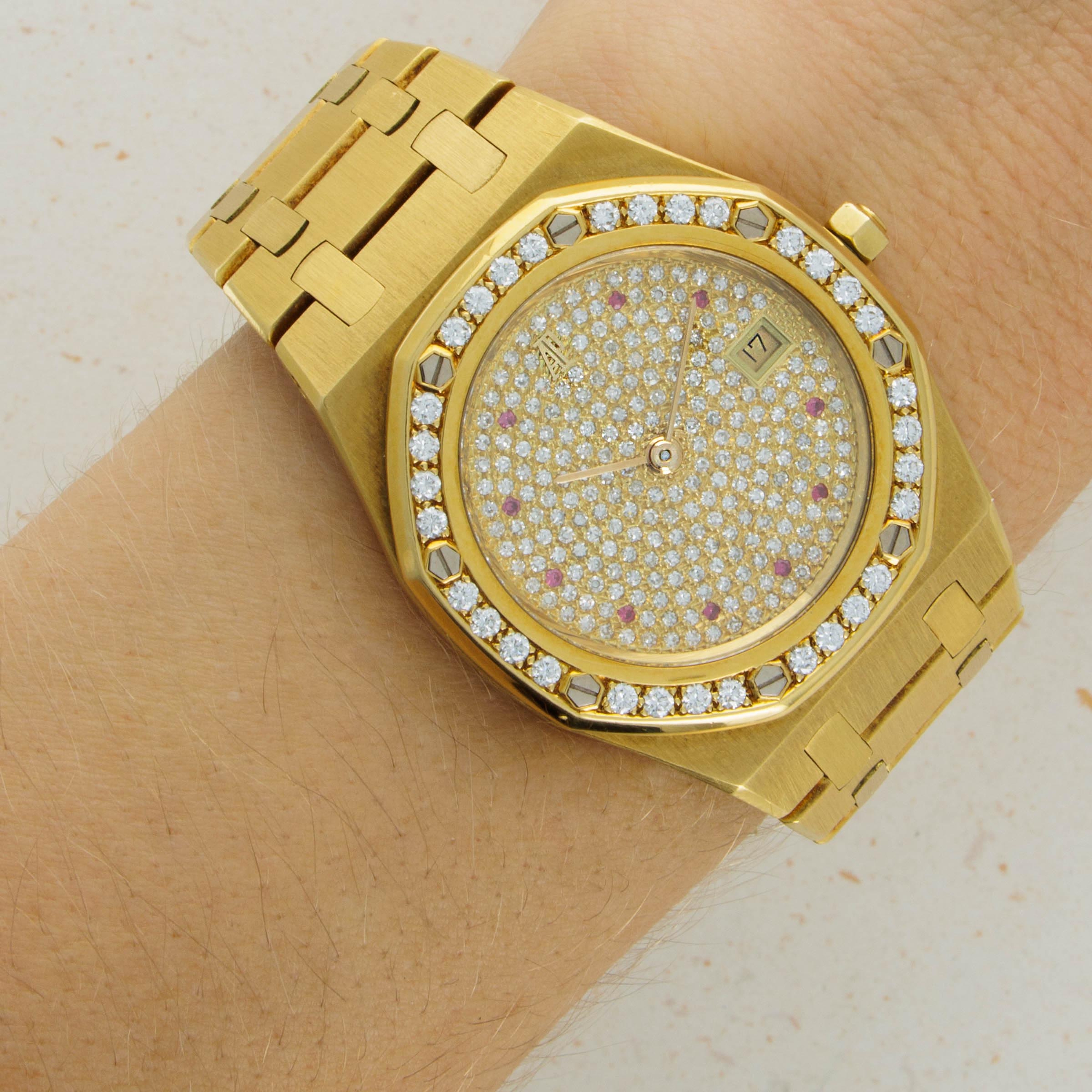 Watch is in excellent overall condition. Case is sharp with small surface wear, there is some light oxidation on the gold surface between some of the links. Diamond bezel showing minimal wear on the edges. The pave set dial with 10 ruby indexes is in near-mint condition. Bracelet has 21 links, 7 which are removable. There is minimal stretch.