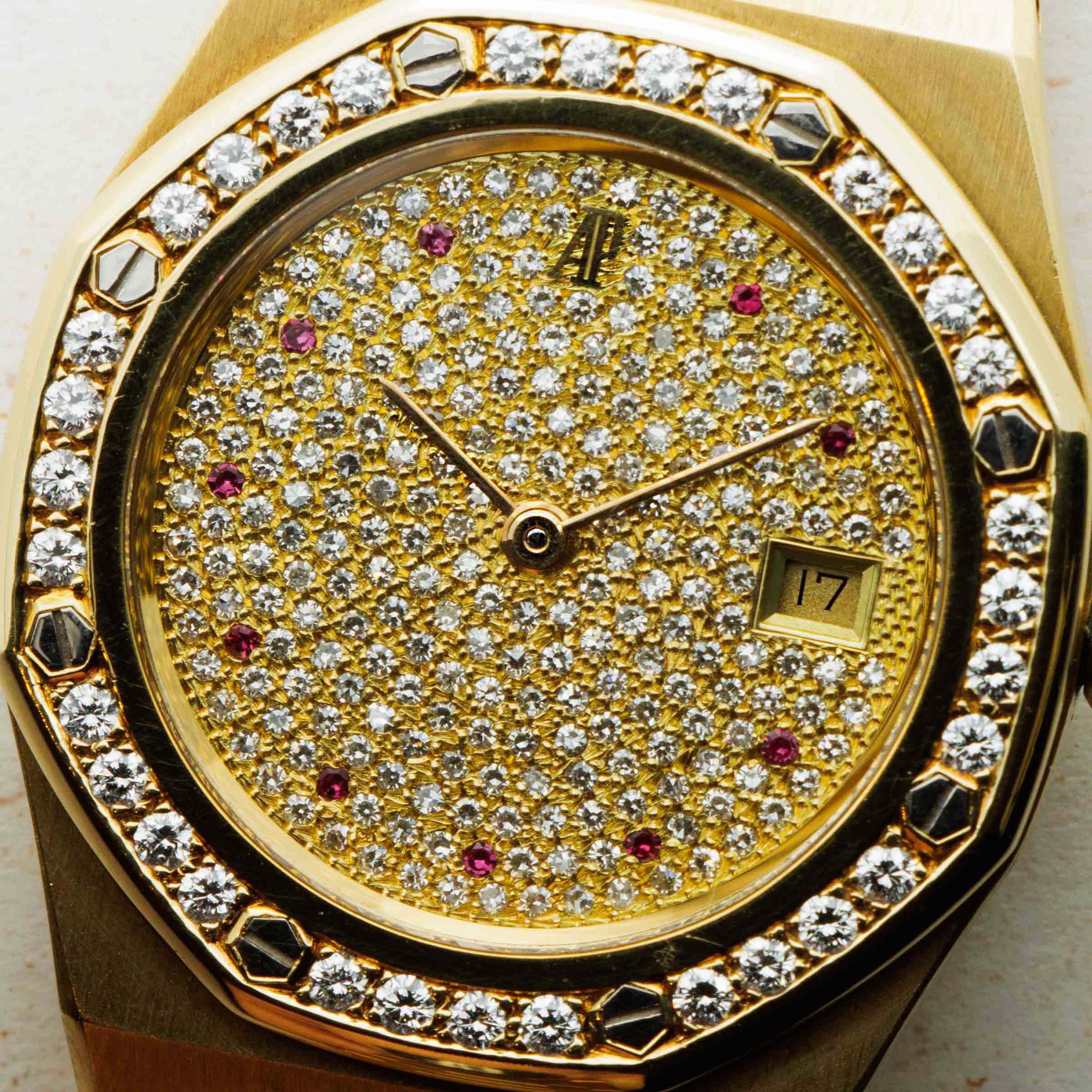 While the Royal Oak's tapisserie dial is one of the hallmarks of its design, this ref. 14587BA's pave dial makes for an incredible aesthetic, with the texture of the gold underneath allowing its diamonds and ruby-set hour markers to really pop.