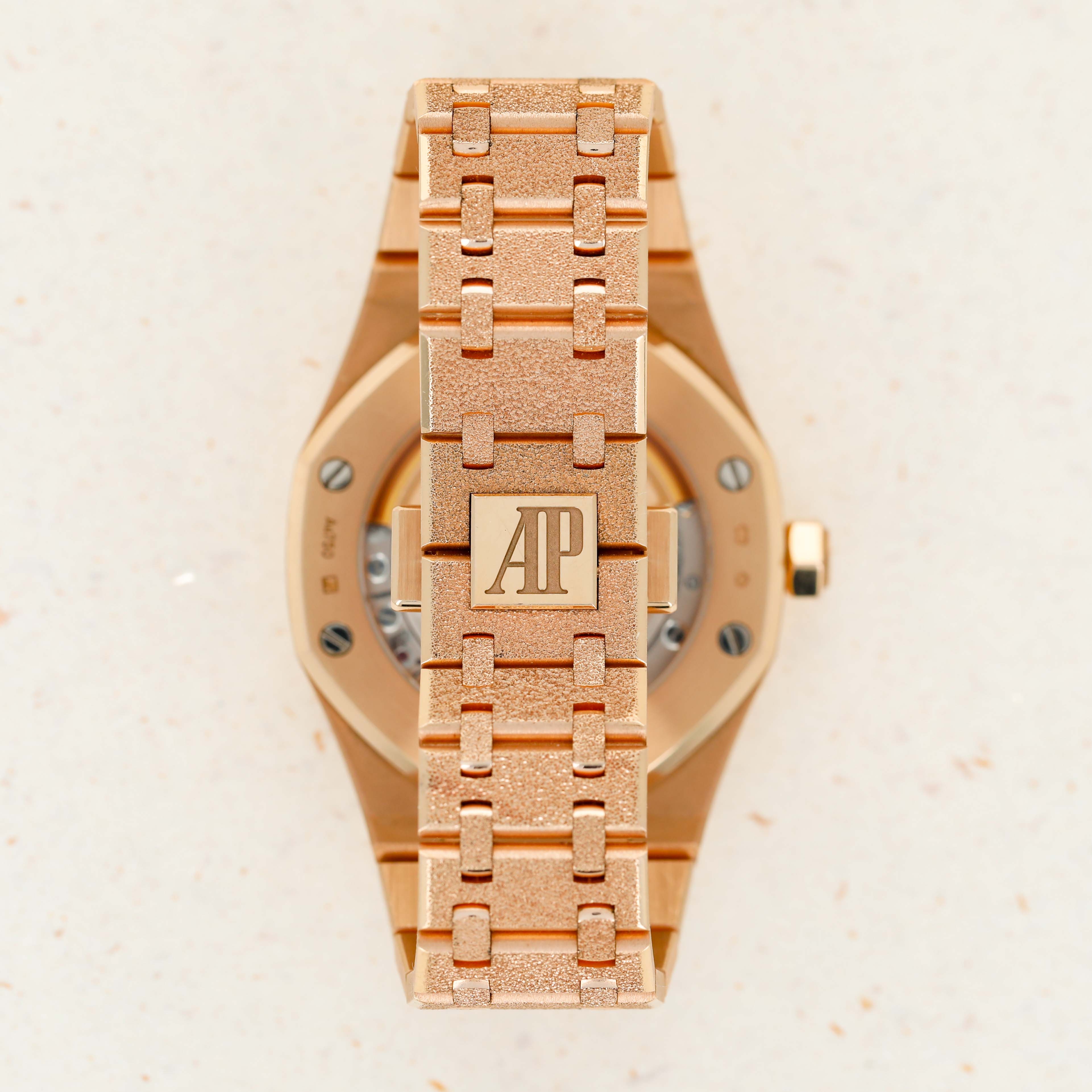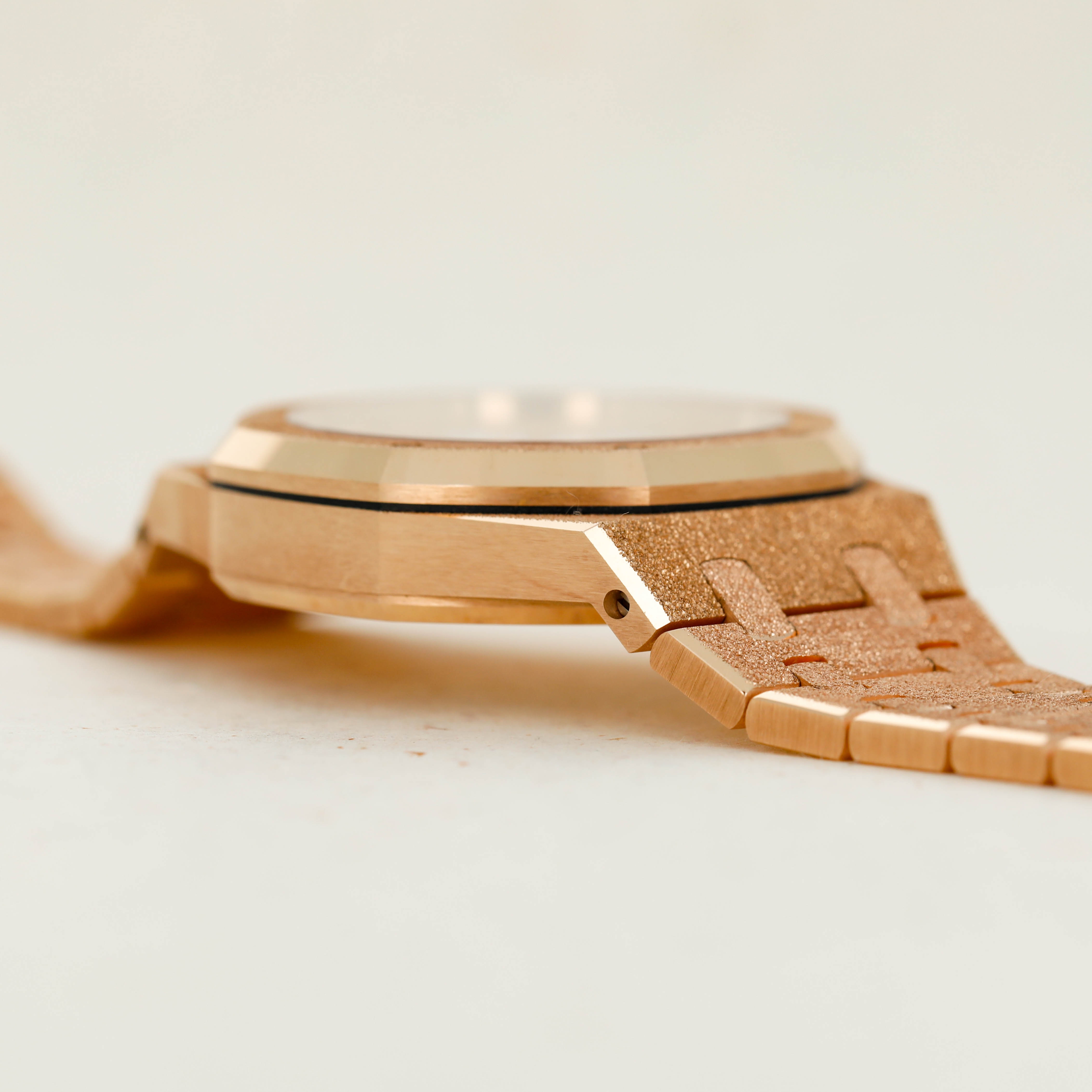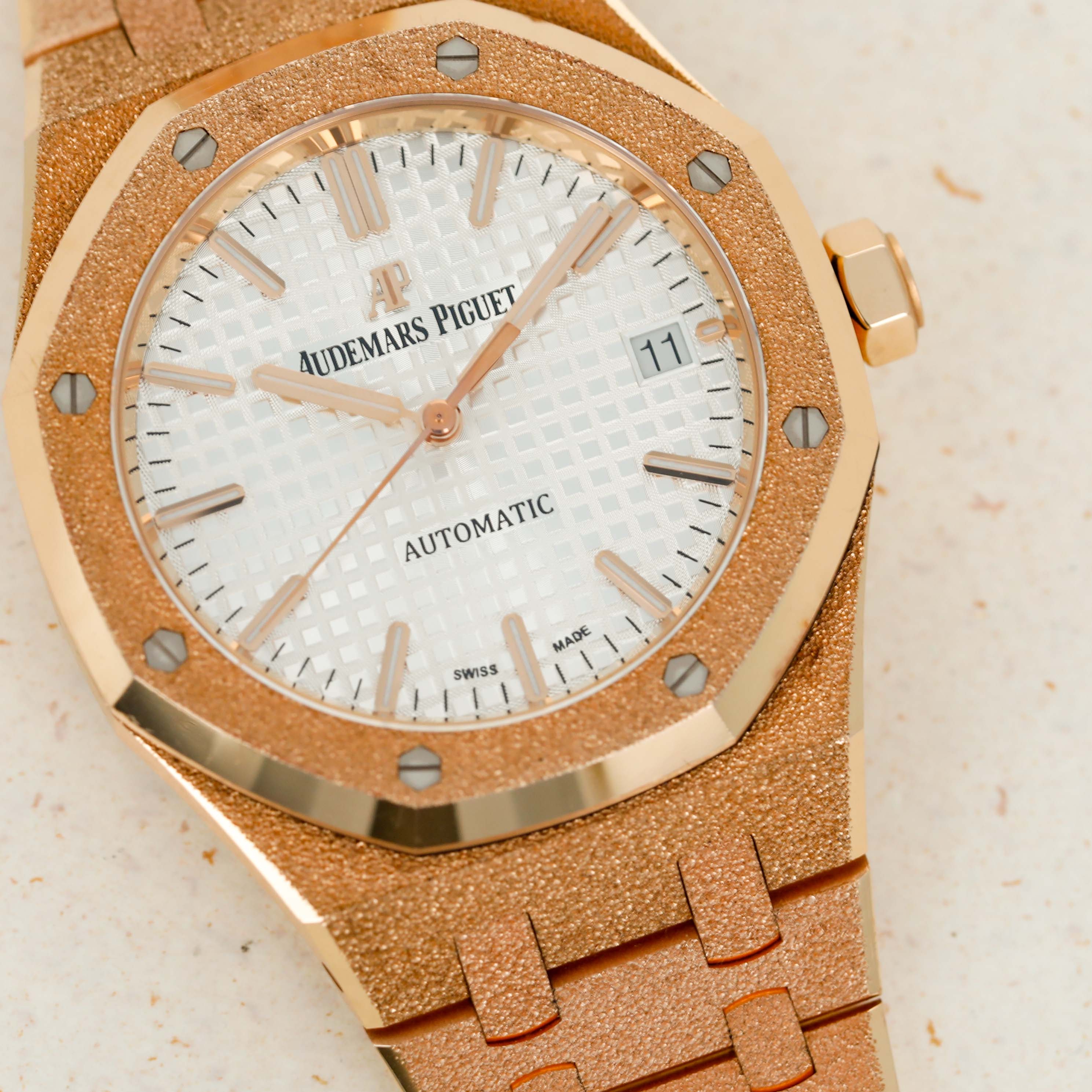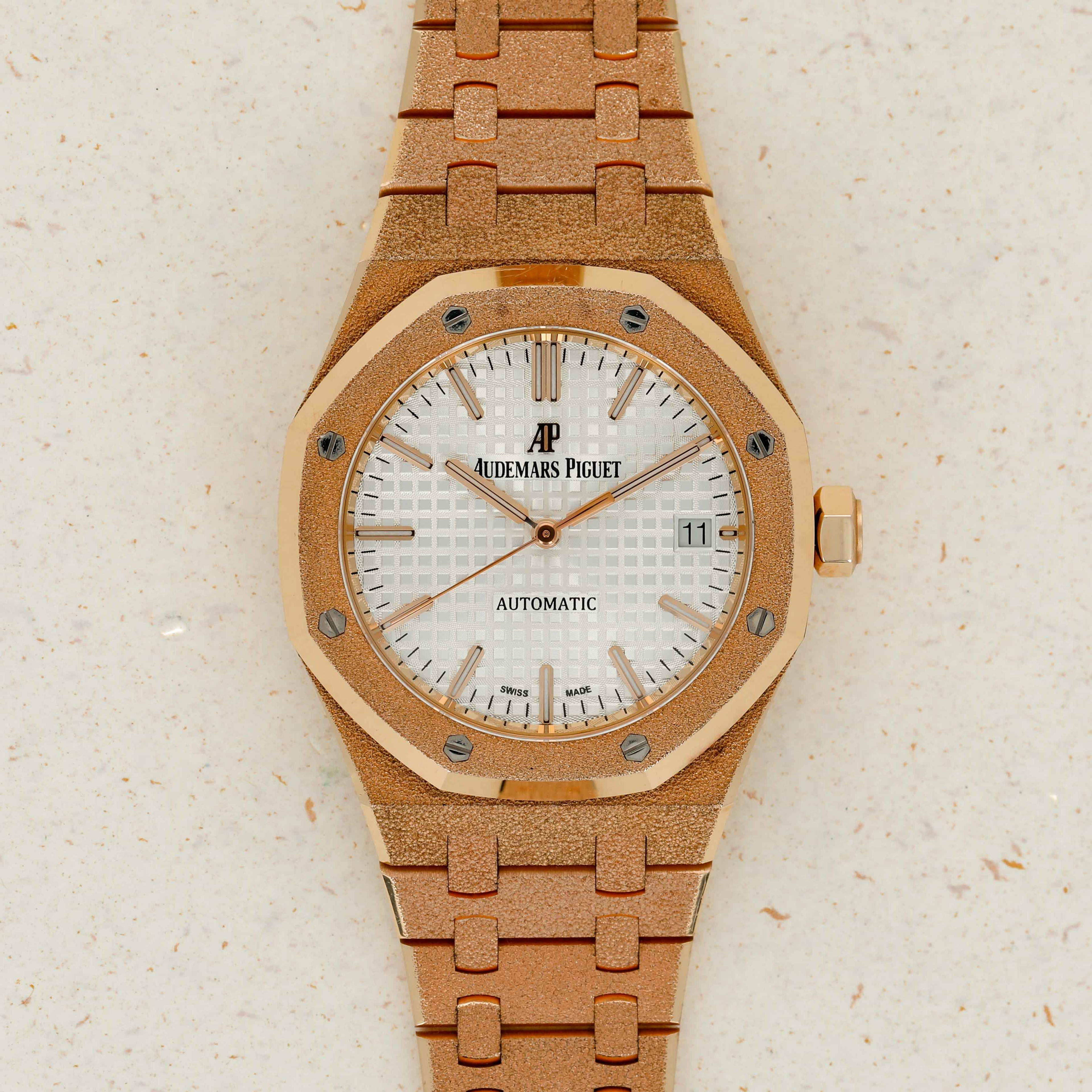 A bright and beautiful watch made all the more special thanks to its unorthodox frosted finish, the ref. 15454OR is a timepiece that combines the Royal Oak's iconic design with an avant-garde aesthetic that speaks to how the Royal Oak came about in the first place, by challenging boundaries and finding out where that takes you.