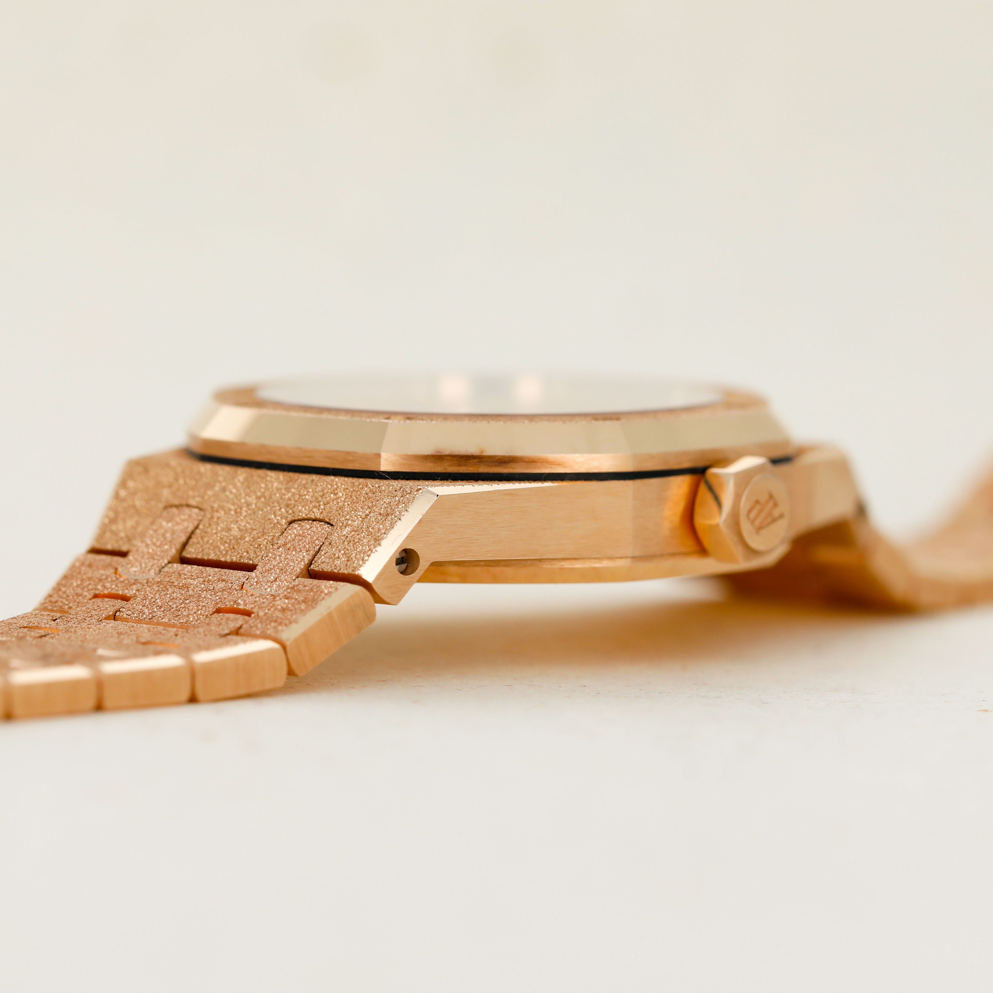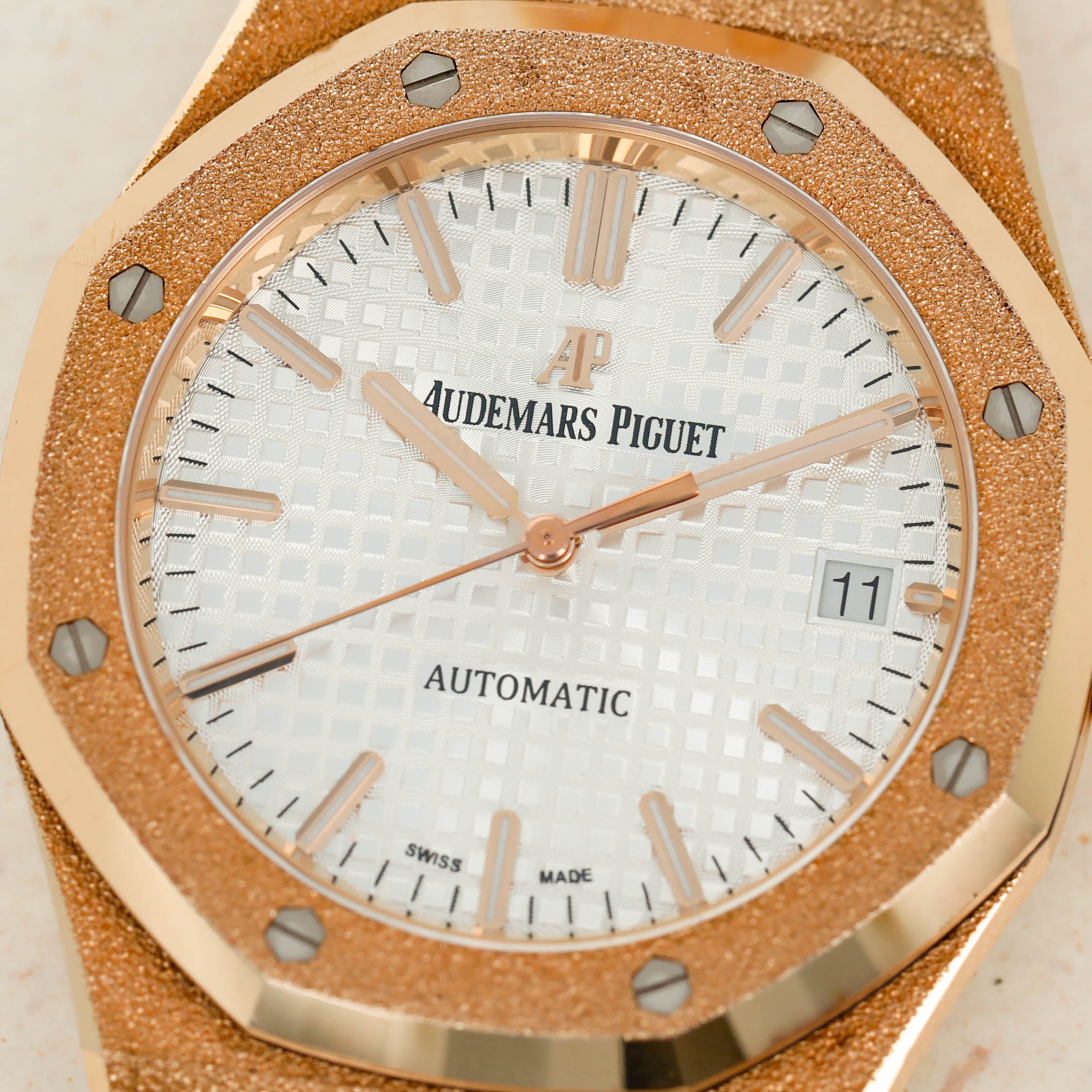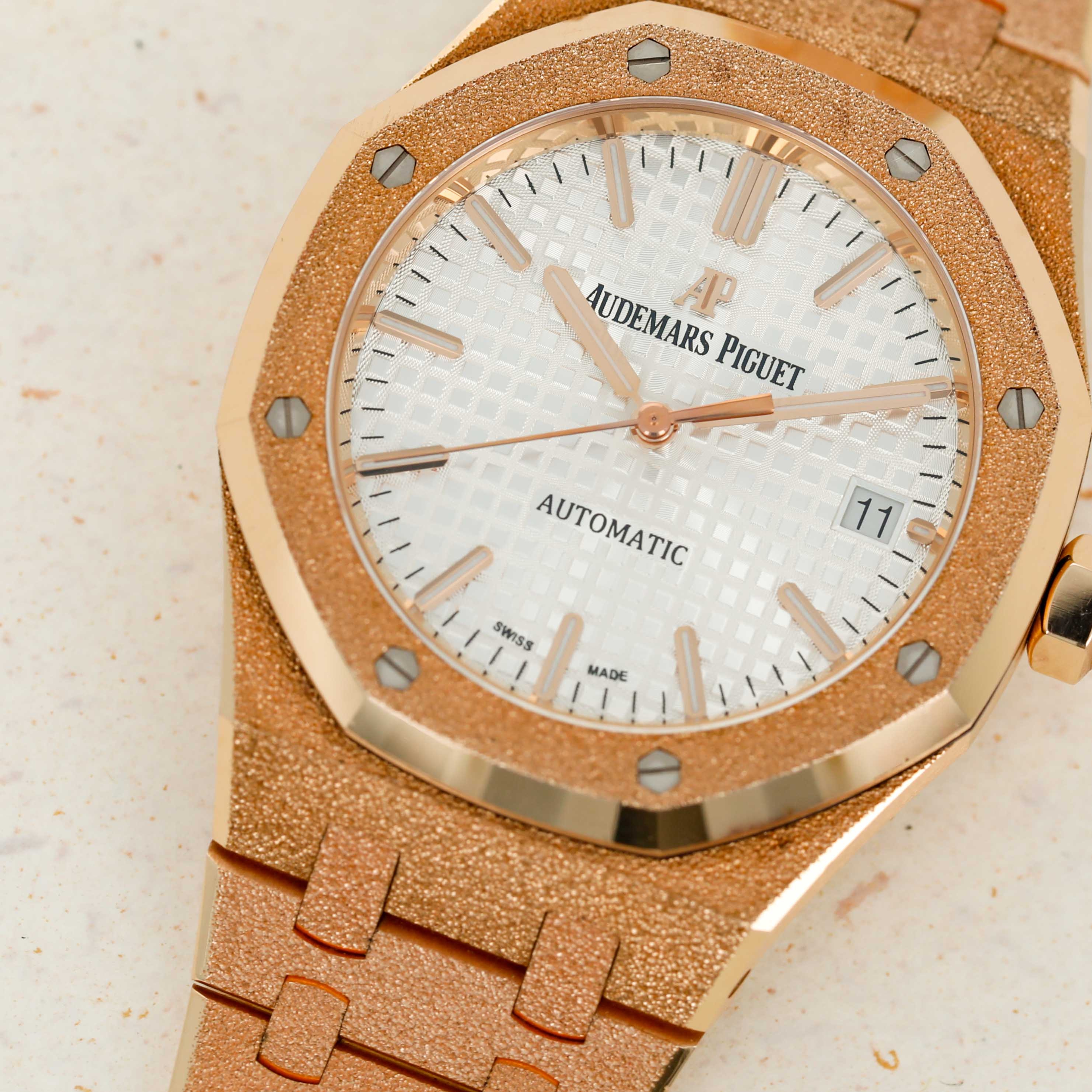 A bright and beautiful watch made all the more special thanks to its unorthodox frosted finish, the ref. 15454OR is a timepiece that combines the Royal Oak's iconic design with an avant-garde aesthetic that speaks to how the Royal Oak came about in the first place, by challenging boundaries and finding out where that takes you.