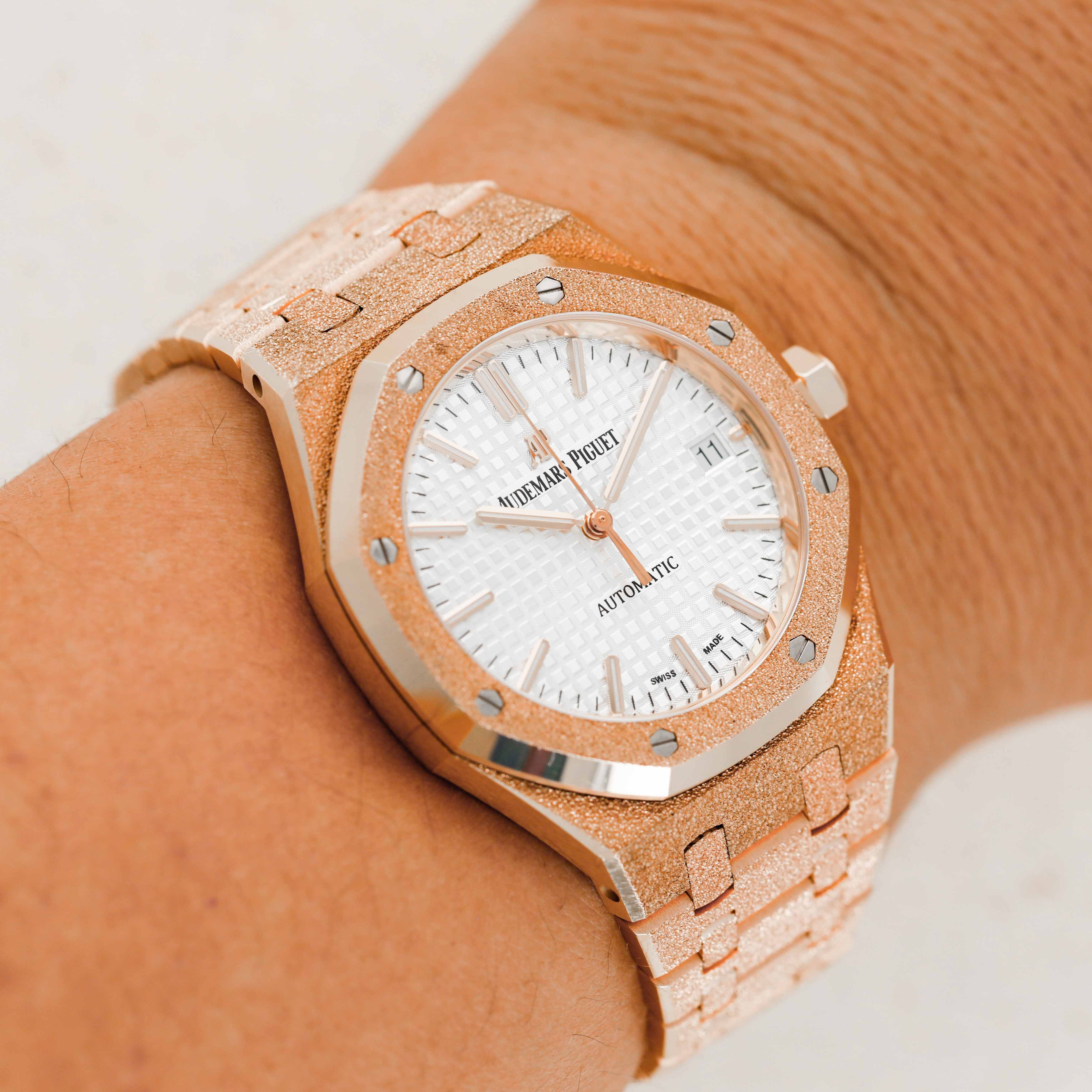 Boasting Carolina Bucci's 'Frosted finish,' this Royal Oak gives the appearance of being diamond-encrusted thanks to how light bounces off the divots and dents found on its surface.