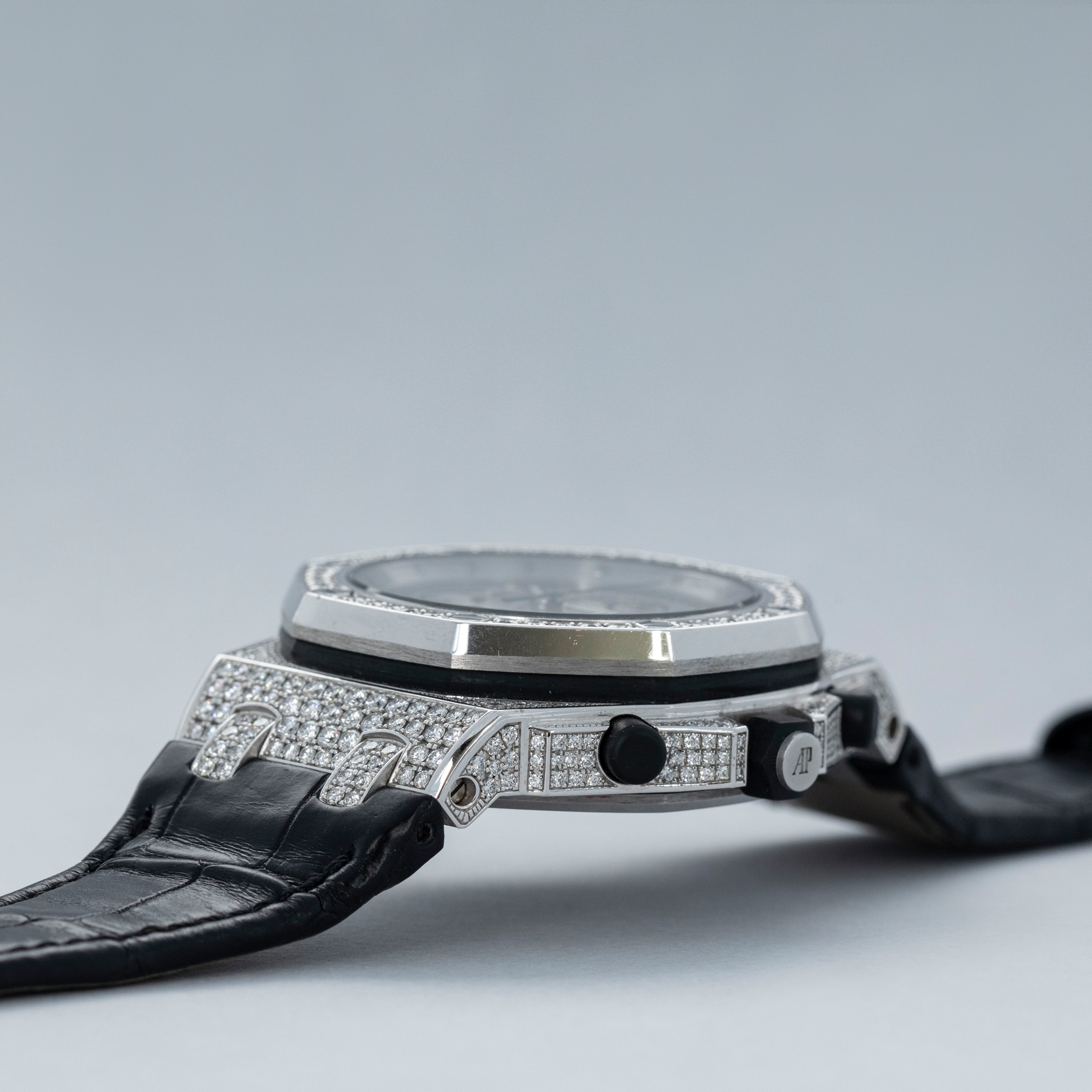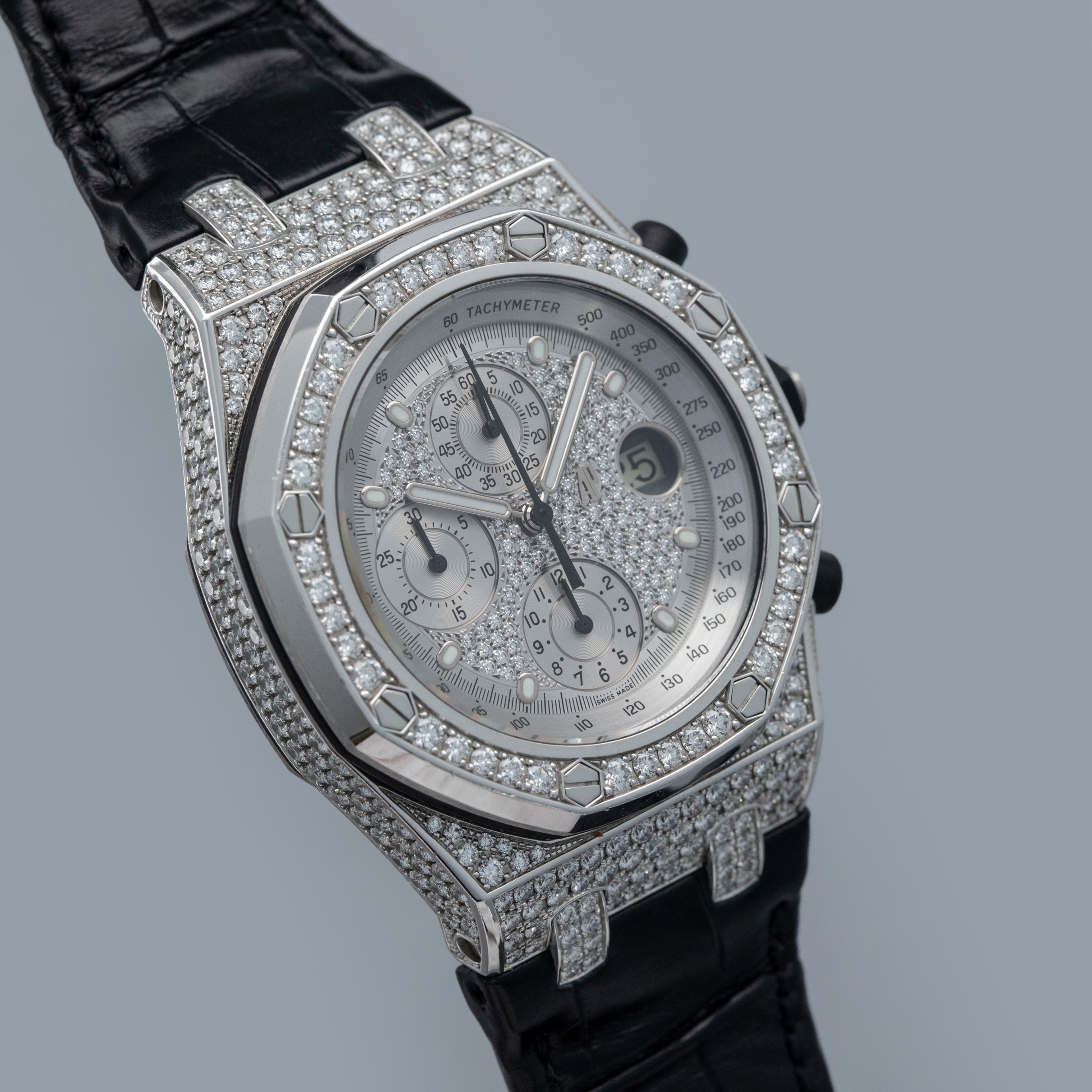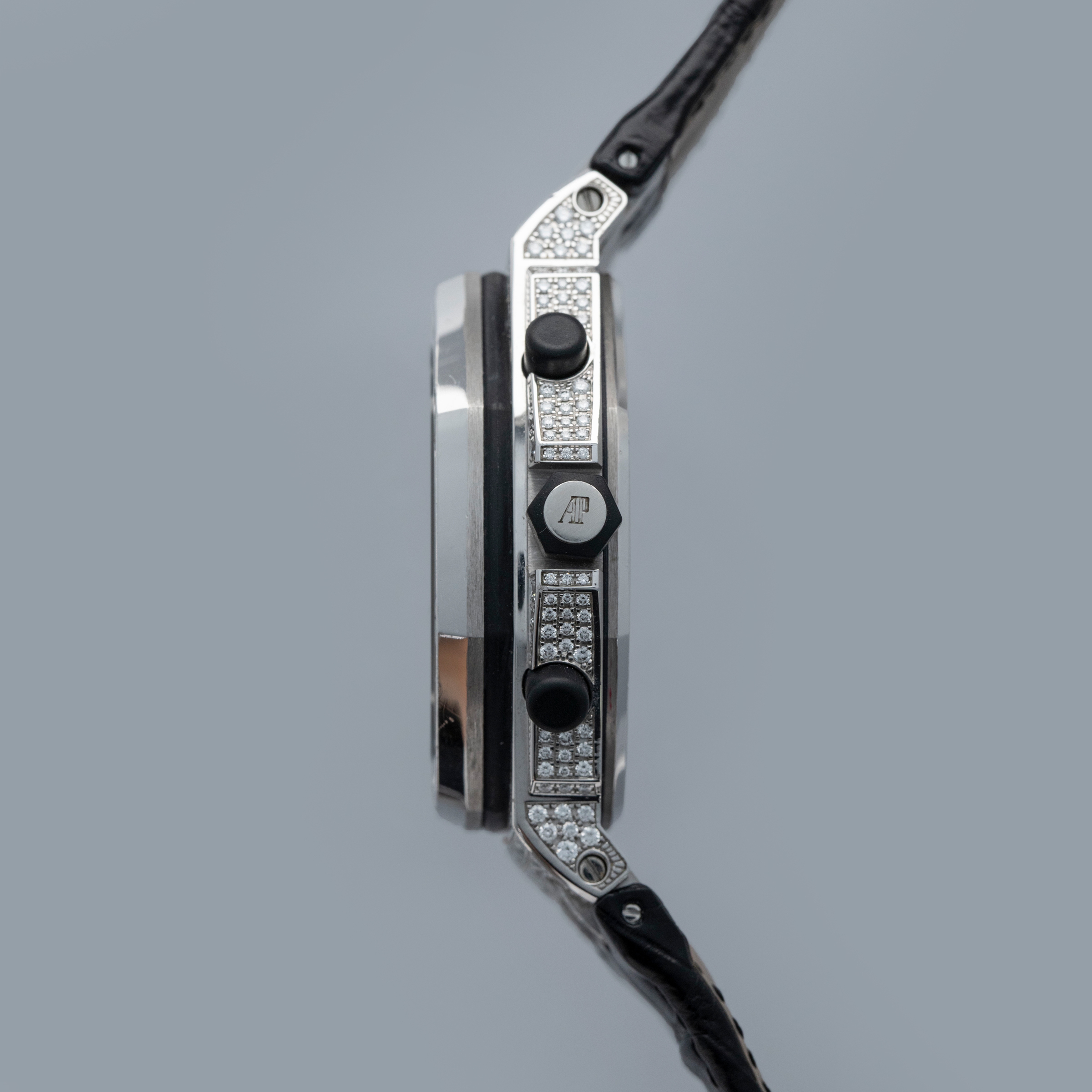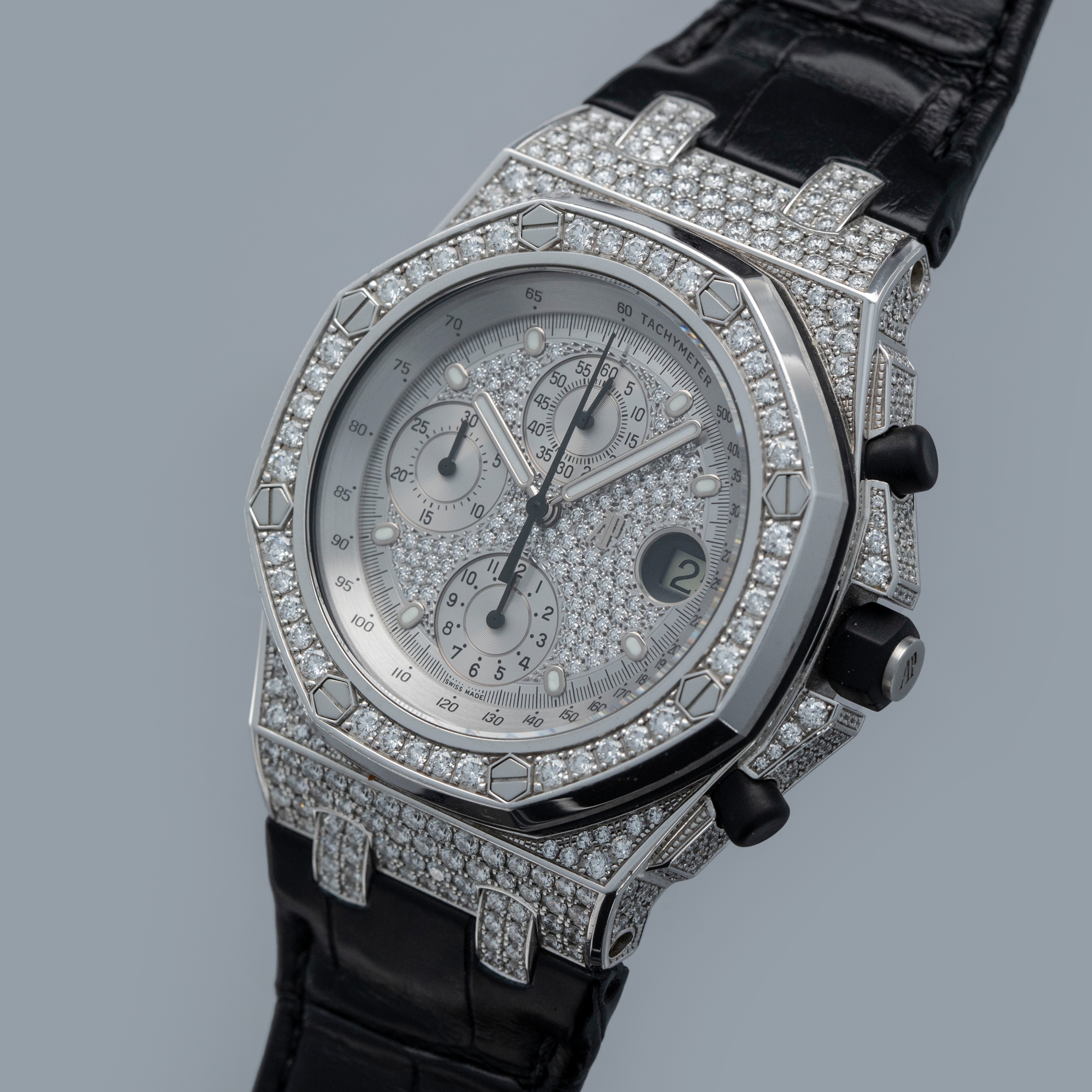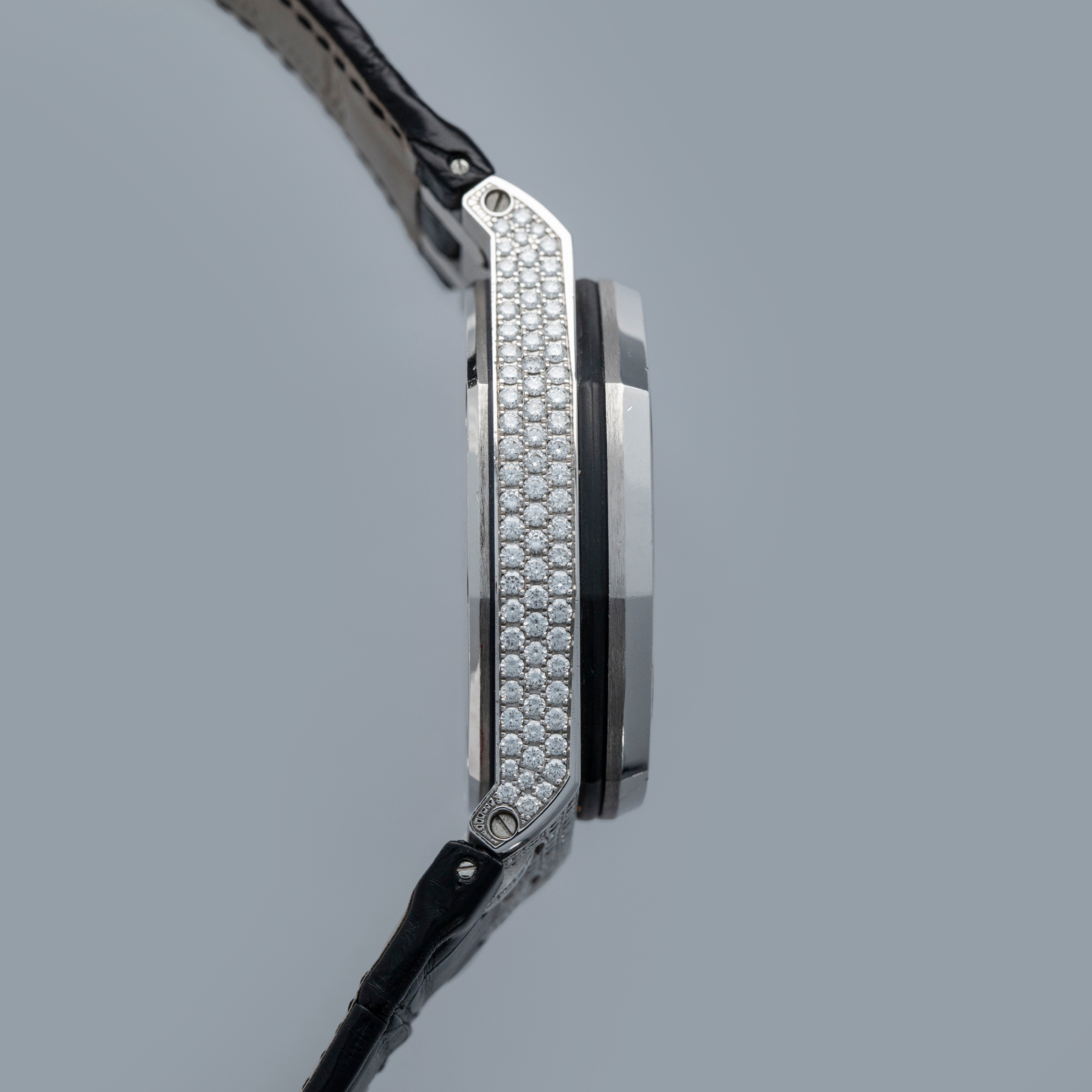 Rich with information thanks to its trio of silver subdials and date aperture complete with a cyclops lens, the ref. 26067BC's display is thoroughly unique thanks to its diamond-set nature, while still being perfectly legible.