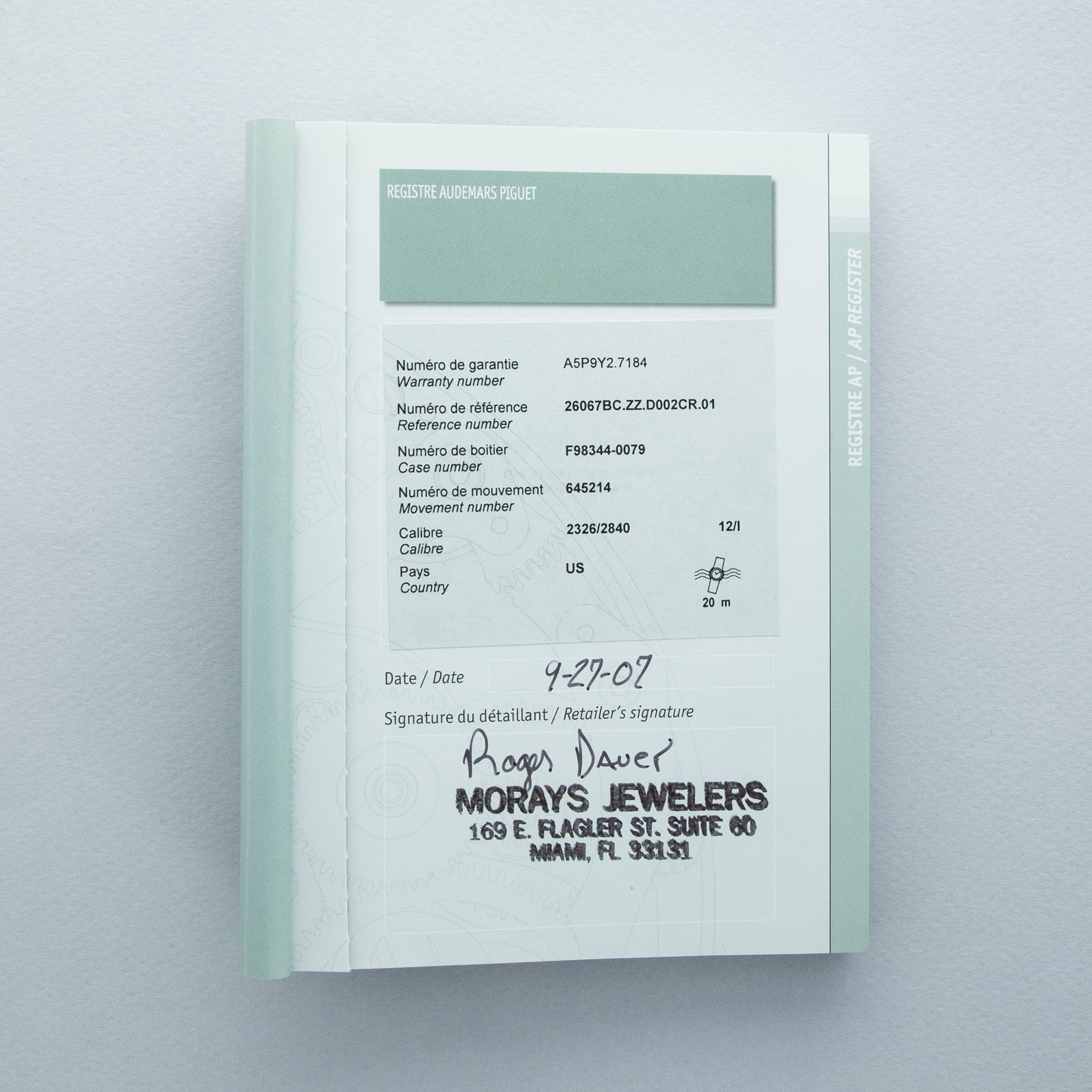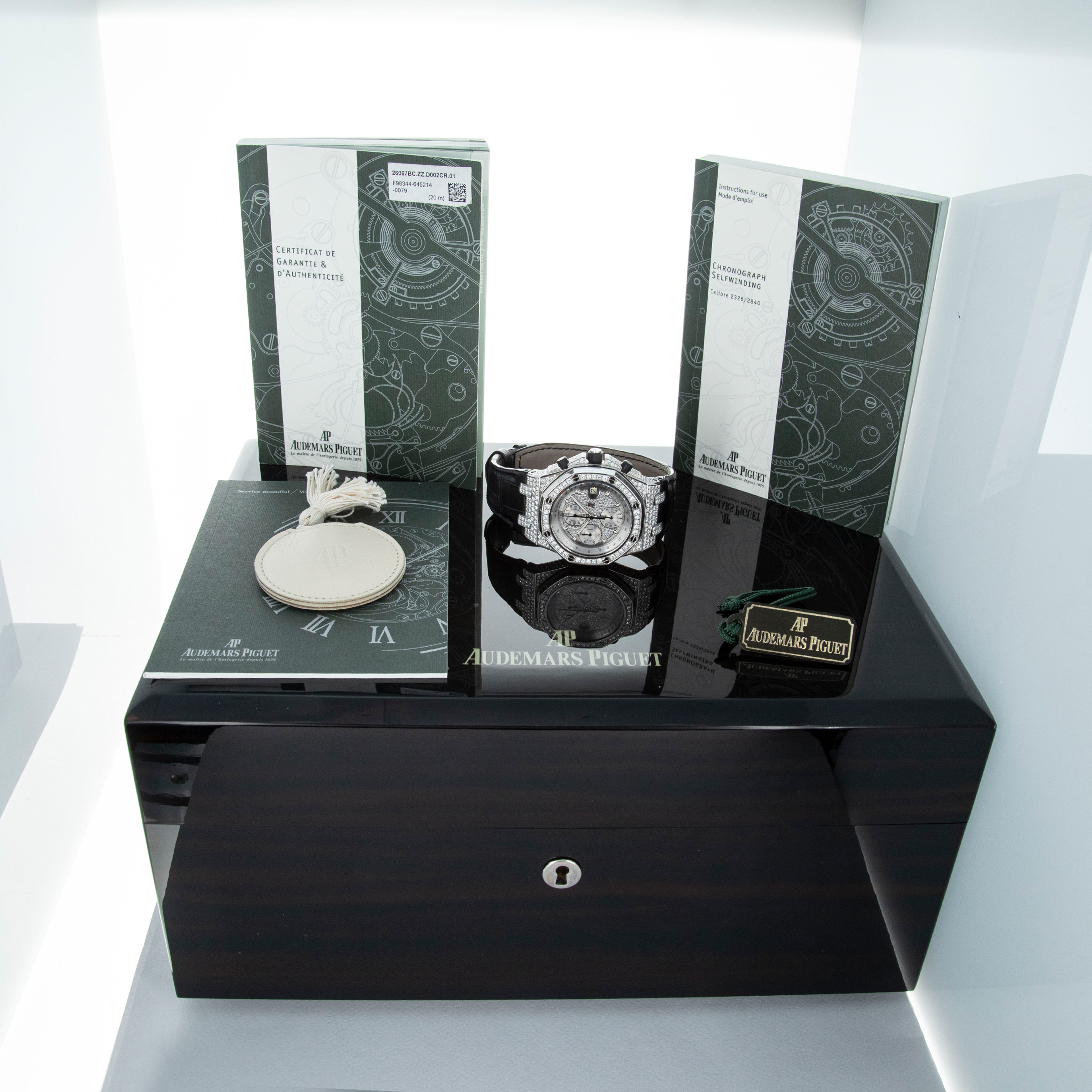 The watch is in overall excellent condition. The white gold case and bezel edges show some light scratches and small nicks. All diamonds and their settings on the case, bezel, lugs, and end pieces are in excellent condition. The case back has light scratches, with very well-defined engravings and hallmarks. The rubber-clad pushers and crown are in excellent condition. The dial and hands are near-mint. It is fitted with an alligator strap and white gold deployant clasp, both in excellent condition. The watch is accompanied by its inner and outer boxes (with key and cover), guarantee, booklets, and hangtag.
