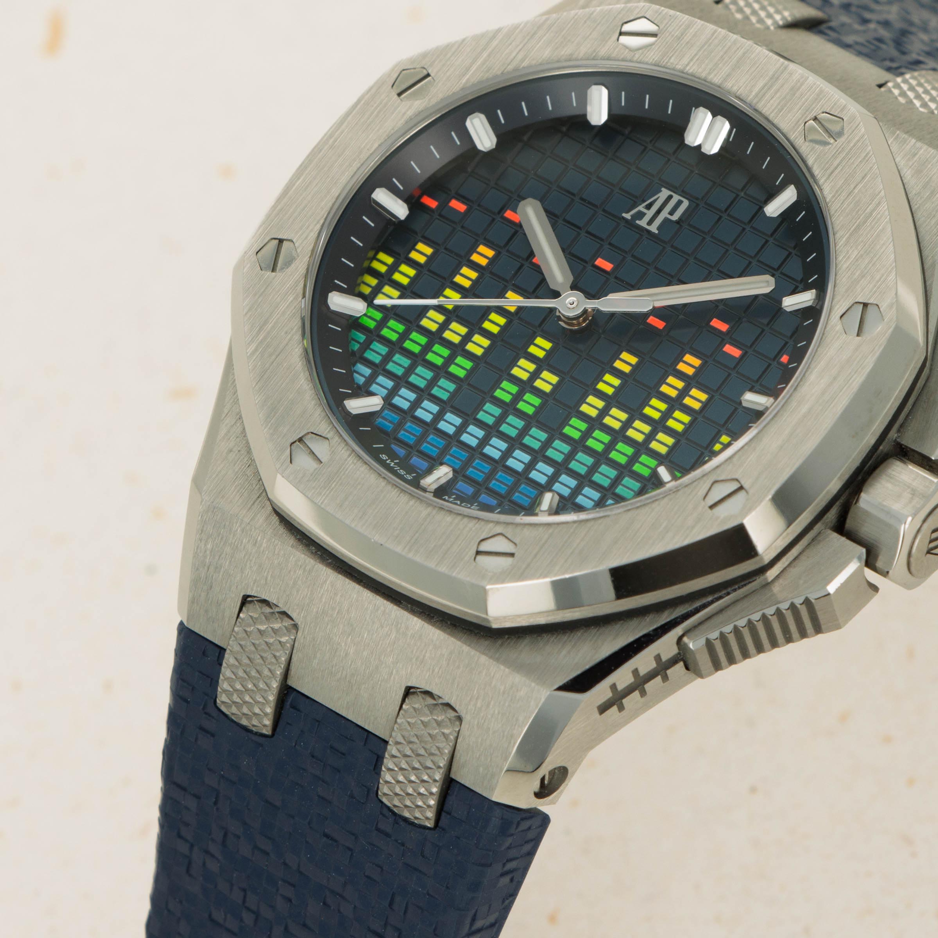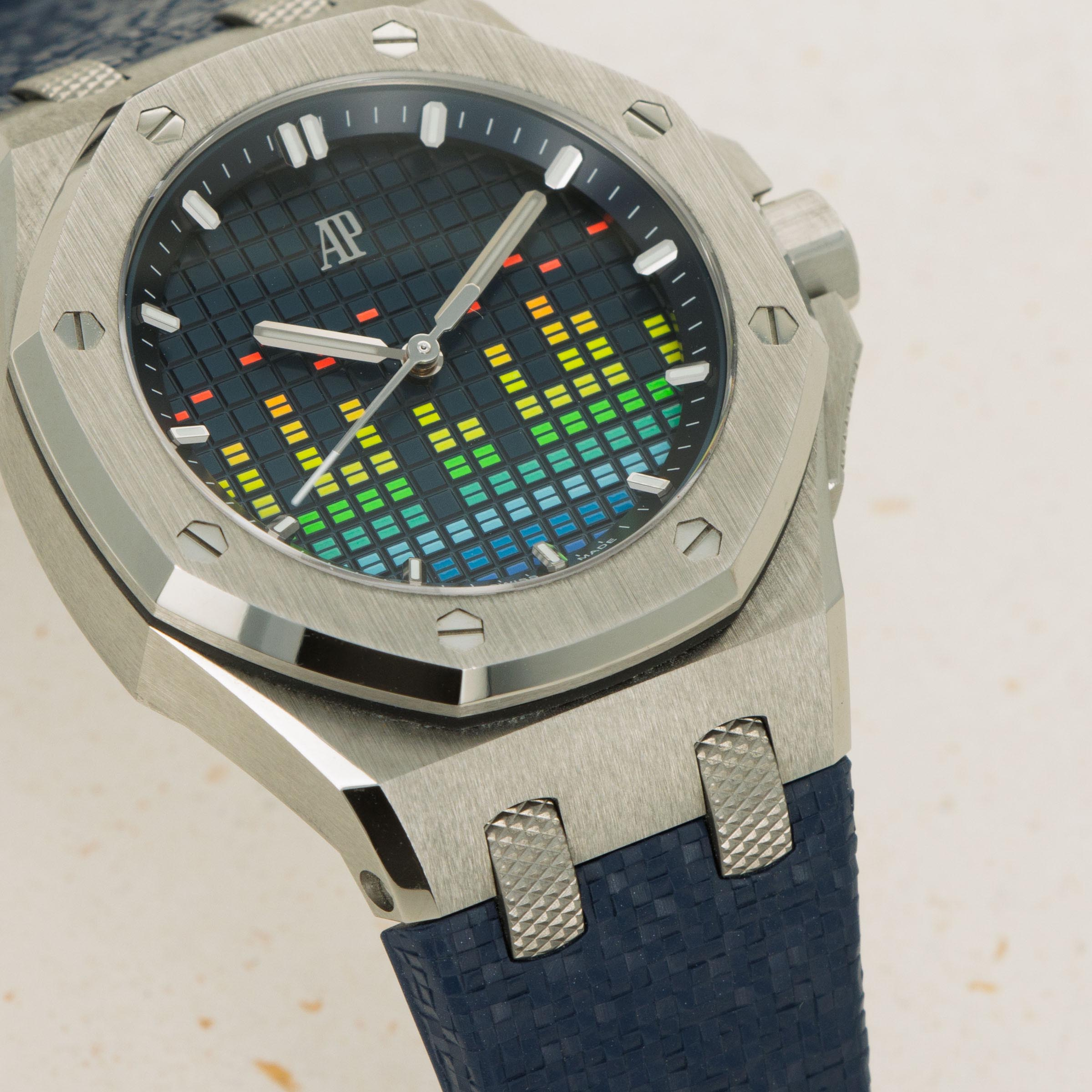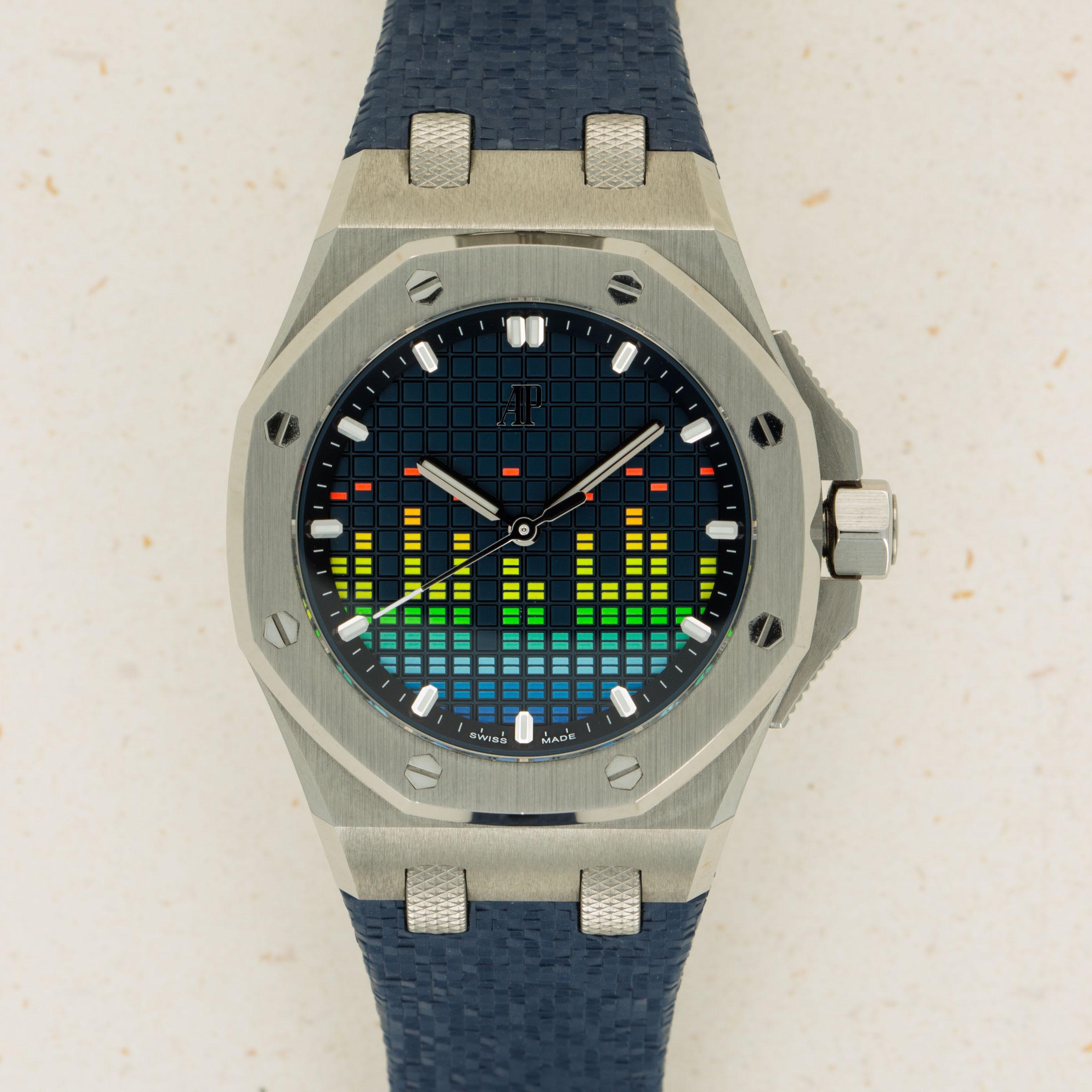 Boasting a blue dial with the Offshore's "Grande Tapisserie" texture, AP have ingeniously replicated the display of a digital VU meter by inserting a variety of colorful columns across its display.