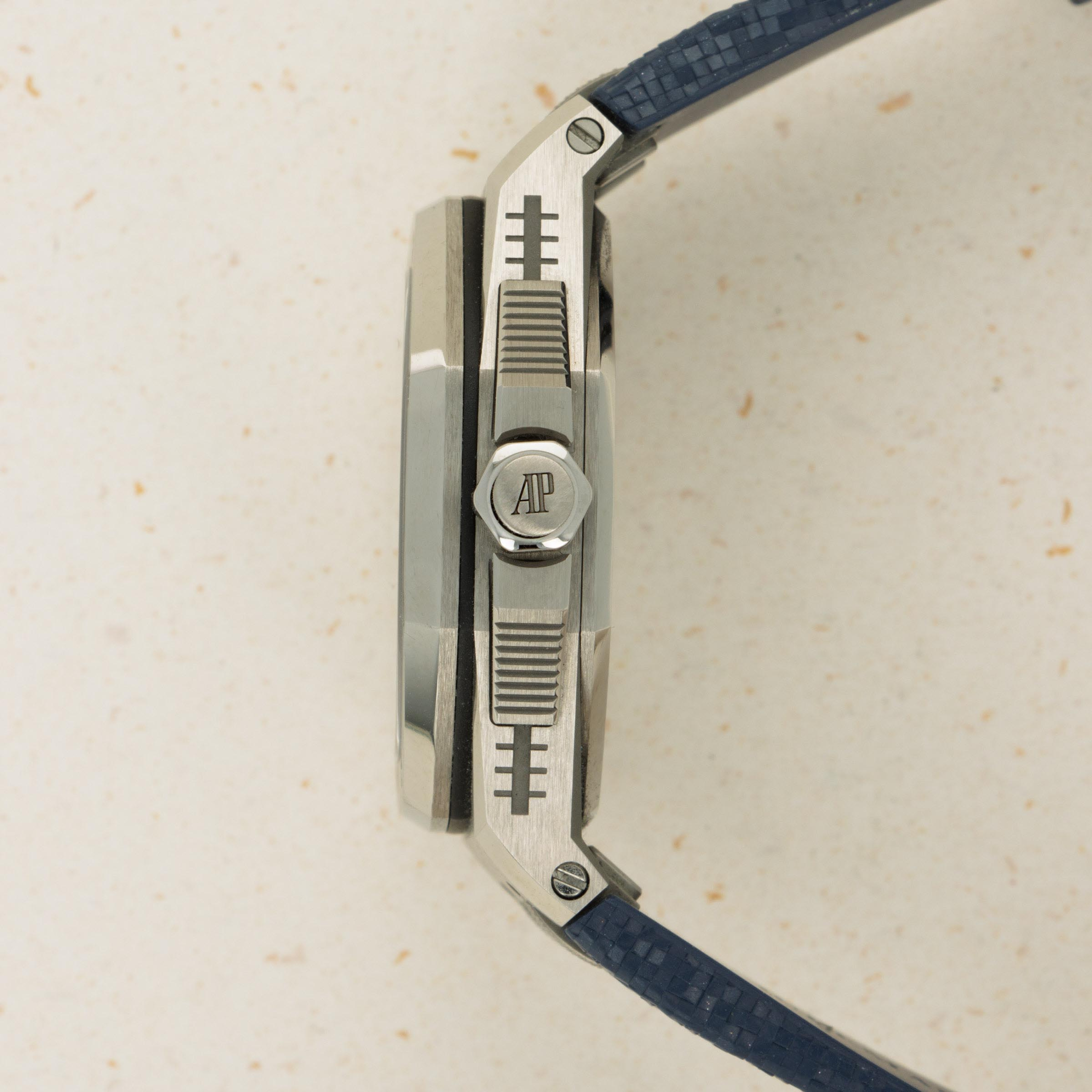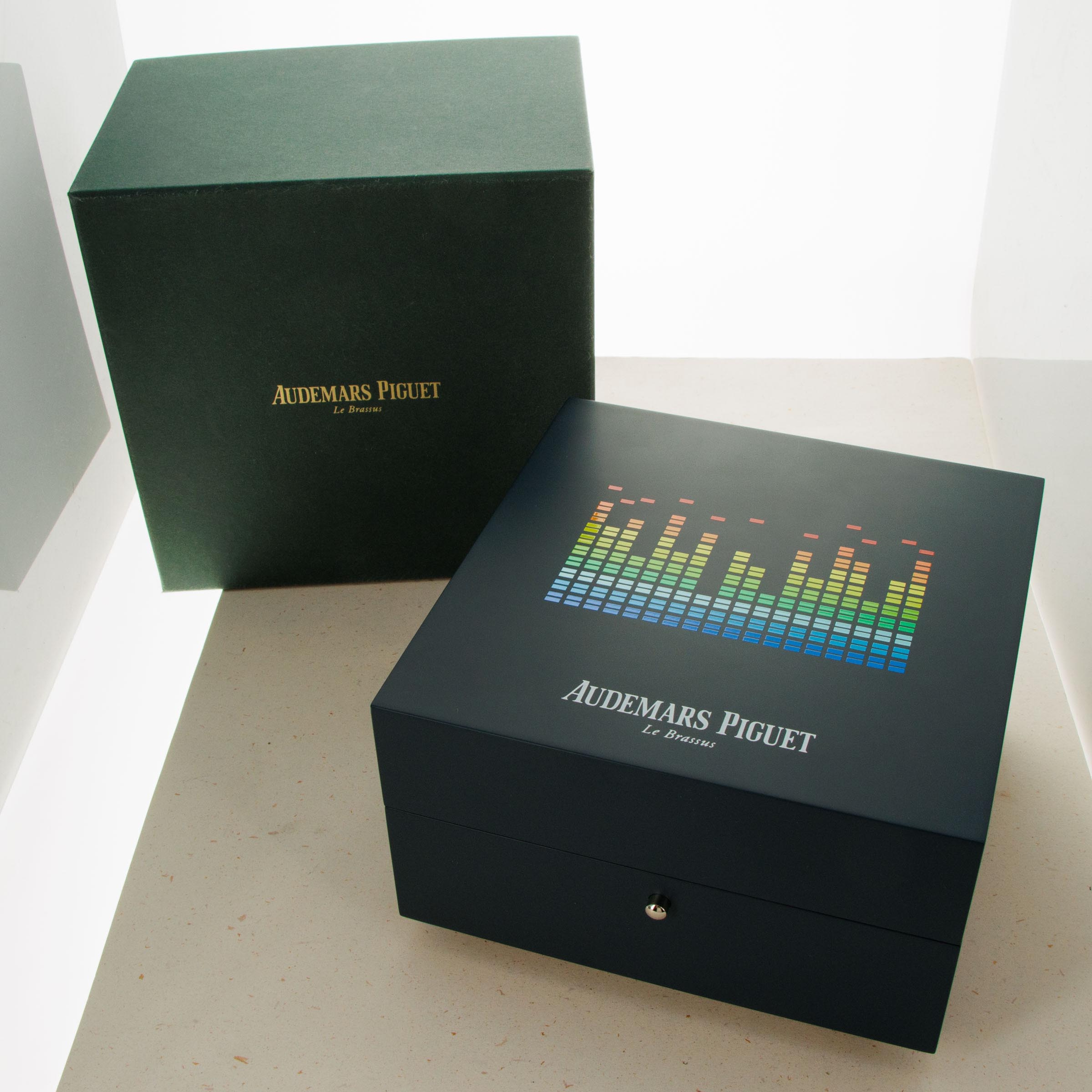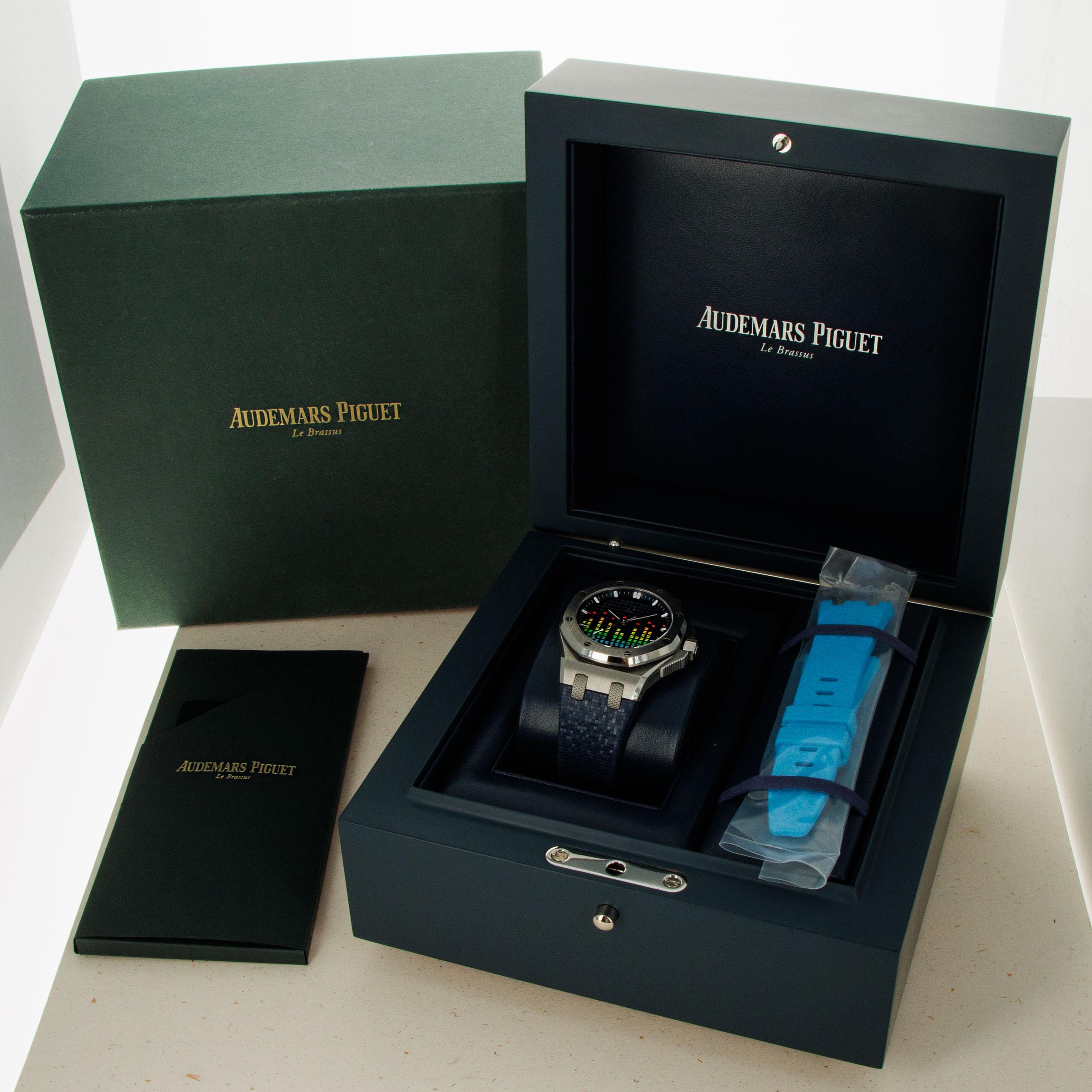 Boasting a blue dial with the Offshore's "Grande Tapisserie" texture, AP have ingeniously replicated the display of a digital VU meter by inserting a variety of colorful columns across its display.