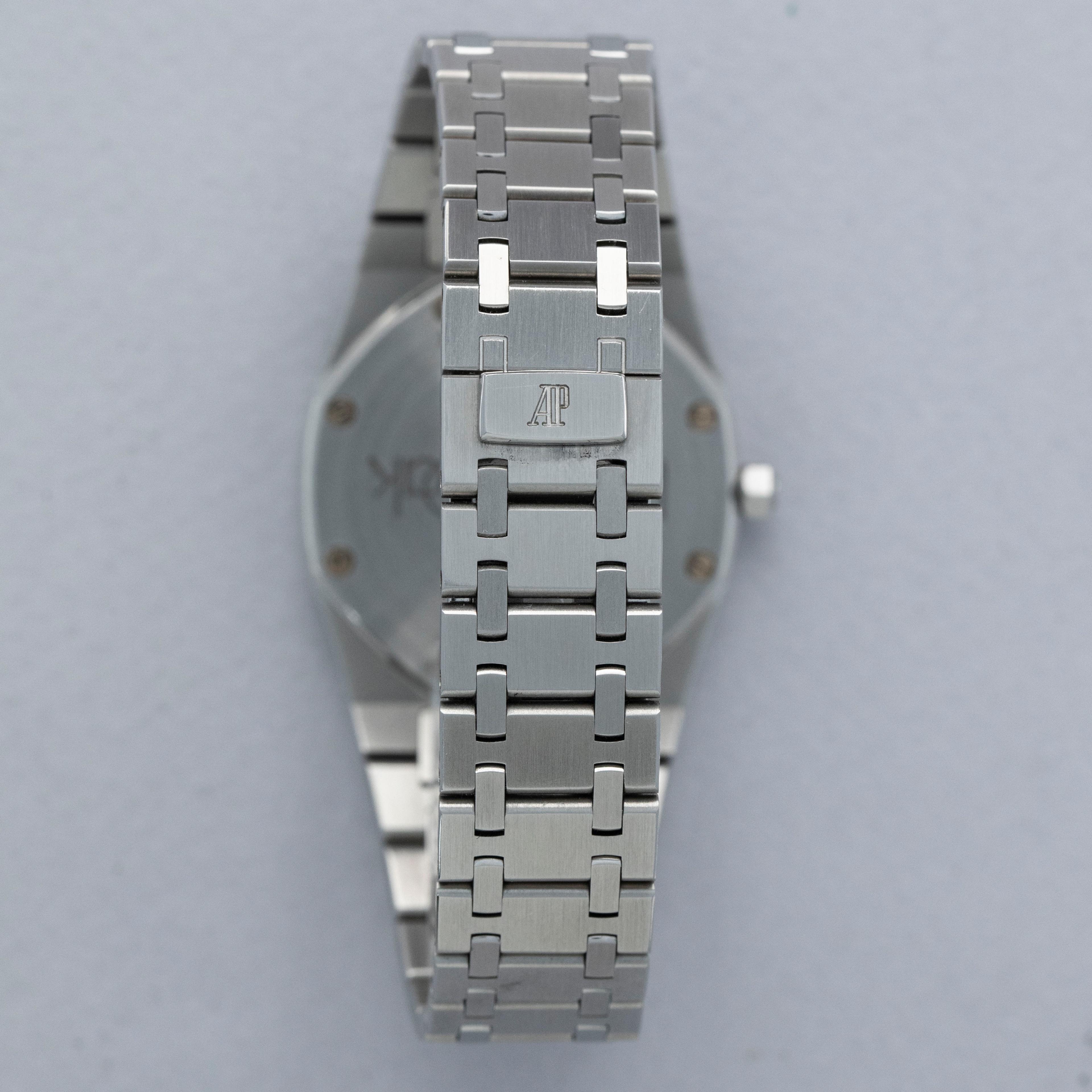 The watch is in overall excellent condition. The stainless steel case is well defined, with some light scratches and scuffs. The case back is very clean with deep, well-defined engravings and light wear to the screw heads. The high polished platinum bezel shows some scratches and a couple of small nicks on the edge. The dial is excellent, with clean applied hour markers; the minute hand has a small patch of lume missing. The integrated bracelet is in excellent condition with light marks and negligible play between the links. The bracelet has 20 links, 8 of which are removable, and fits an approximately 7 1/4” wrist.