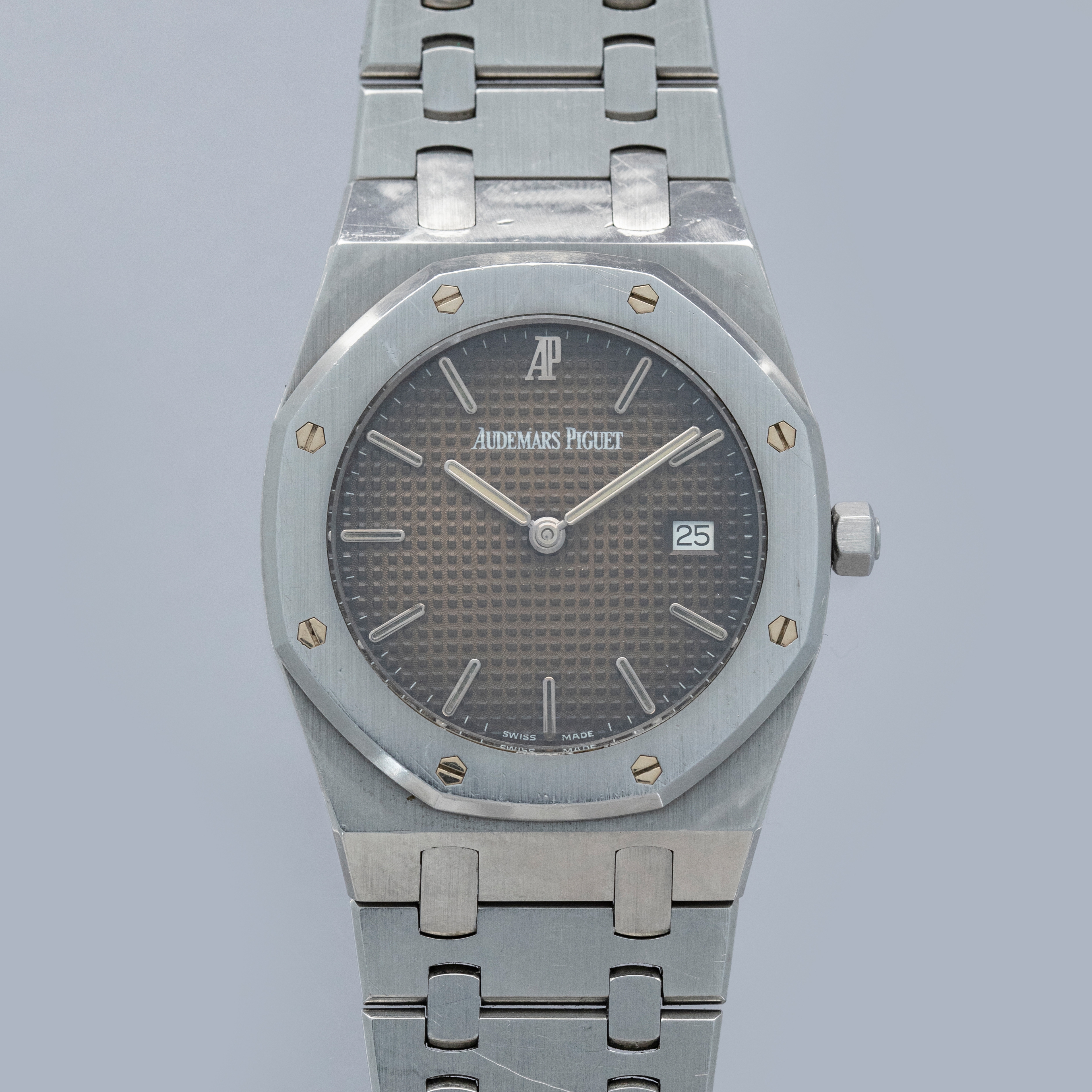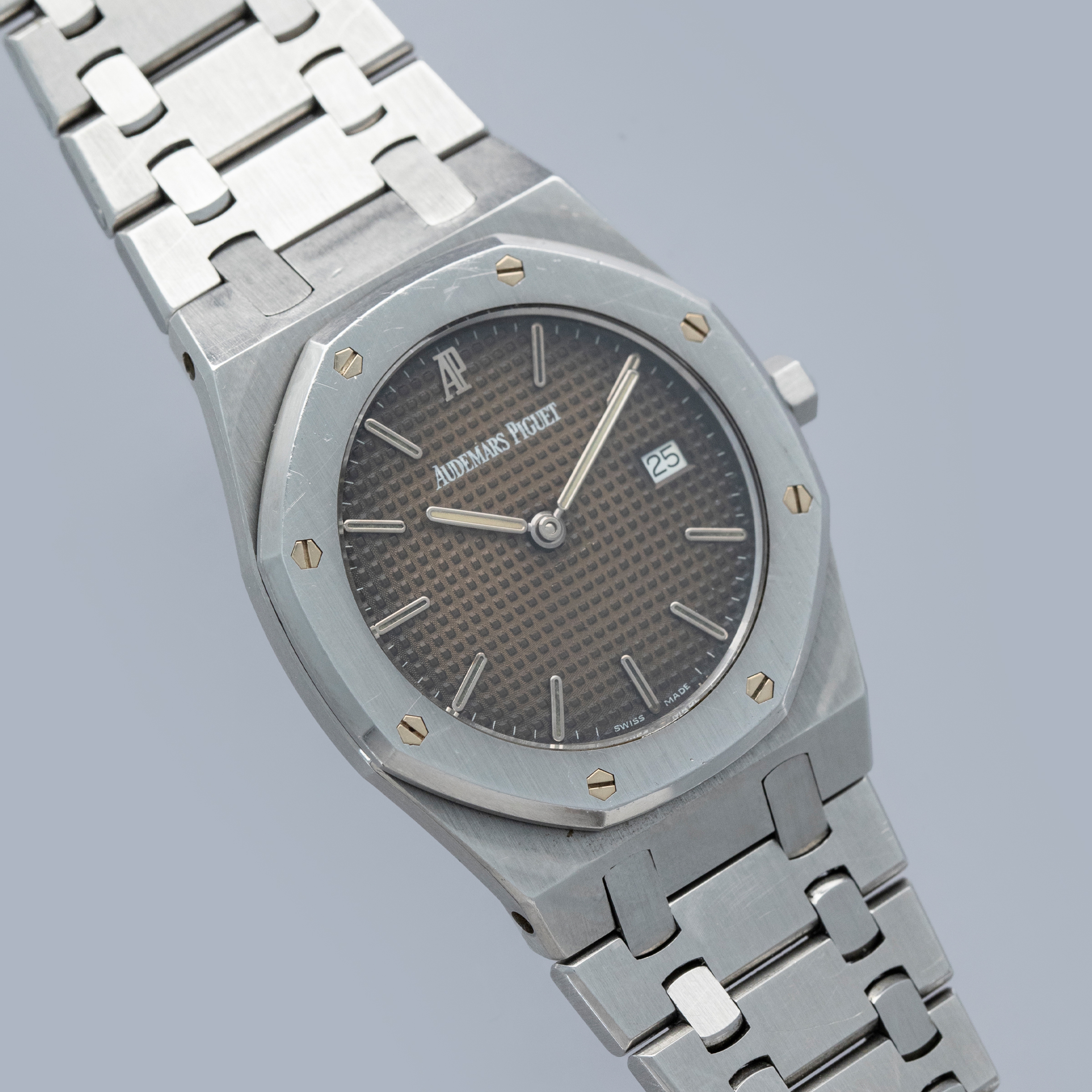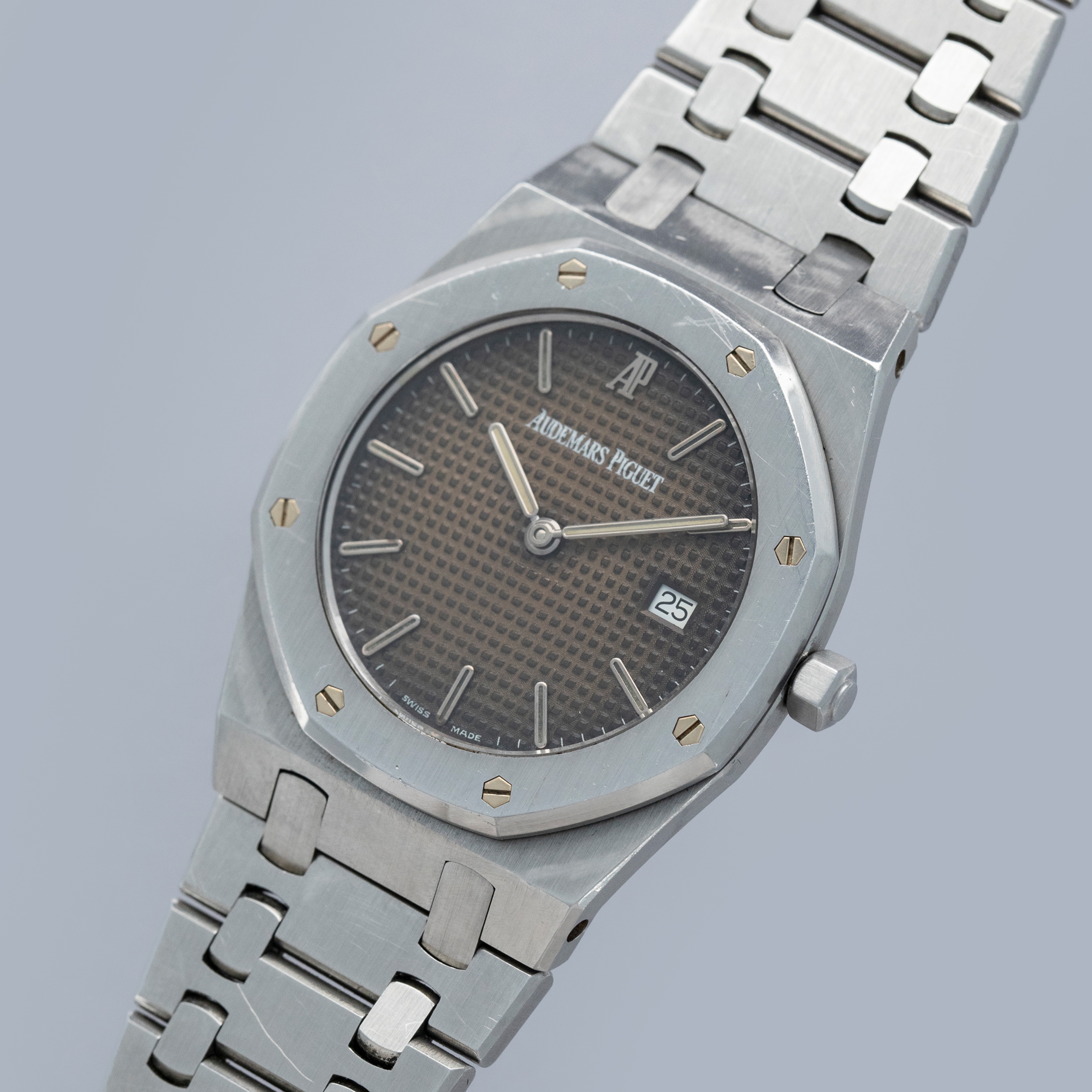 Boasting the Royal Oak's signature 'Petite Tapisserie' dial, this example's dial sports a wonderful golden brown patina across the majority of its surface giving it an aesthetic that is truly unique to this watch as it radiates out from its center towards its darker periphery.