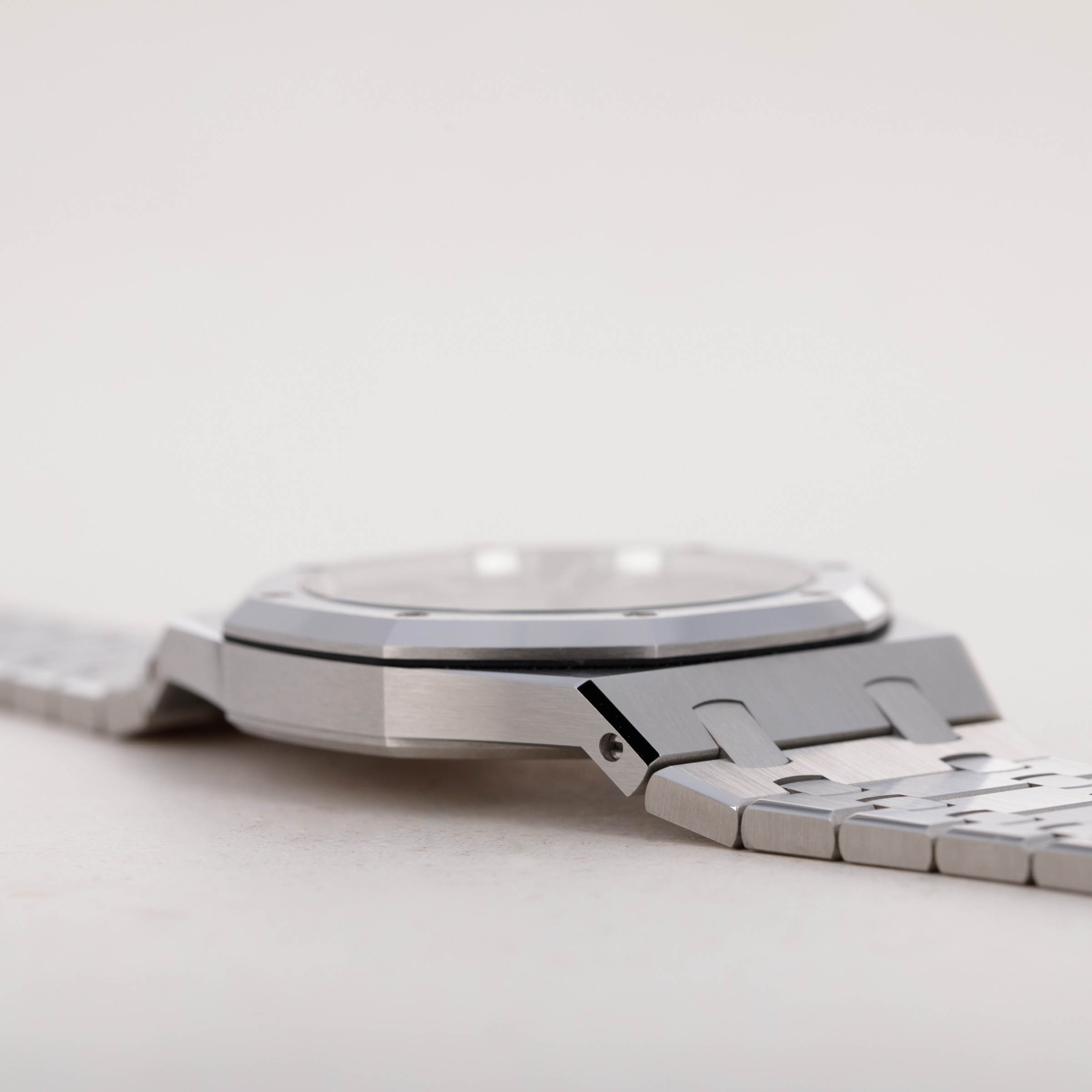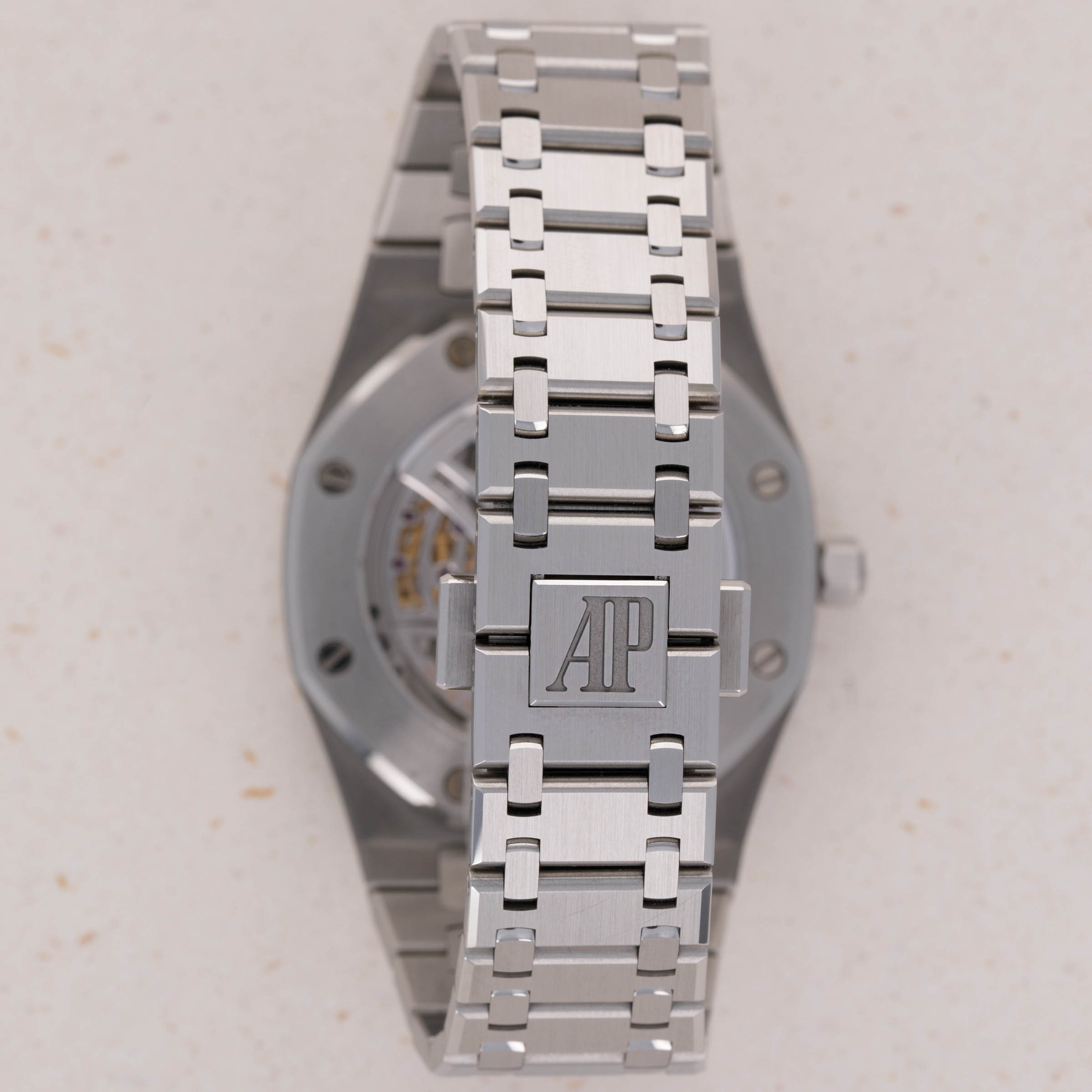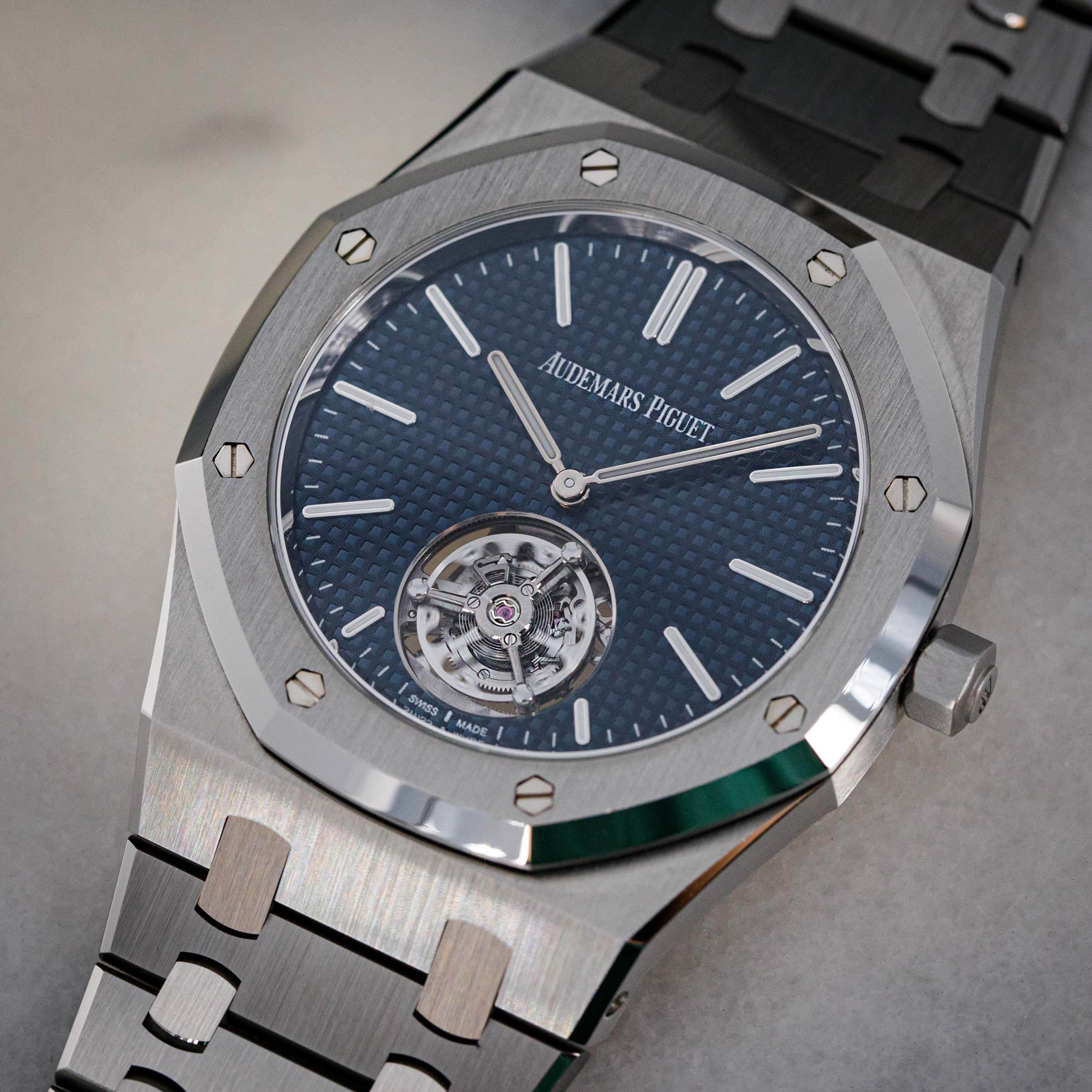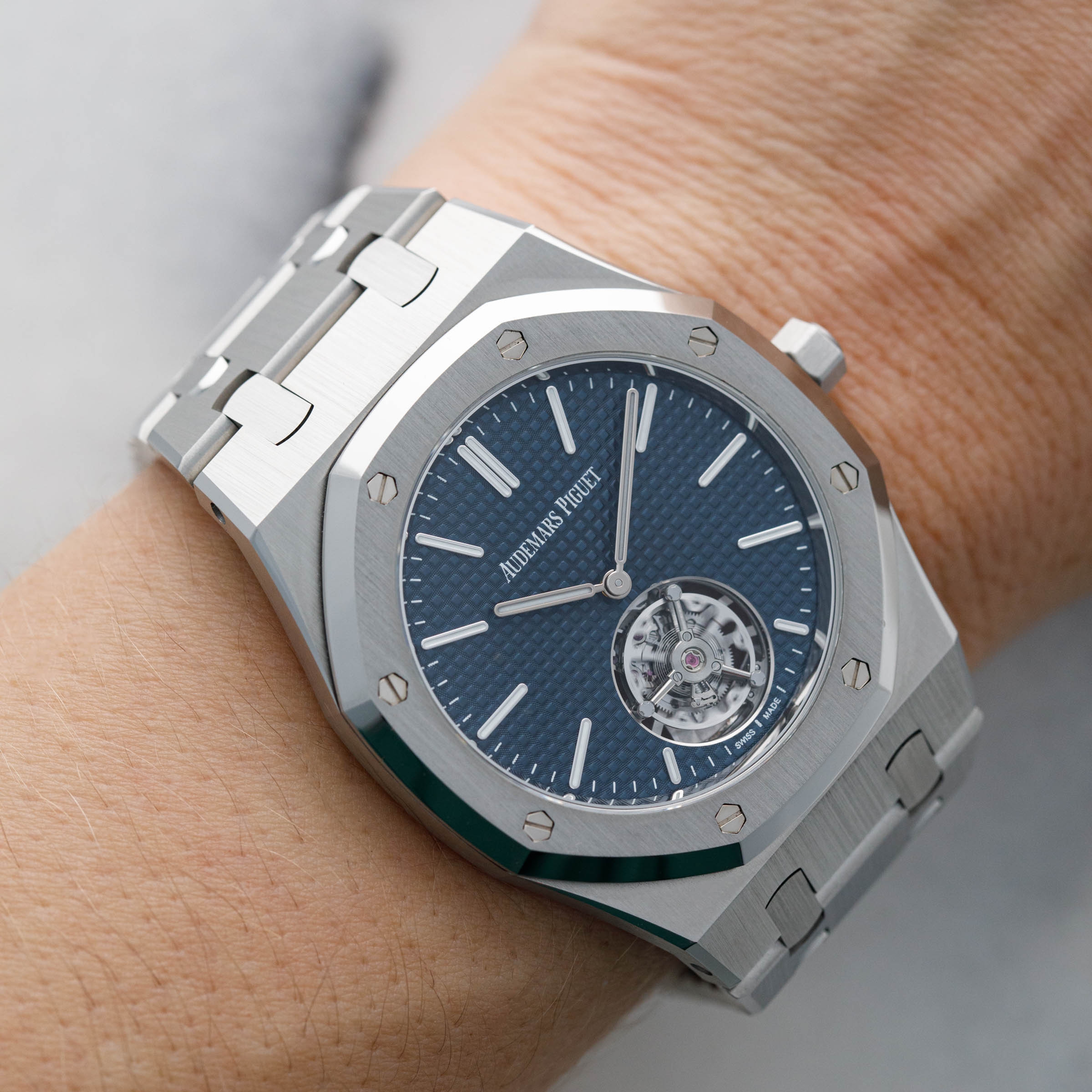 Launched in 2022 to celebrate the Royal Oak’s 50th anniversary, the Royal Oak Tourbillon RD#3 is a strikingly gorgeous and equally complex watch. Designed to look like the original Royal Oak ref. 5402, it features a 39mm stainless steel construction that stands just 8.1mm thick, a relatively minimal 1.1mm increase to thickness over the original Royal Oak ref. 5402. Combined with the Royal Oak’s octagonal bezel, unguarded octagonal crown, integrated bracelet, and beautiful Bleu Nuit, Nuage 50 PVD ‘Petite Tapisserie’ dial, the RD#3 is a wonderful celebration of the Royal Oak’s original 'Jumbo' design – a particularly fitting release for the Royal Oak’s 50th anniversary. Instead of redesigning the Royal Oak to accommodate a tourbillon, AP decided to design a new automatic flying tourbillon movement from the ground up to maintain the Royal Oak ‘Jumbo’s’ iconic extra-thin profile. This movement, the automatic cal. 2968, features a skeletonised commemorative 50th-anniversary rotor and an expertly finished architecture built upon a rhodium-plated 22kt pink gold base. By standing so close to the original Royal Oak’s design, Audemars Piguet have showcased precisely how important the Royal Oak is to them.