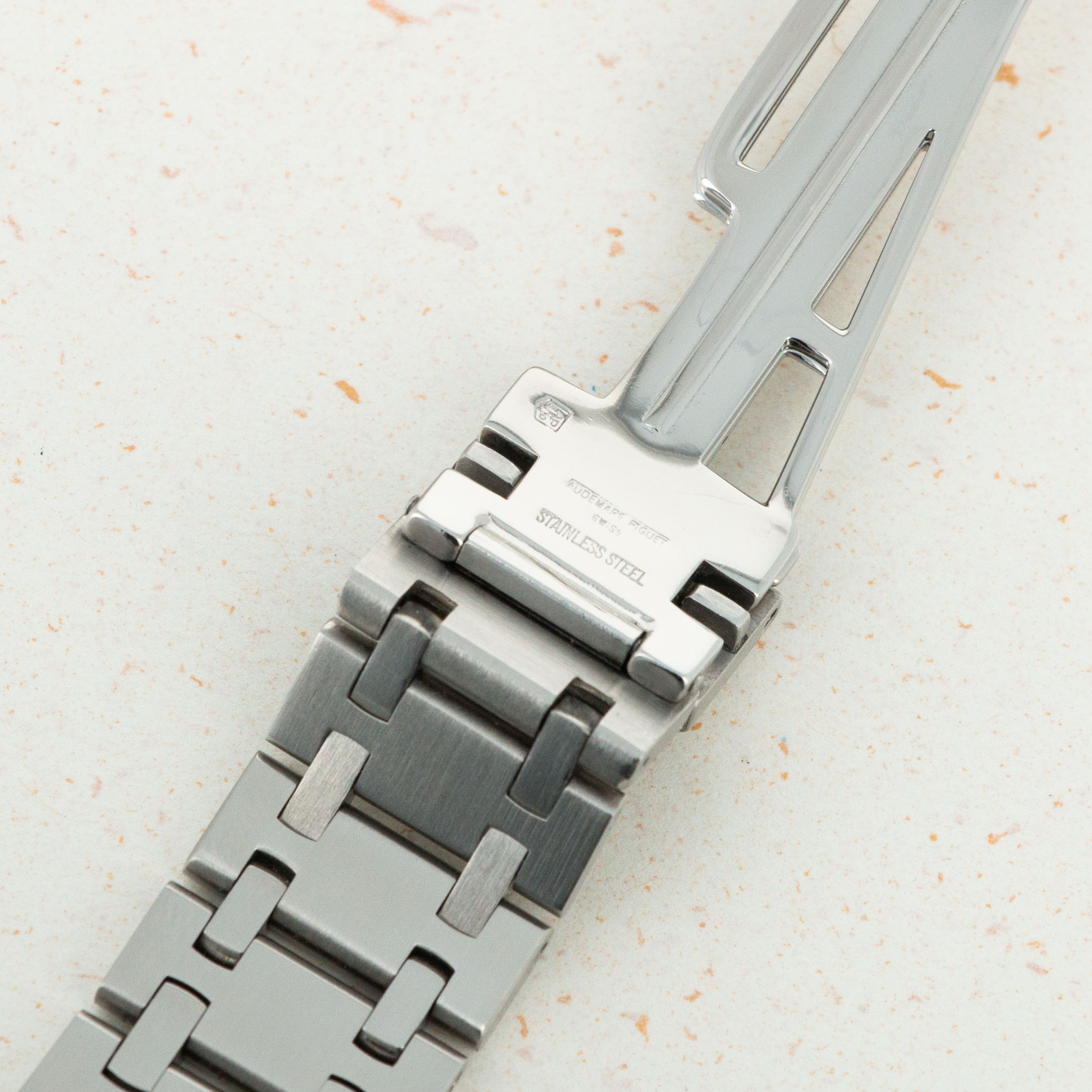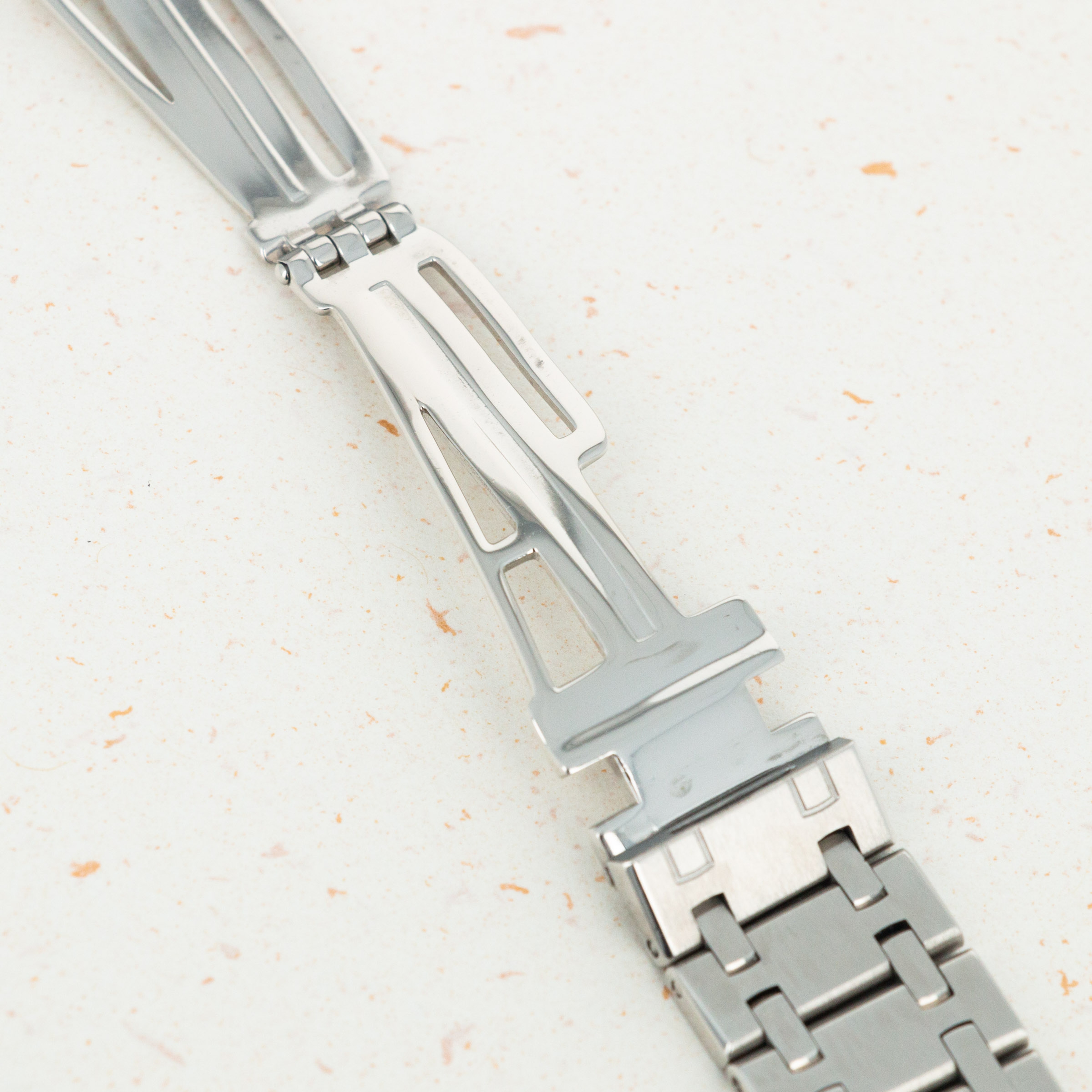 Particular to this series, the clasp features an elongated (or stretched) Audemars Piguet logo, which was a standard layout for AP bracelets for several years.