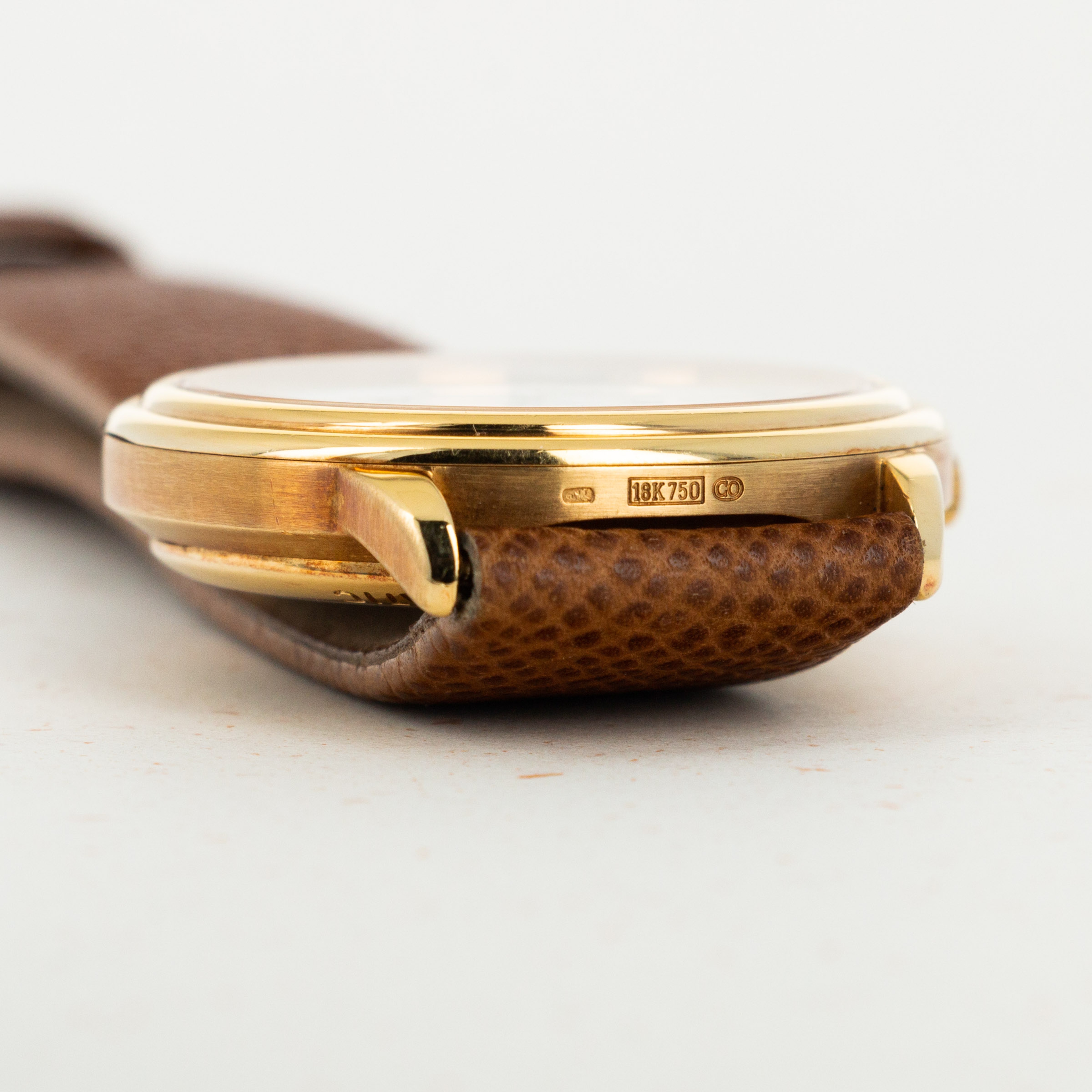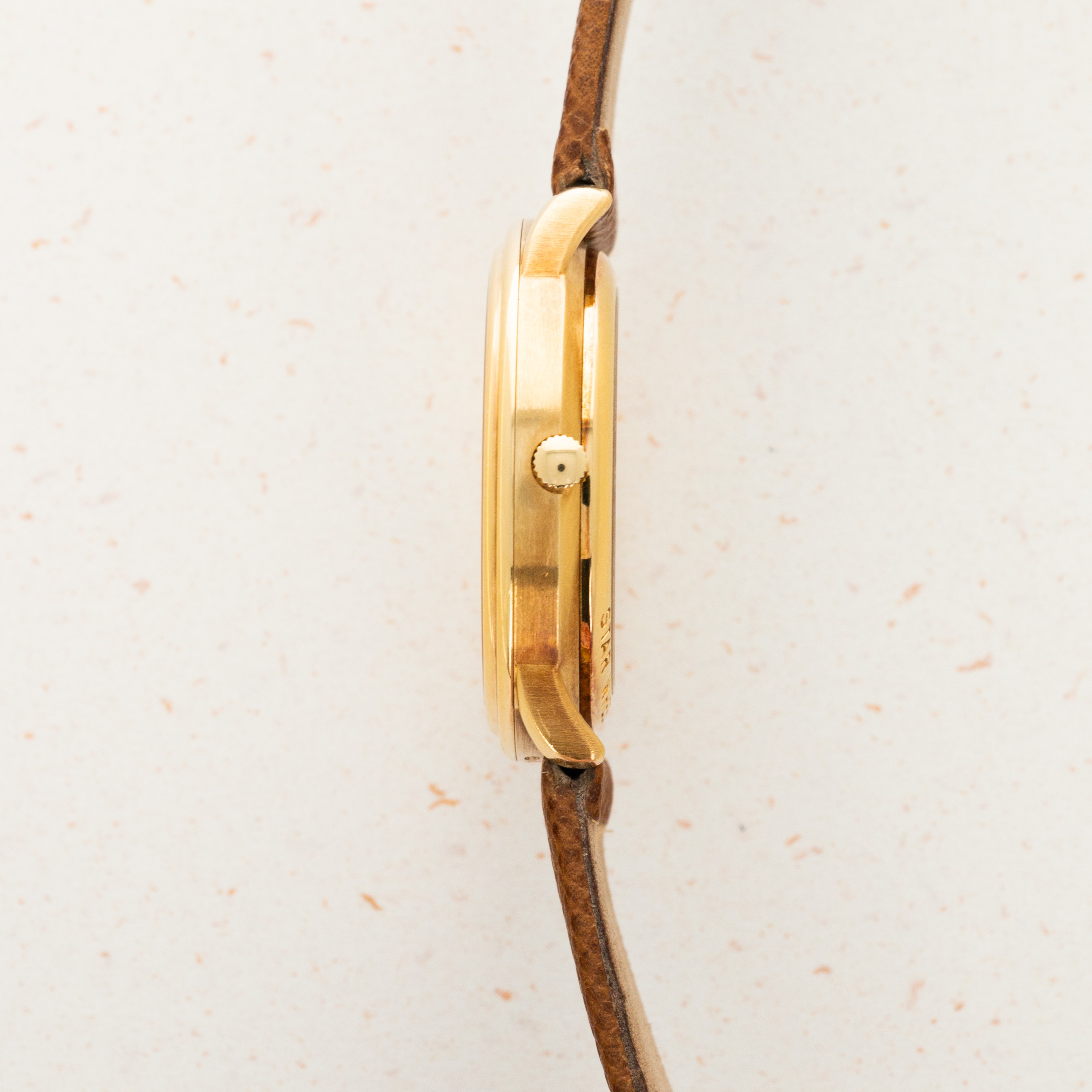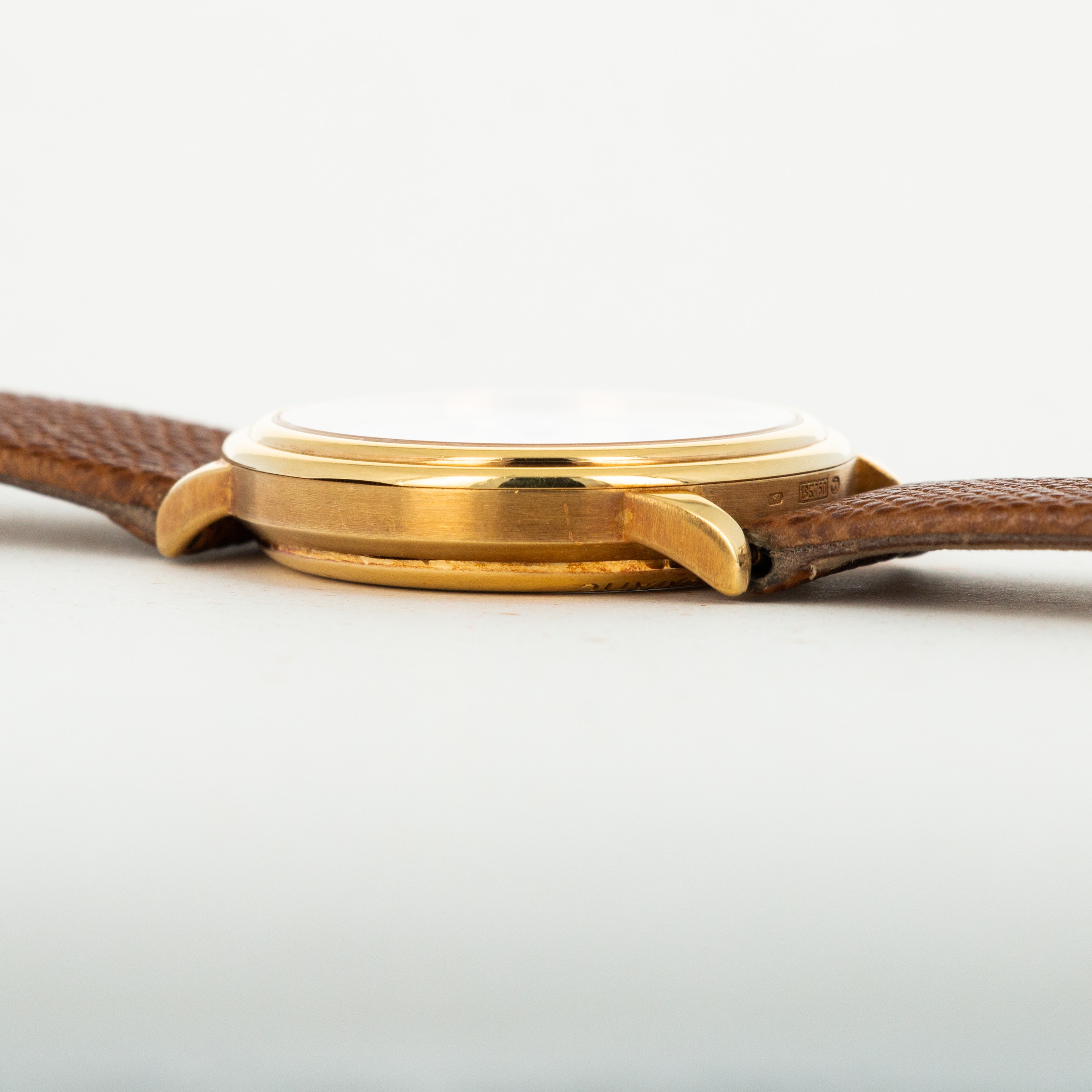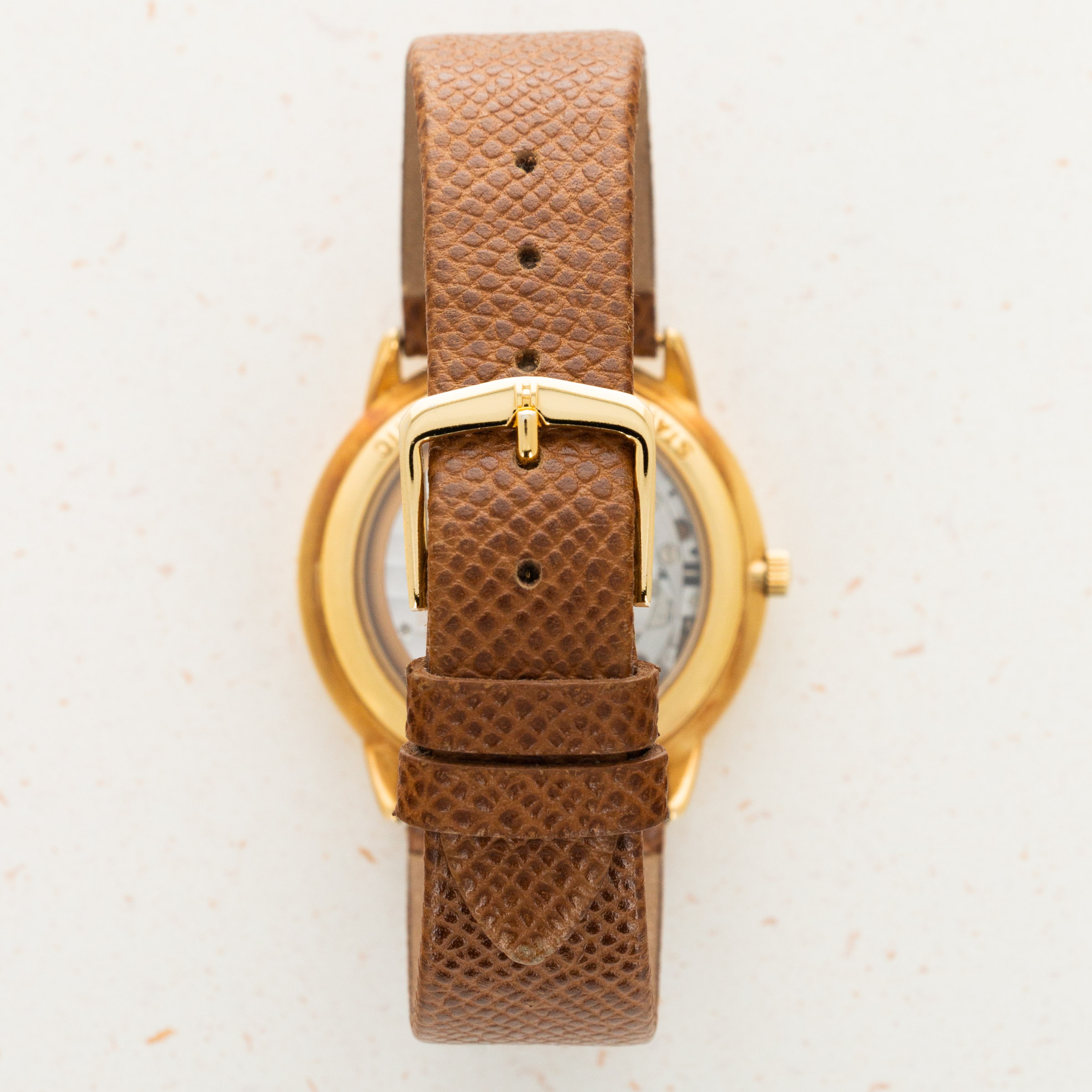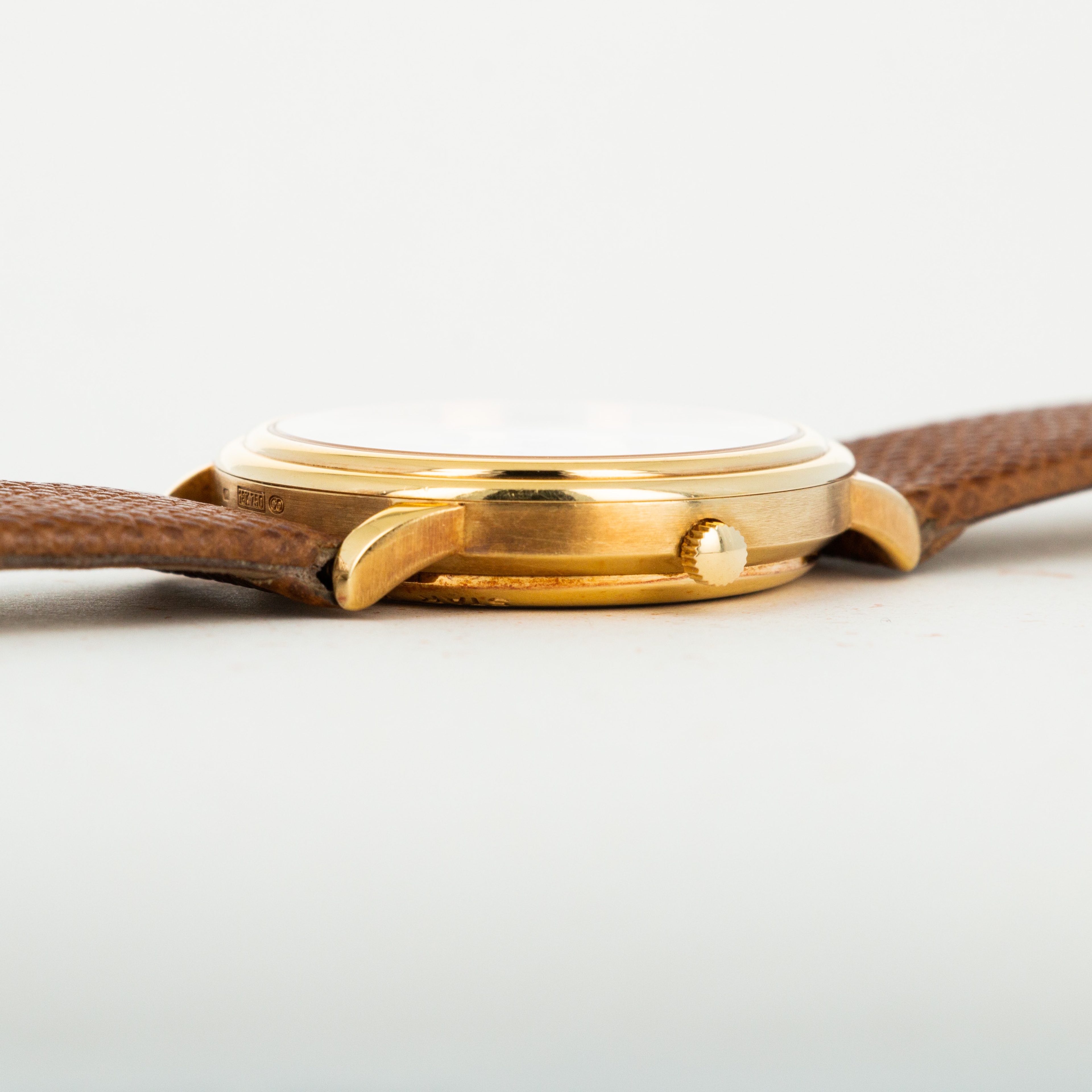 The overall condition of the watch is superb. Case and bezel show mild signs of wear, with only a few hairline scratches primarily. The hallmarks and case engravings are strong, with no indication of deterioration. Overall, the dial is very nice. There are a couple of small marks that can be found on the left edge of the minute track and on the far outer edge of the gold bezel, at approximately eight o' clock respectively. However, these are only visible under 10x magnification. The leather strap and gold-plated buckle are custom made and not original to the watch.