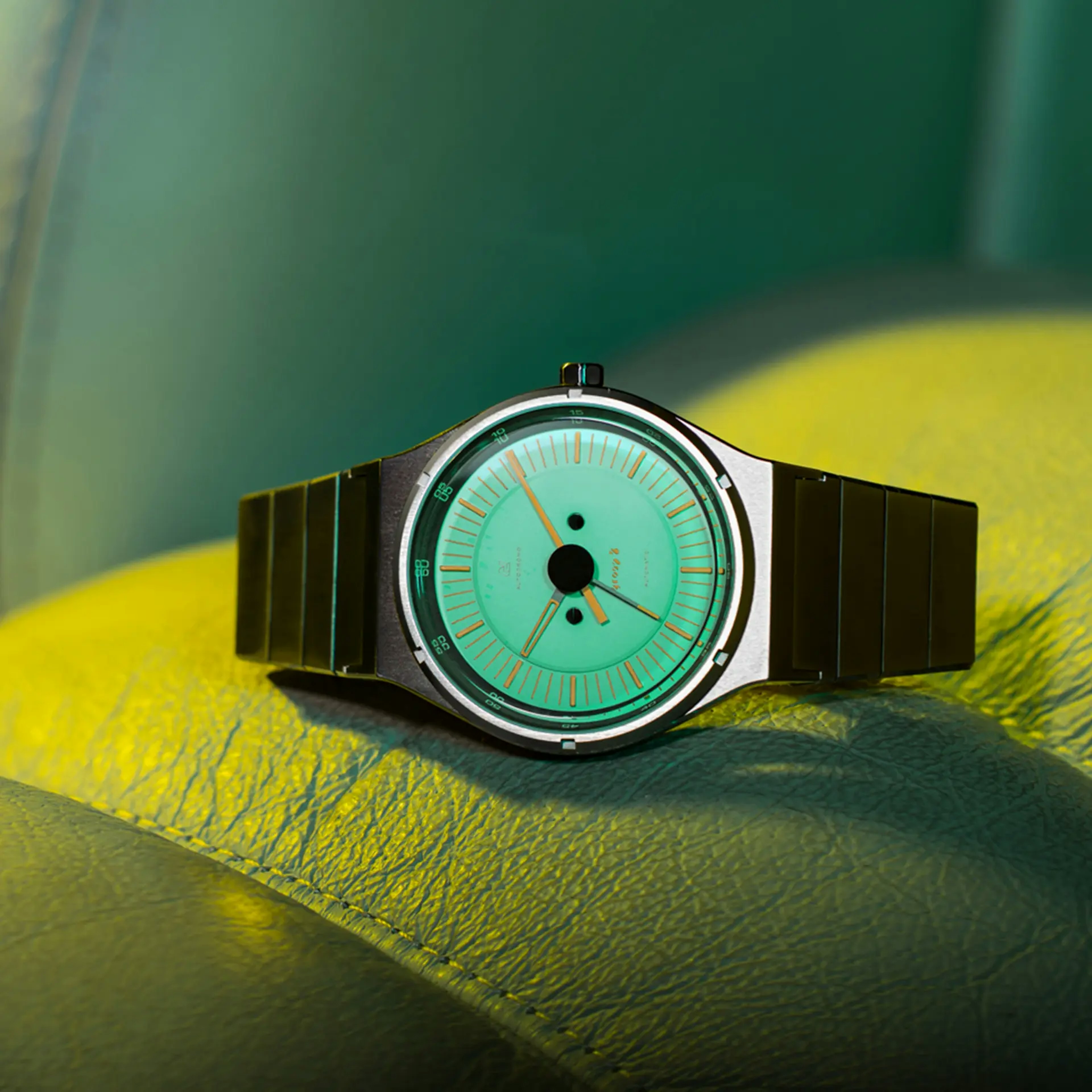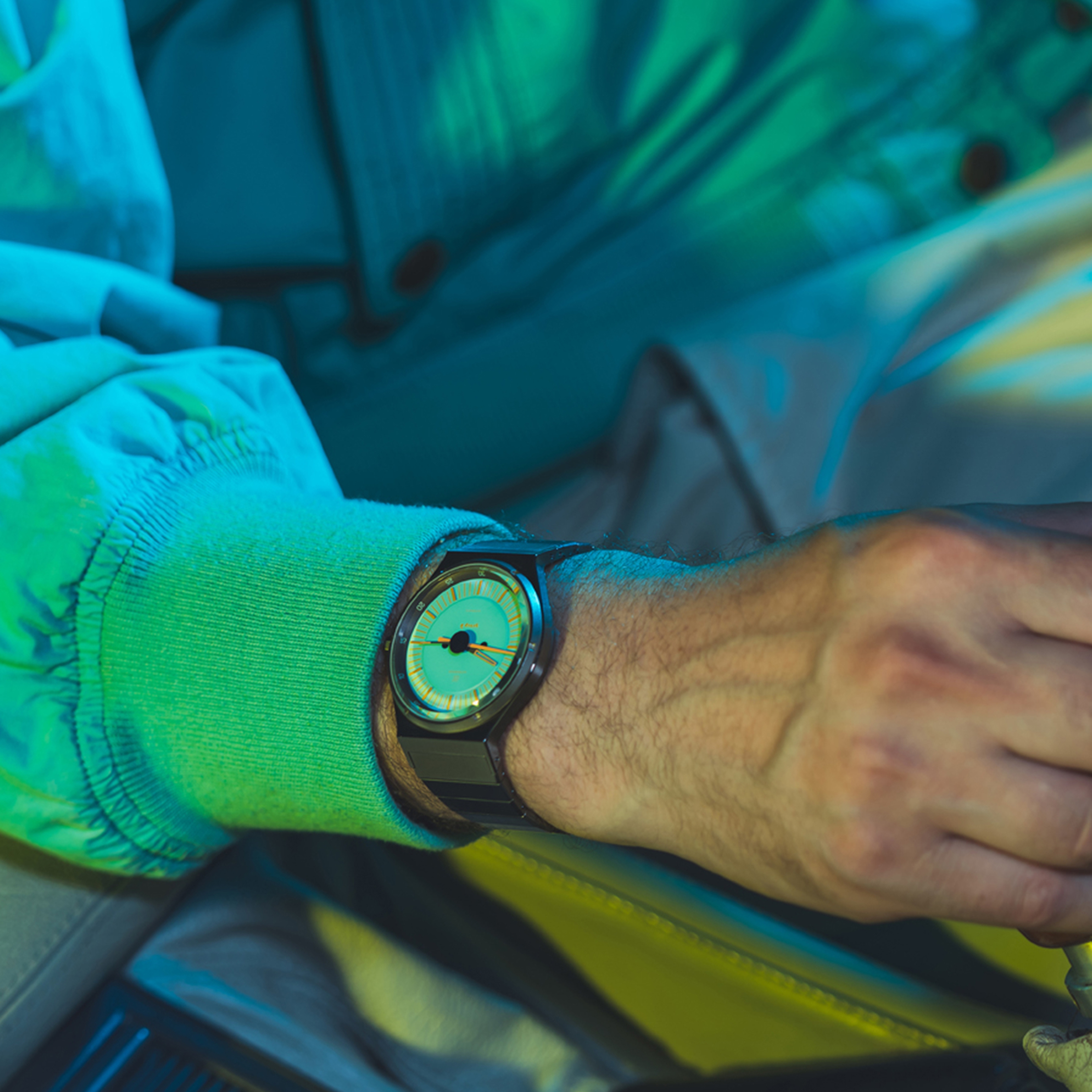 Autodromo’s Group B watch is an homage to the technical advancement and exotic materials finding use in early 1980s motorsport, featuring a bi-metallic case construction. The Miyota 9015 automatic movement is housed within a lightweight 39mm titanium capsule composed of 2 parts, which is held to the wrist via an integrated bracelet crafted in stainless steel and plated in a Gray finish.