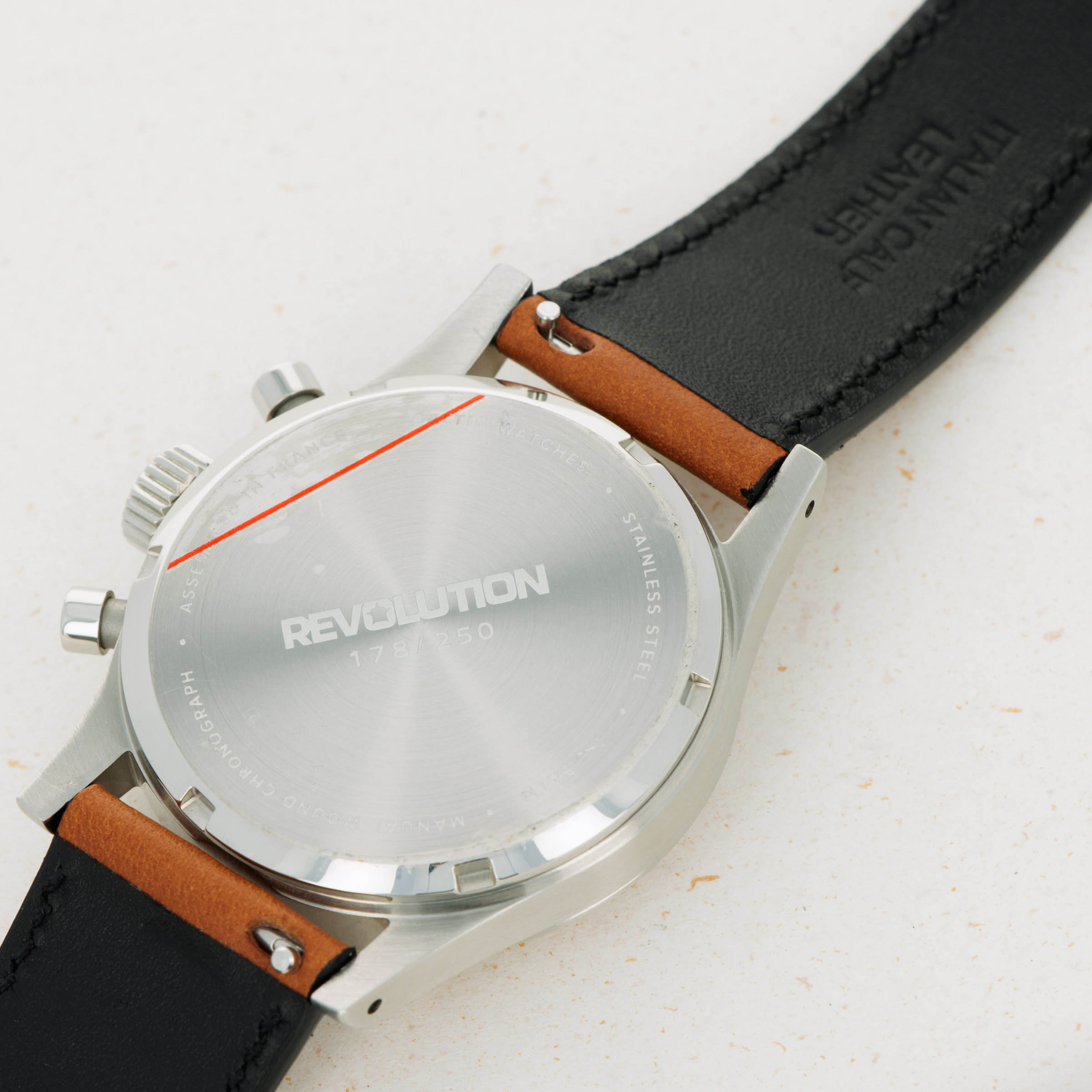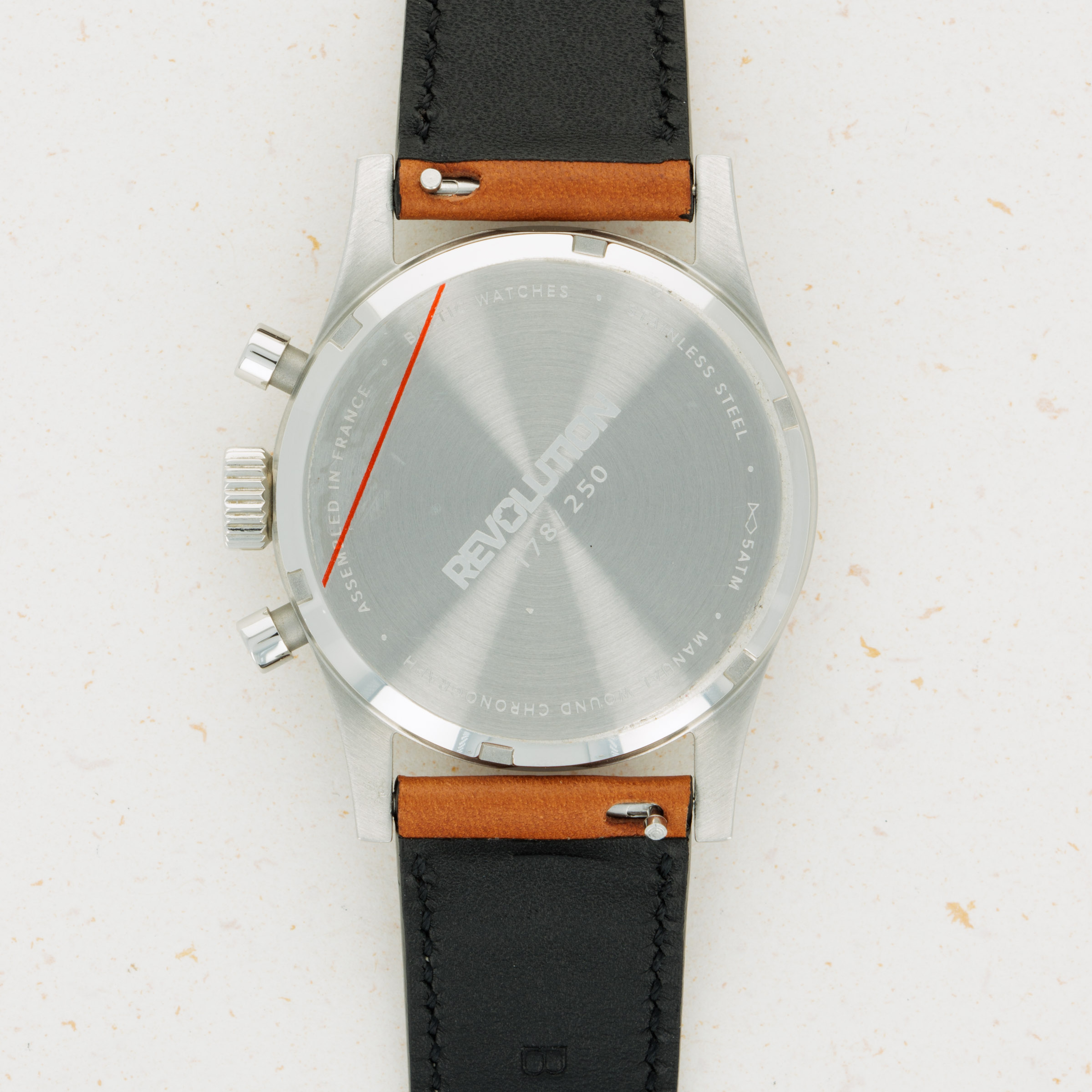 Inspired by the watch auctioned by Baltic for The Pink Dial Project, the Bicompax for The Rake and Revolution boasts a salmon sector dial with an array of dial finishes and Revolution's star logo at 6 o'clock.