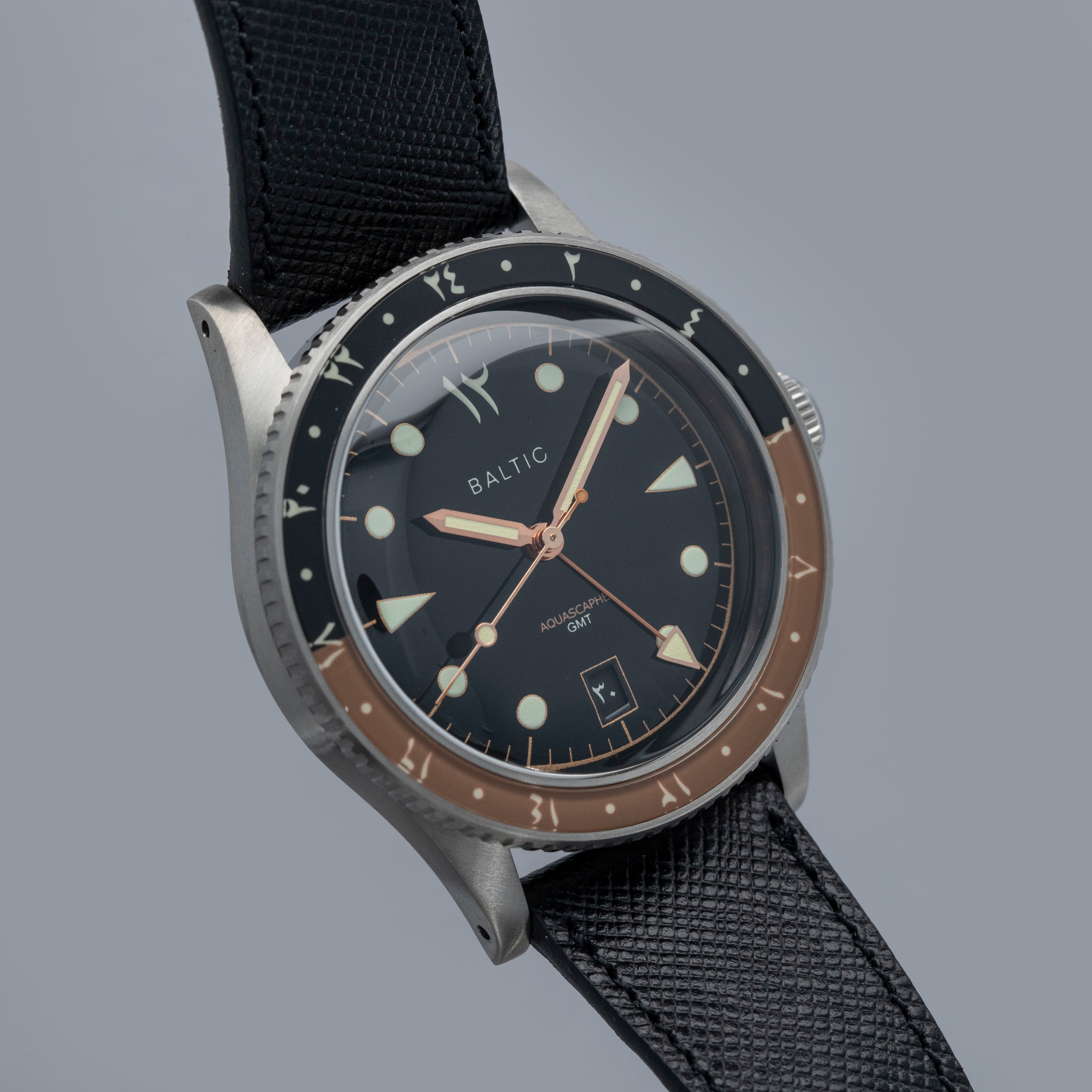 Offered as a 39mm titanium timepiece on a leather strap, the GMT is a lightweight watch on the wrist with an unusual aesthetic that combines the best of vintage aesthetics with Arabic detailing.