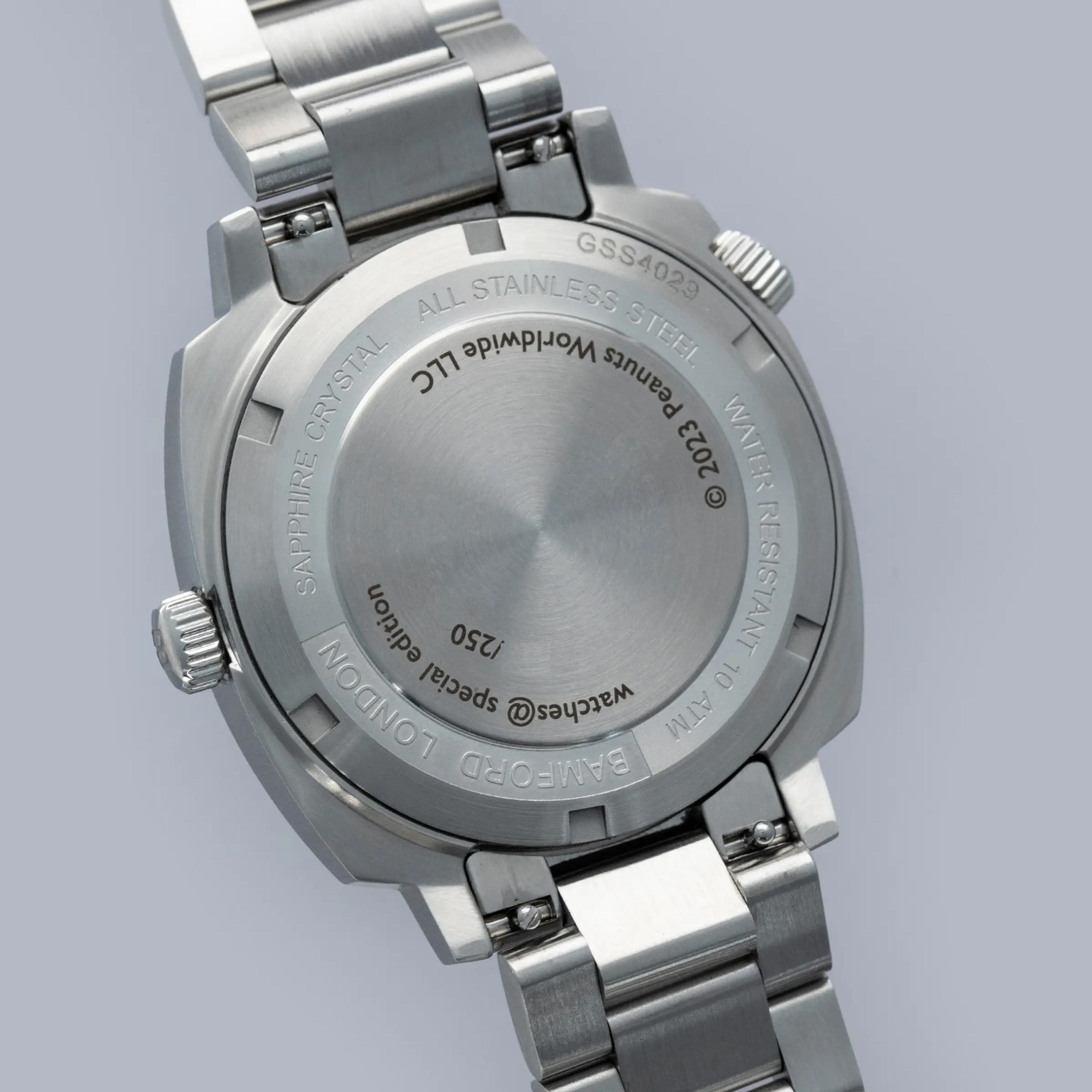 Launched as a limited edition collaboration of 250 pieces between “Watches@” - a private watch group made up of Google employees and famed English watch customization house Bamford, the Campus Snoopy for Watches@ is a light-hearted and thoughtfully designed celebration of Snoopy’s unlikely contribution to watchmaking and wider pop culture. Measuring 40mm in diameter and boasting an automatic GMT movement, the Campus Snoopy is a functional watch, but with Snoopy’s hands acting as the hour and minute hands, this watch is imbued with a light-hearted ethos. Featuring a two-tone blue and navy 24-hour inner bezel and a brushed silver dial, this timepiece’s display is punchy and bright, with Snoopy’s colorful details such as his backpack and hat and the grass he walks on all jumping off the dial’s monochromatic design. With the number 100 replacing the ‘10’ in its date wheel as a nod to the number googol 10^100, from which Google is named after, this timepiece is both fun and functional.