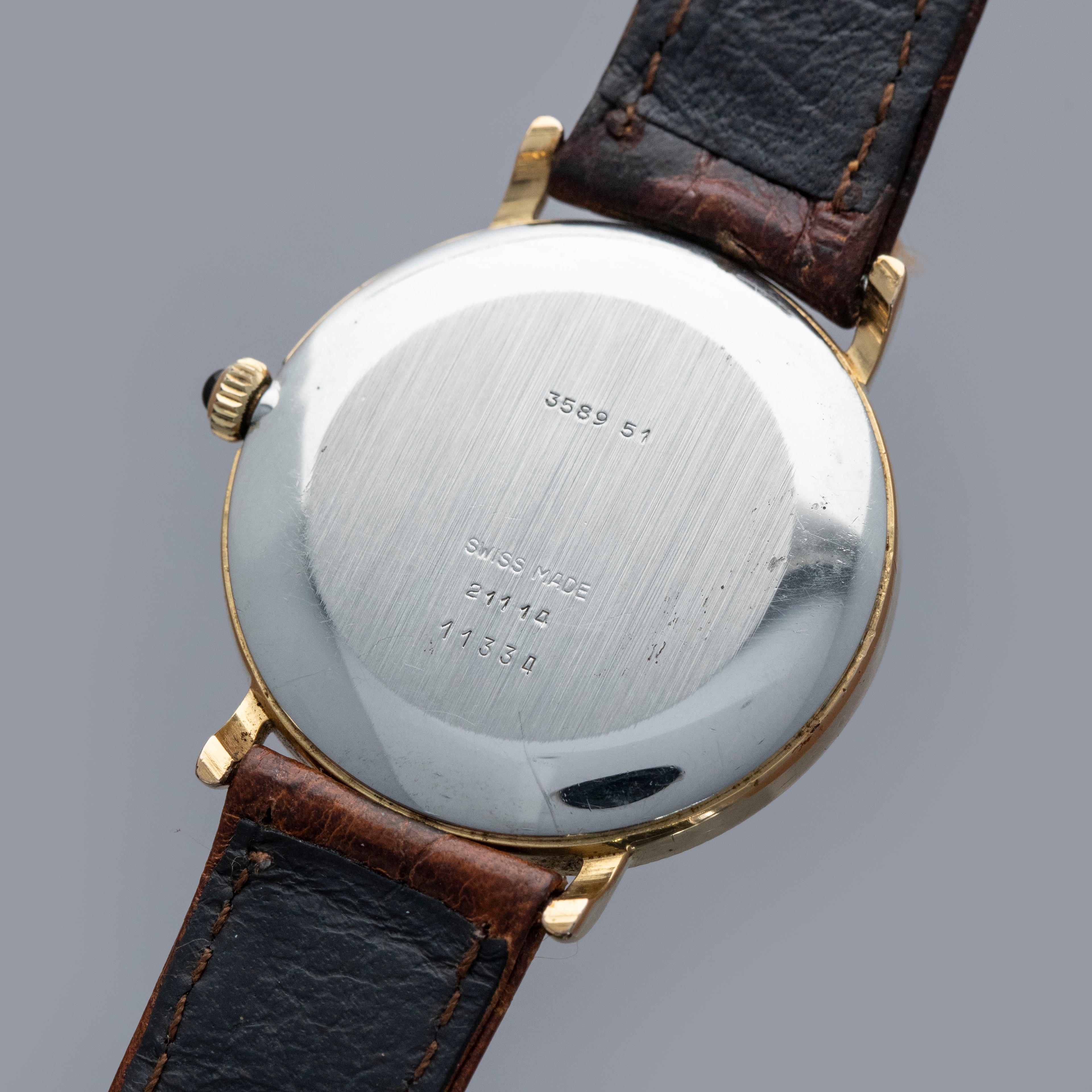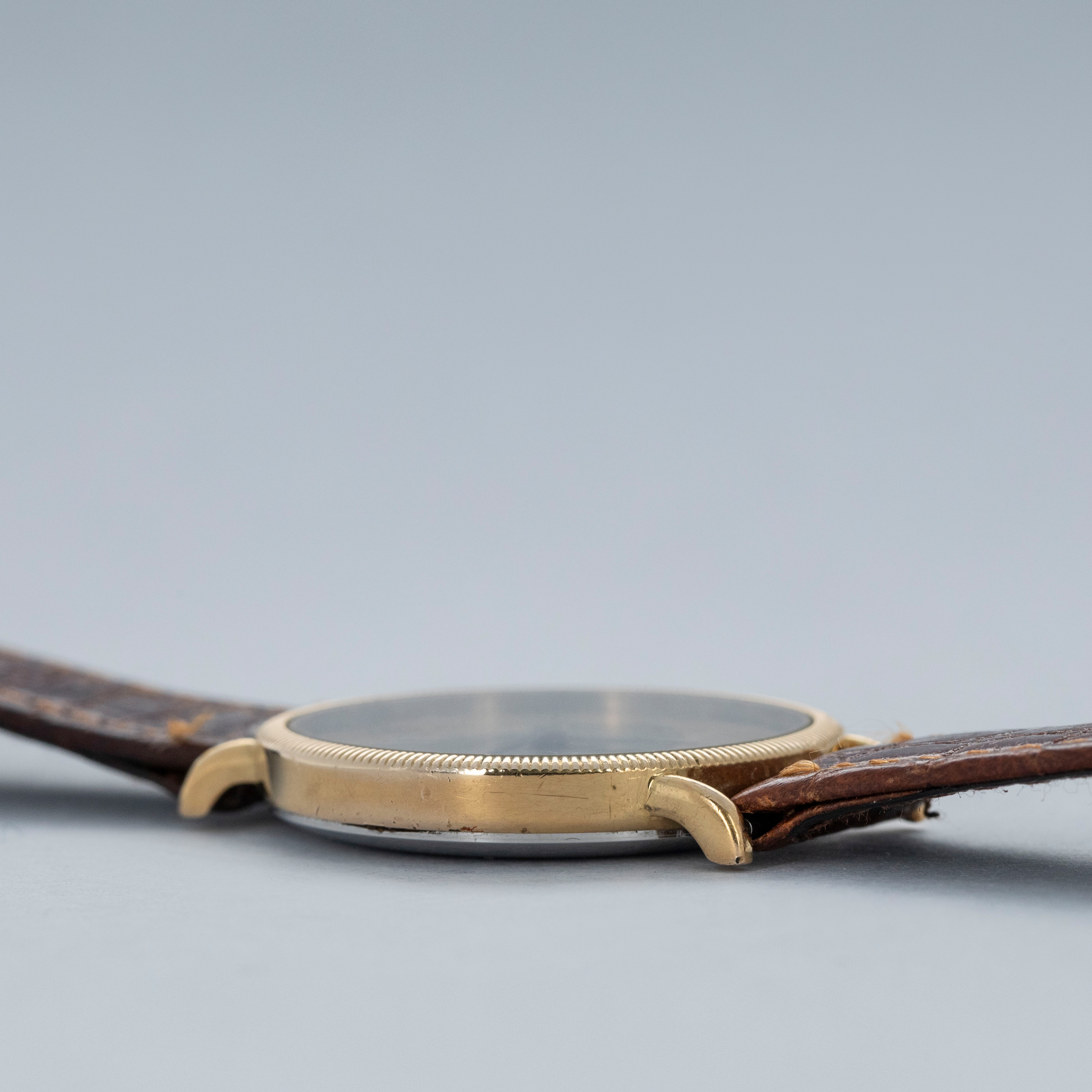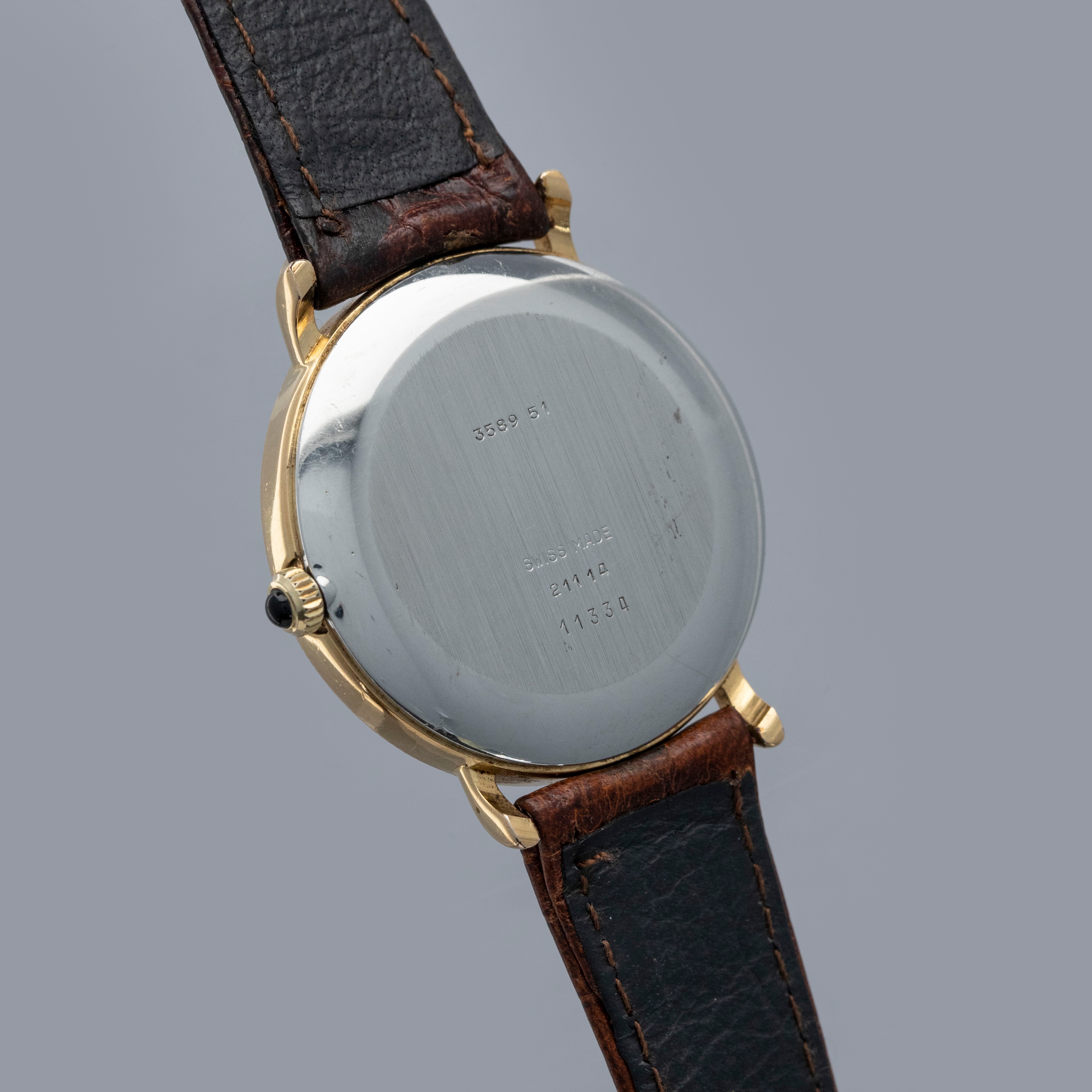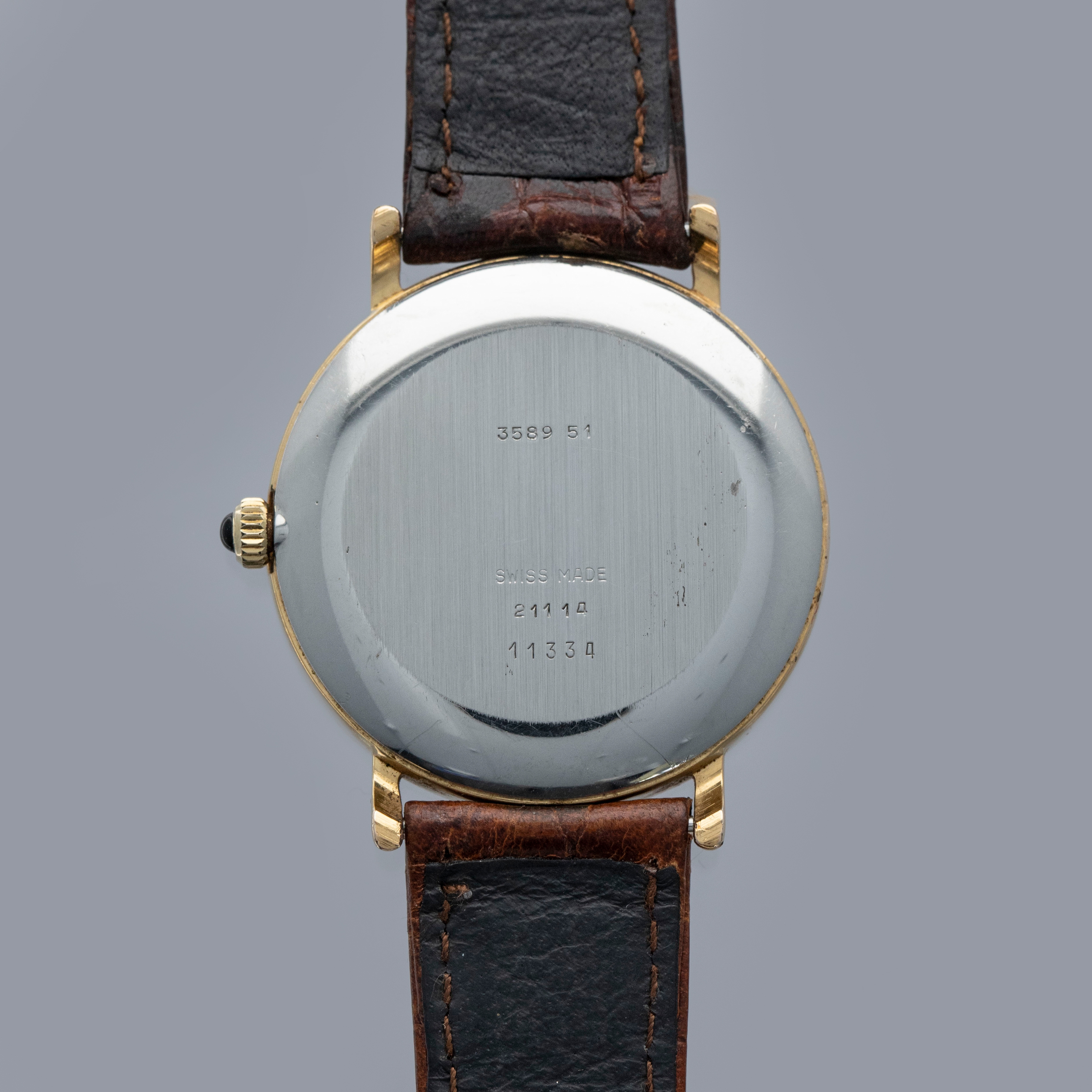 Watch is in overall excellent condition. The yellow gold plated case shows light scratches, with a well-defined coin-edge bezel that has slight softening around the edges. The steel case back features sharp engravings, and the cabochon-topped winder is in excellent condition. The Tiffany & Co. signed dial has some light marks but retains crisp text and detailing. The black hands are very clean. It is fitted with a brown leather strap and a gold-plated buckle.