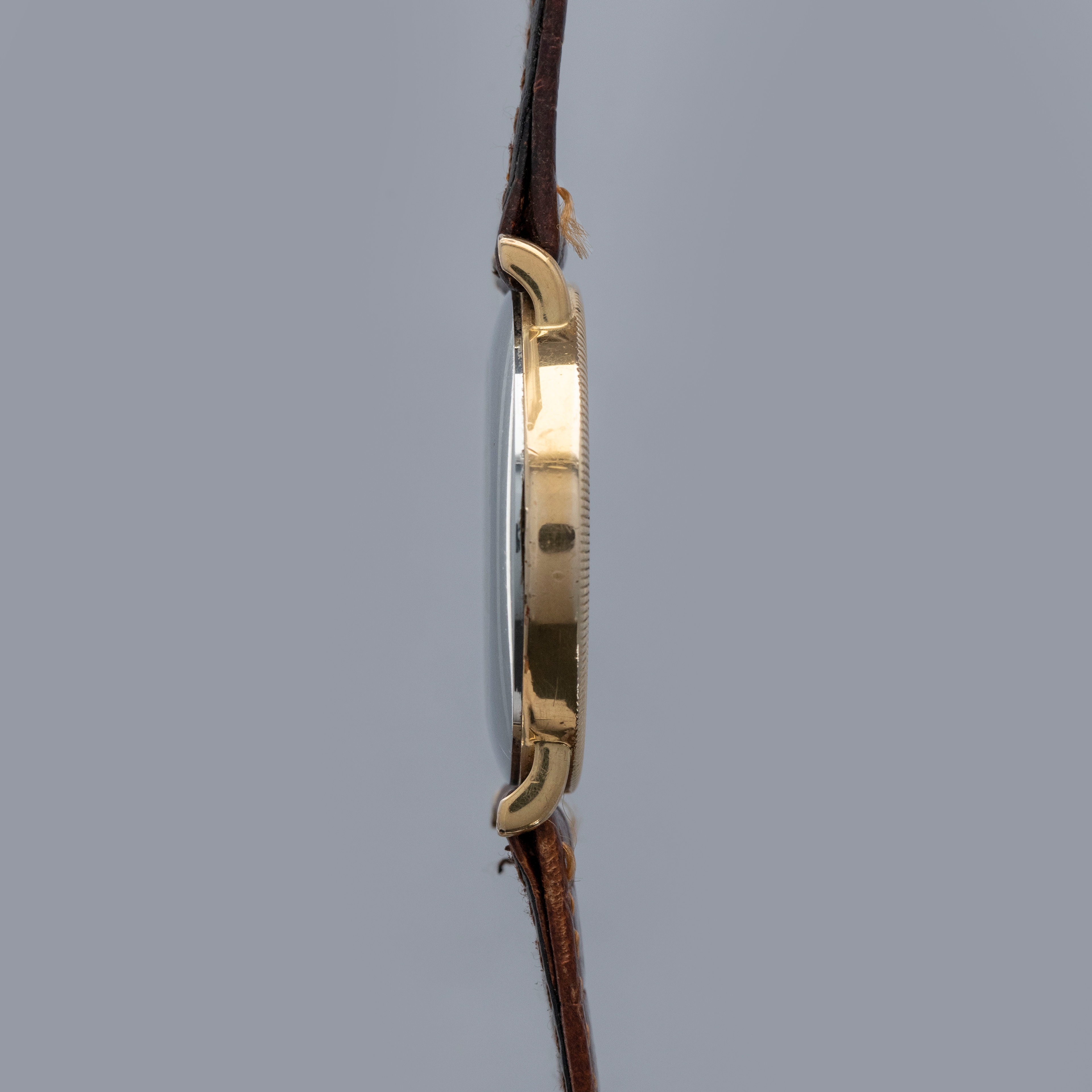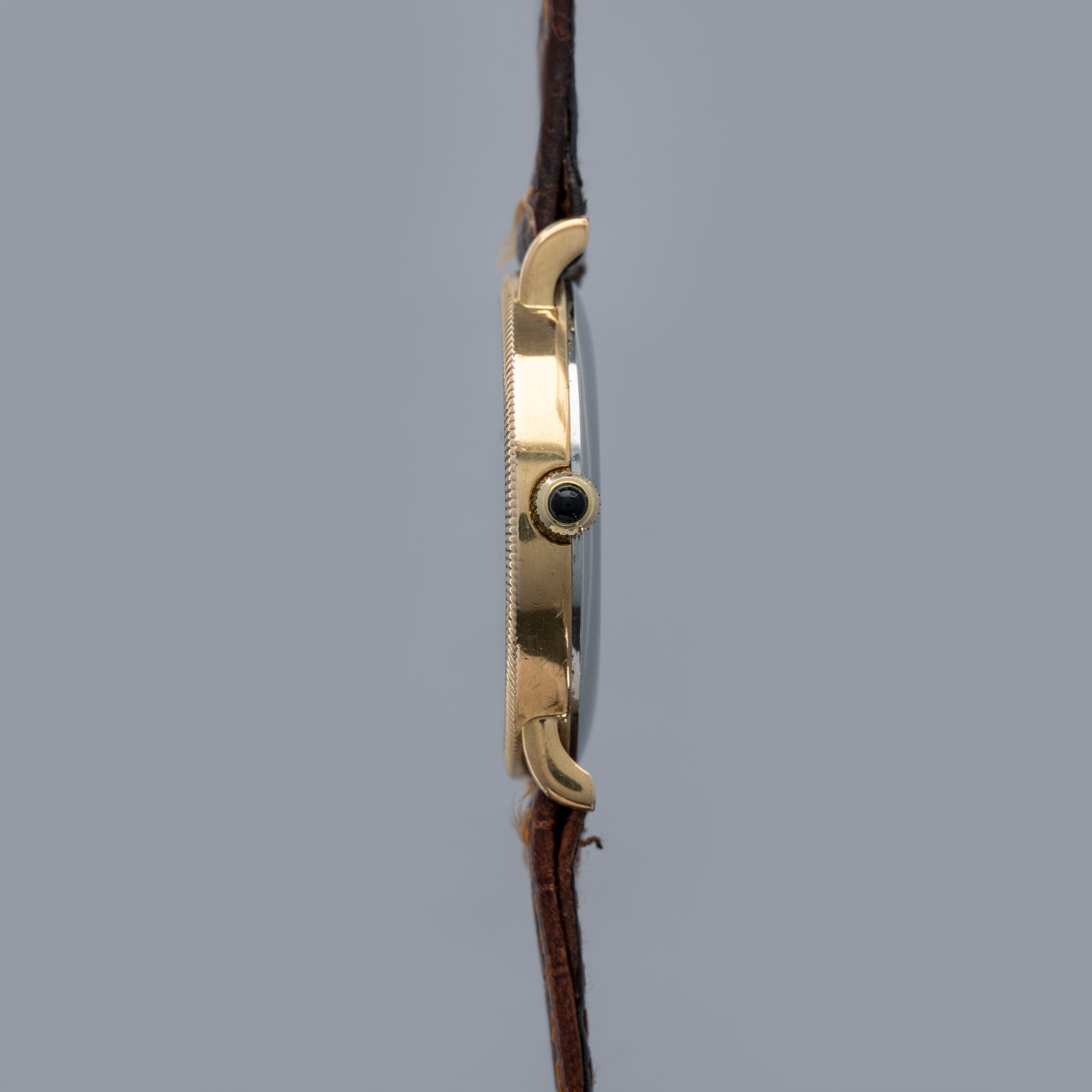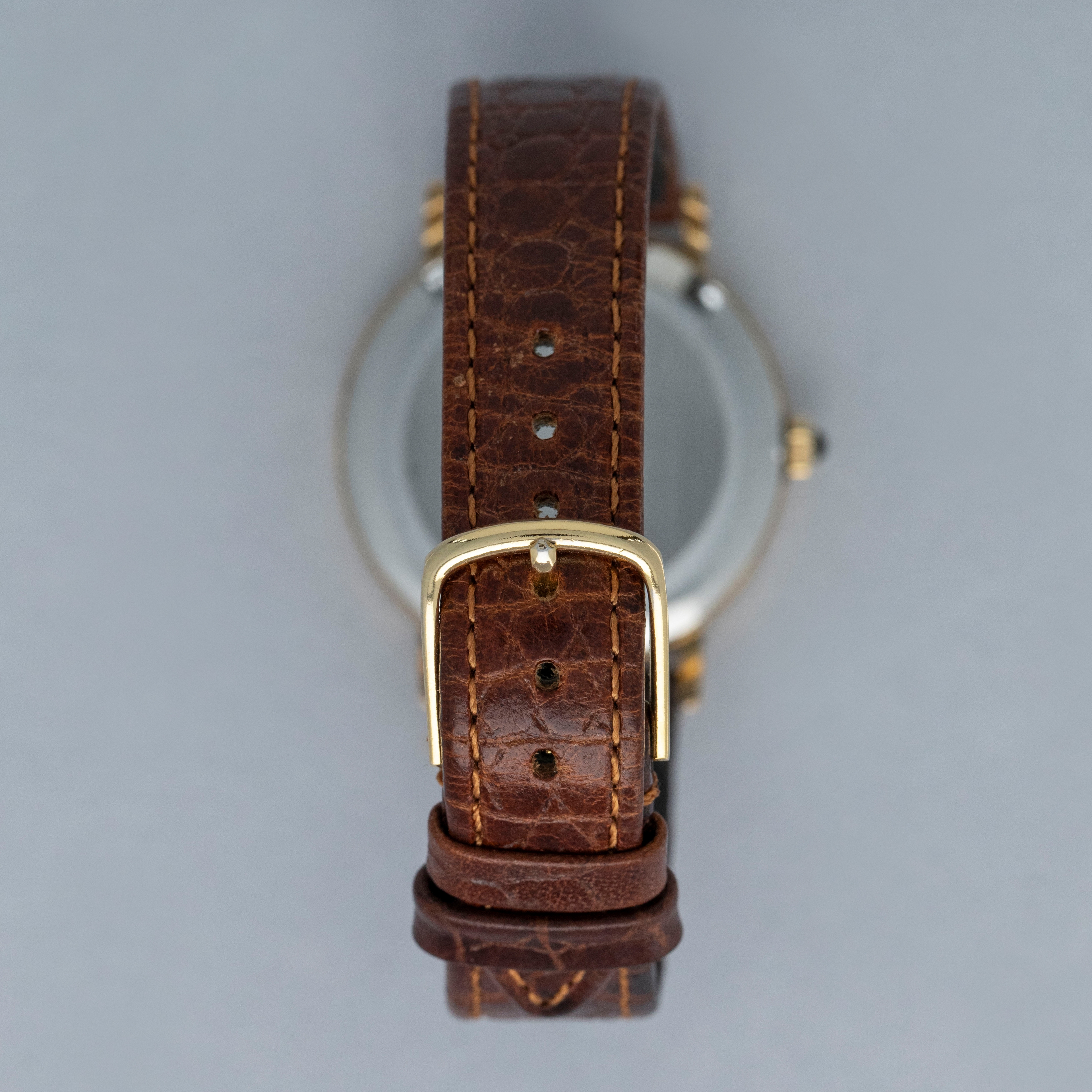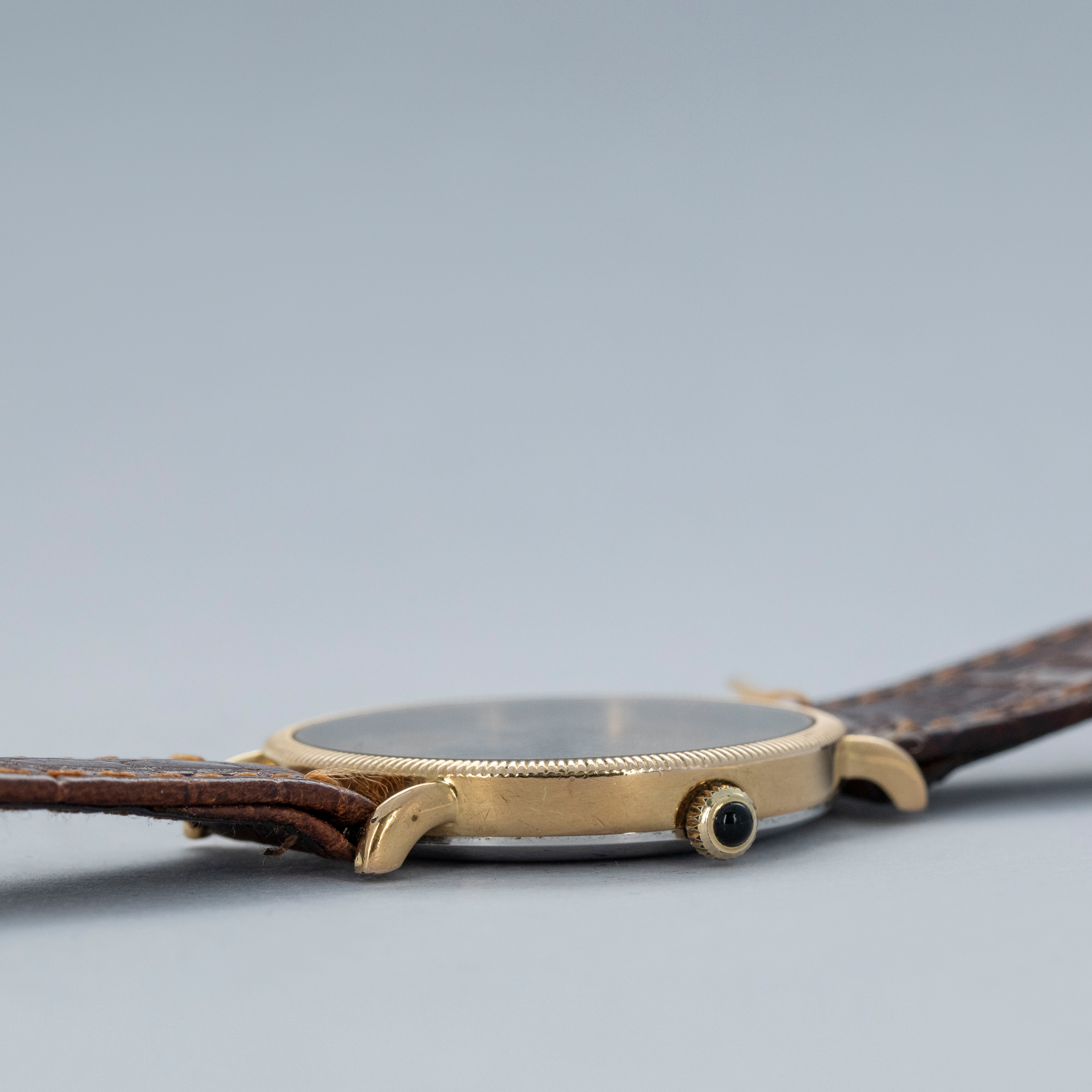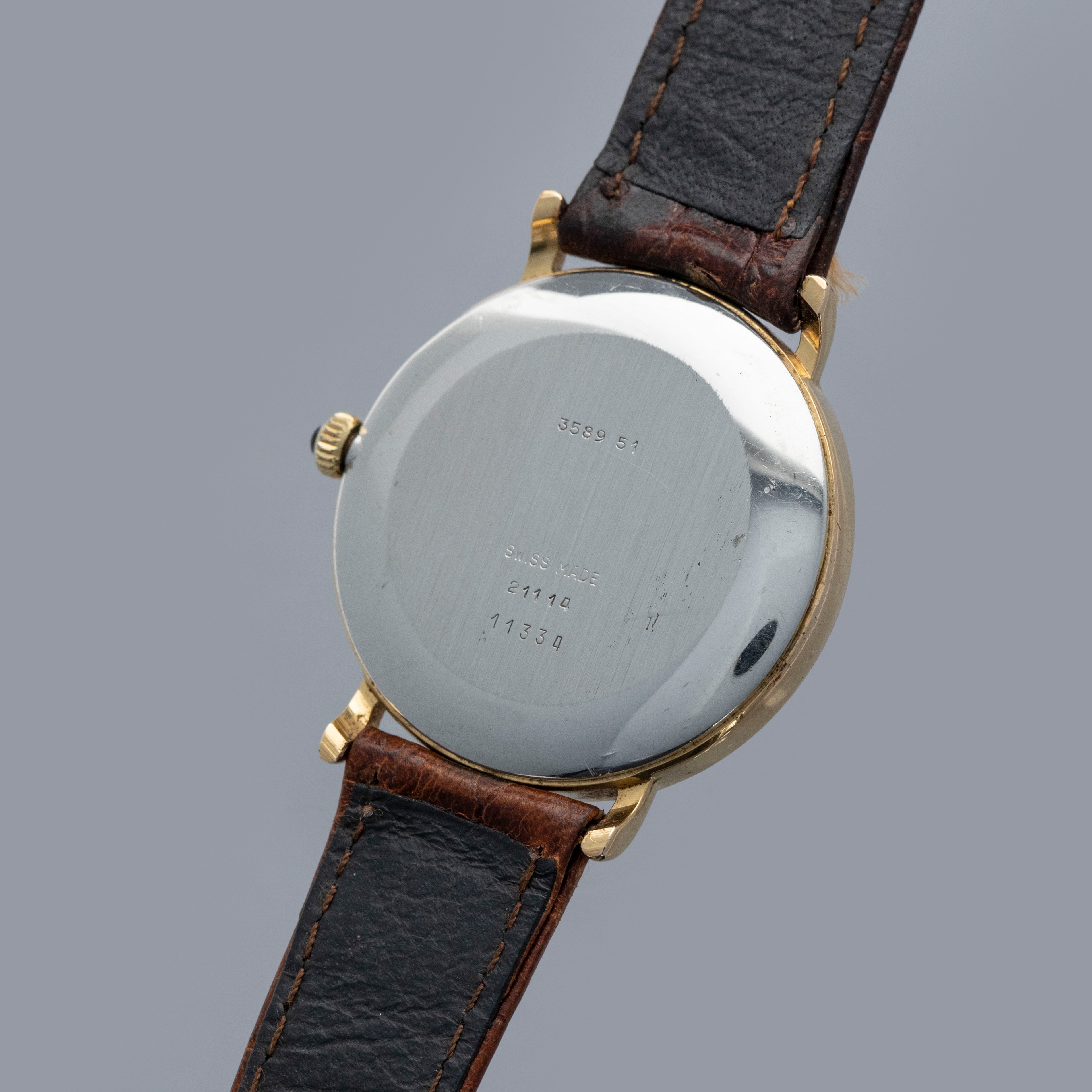 Watch is in overall excellent condition. The yellow gold plated case shows light scratches, with a well-defined coin-edge bezel that has slight softening around the edges. The steel case back features sharp engravings, and the cabochon-topped winder is in excellent condition. The Tiffany & Co. signed dial has some light marks but retains crisp text and detailing. The black hands are very clean. It is fitted with a brown leather strap and a gold-plated buckle.