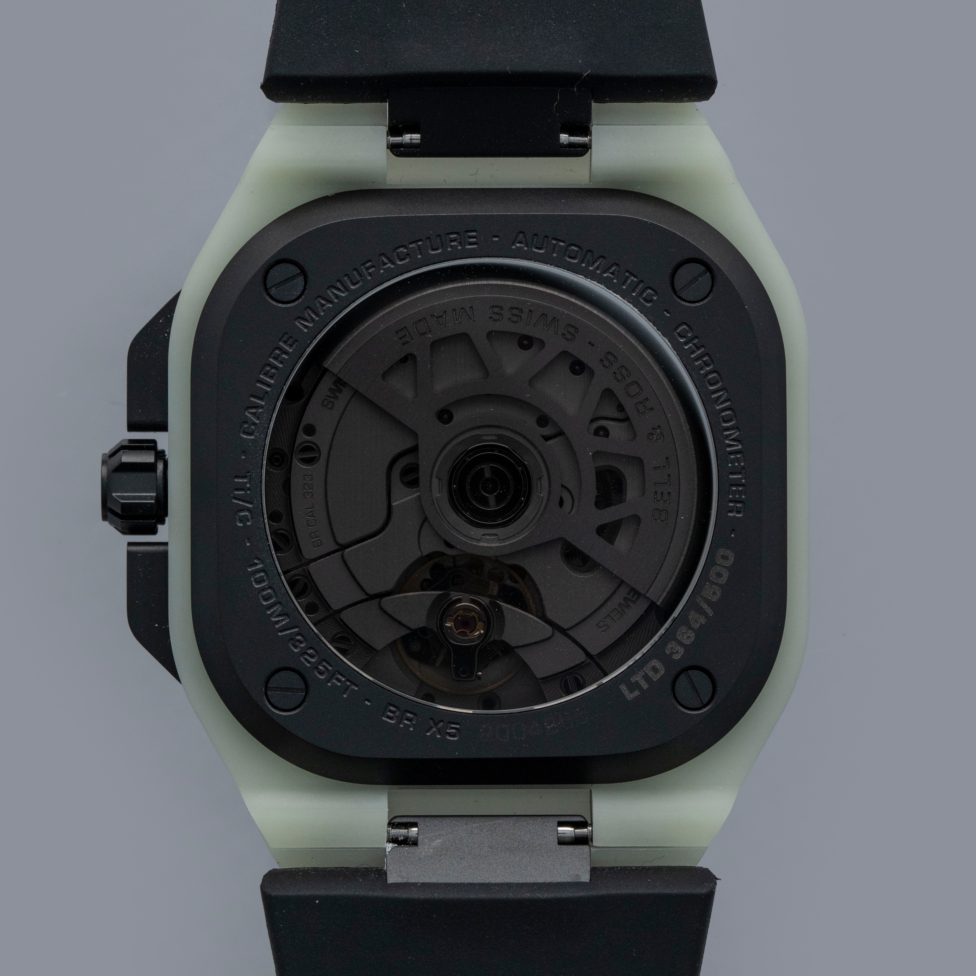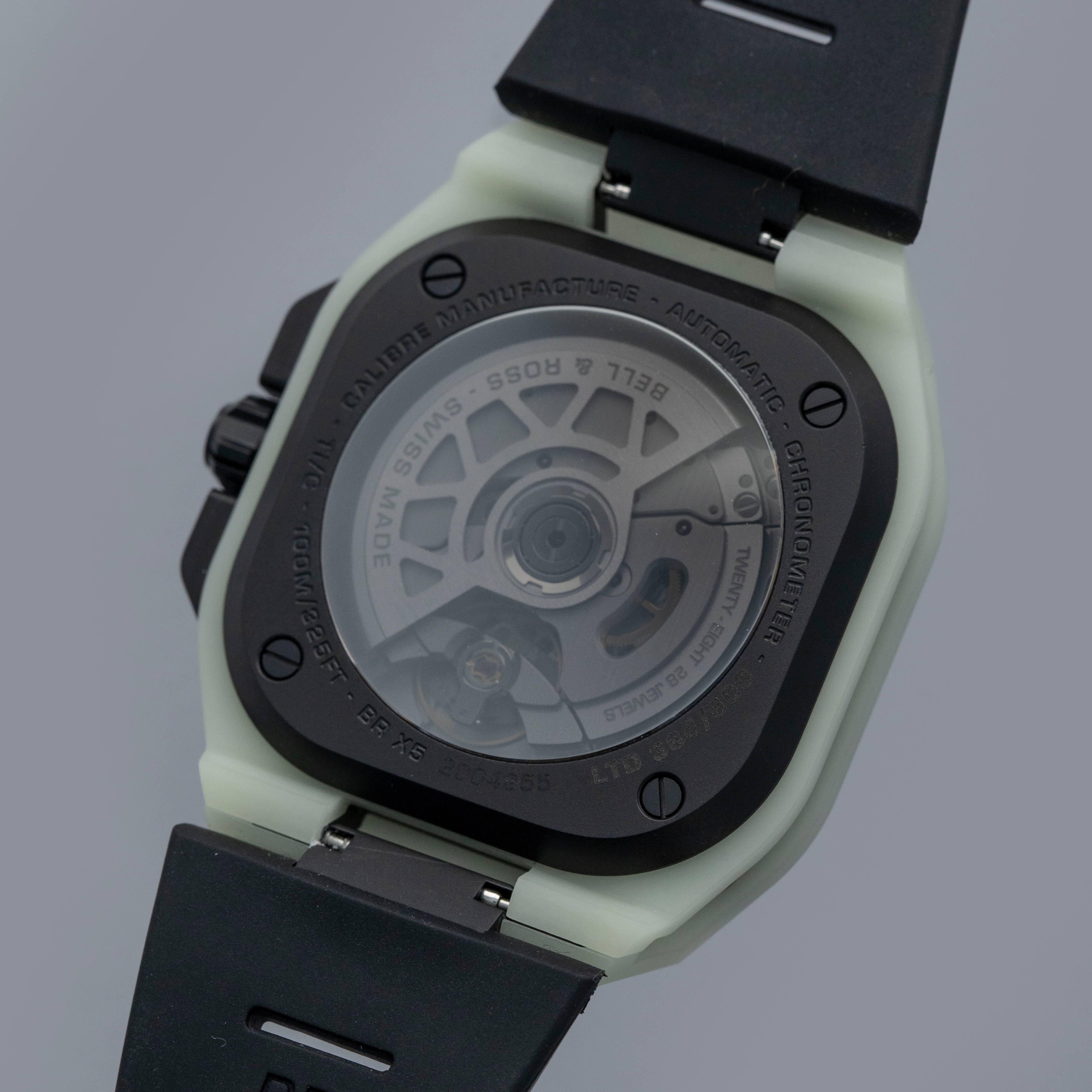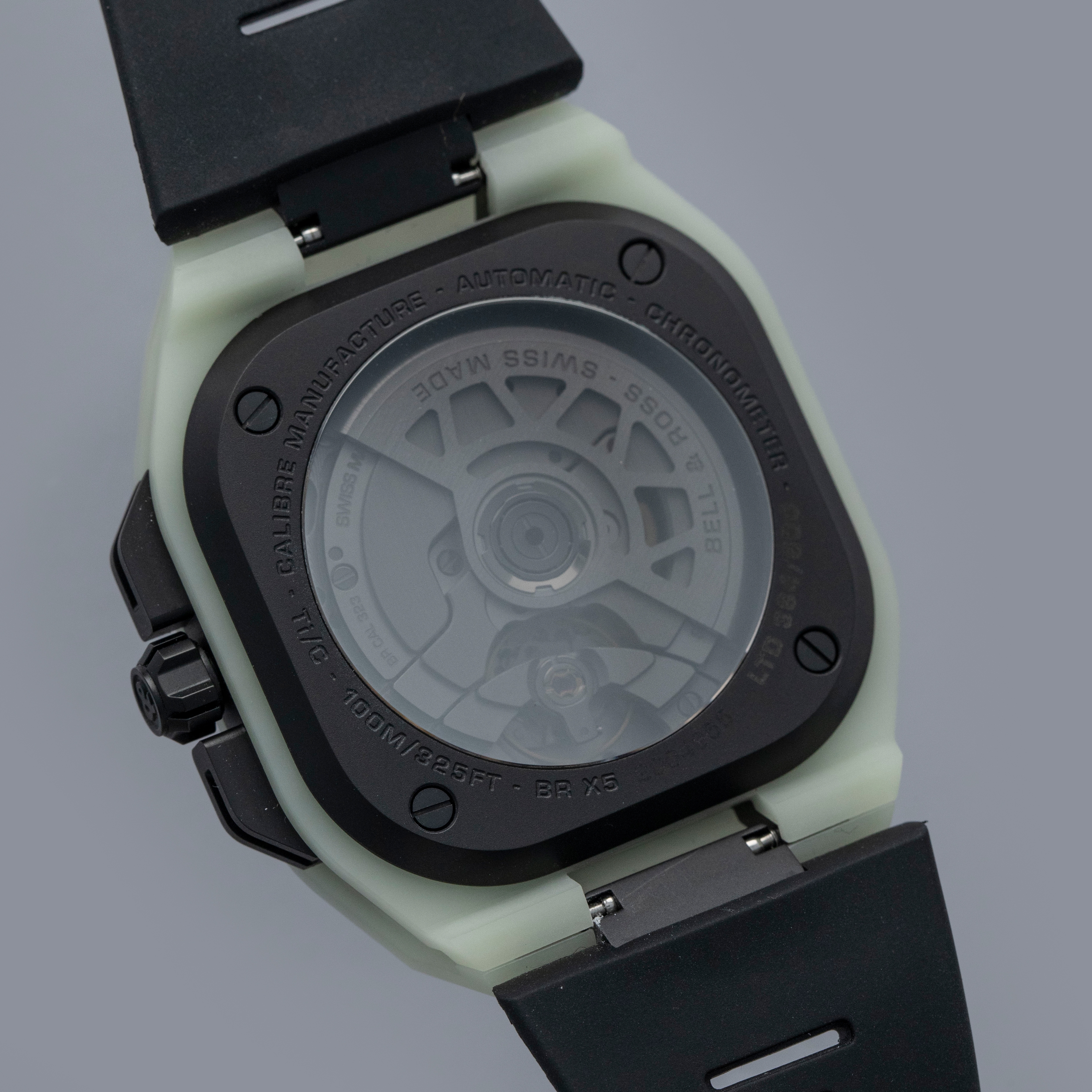 Made from titanium and an epoxy quartz fibre that Bell & Ross have named LM3D, the BR-X5's entire case glows in the dark with an unprecedented uniformity and brightness, and it's as strong as carbon fiber but 70% lighter than steel.