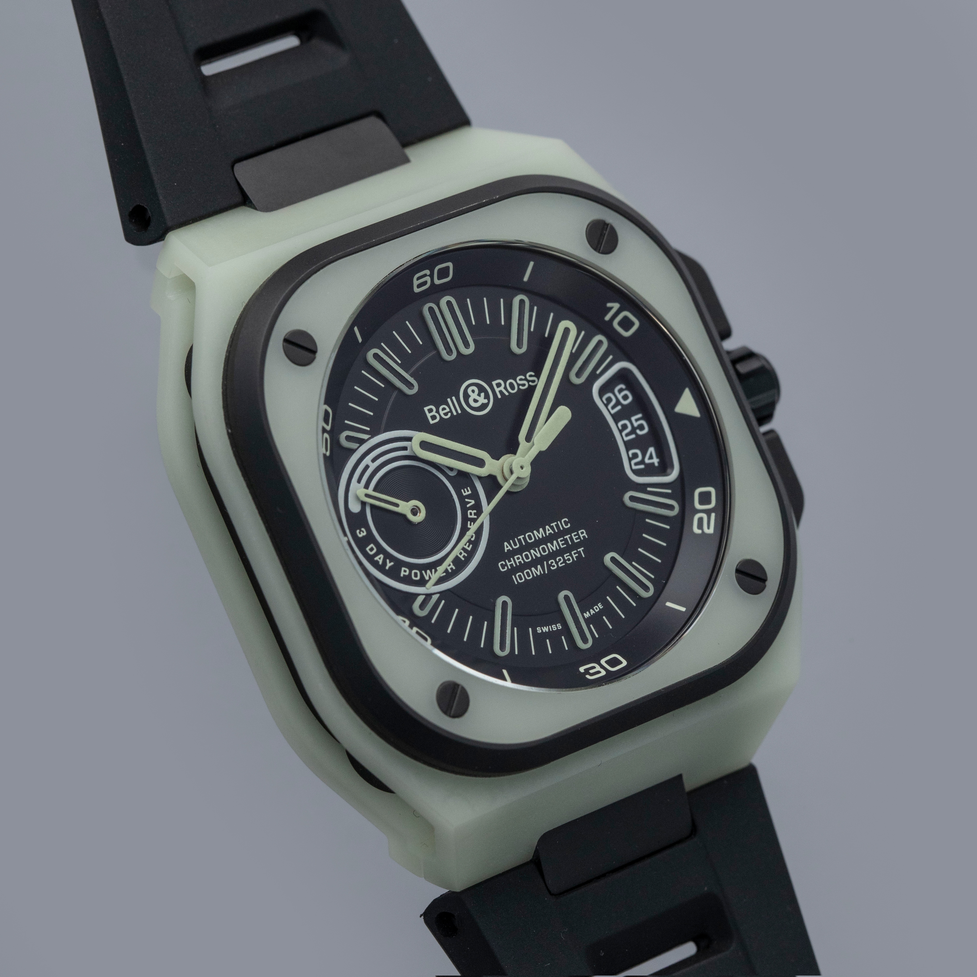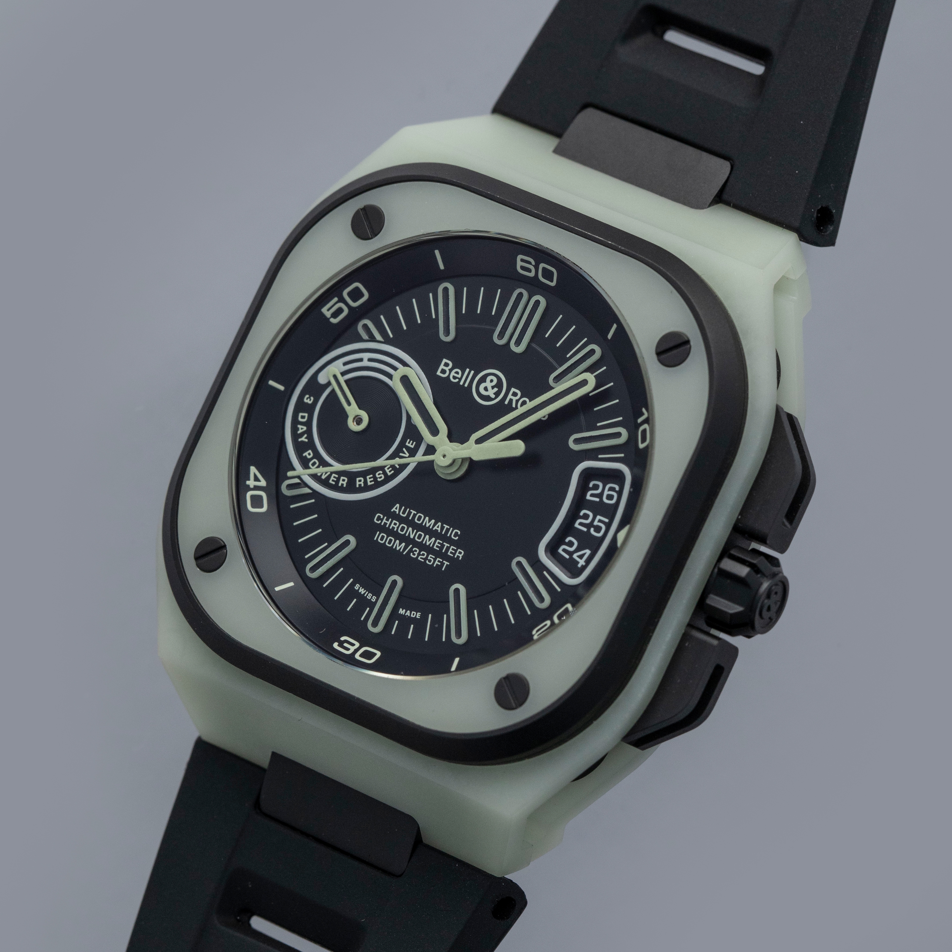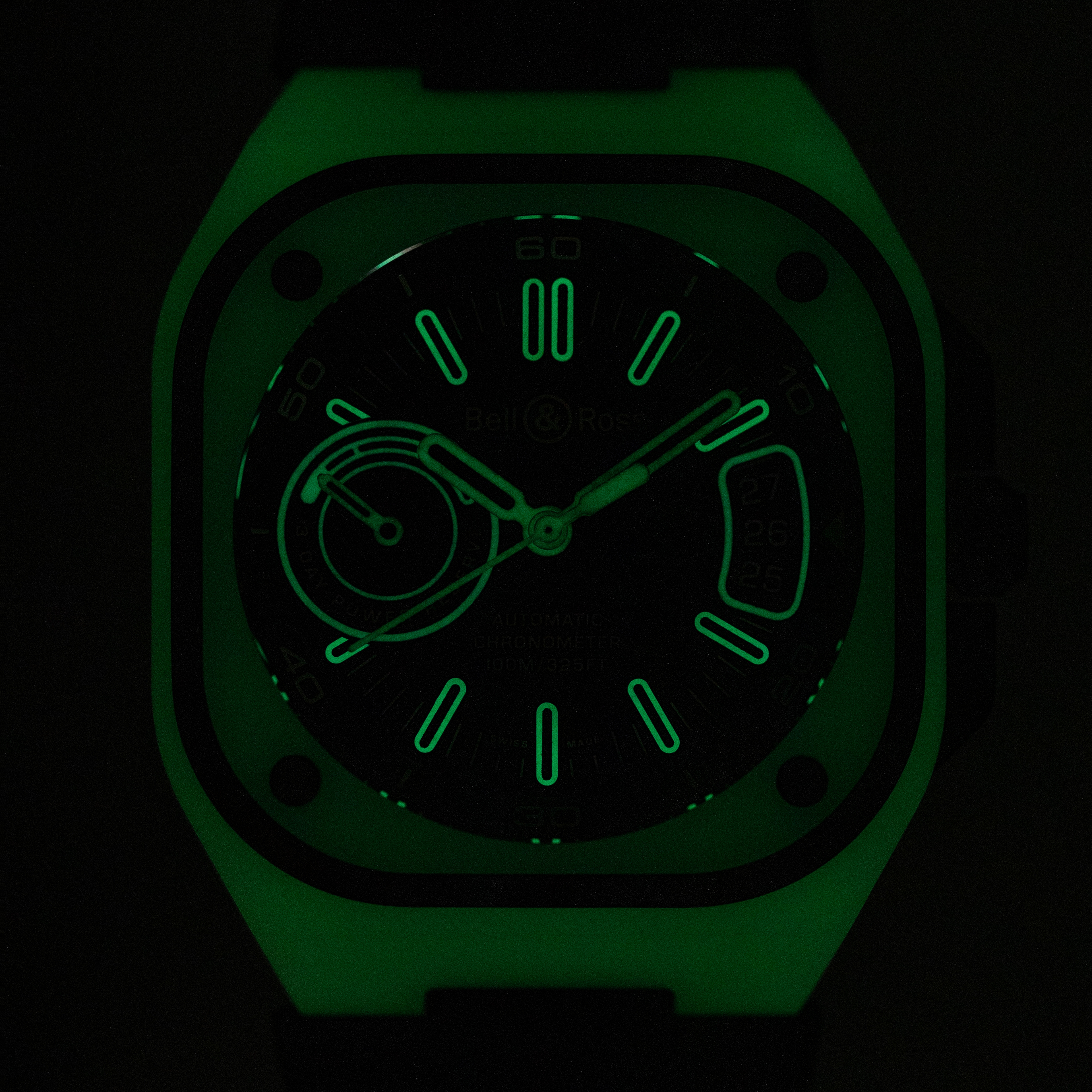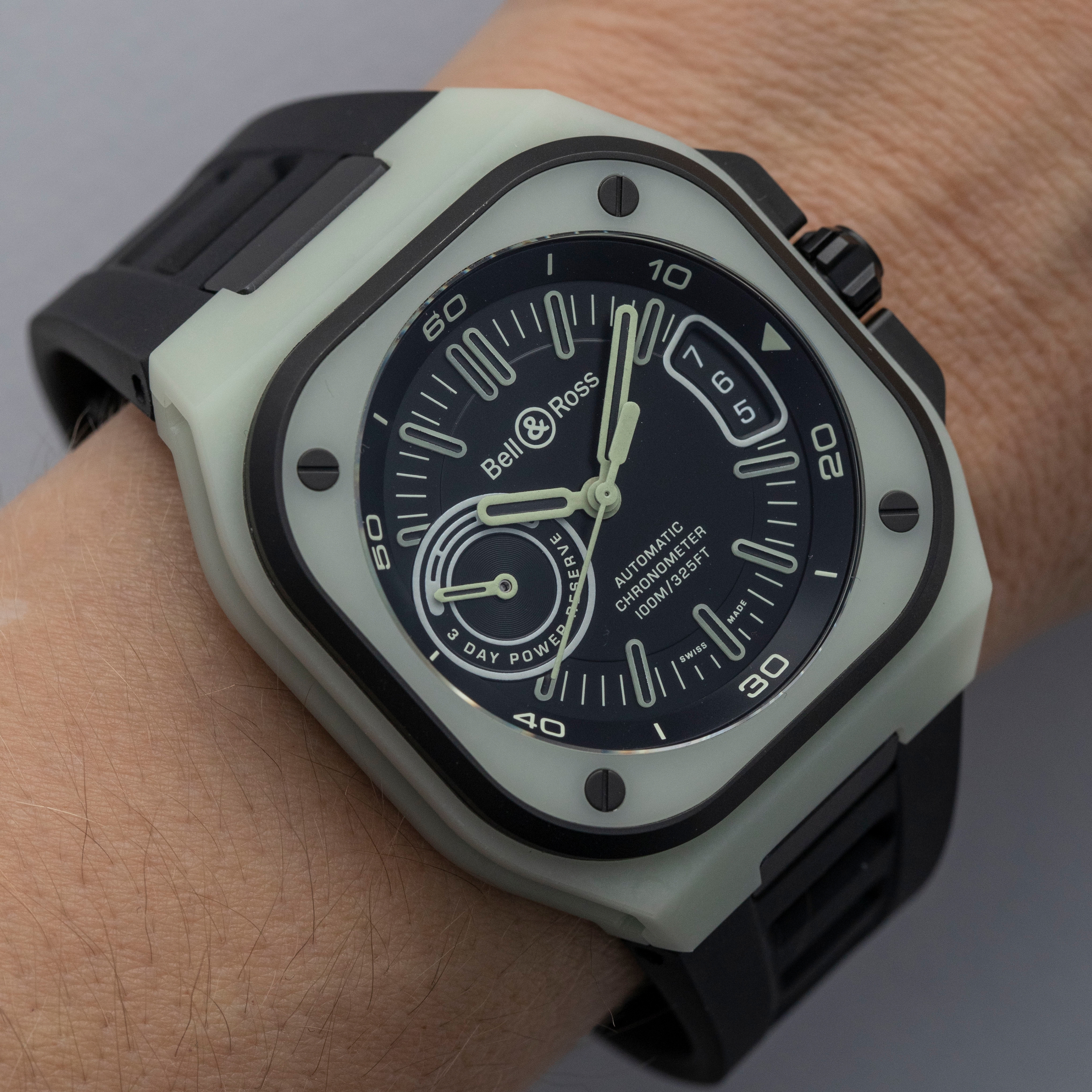 Made from titanium and an epoxy quartz fibre that Bell & Ross have named LM3D, the BR-X5's entire case glows in the dark with an unprecedented uniformity and brightness, and it's as strong as carbon fiber but 70% lighter than steel.