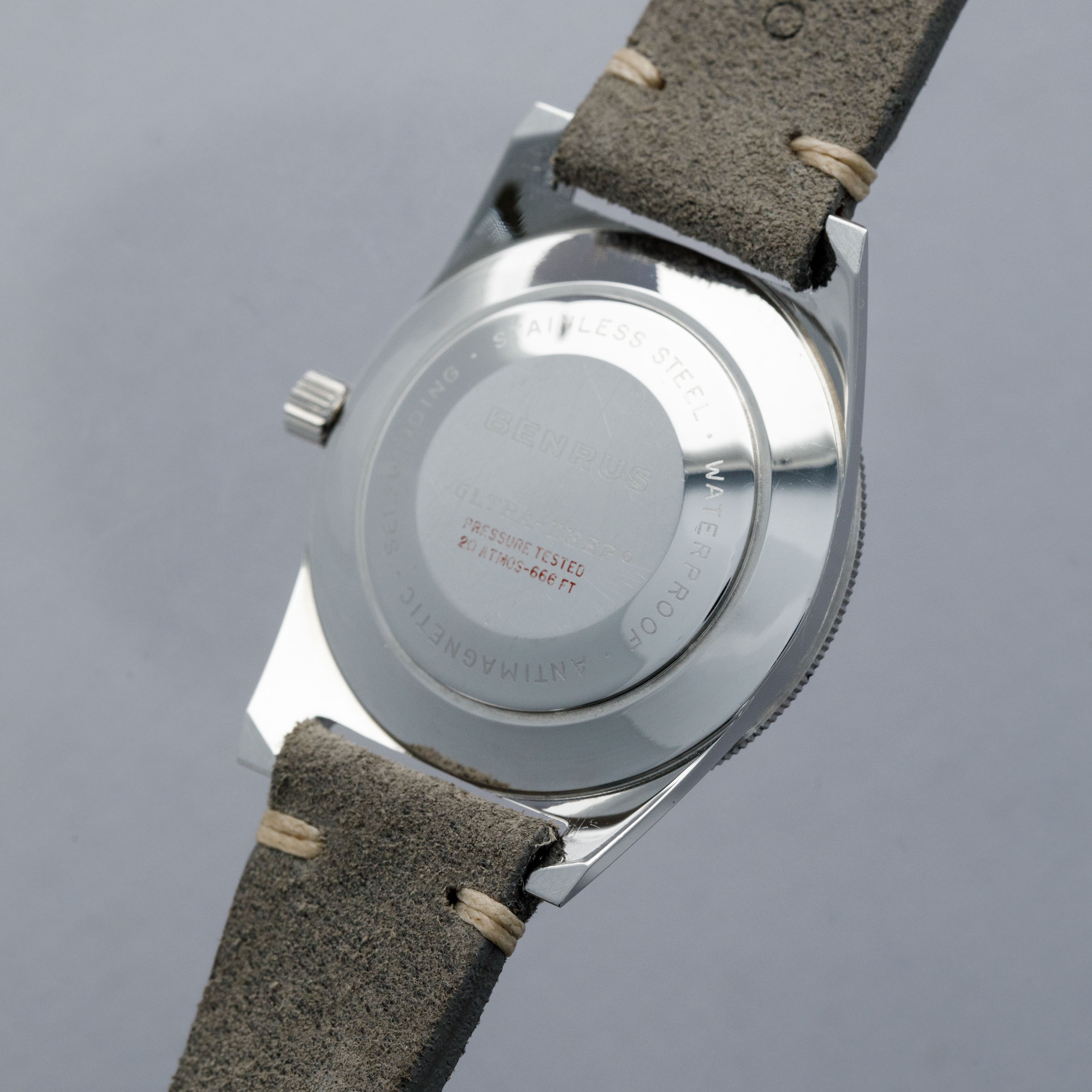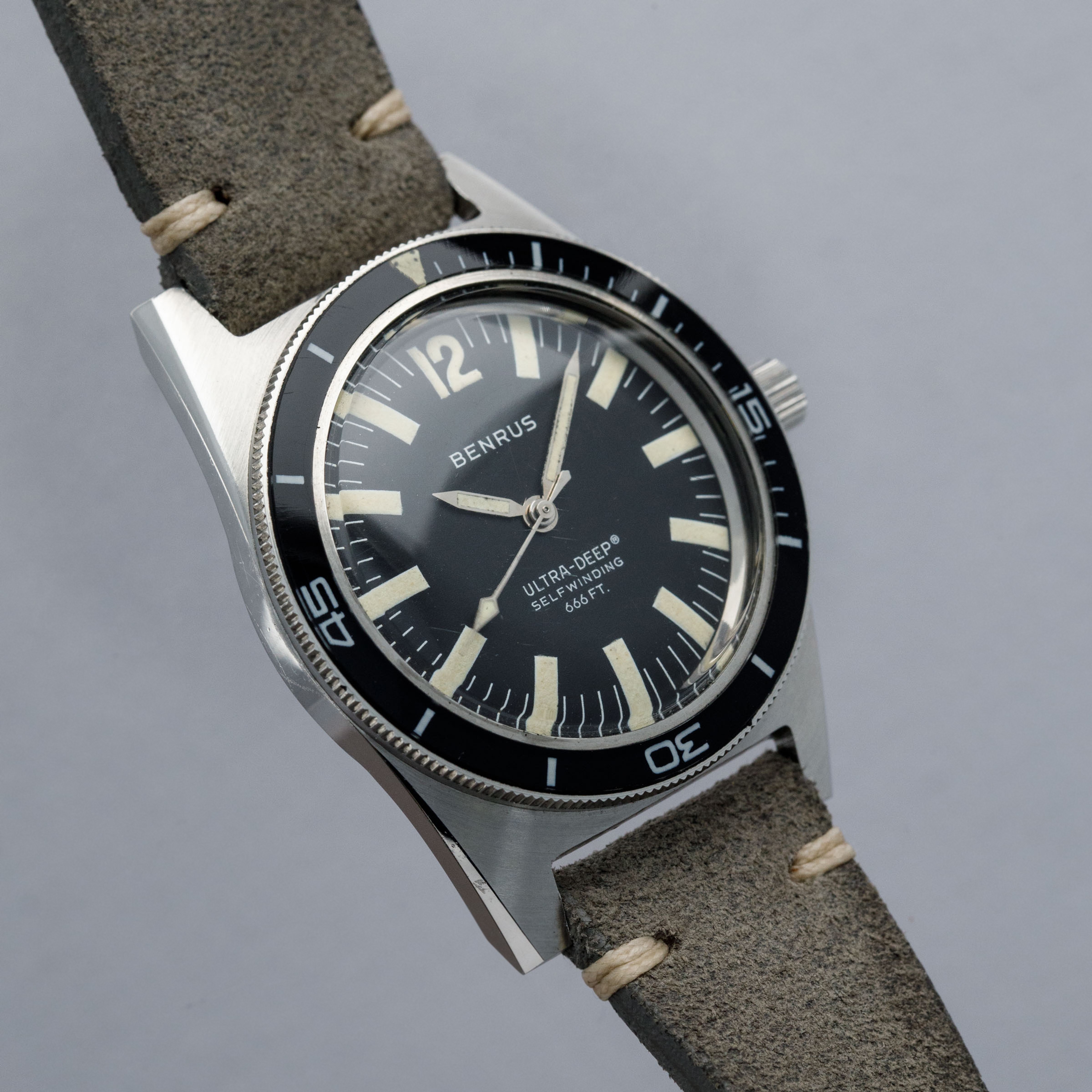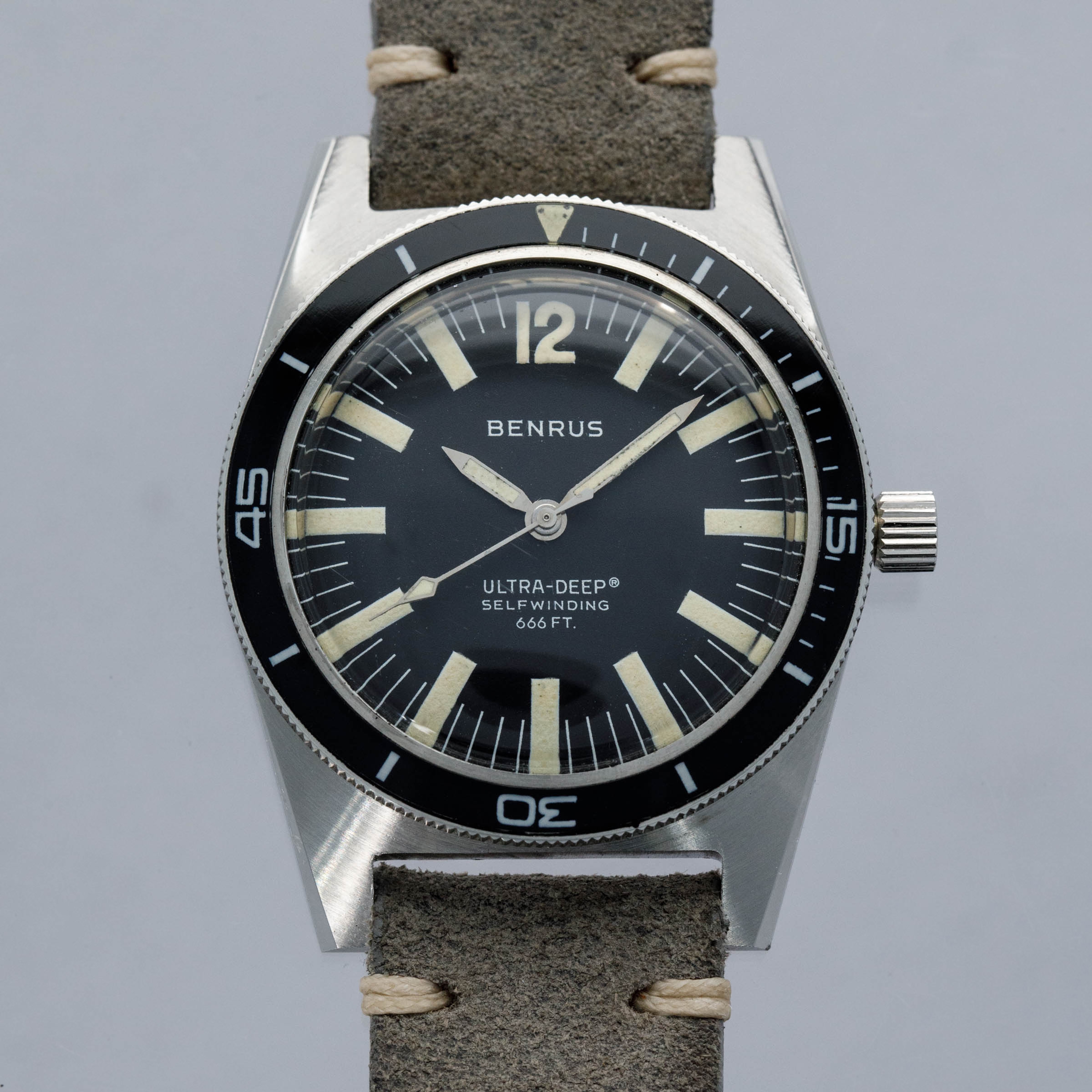 Founded in the USA in 1921 by Benjamin Lazrus and his two brothers, Benrus started life as a watchmaker’s shop in New York where it continued until the late ‘20s when the company transitioned into manufacturing watches by importing parts from Switzerland. Built on the back of the popularity of those watches, Benrus emerged as the watch of choice for soldiers within the US military, with their watches becoming synonymous with the Vietnam war and WWII. Offered here, we have the Benrus Ultra-Deep ref. 6088 dive watch from the late 1960s. Created with a different design language to other dive watches of its time, the Ultra-Deep is immediately more wearable than its competitors from other brands, with a 36mm-wide stainless steel case. While other dive watches were typically around 40mm in order to maximise legibility, the Ultra-Deep instead makes use of its abundance of luminescence to provide legibility, with long thick hour markers and large hands, which remain bright against their black backdrop. With a luminous black bezel insert, thanks to its inverted triangle pip, the Ultra-Deep is a wonderful example of just how careful design can compensate for a sports watch’s smaller size. Powered by the robust automatic Benrus cal. FE 2D1 movement (based on an ETA 2452), this robust front-loading monobloc is a wonderful reminder of how Benrus earned their reputation amongst the military personnel who championed their watches.