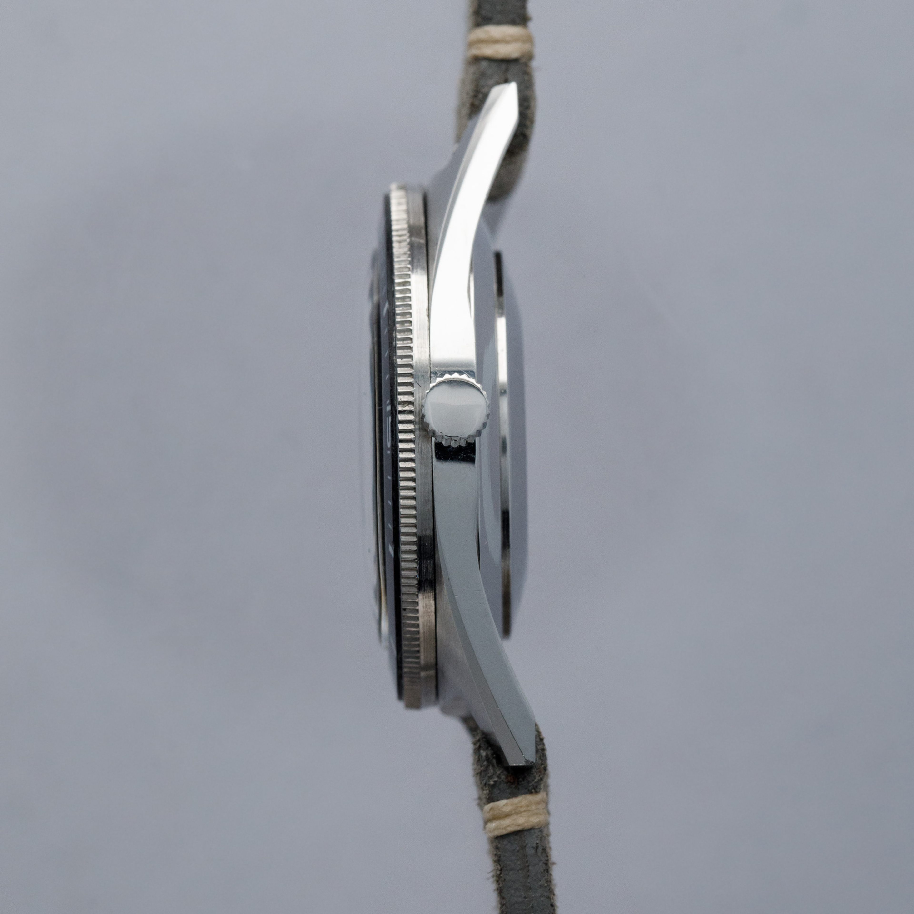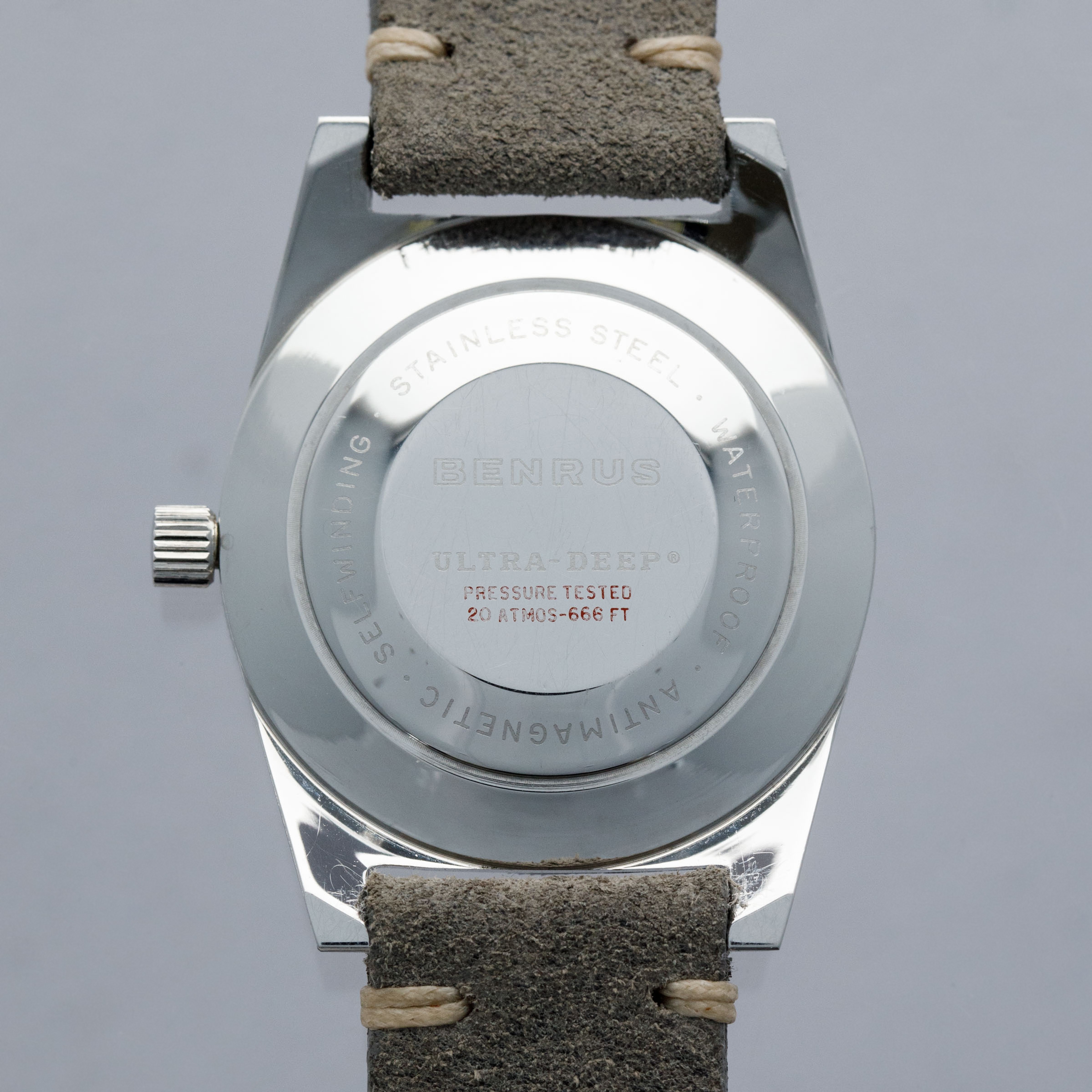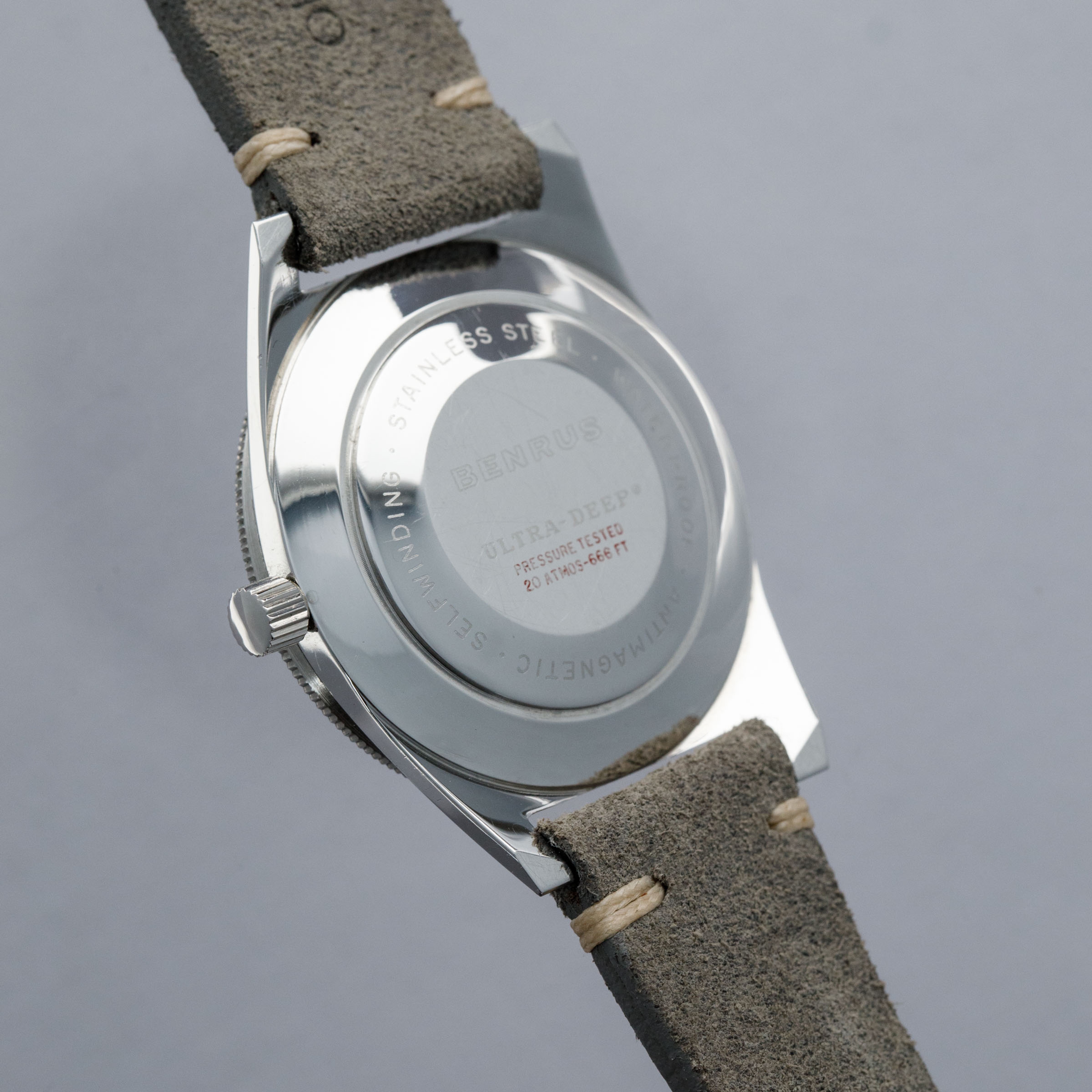 Founded in the USA in 1921 by Benjamin Lazrus and his two brothers, Benrus started life as a watchmaker’s shop in New York where it continued until the late ‘20s when the company transitioned into manufacturing watches by importing parts from Switzerland. Built on the back of the popularity of those watches, Benrus emerged as the watch of choice for soldiers within the US military, with their watches becoming synonymous with the Vietnam war and WWII. Offered here, we have the Benrus Ultra-Deep ref. 6088 dive watch from the late 1960s. Created with a different design language to other dive watches of its time, the Ultra-Deep is immediately more wearable than its competitors from other brands, with a 36mm-wide stainless steel case. While other dive watches were typically around 40mm in order to maximise legibility, the Ultra-Deep instead makes use of its abundance of luminescence to provide legibility, with long thick hour markers and large hands, which remain bright against their black backdrop. With a luminous black bezel insert, thanks to its inverted triangle pip, the Ultra-Deep is a wonderful example of just how careful design can compensate for a sports watch’s smaller size. Powered by the robust automatic Benrus cal. FE 2D1 movement (based on an ETA 2452), this robust front-loading monobloc is a wonderful reminder of how Benrus earned their reputation amongst the military personnel who championed their watches.