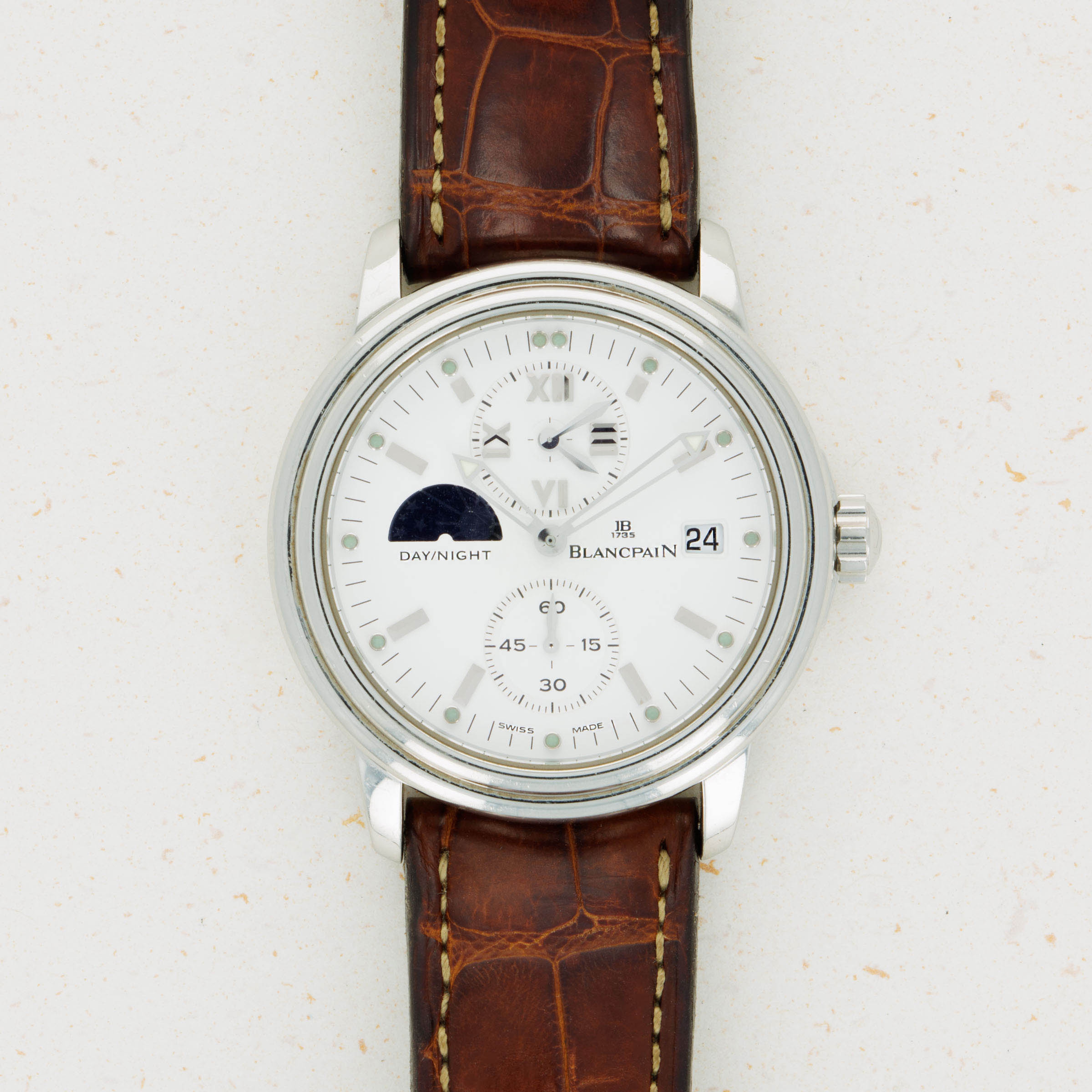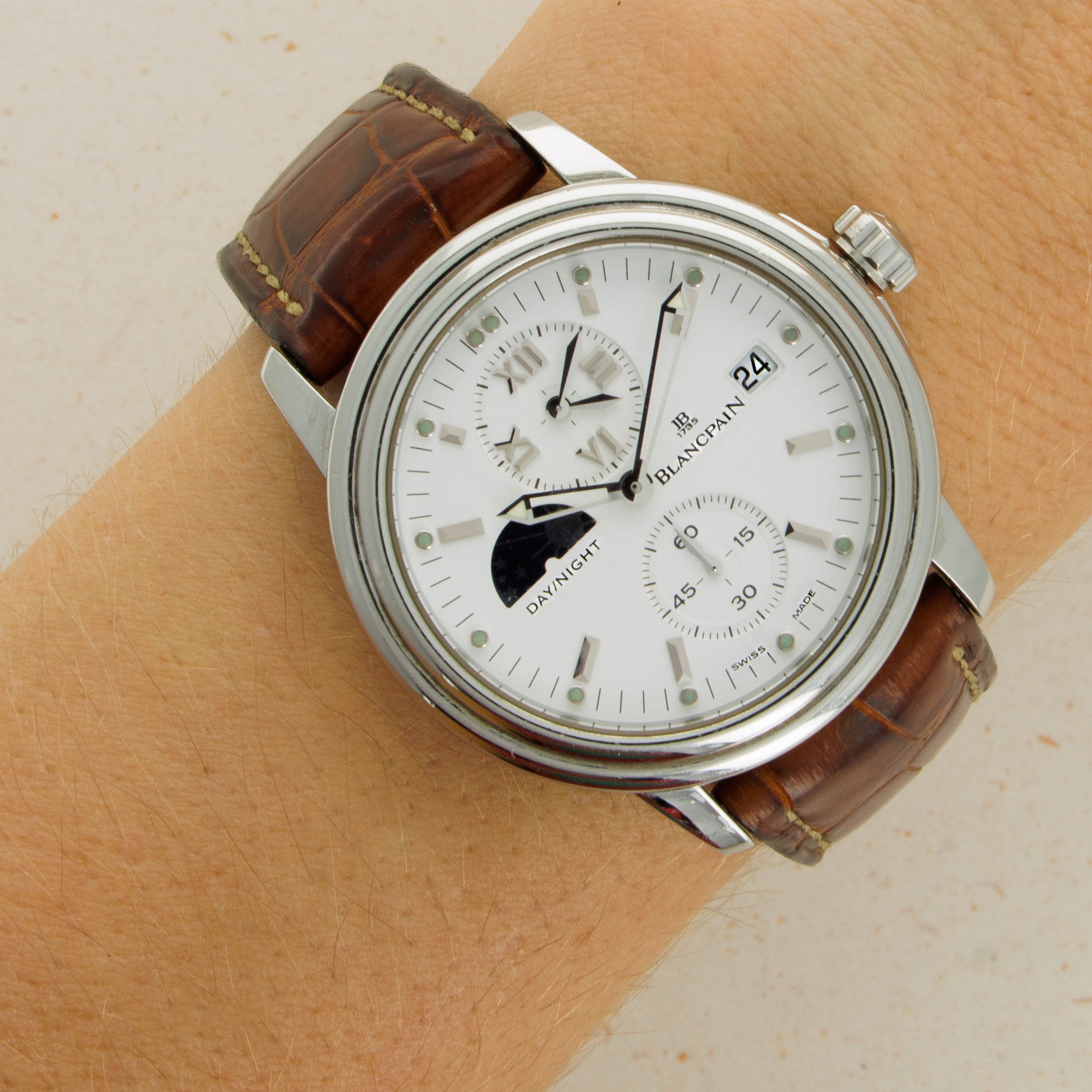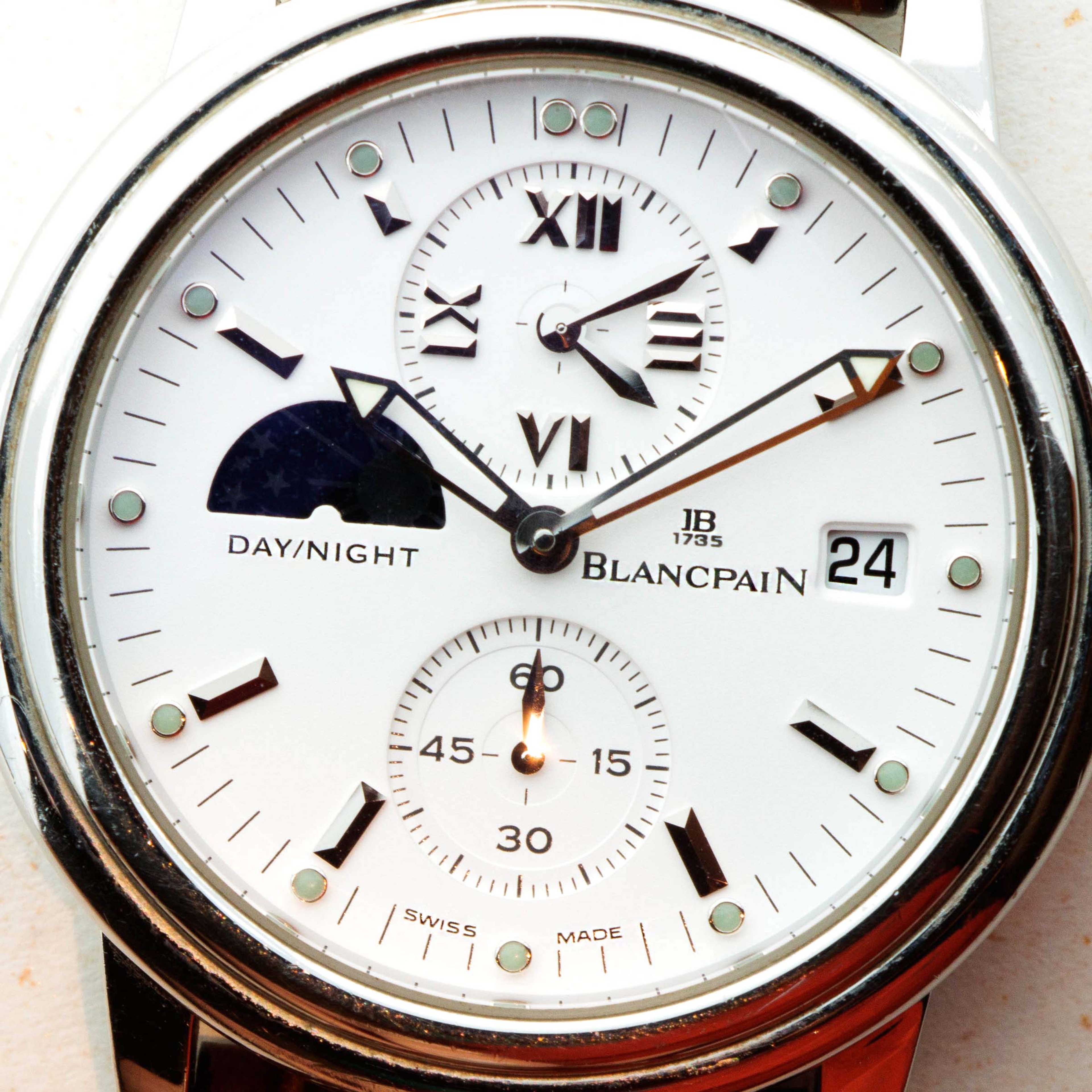Featuring a bright white dial, the Leman GMT Dual Time's display is rather reserved, in keeping with Blancpain's typical aesthetic. This is achieved through its lack of contrasting colors and the Roman numerals used in its dual time subdial.