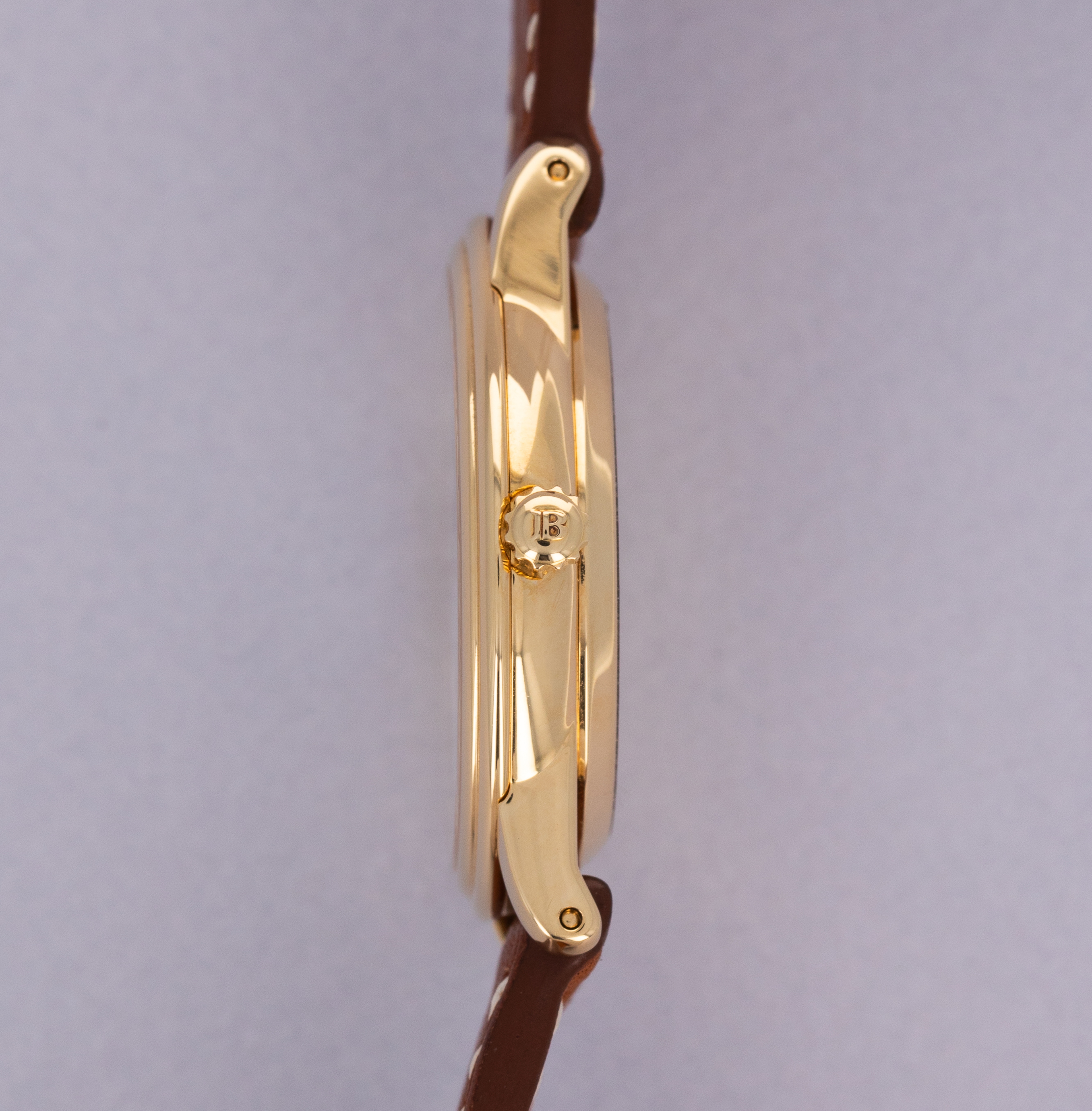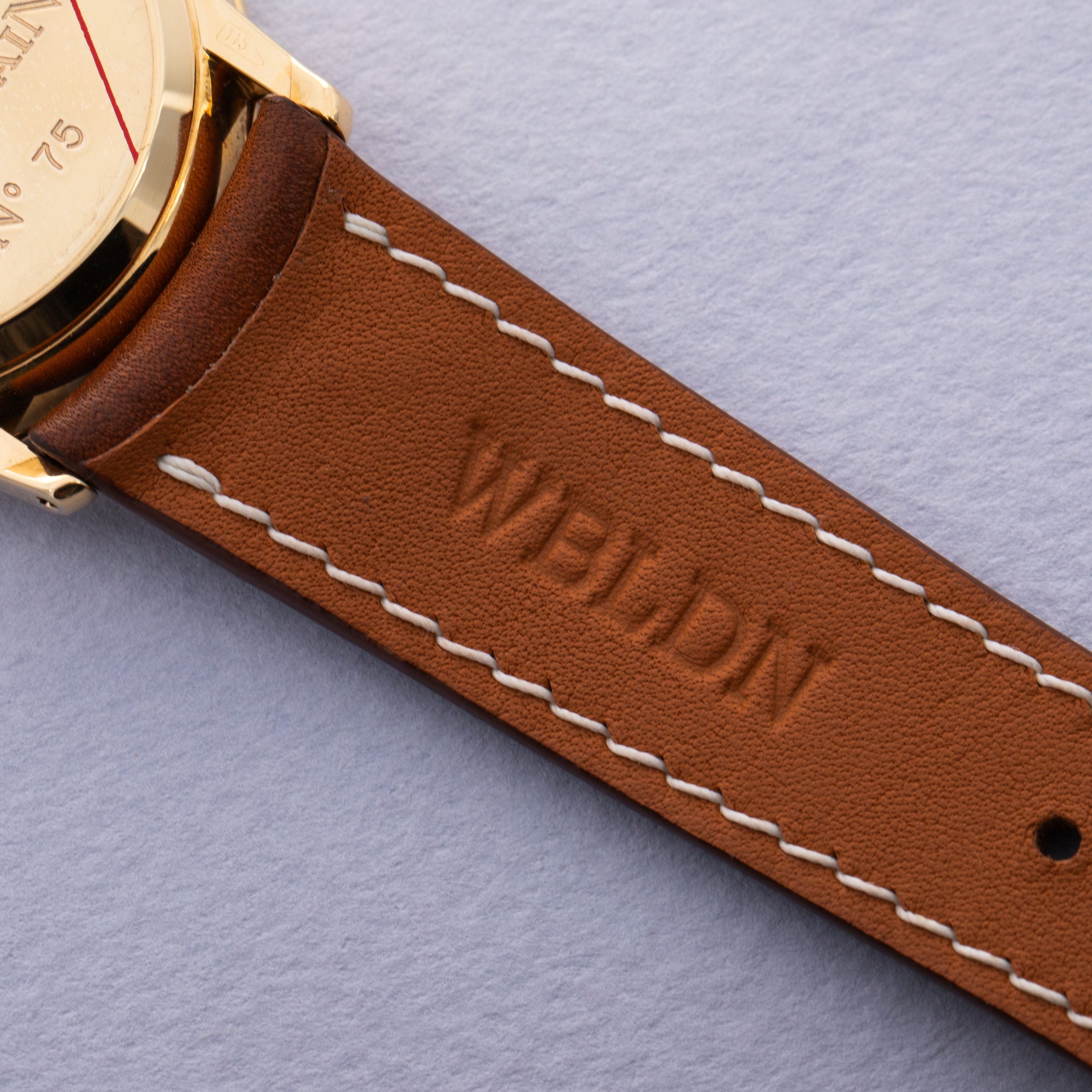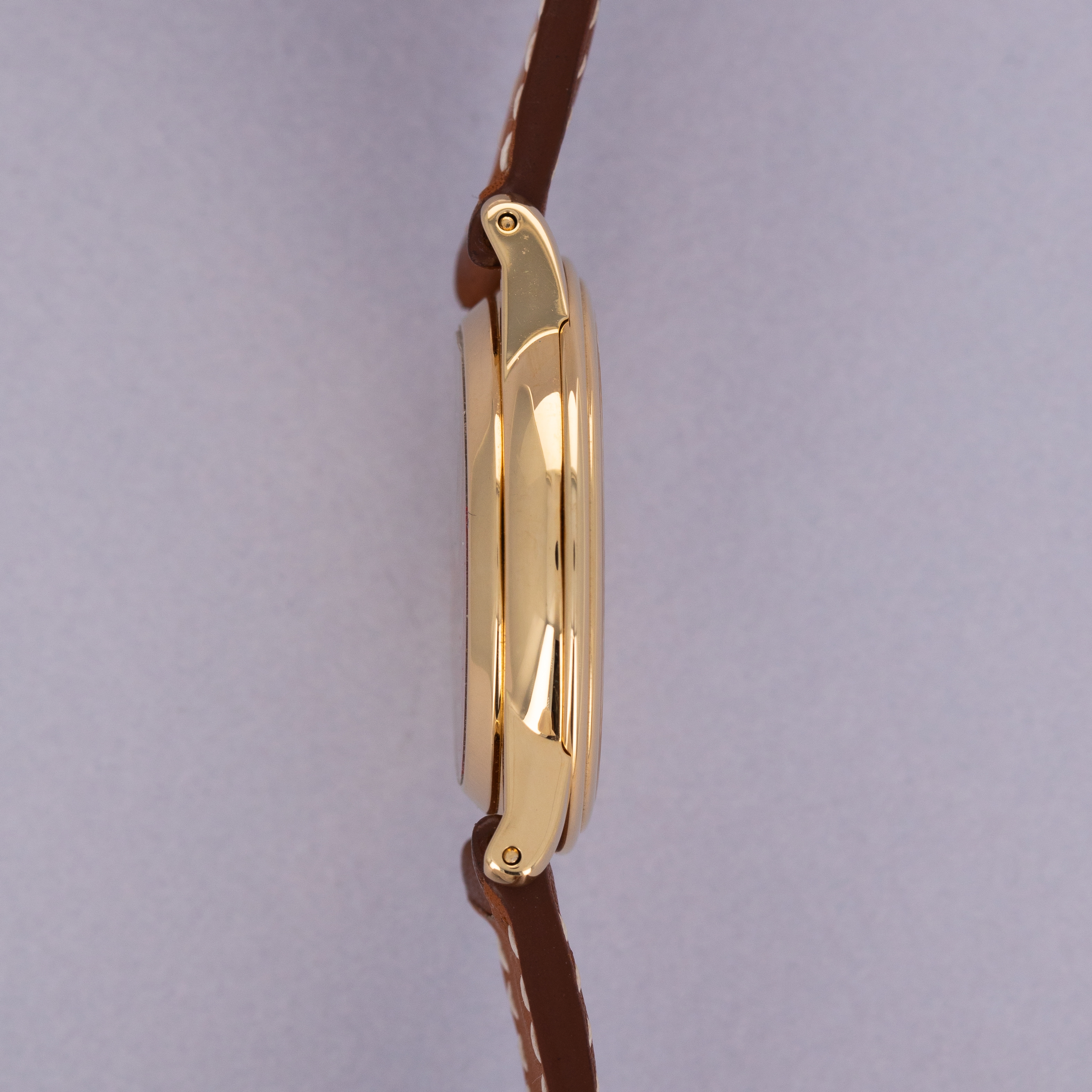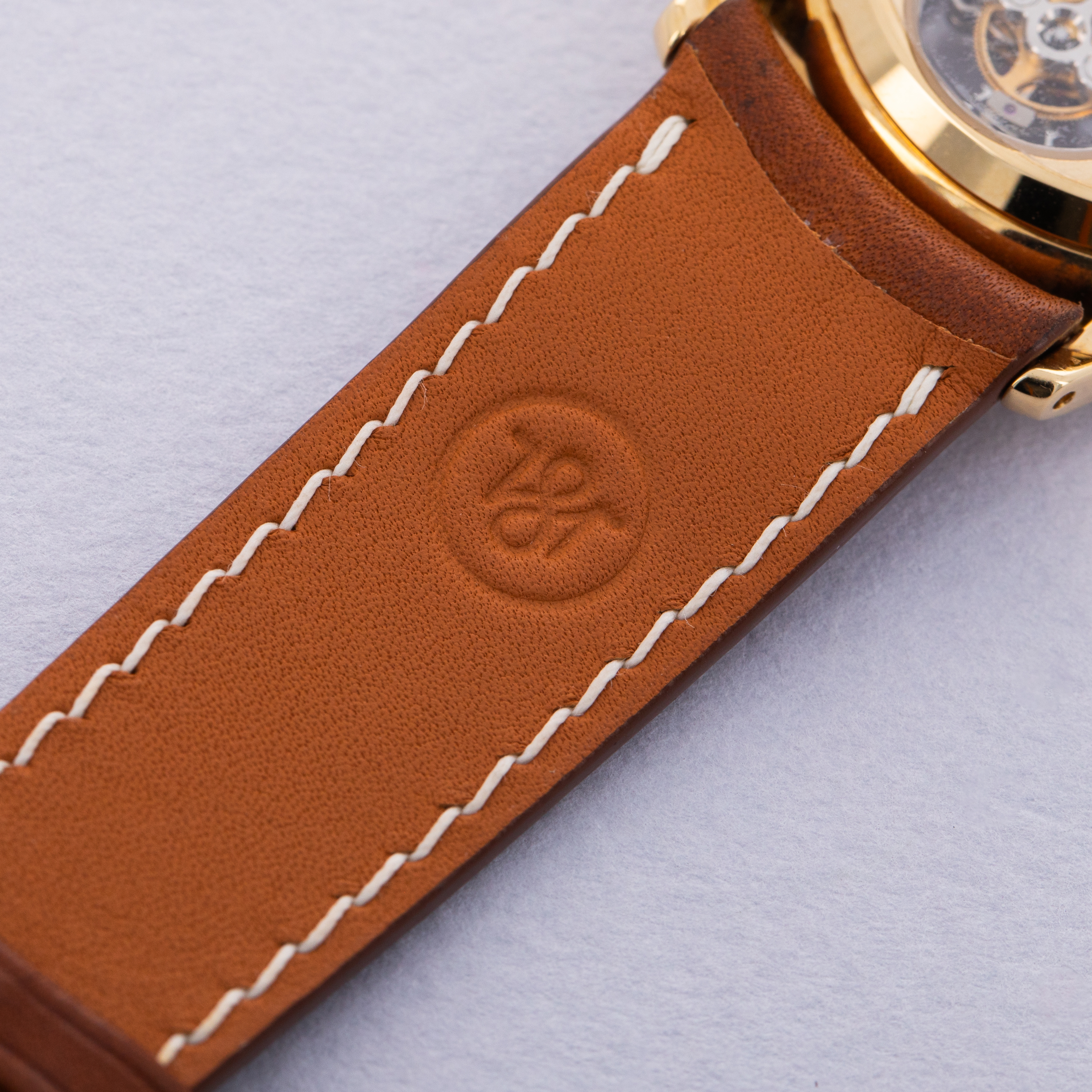 Watch is in near-mint condition. Case shows only minor signs of wear on the surface, and the engravings on caseback are crisp, as are the gold hallmarks on the back of the lugs. Watch comes on a third party strap and original tang buckle.