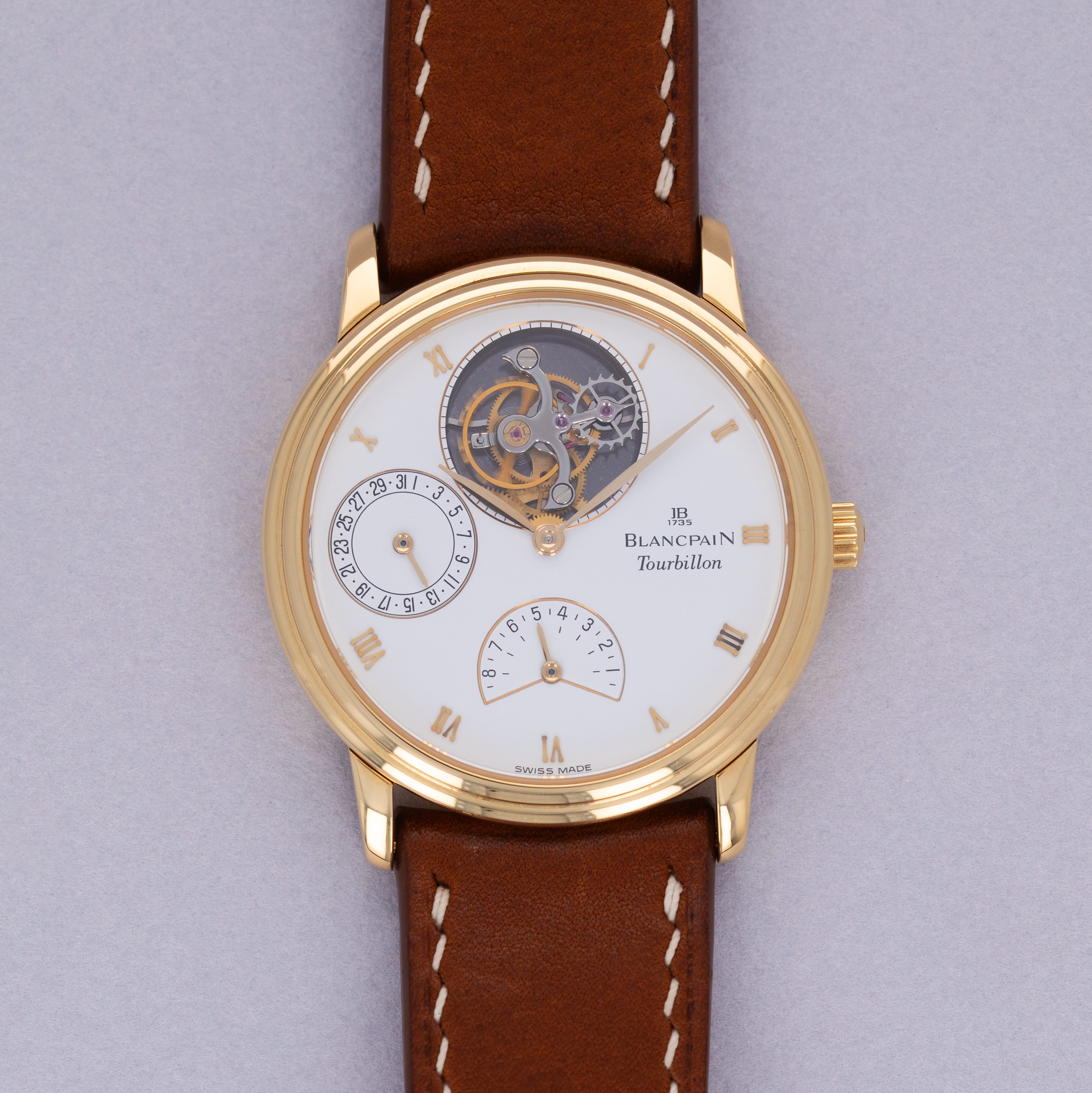 Boasting a stunning white dial with a trio of complications to gaze at, the Flying Tourbillon features an 8-day power reserve indicator at 6 o'clock, a pointer date subdial at 9 o'clock and a stunning view of its flying tourbillon at 12 o'clock.