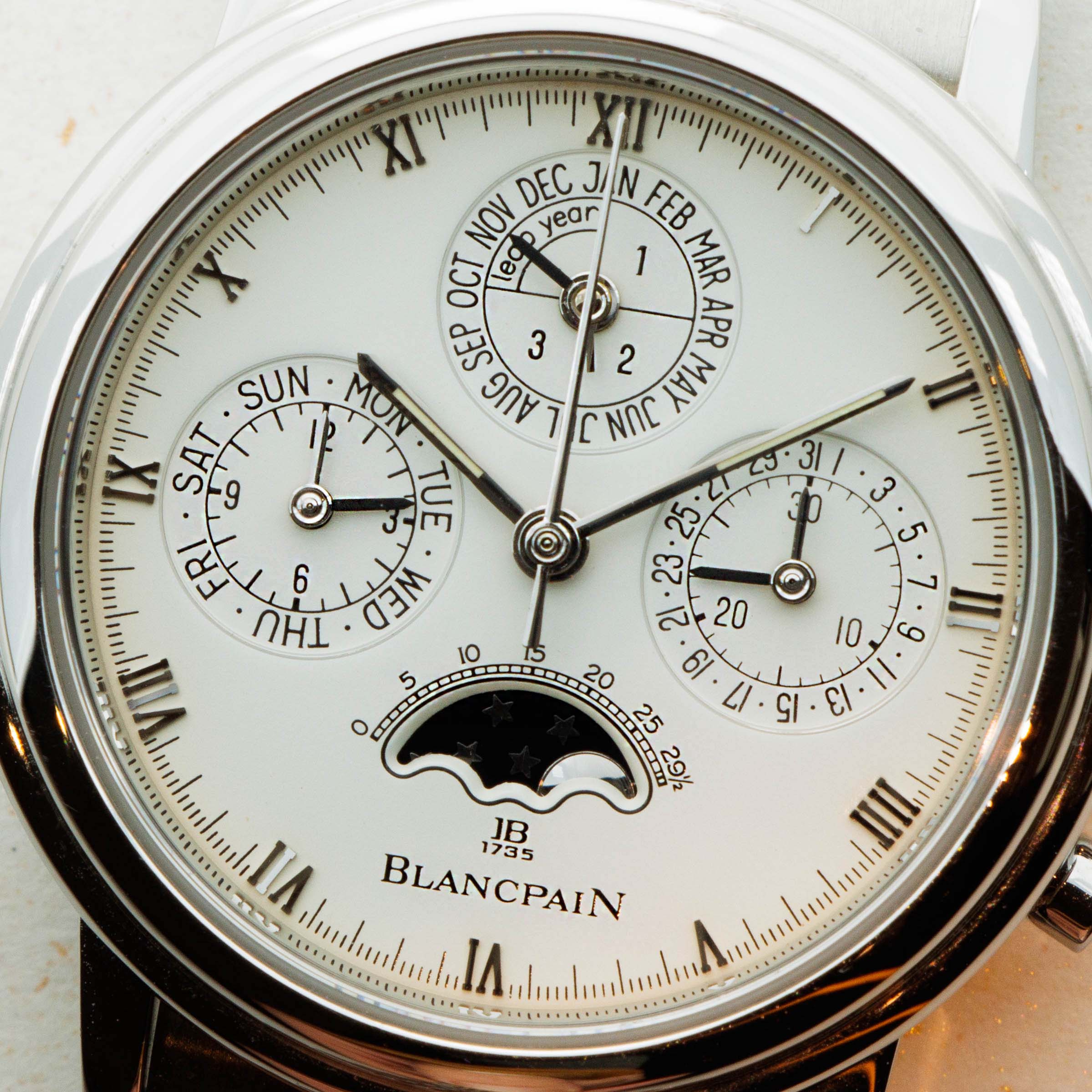 Retaining all of the traits that Jean Claude Biver used to harmonize the majority of Blancpain's offerings at the time, the ref. 5585 features a crisp white dial with thin inscriptions and applied Roman numeral hour markers.