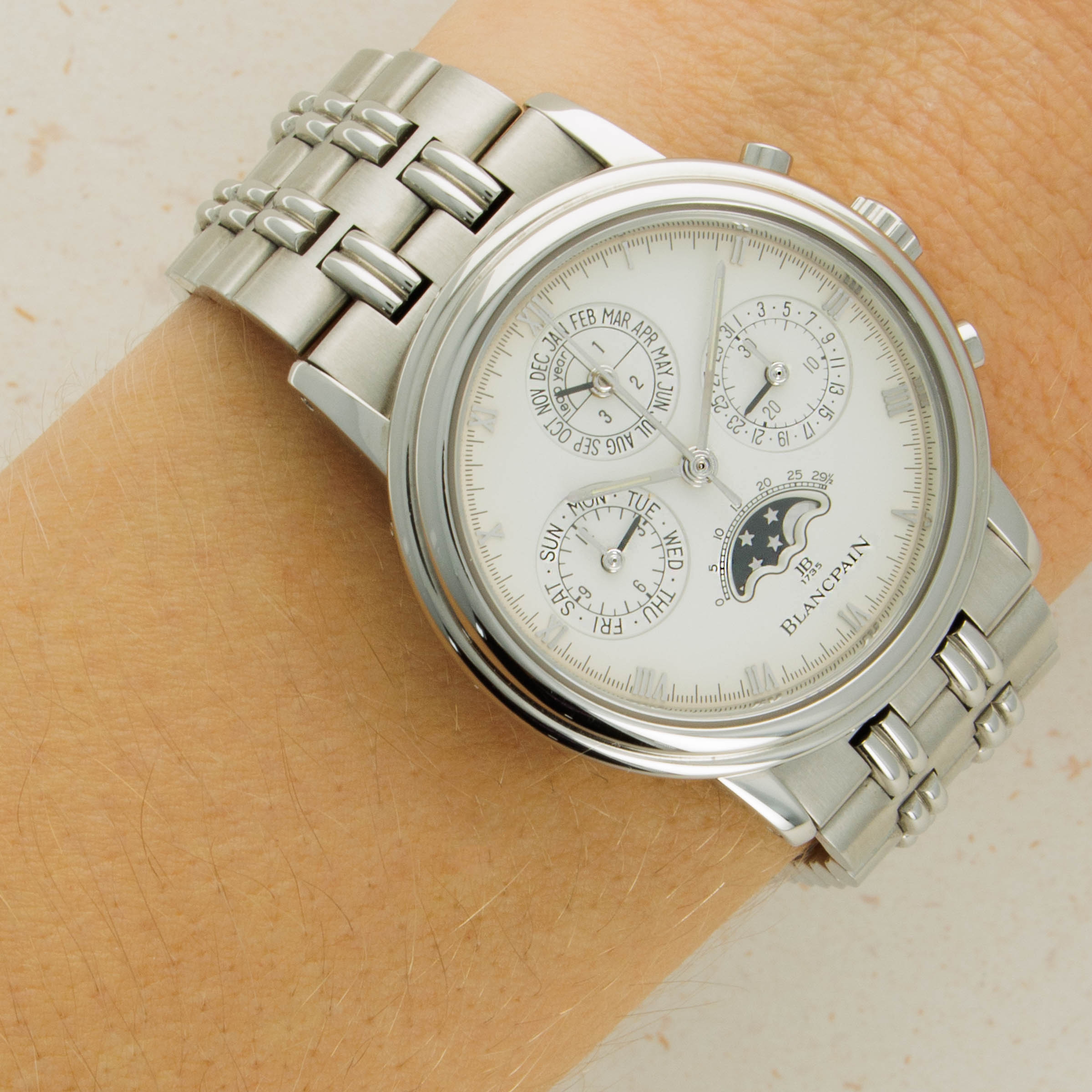 Following the sale of the Rayville-Blancpain name to Jacques Piguet and Jean Claude Biver in 1983, Blancpain began a journey from near-bankruptcy to acting as one of the main catalysts that saved Swiss watchmaking. Key to this success was Blancpain’s steadfast dedication to mechanical watches with thin complicated movements, classical designs and extremely luxurious craftsmanship; three tenets that are all contained within perhaps the finest expression of the Biver era of Blancpain; the Villeret Perpetual Calendar Chronograph ref. 5585. Launched in 1993, just one year after the Swatch Group bought back the brand, the ref. 5585 synthesized everything Blancpain had come to stand for over the 10 years since its revival. As such, the ref. 5585 built upon the aesthetic that Blancpain had championed during the Quartz Crisis with its svelte 34.5mm round case featuring a stepped domed bezel, a thin 11.5mm profile and an elegant white dial with applied Roman numerals and tastefully recessed subdials. Powered by the aptly named and immensely complicated cal. 5585 automatic movement, the ref. 5585 also features a perpetual calendar with a moon phase display and chronograph function. With only around 400 pieces produced across 18kt yellow gold, 18kt rose gold, two-tone and stainless steel, the ref. 5585 is a rare watch indeed, but with only 150 of those pieces being made in steel, the example we have here is exceedingly rare. Sitting on its intricate Blancpain-signed steel bracelet, this example is presented in excellent condition and will make a fantastic addition to any collection.