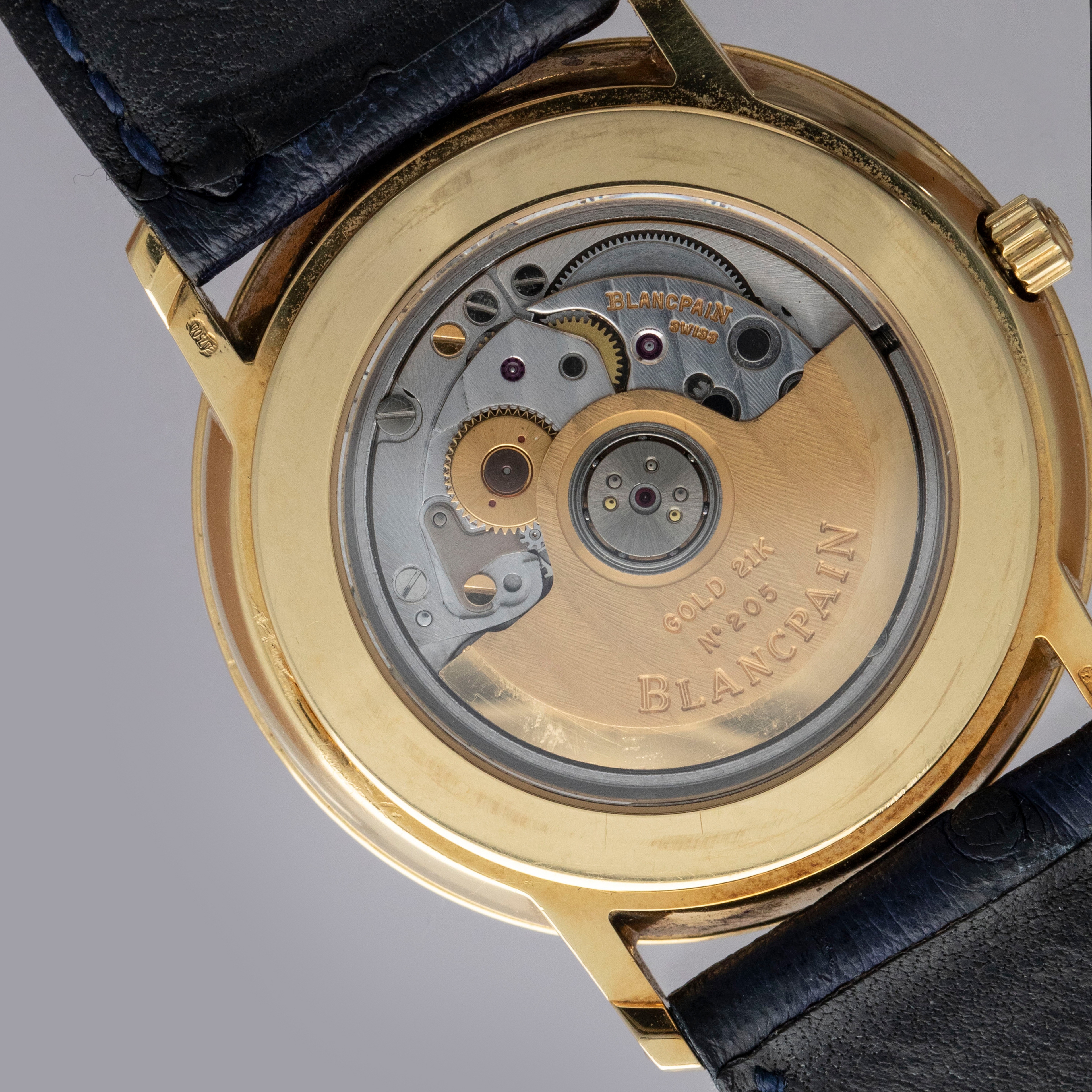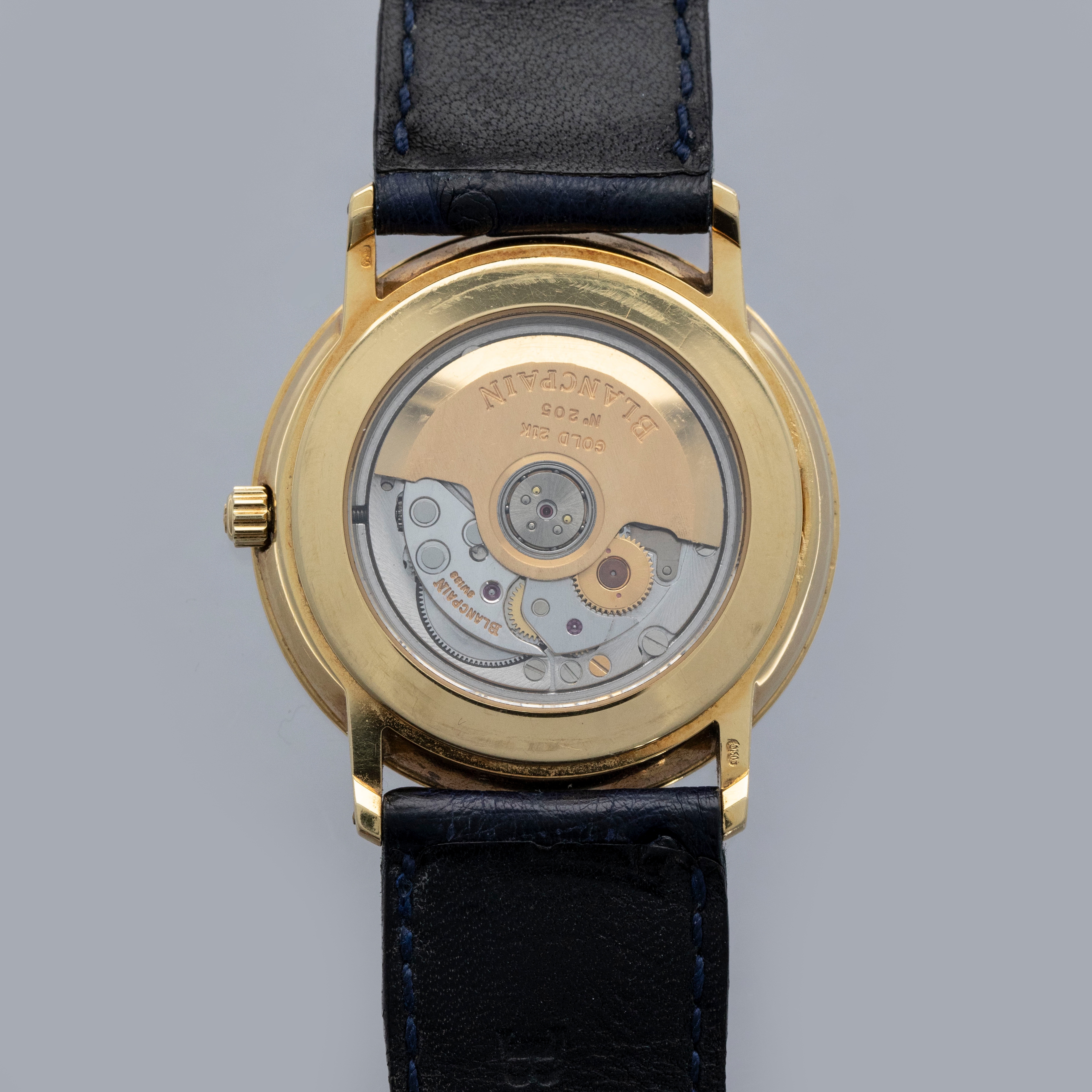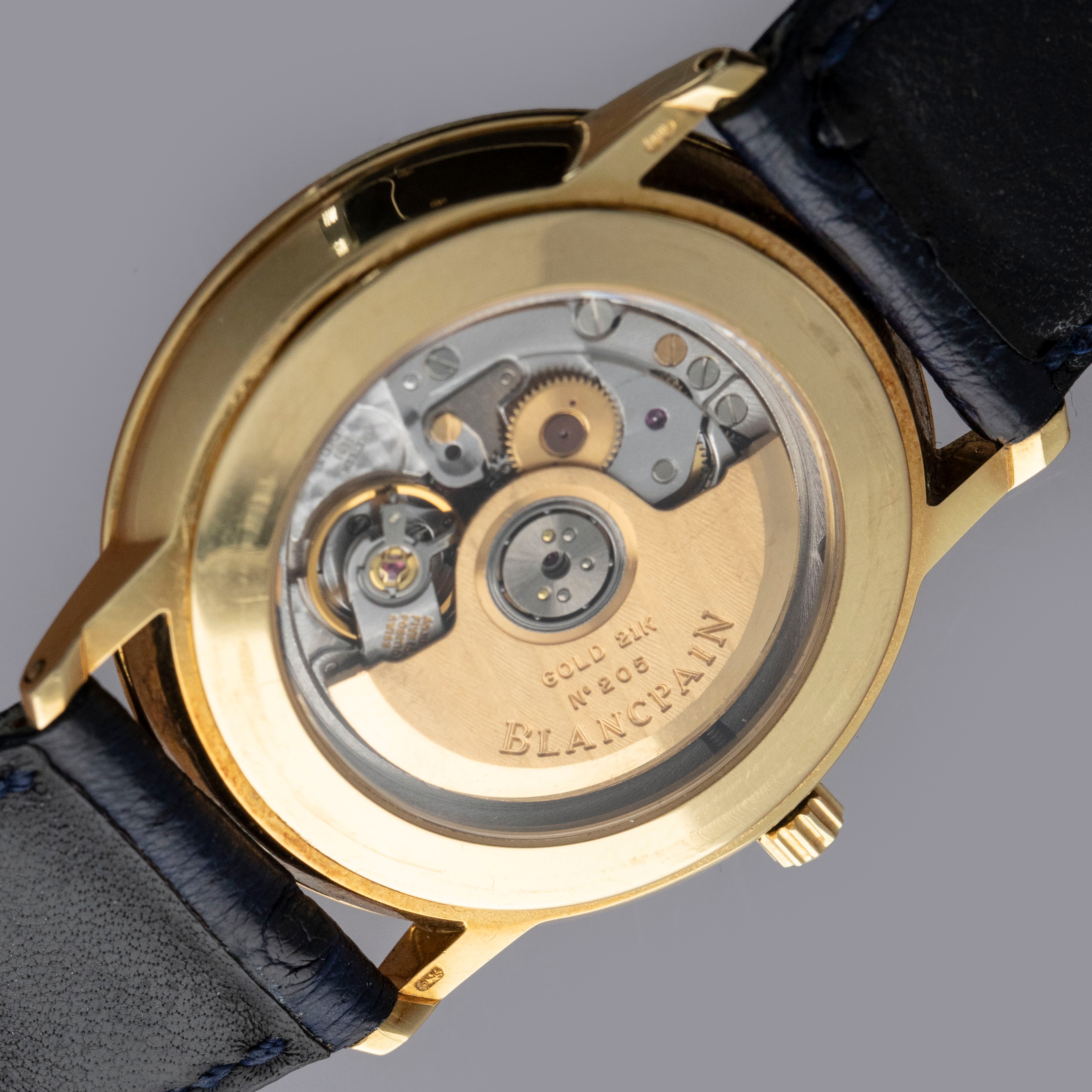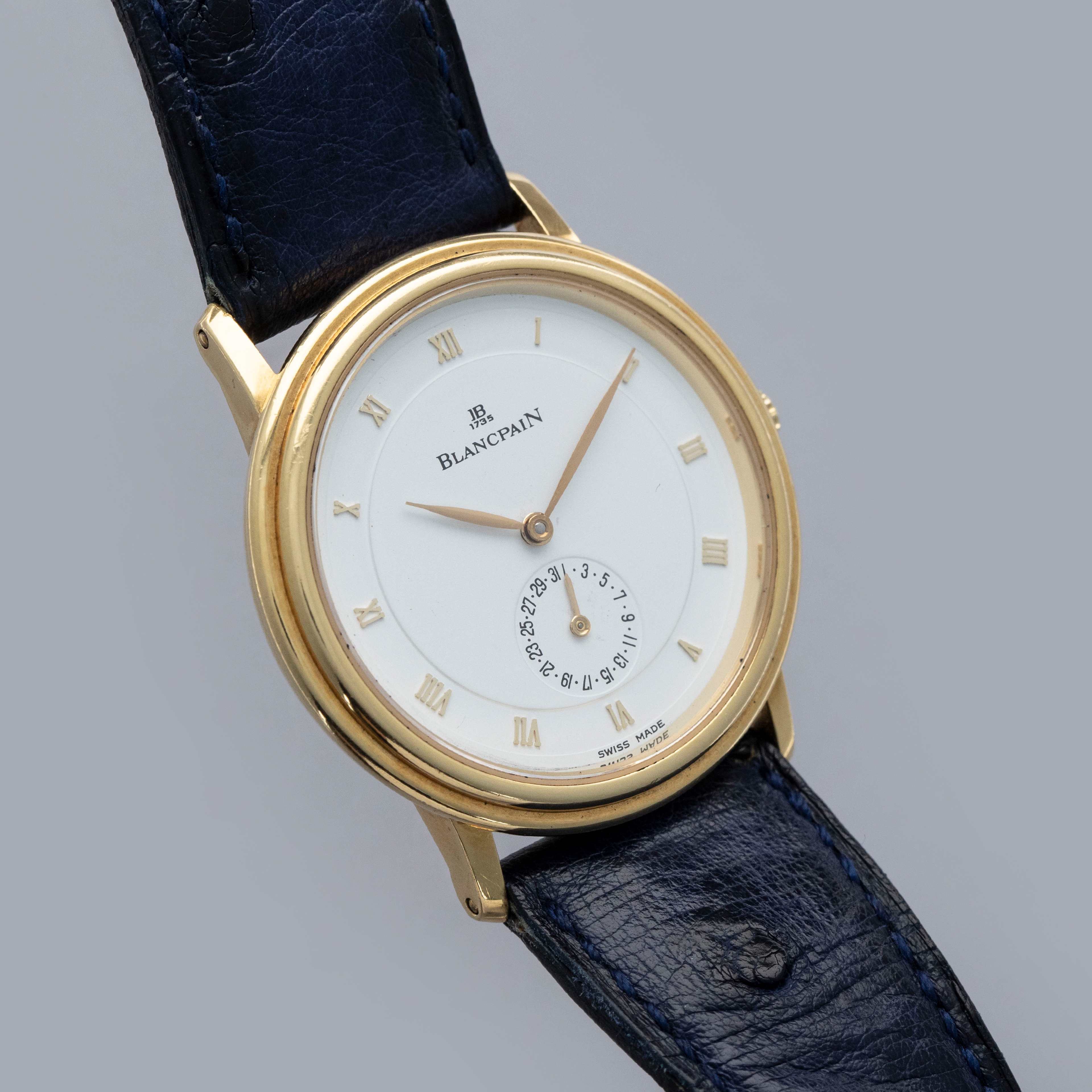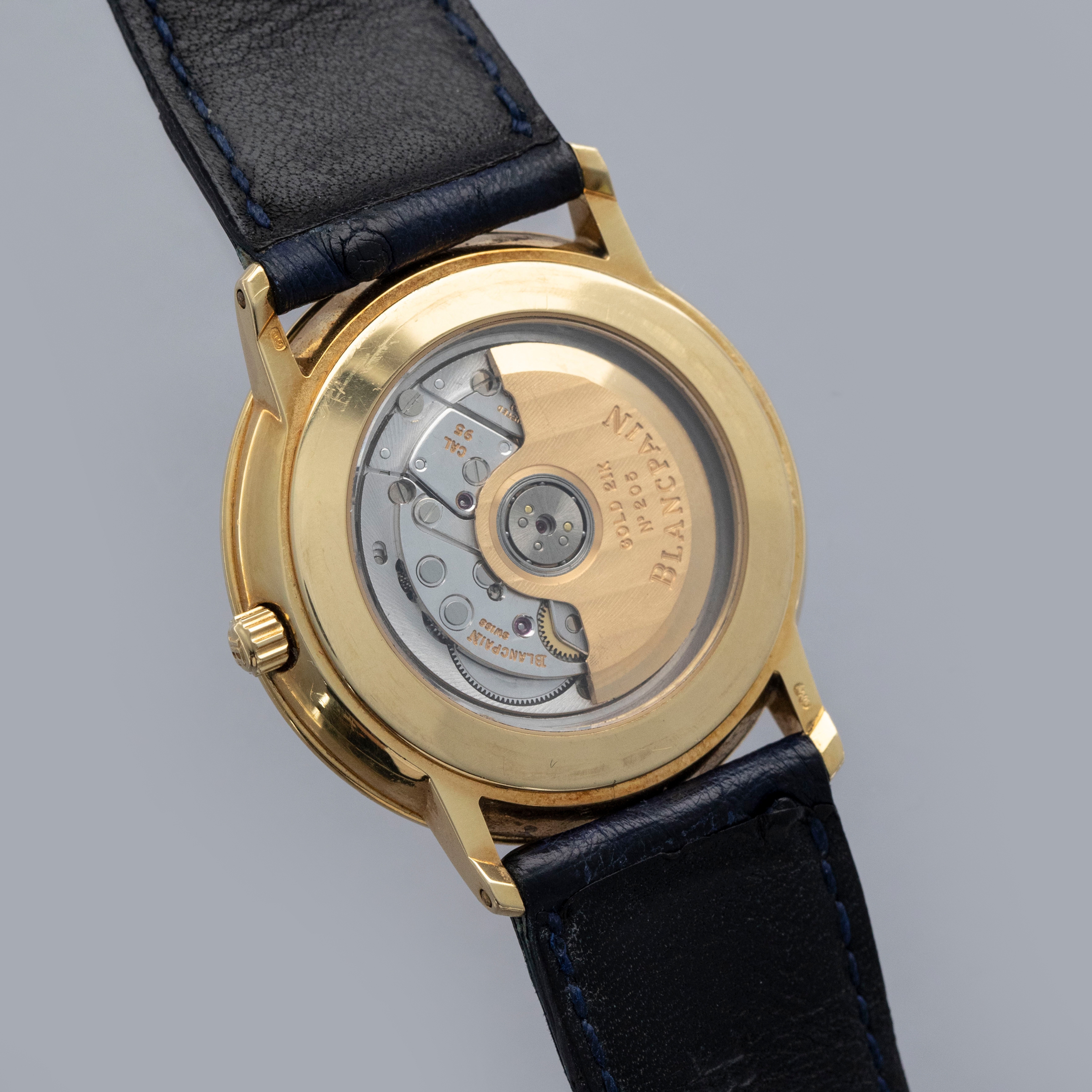 The watch is in overall very good condition. The yellow gold case remains well defined, with some light scratches visible. The gold lip surrounding the display caseback has visible scratches and marks, and the original gold hallmarks are no longer visible. The backs of the lugs feature crisp, fully legible hallmarks. The white dial has some light surface marks, most noticeably within the small calendar indicator, while the gold hands are very clean. The watch is fitted with a navy leather strap and a yellow gold Blancpain pin buckle, both in excellent condition.