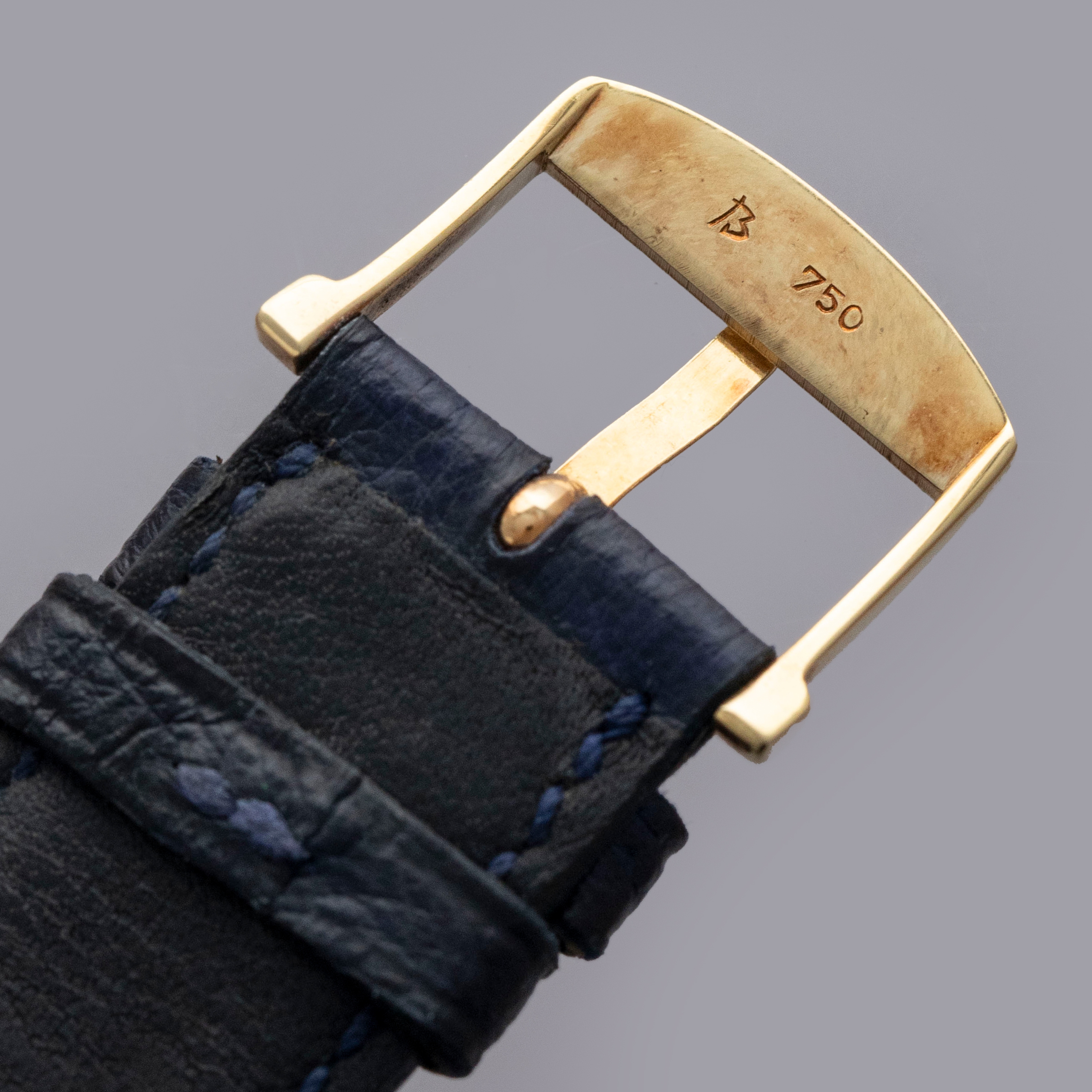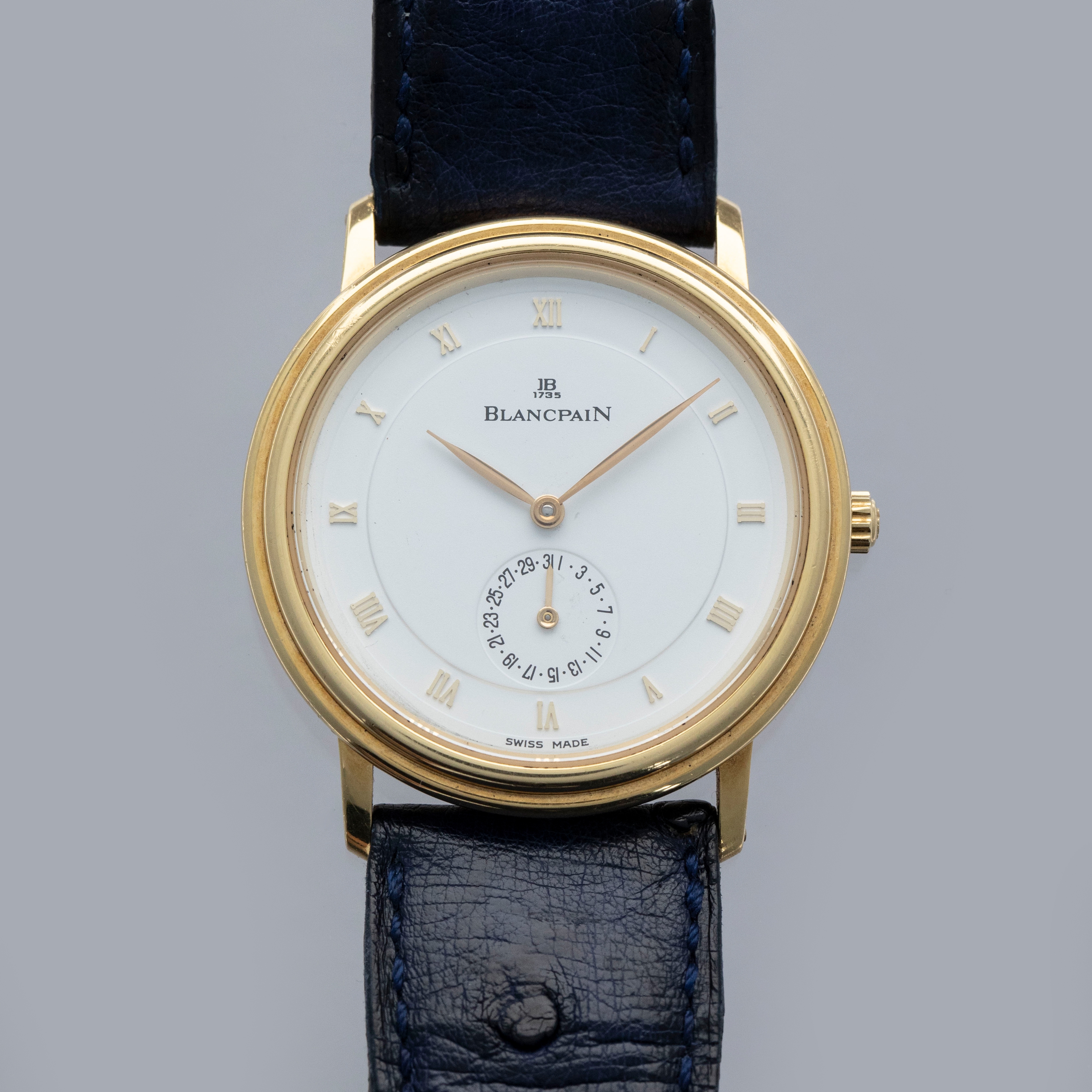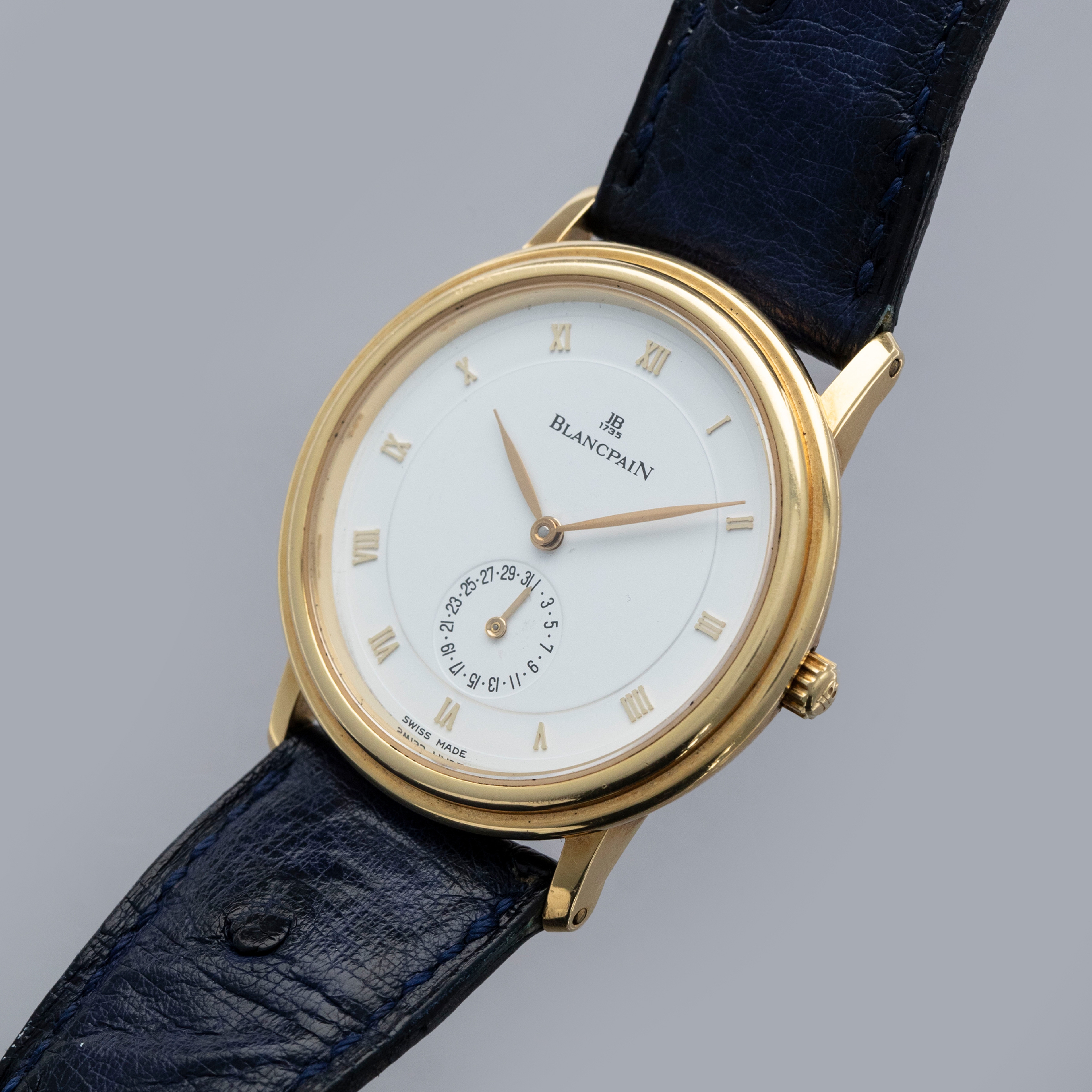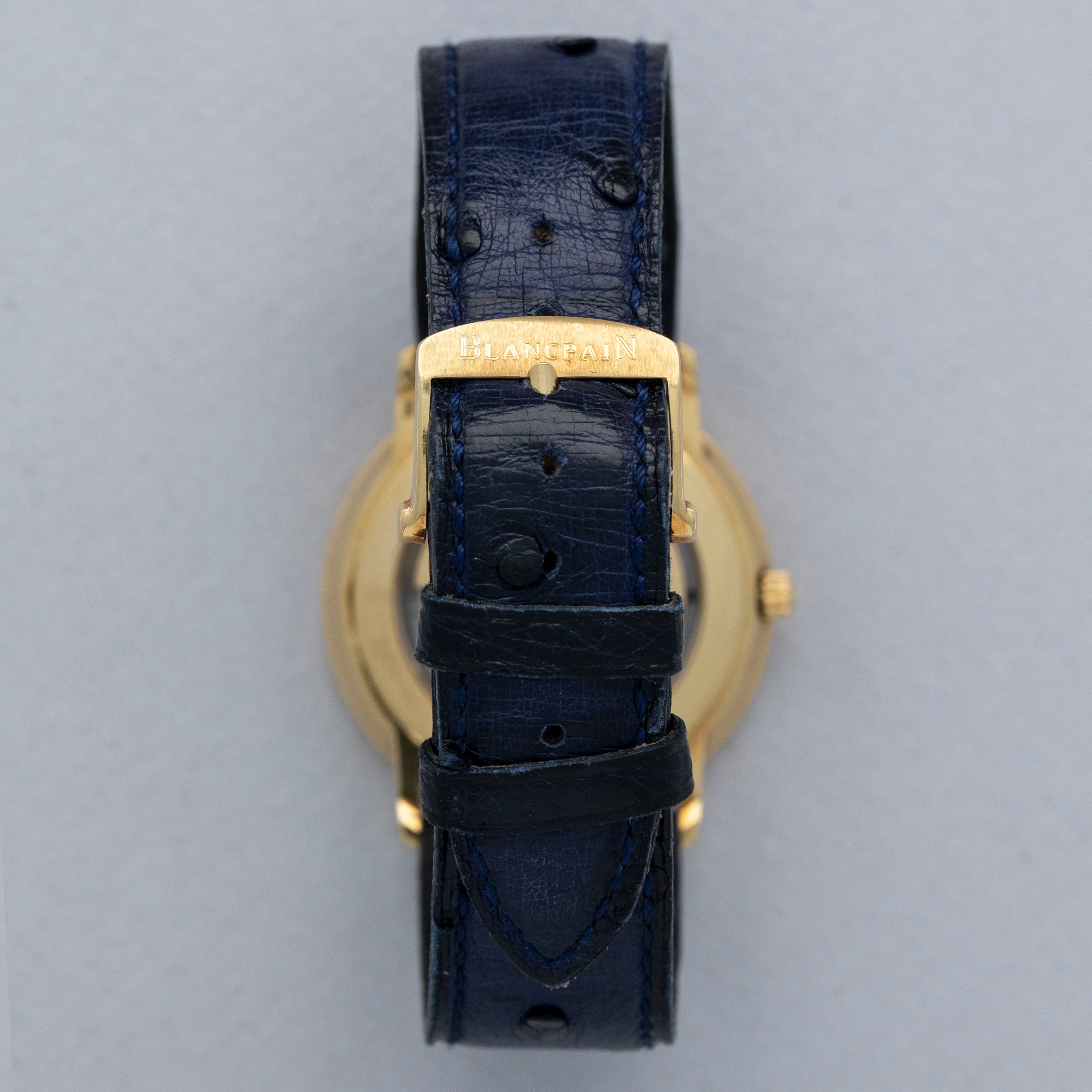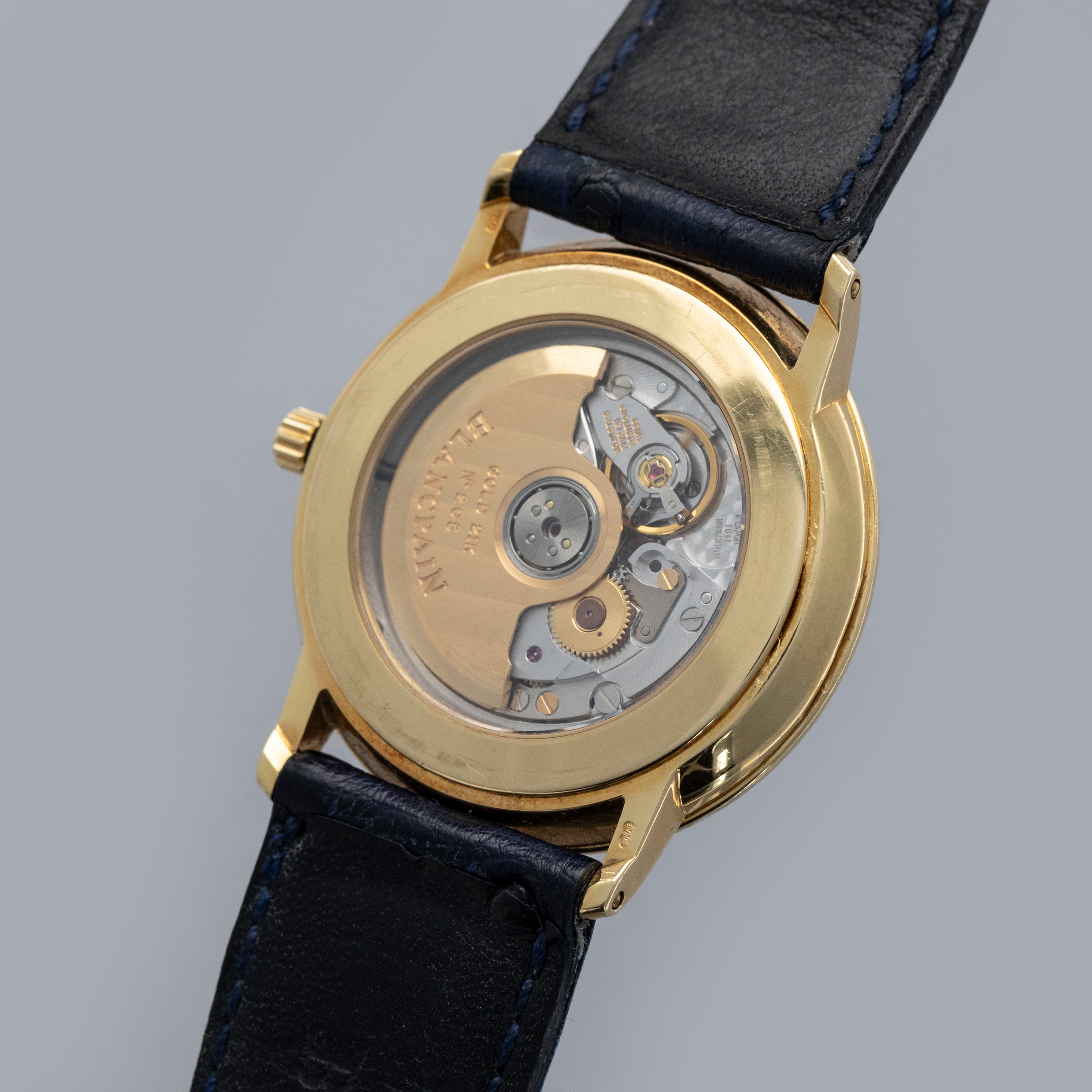 The watch is in overall very good condition. The yellow gold case remains well defined, with some light scratches visible. The gold lip surrounding the display caseback has visible scratches and marks, and the original gold hallmarks are no longer visible. The backs of the lugs feature crisp, fully legible hallmarks. The white dial has some light surface marks, most noticeably within the small calendar indicator, while the gold hands are very clean. The watch is fitted with a navy leather strap and a yellow gold Blancpain pin buckle, both in excellent condition.