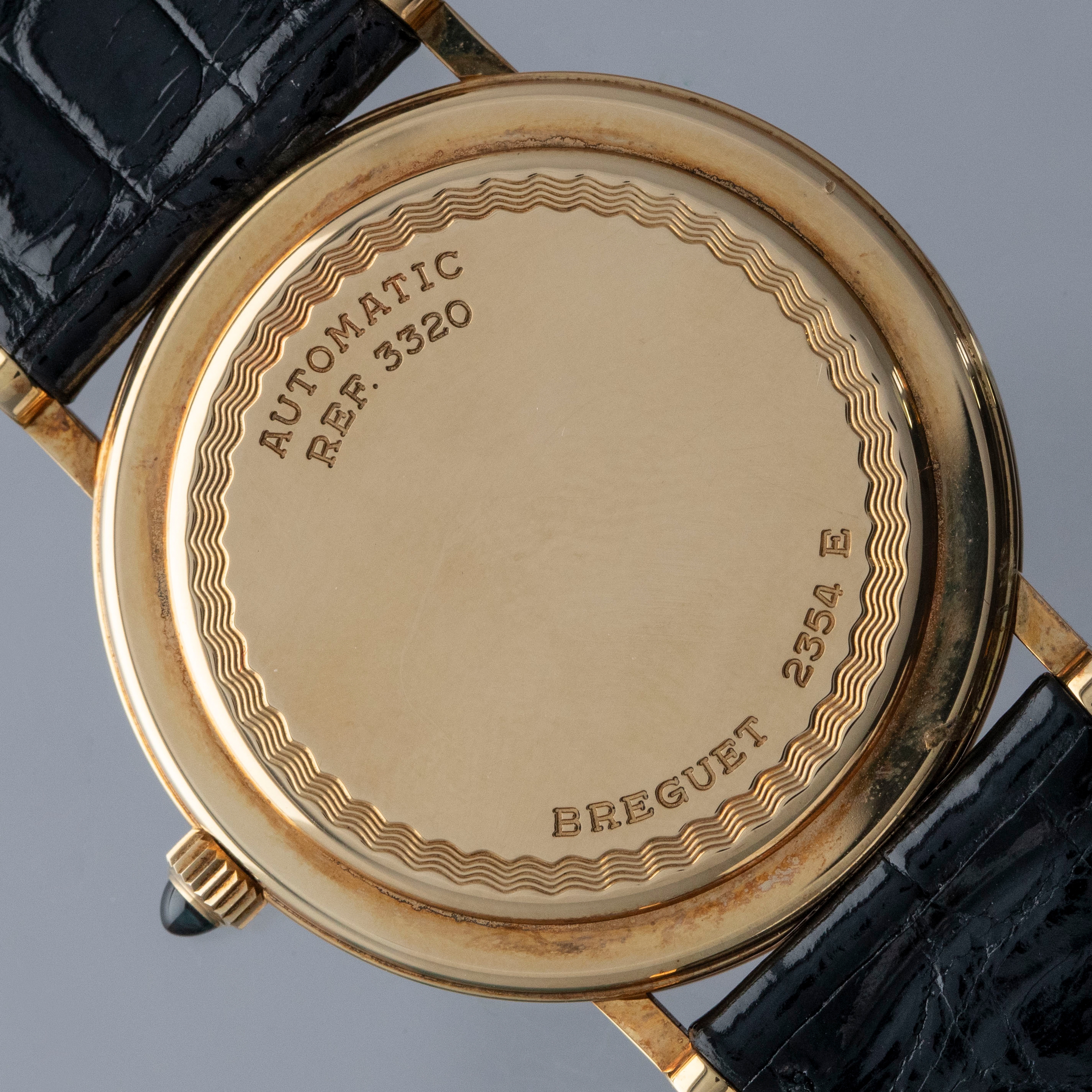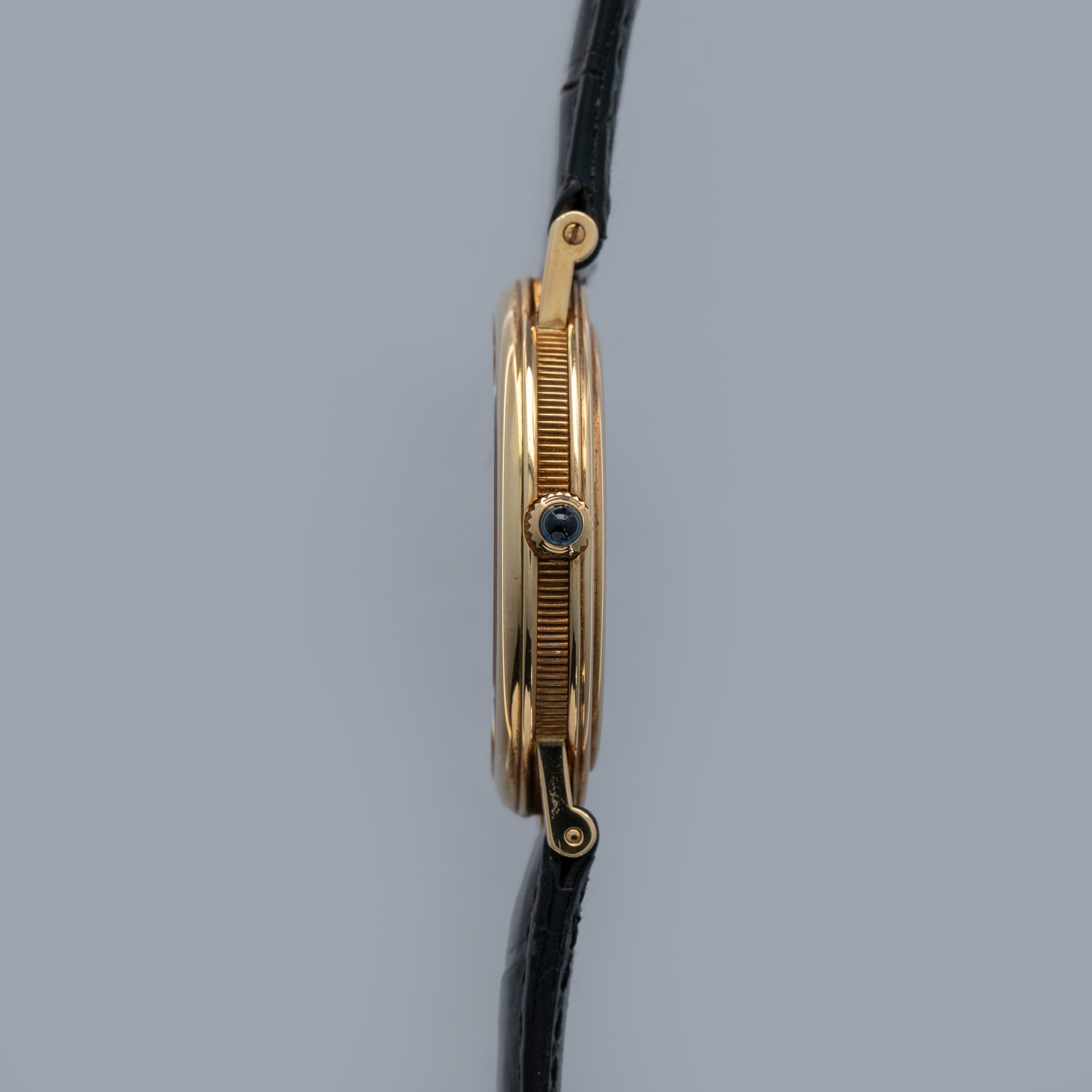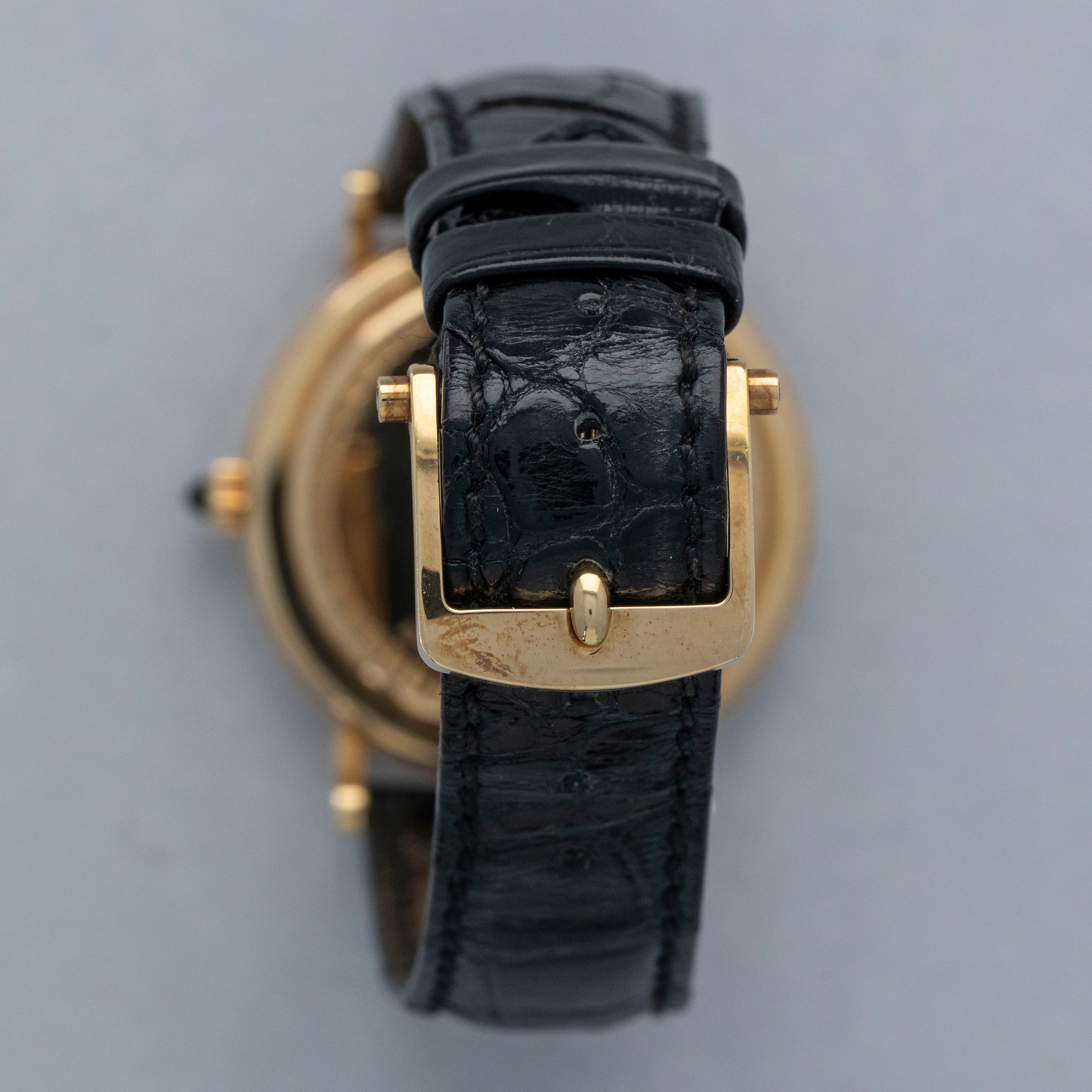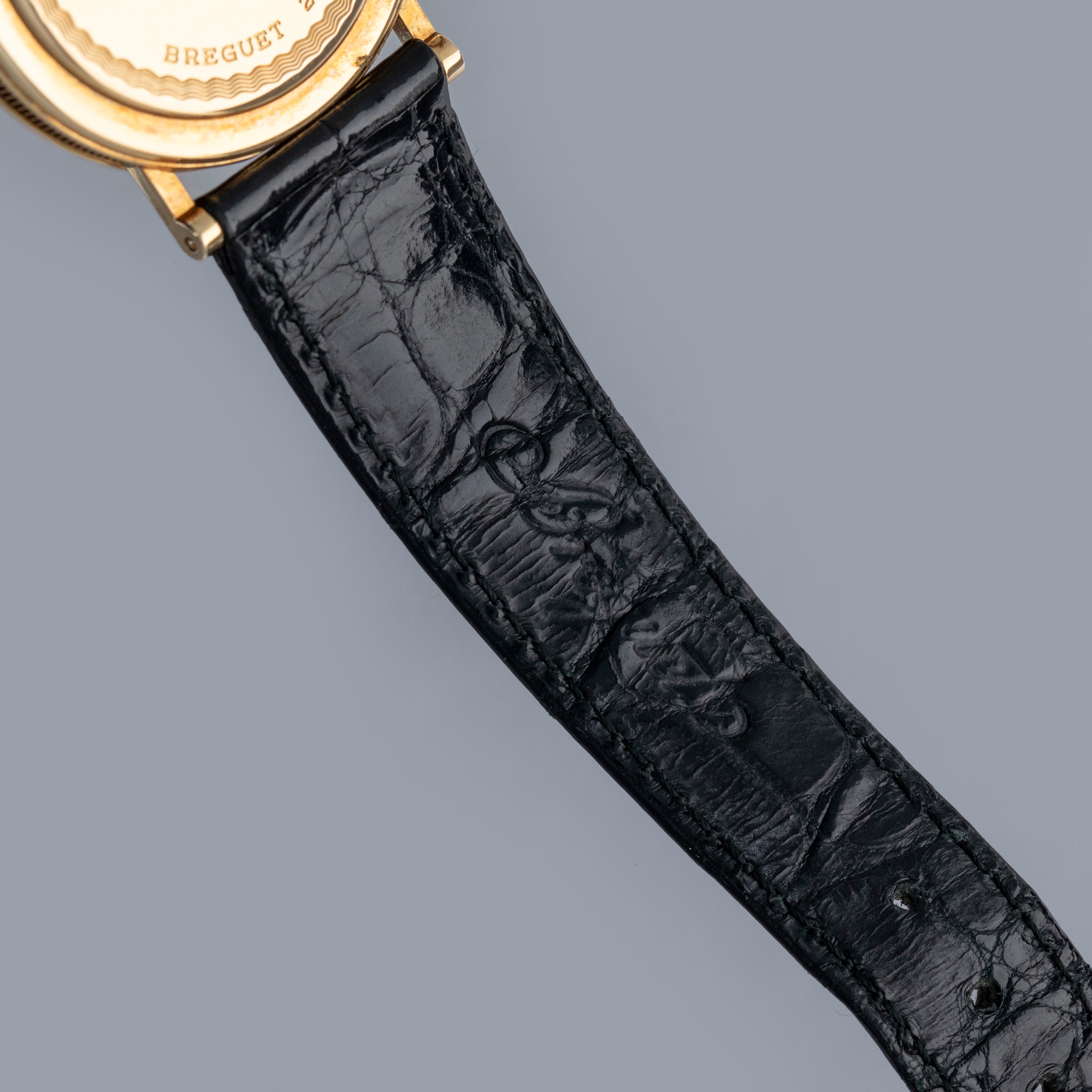 Watch is in overall excellent condition. The yellow gold case shows light marks and scratches, with some wear to the strap bar screws. The coin-edge midcase is very well defined and the cabochon-topped winding crown is excellent. The case back features crisp engravings and wave pattern decoration, with a couple of small nicks around the edge. The dial, with multiple guilloché finishes, is near mint and the blued Breguet hands are like new. Fitted with a black Breguet crocodile strap and yellow gold buckle in excellent condition.