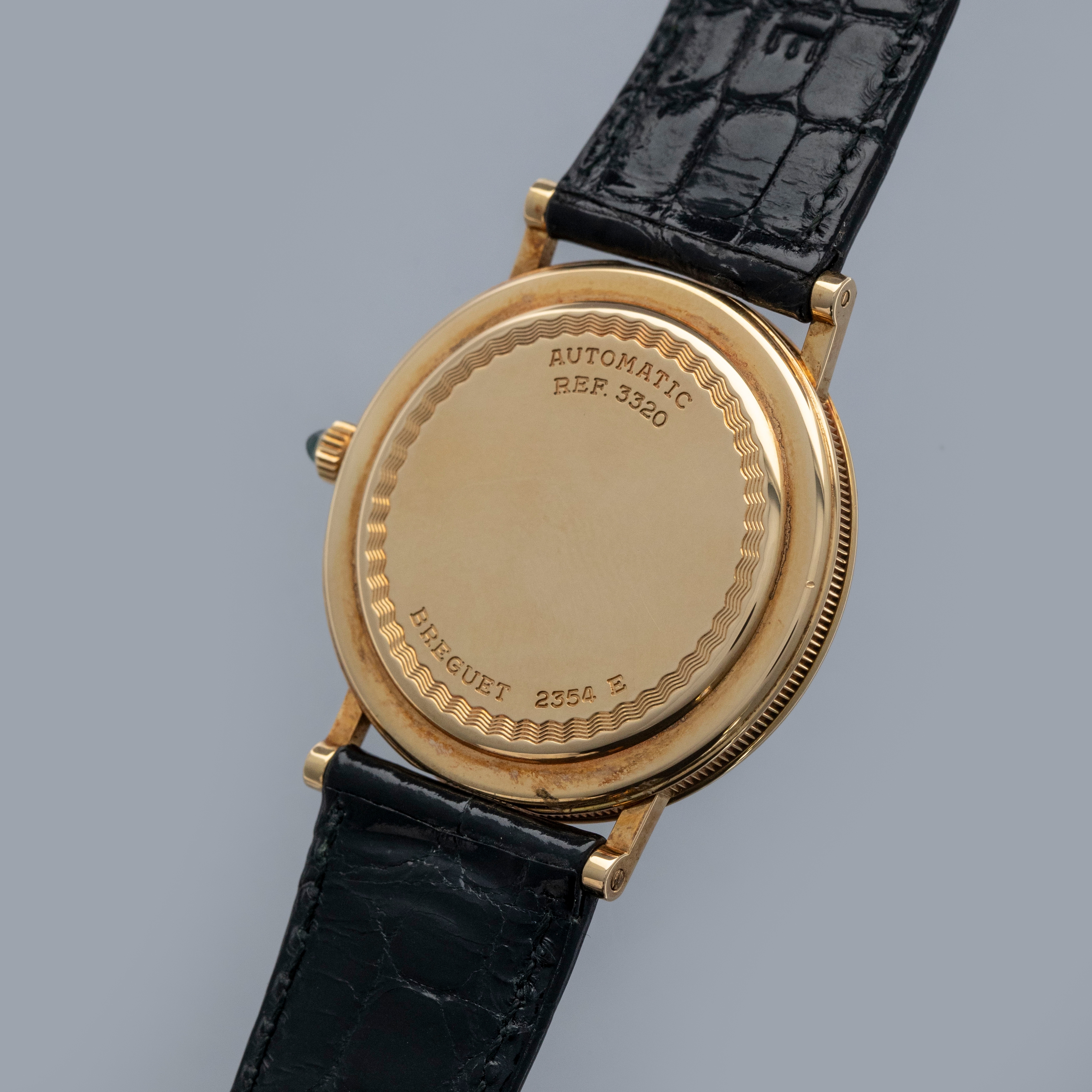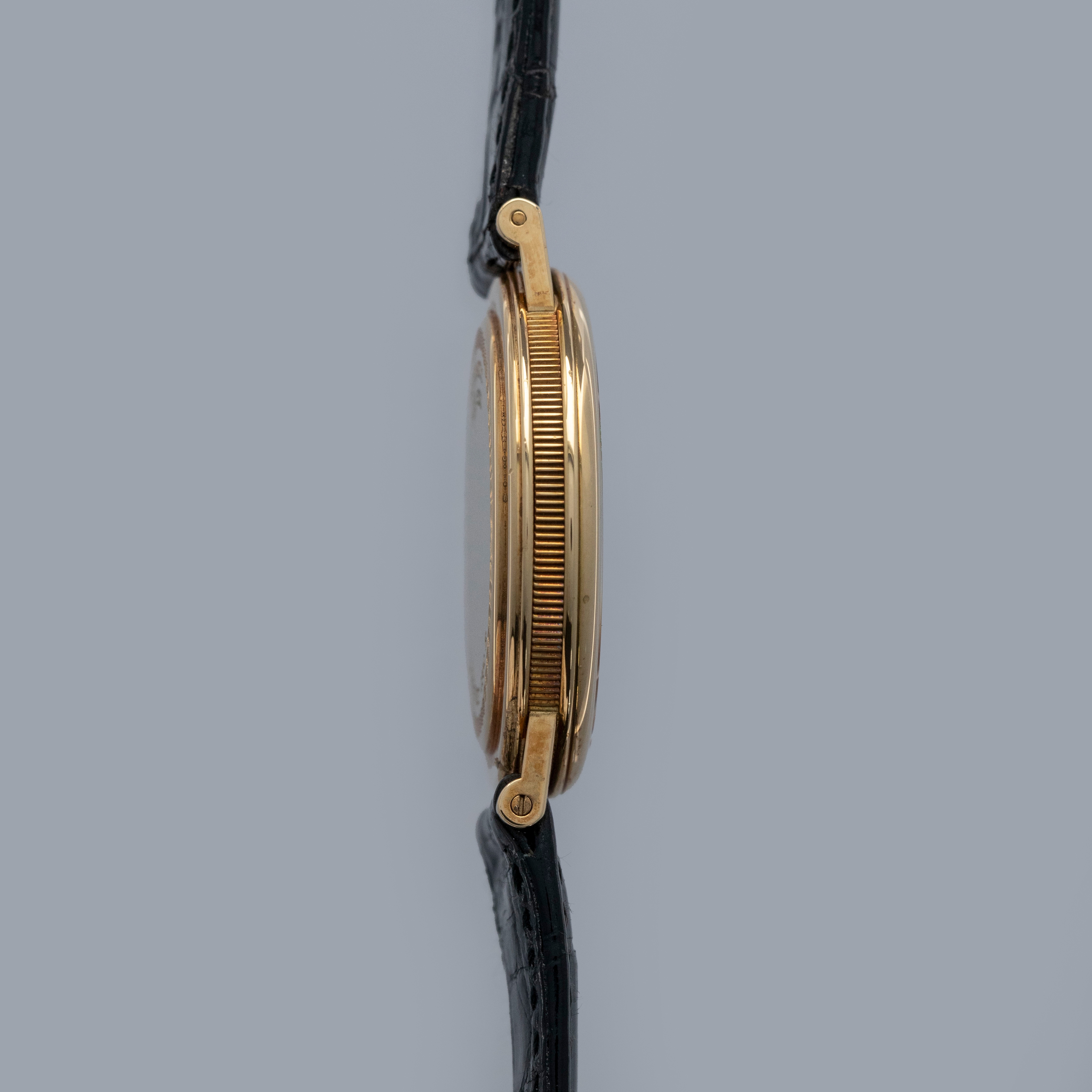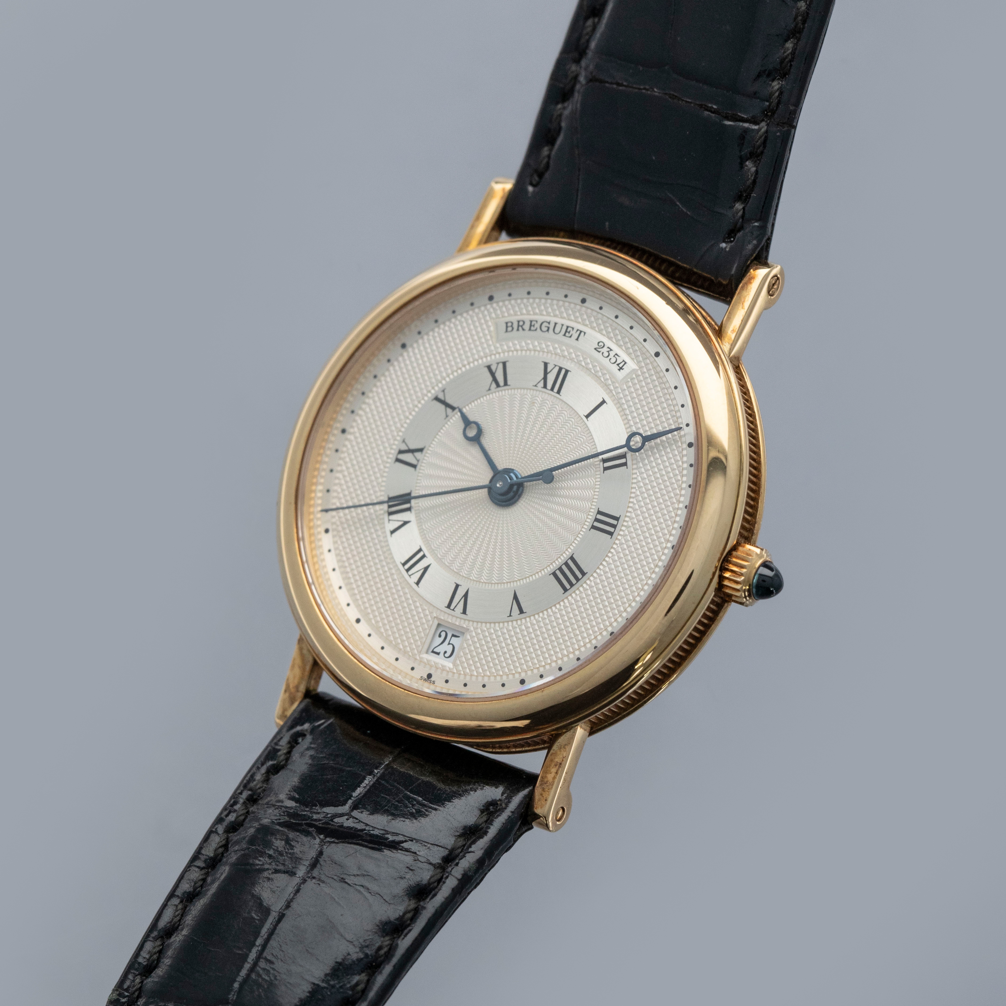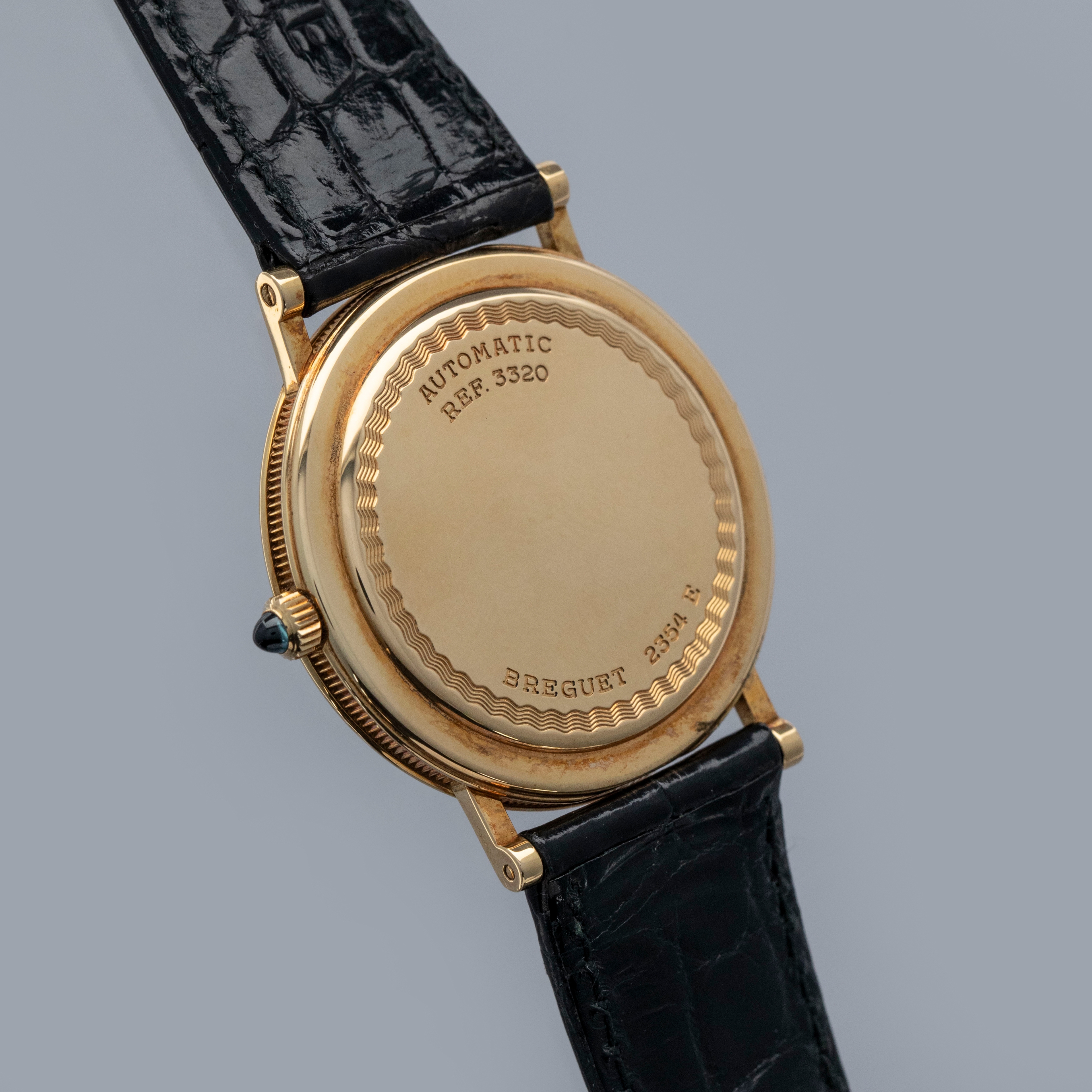 Watch is in overall excellent condition. The yellow gold case shows light marks and scratches, with some wear to the strap bar screws. The coin-edge midcase is very well defined and the cabochon-topped winding crown is excellent. The case back features crisp engravings and wave pattern decoration, with a couple of small nicks around the edge. The dial, with multiple guilloché finishes, is near mint and the blued Breguet hands are like new. Fitted with a black Breguet crocodile strap and yellow gold buckle in excellent condition.