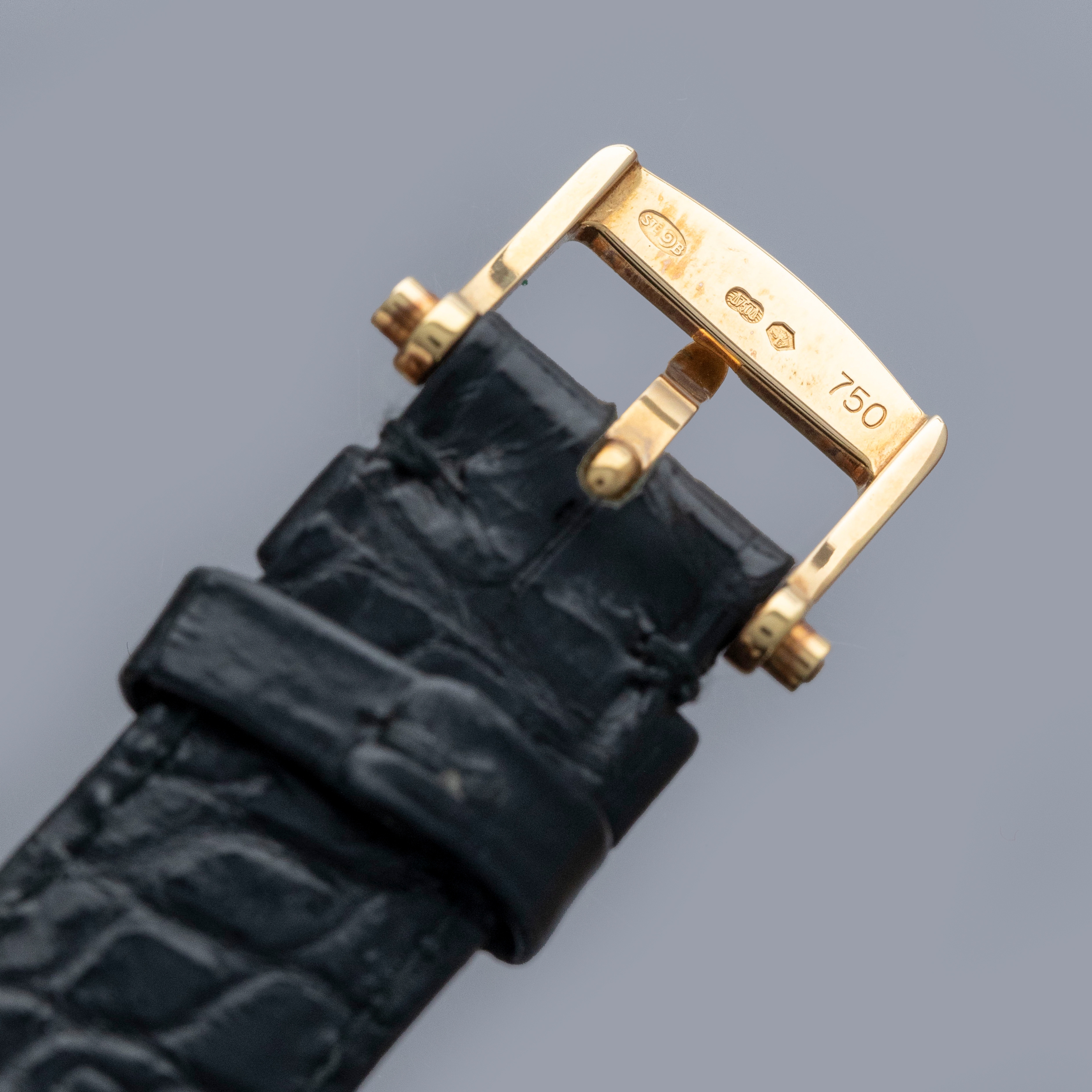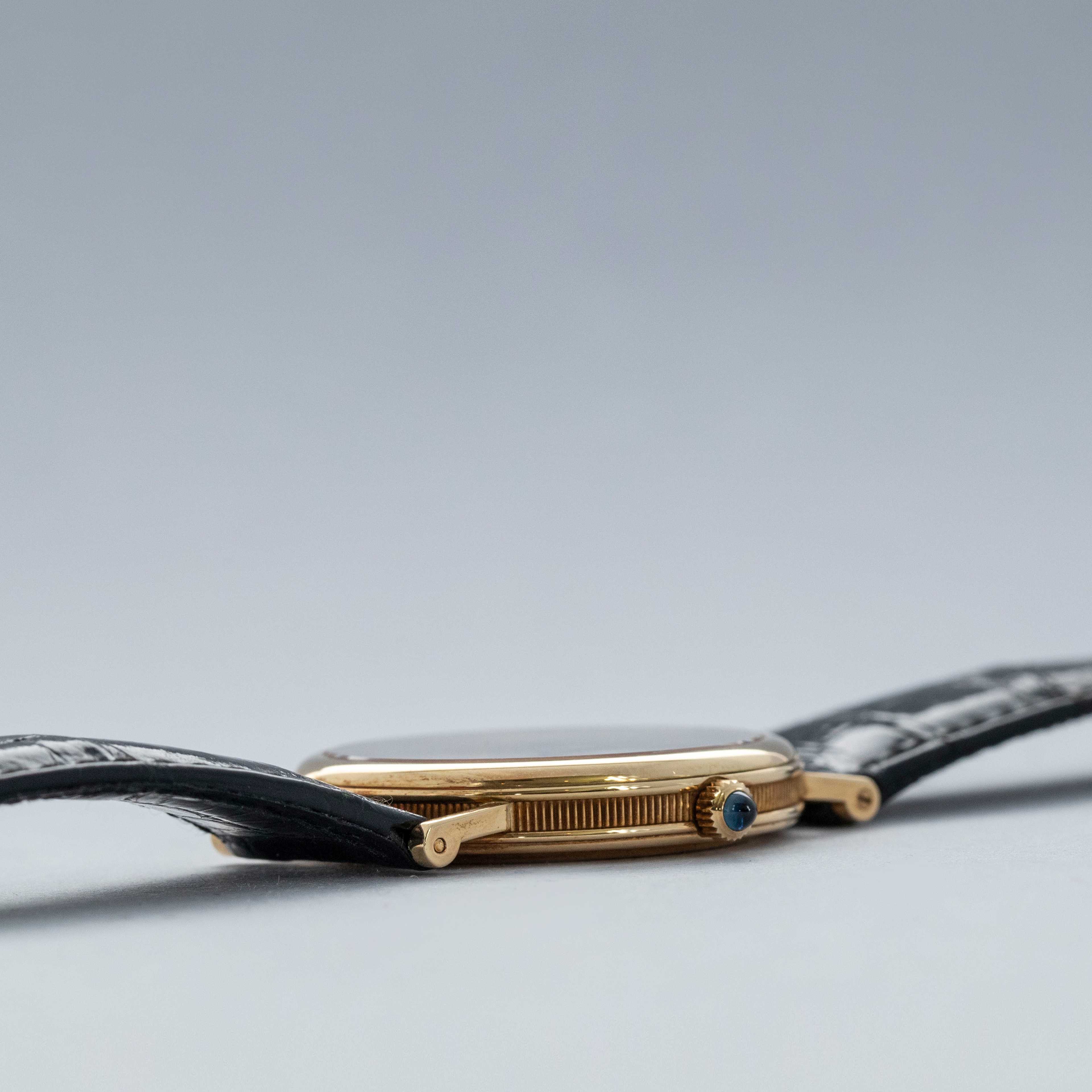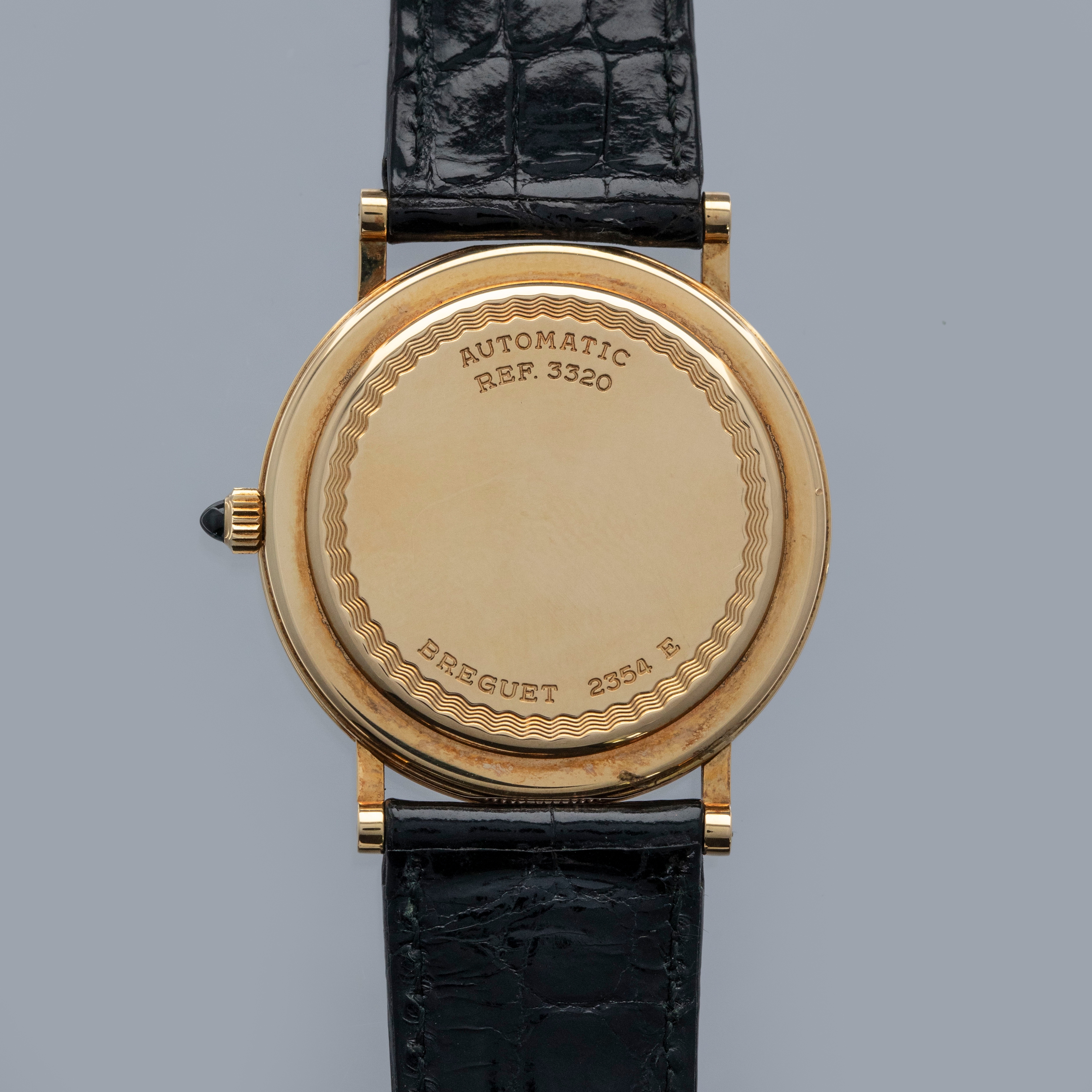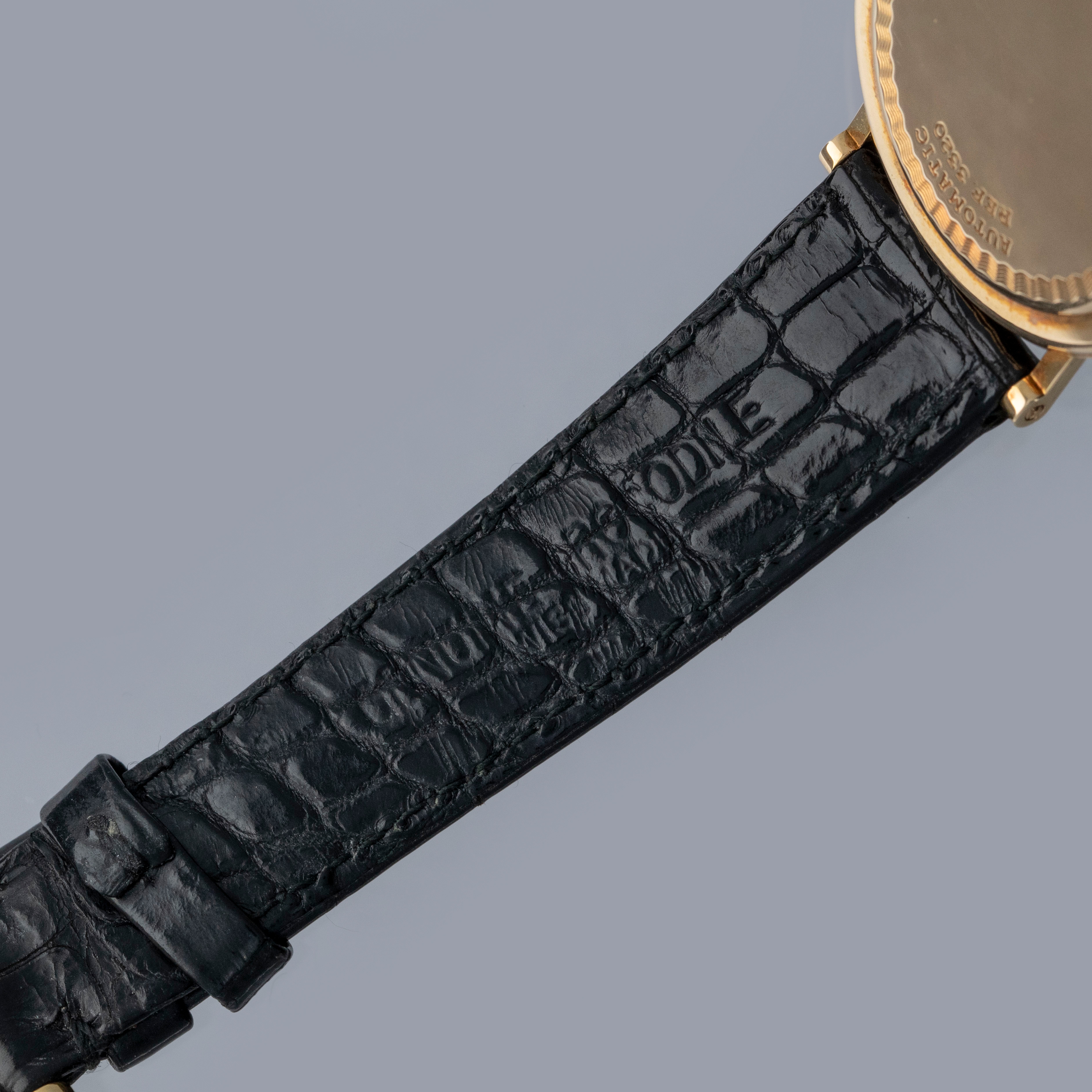 Watch is in overall excellent condition. The yellow gold case shows light marks and scratches, with some wear to the strap bar screws. The coin-edge midcase is very well defined and the cabochon-topped winding crown is excellent. The case back features crisp engravings and wave pattern decoration, with a couple of small nicks around the edge. The dial, with multiple guilloché finishes, is near mint and the blued Breguet hands are like new. Fitted with a black Breguet crocodile strap and yellow gold buckle in excellent condition.