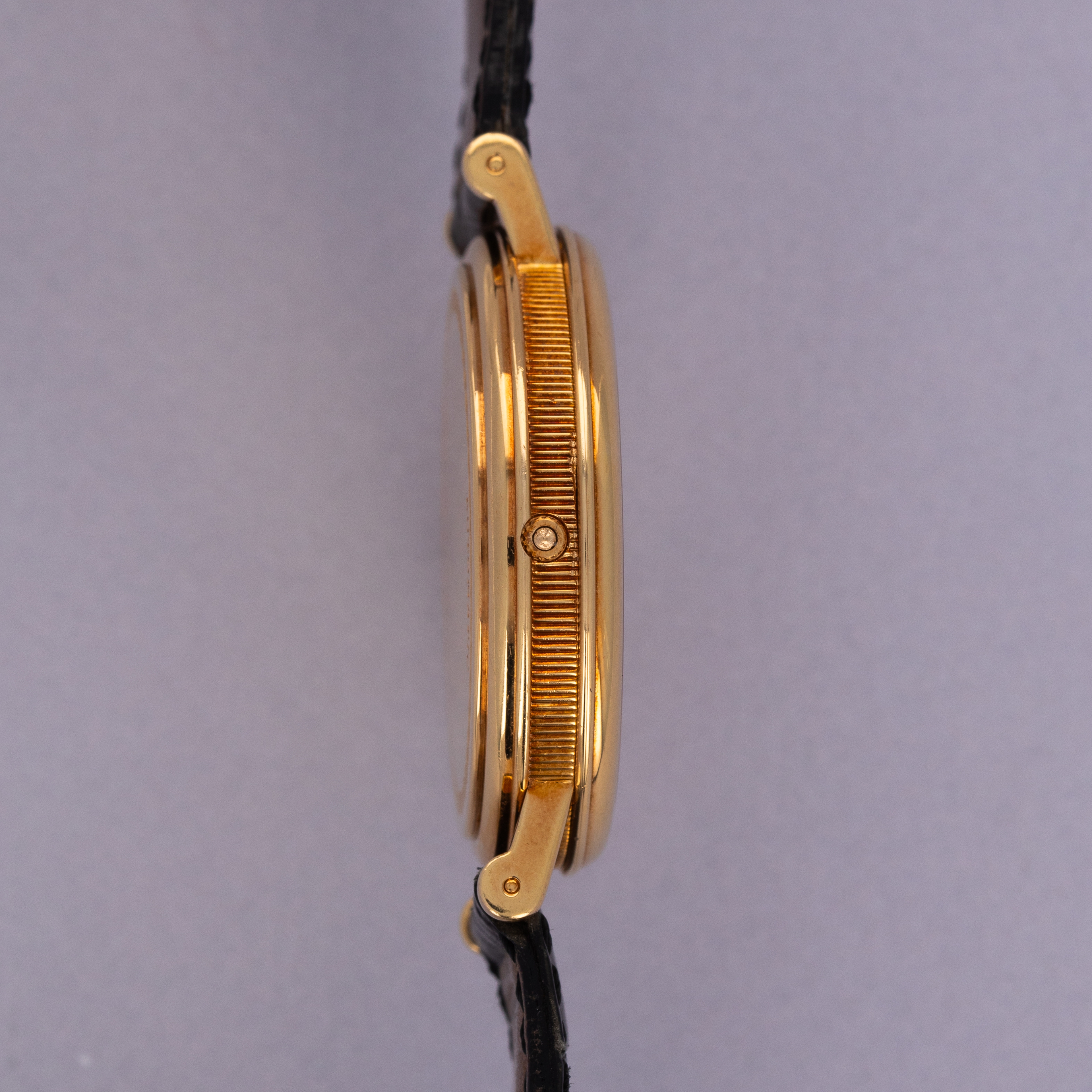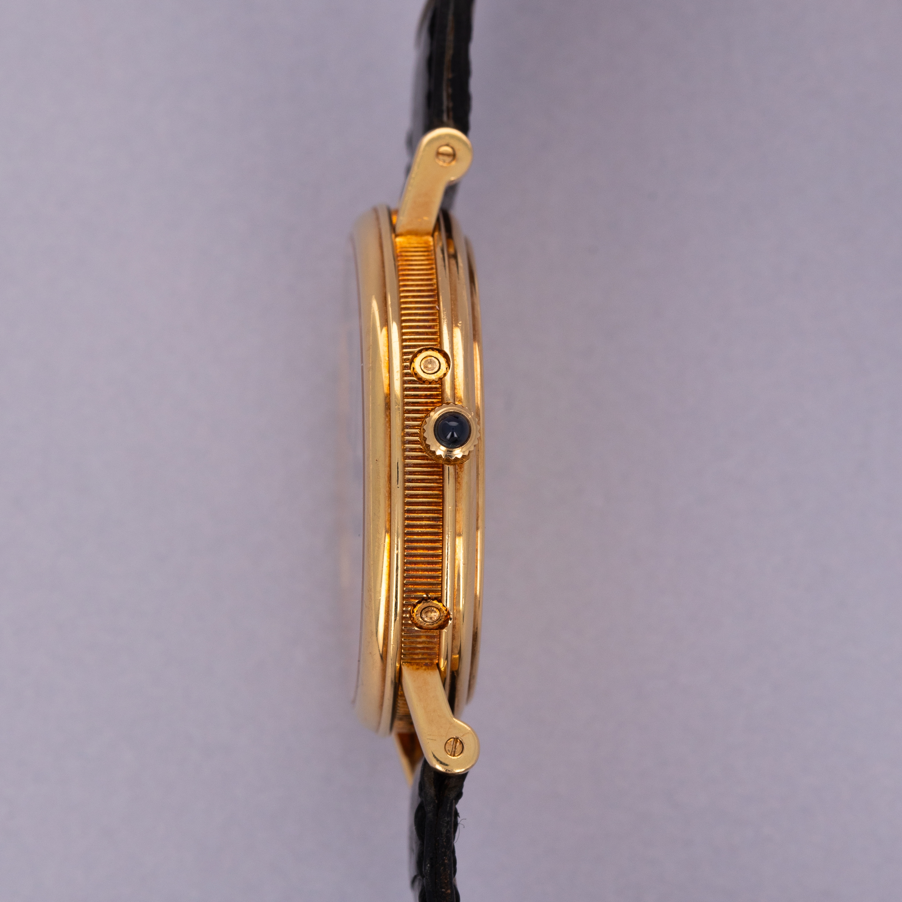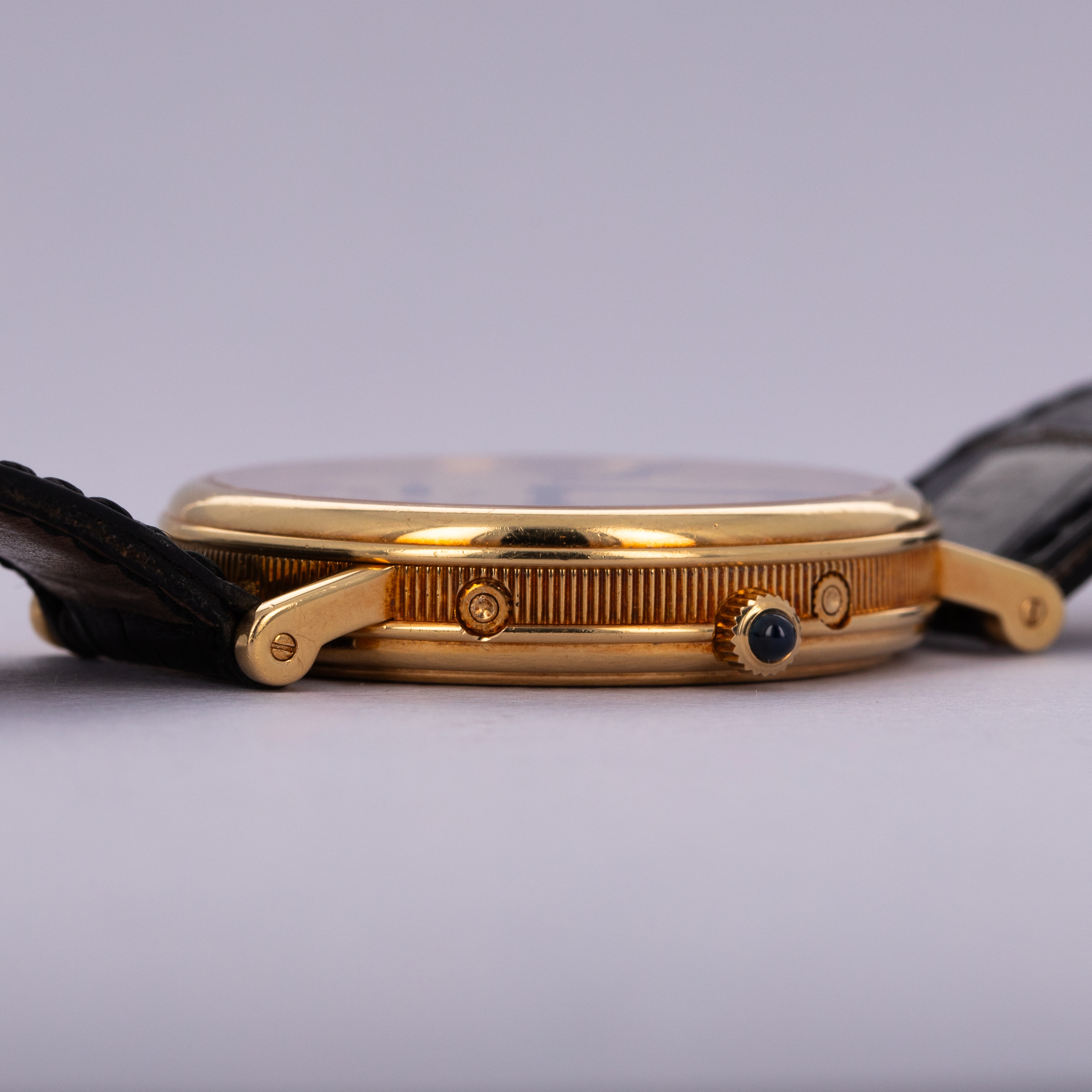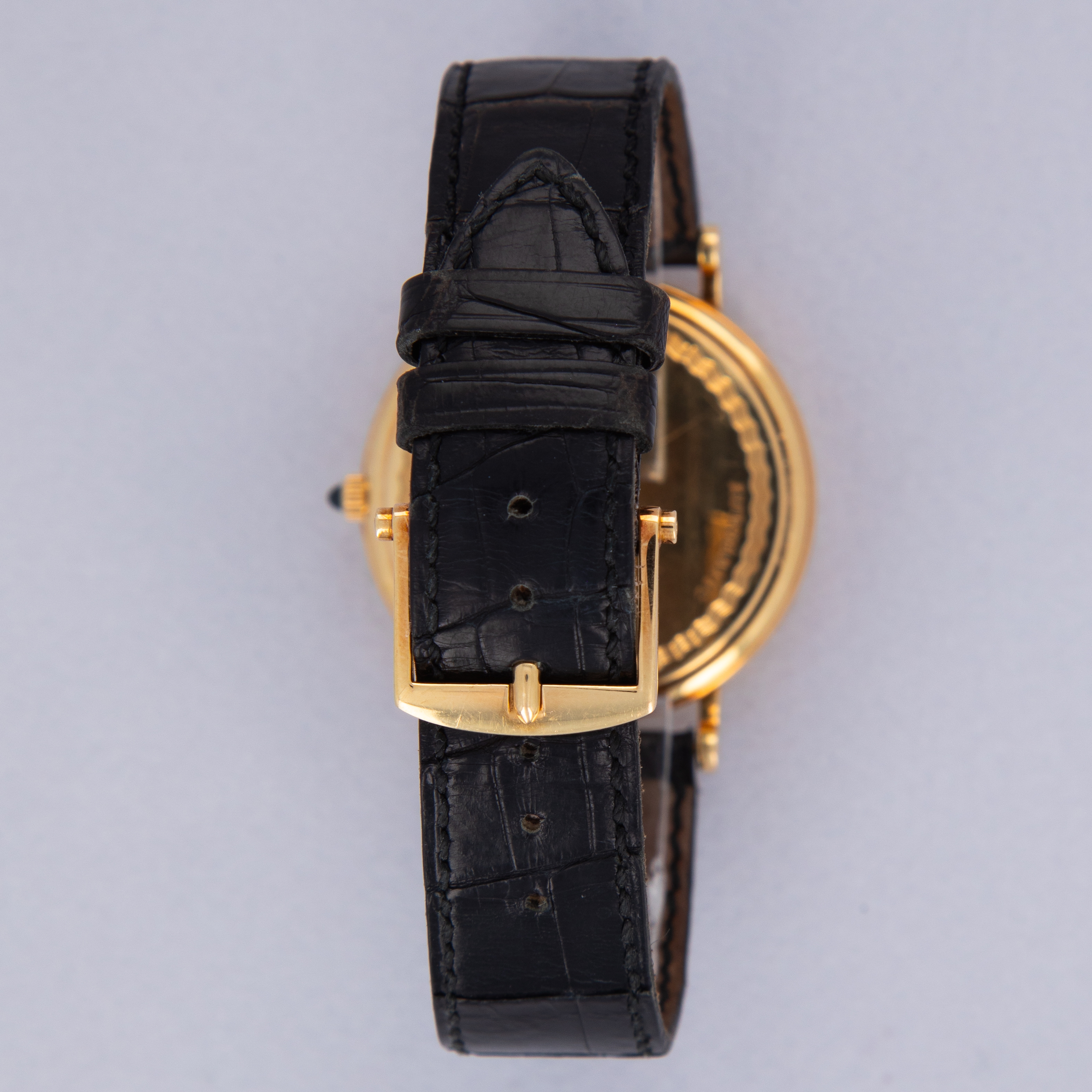 Watch is in excellent overall condition. Case shows minor wear, with some scratches visible primarily along the polished bezel. The guilloche dial is near-mint with no visible marks or damage. The watch comes with its original 18k gold buckle.