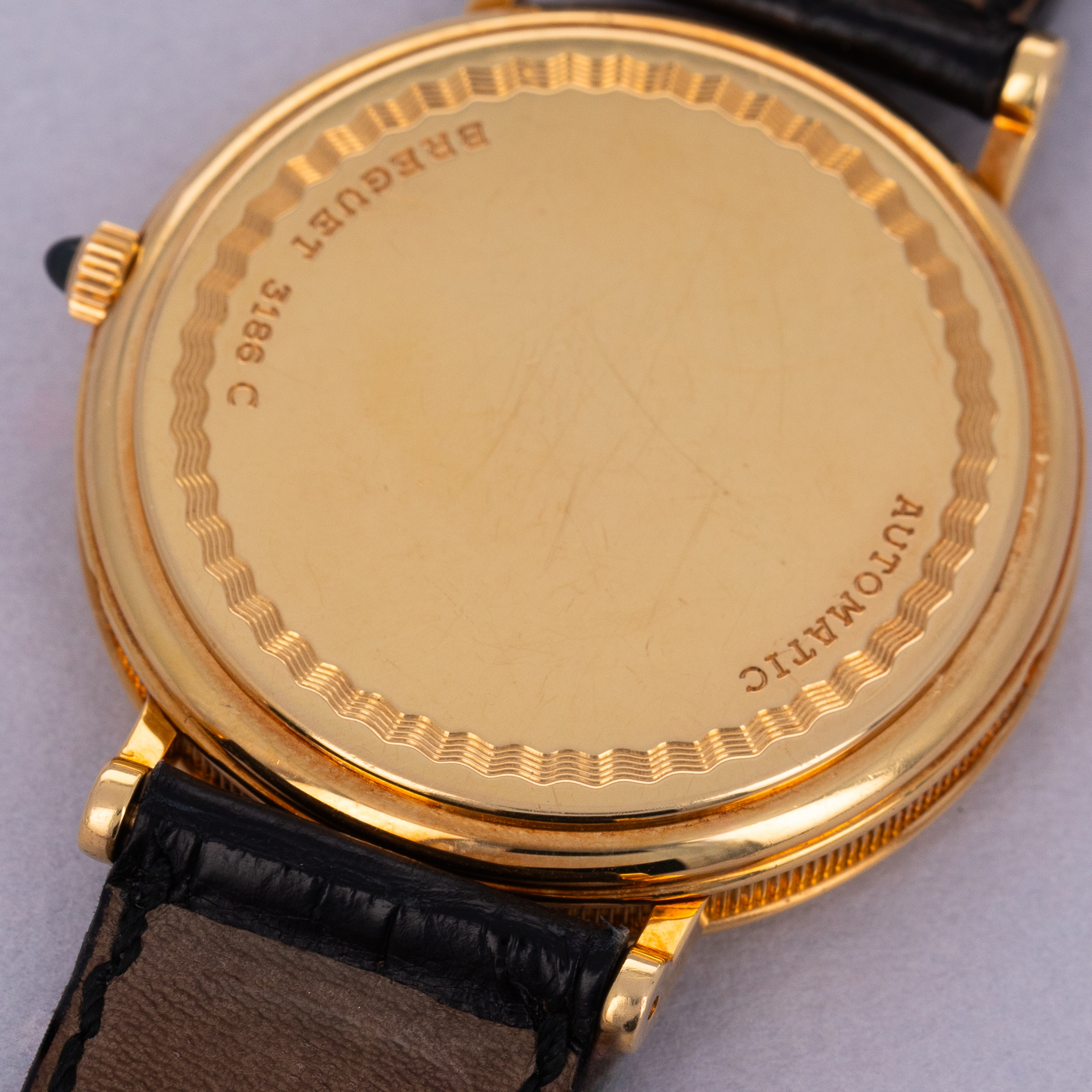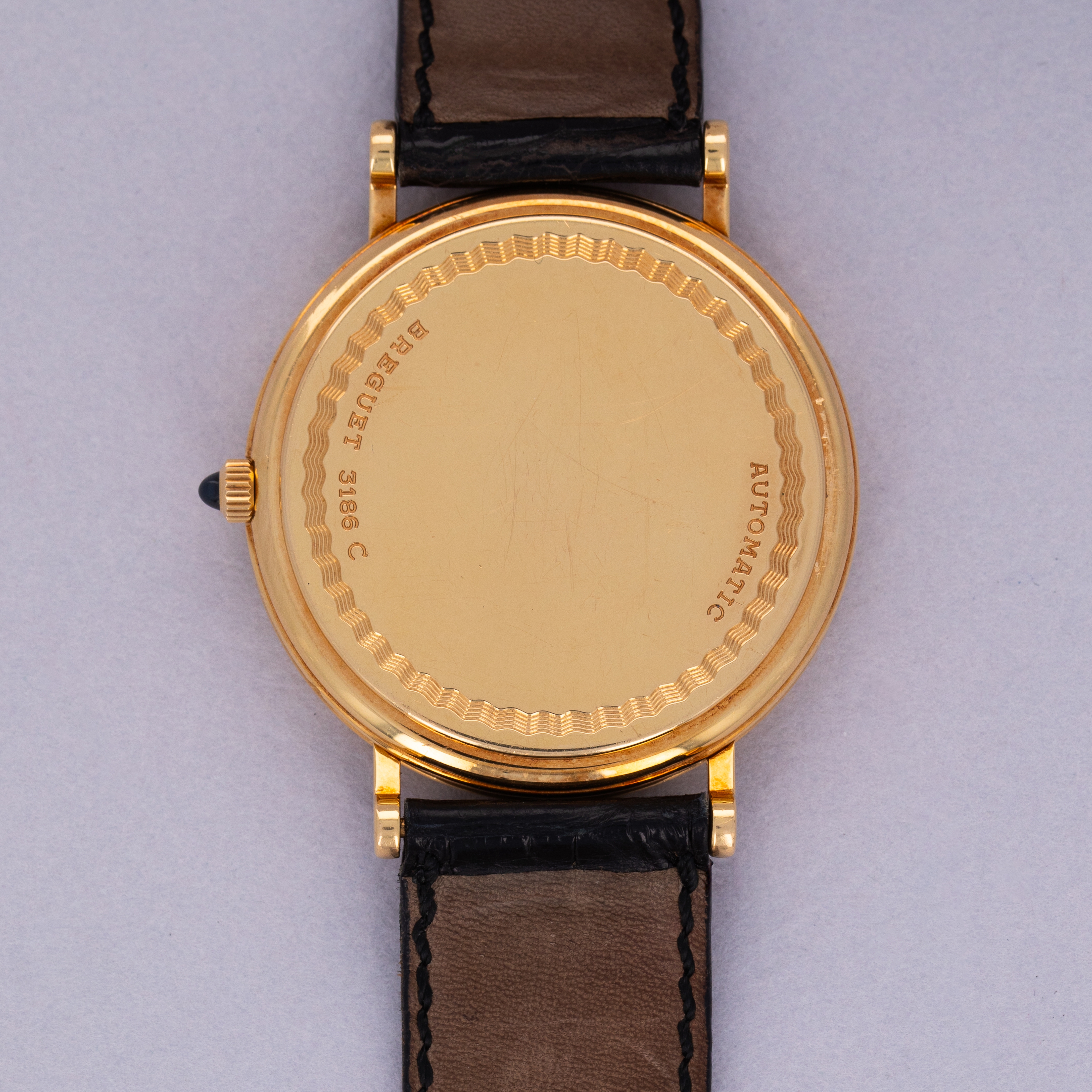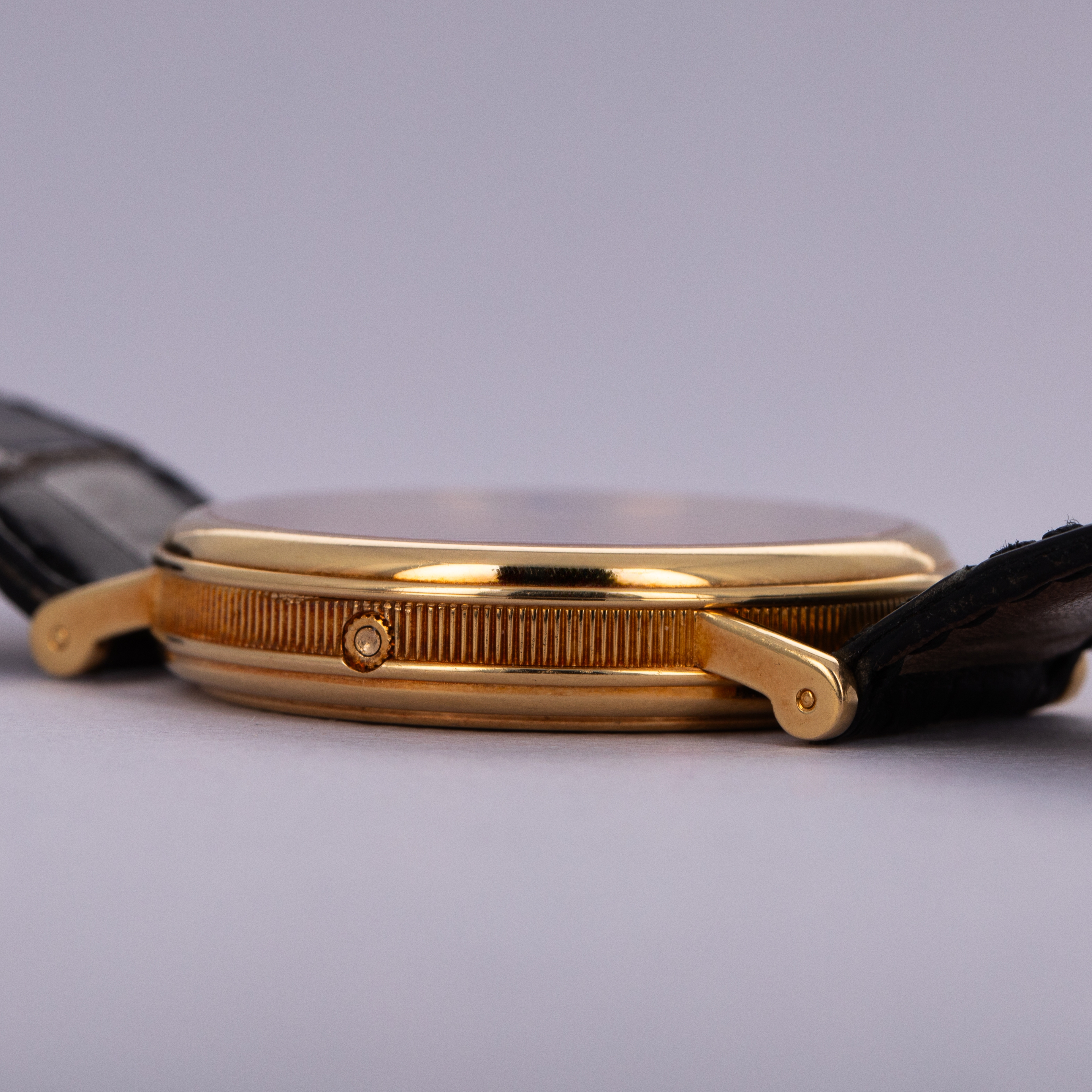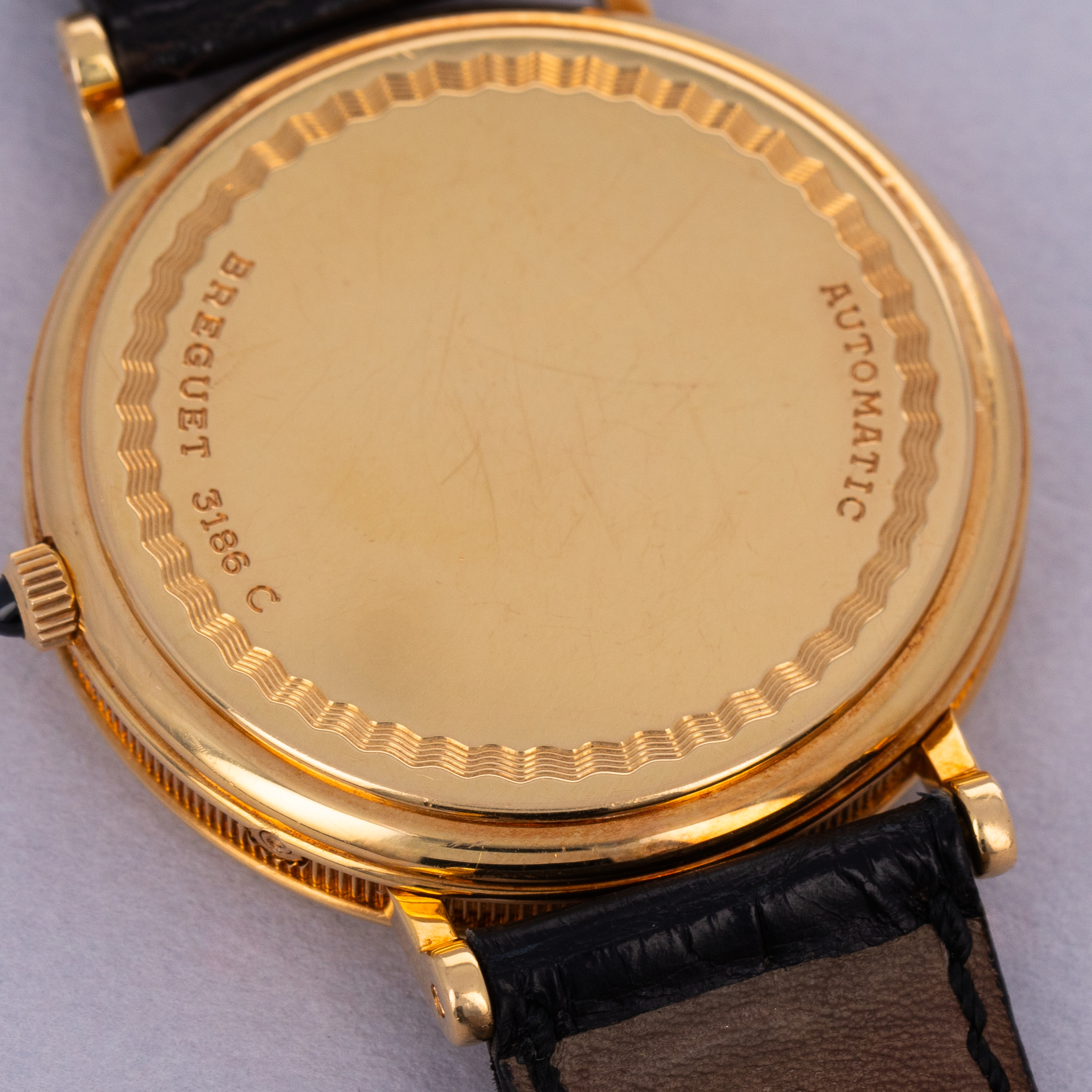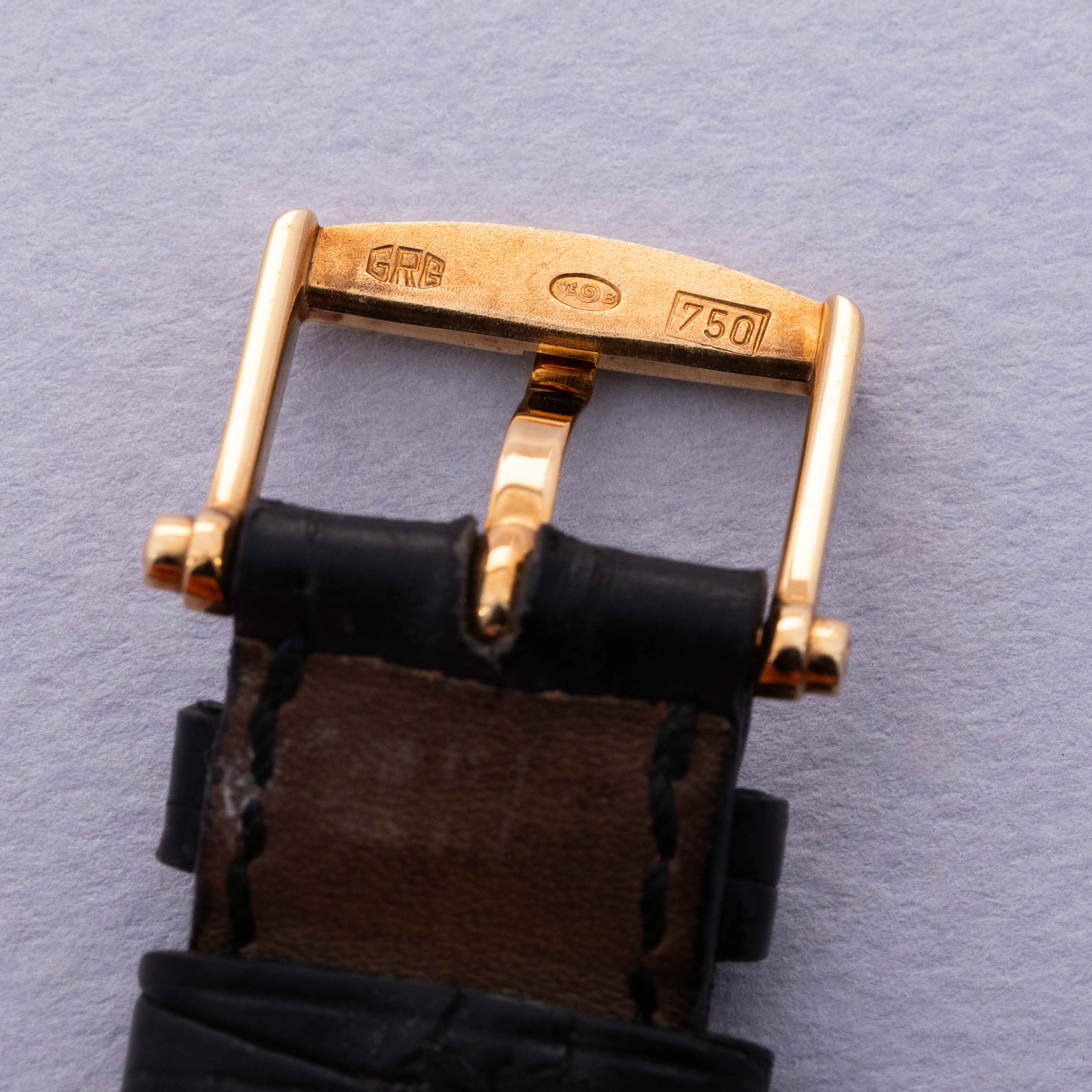 Watch is in excellent overall condition. Case shows minor wear, with some scratches visible primarily along the polished bezel. The guilloche dial is near-mint with no visible marks or damage. The watch comes with its original 18k gold buckle.