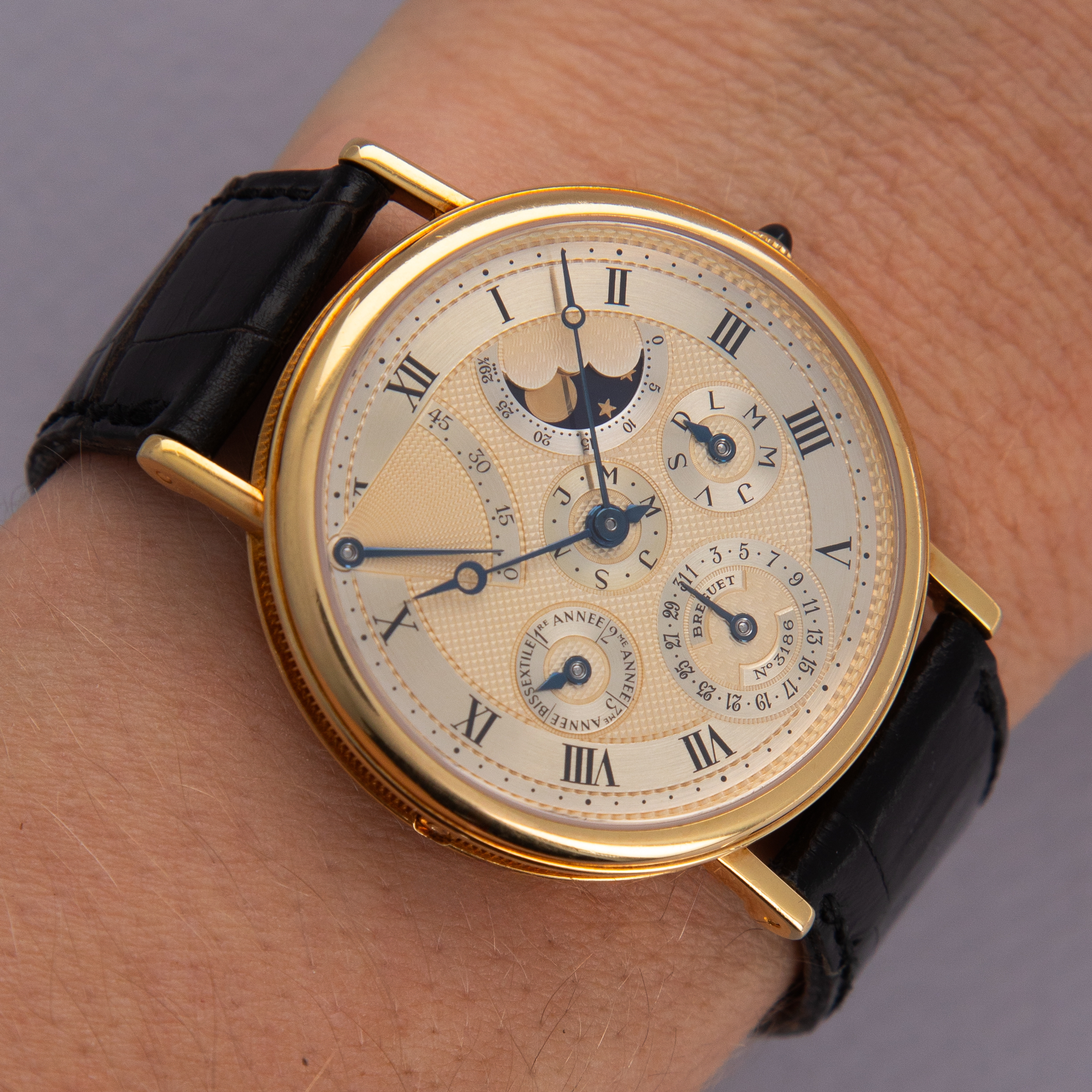 A stunning blend of Breguet's classical aesthetic and modern watchmaking's tastes, the Classique Perpetual Calendar is indeed classic in its aesthetic, with an 18kt yellow gold case that takes direct inspiration from mid-century dress watches via its coin-edge textured midcase and straight lugs.