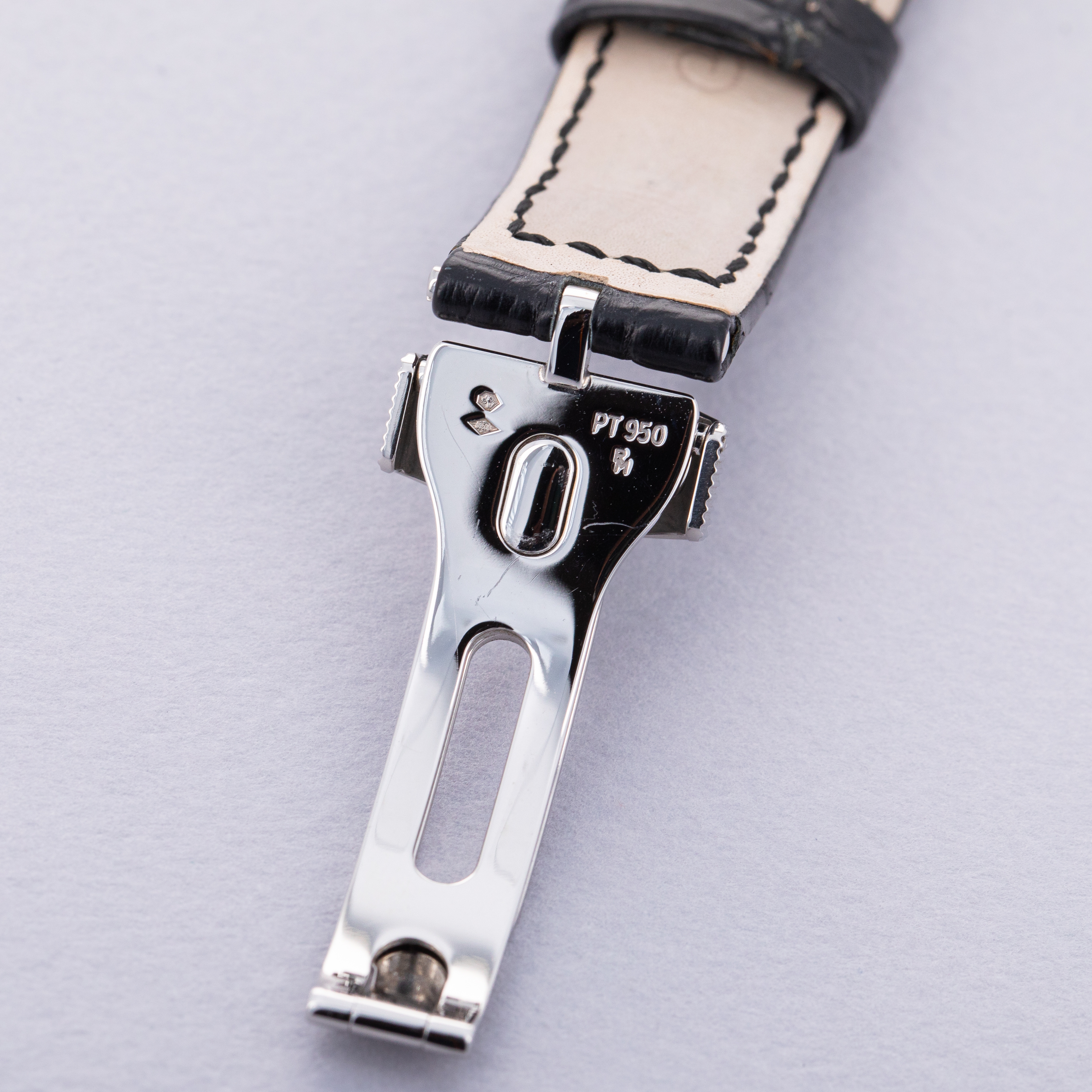 Watch is in excellent overall condition. Case exhibits superficial scratches and wear, visible primarily on the polished lugs and bezel. Caseback engravings and hallmarks are crisp and visible. Deployant buckle in PT shows some scratches across the polished surface and B emblem.