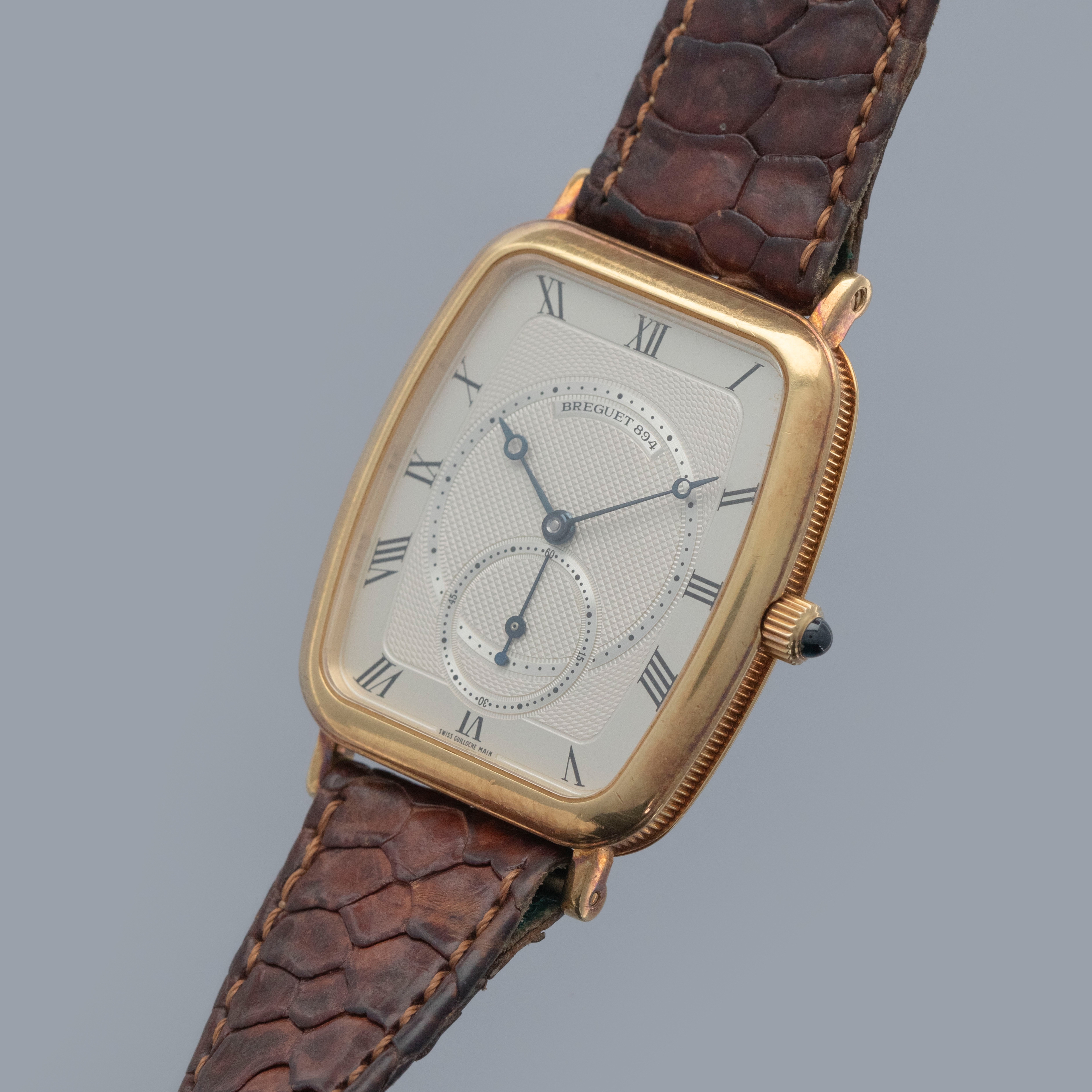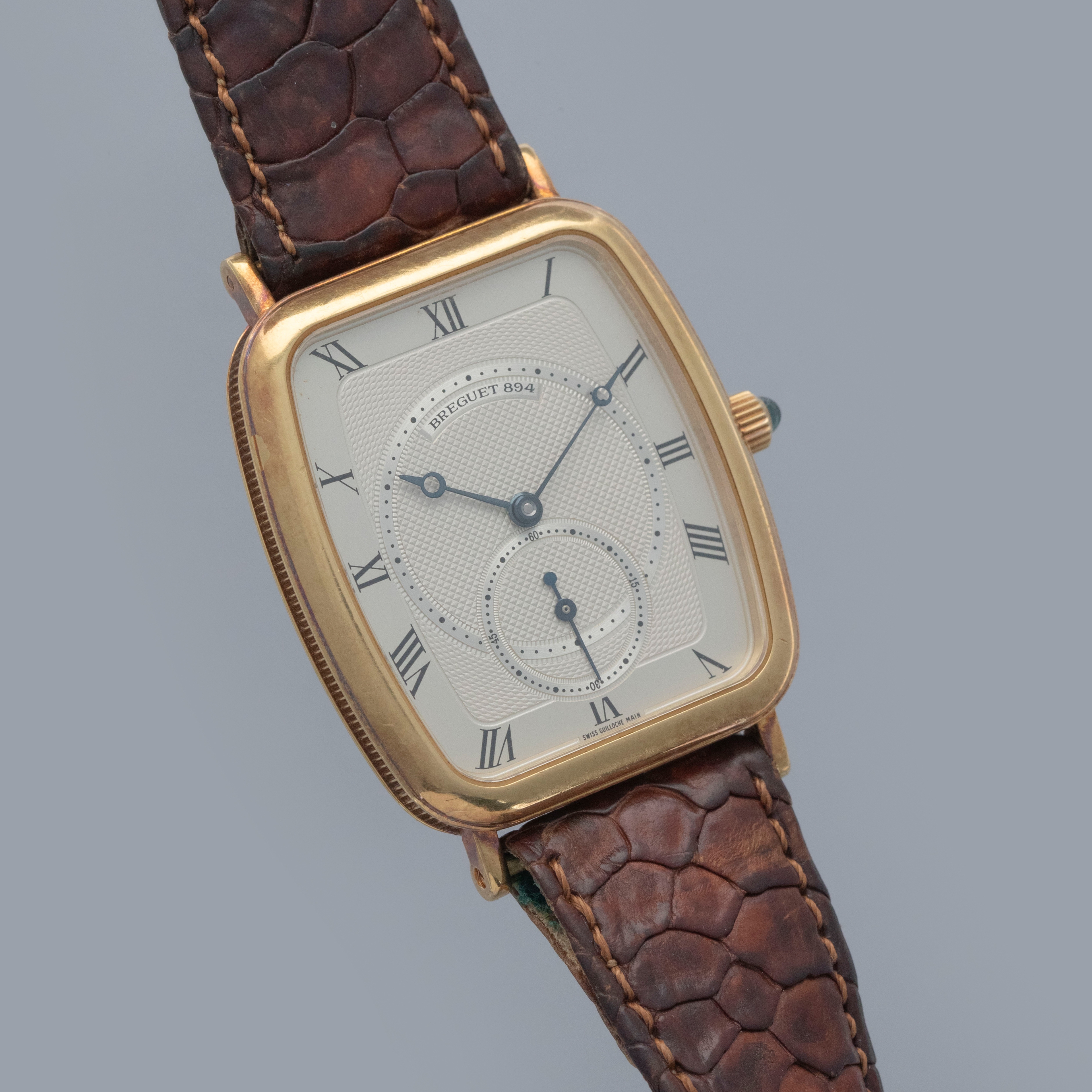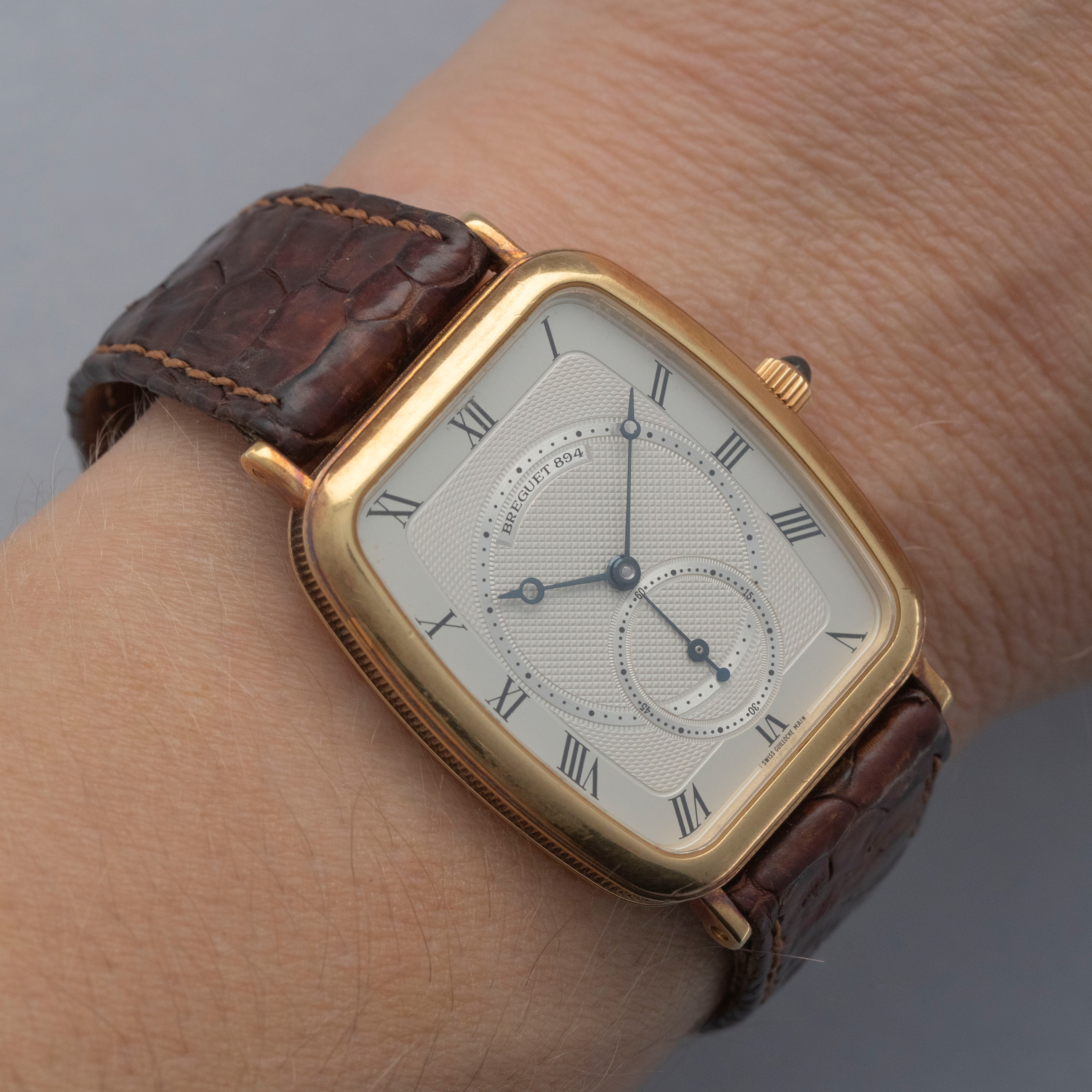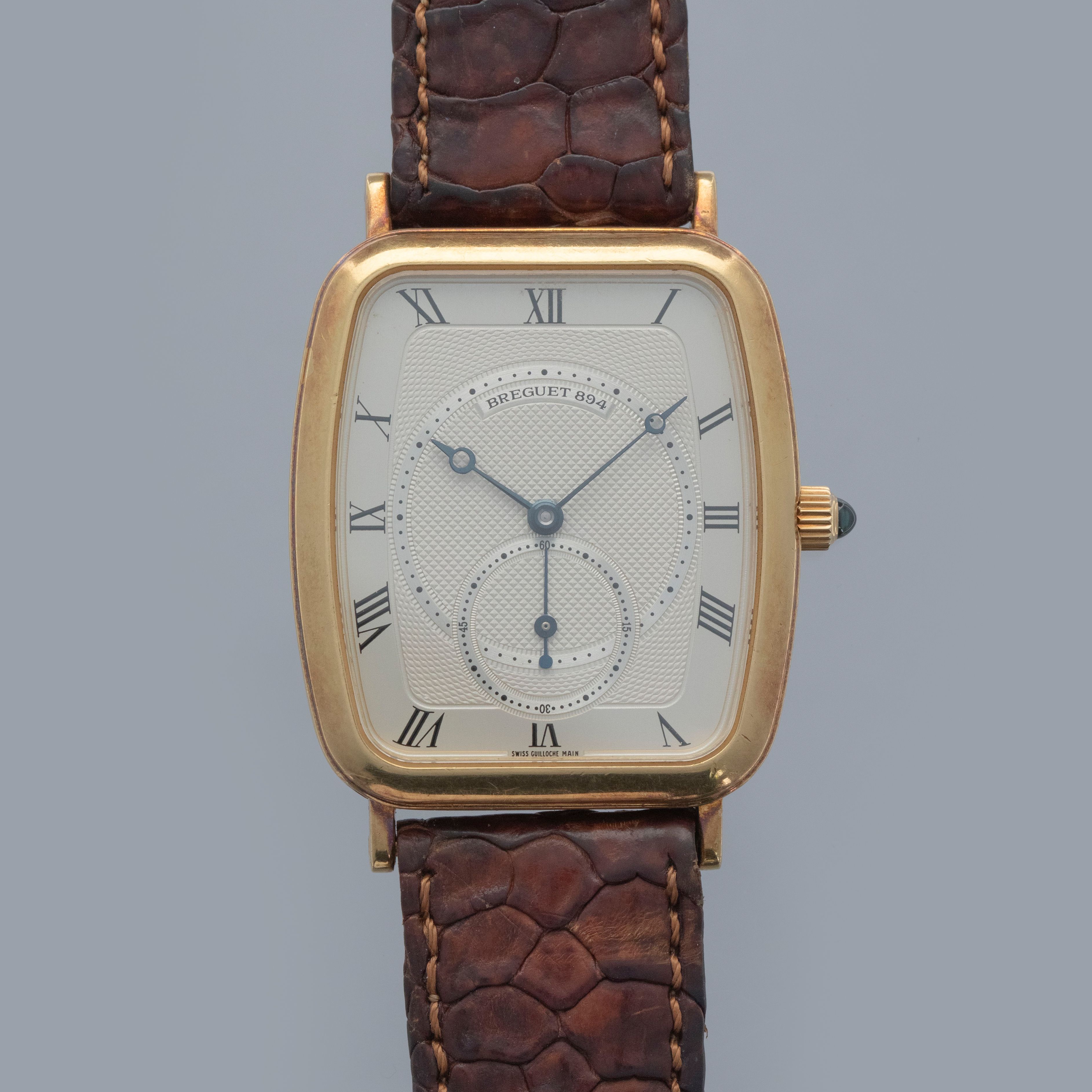Watch is in overall excellent condition. The yellow gold case remains well defined, with surface scratches and small nicks, and has developed a pleasing patina. The case back shows surface scratches and retains crisp stamps. The dial remains excellent, with a couple of light surface marks, while the blued Breguet hands remain very clean. It is fitted with a brown crocodile strap in good condition and an excellent Breguet yellow gold buckle.