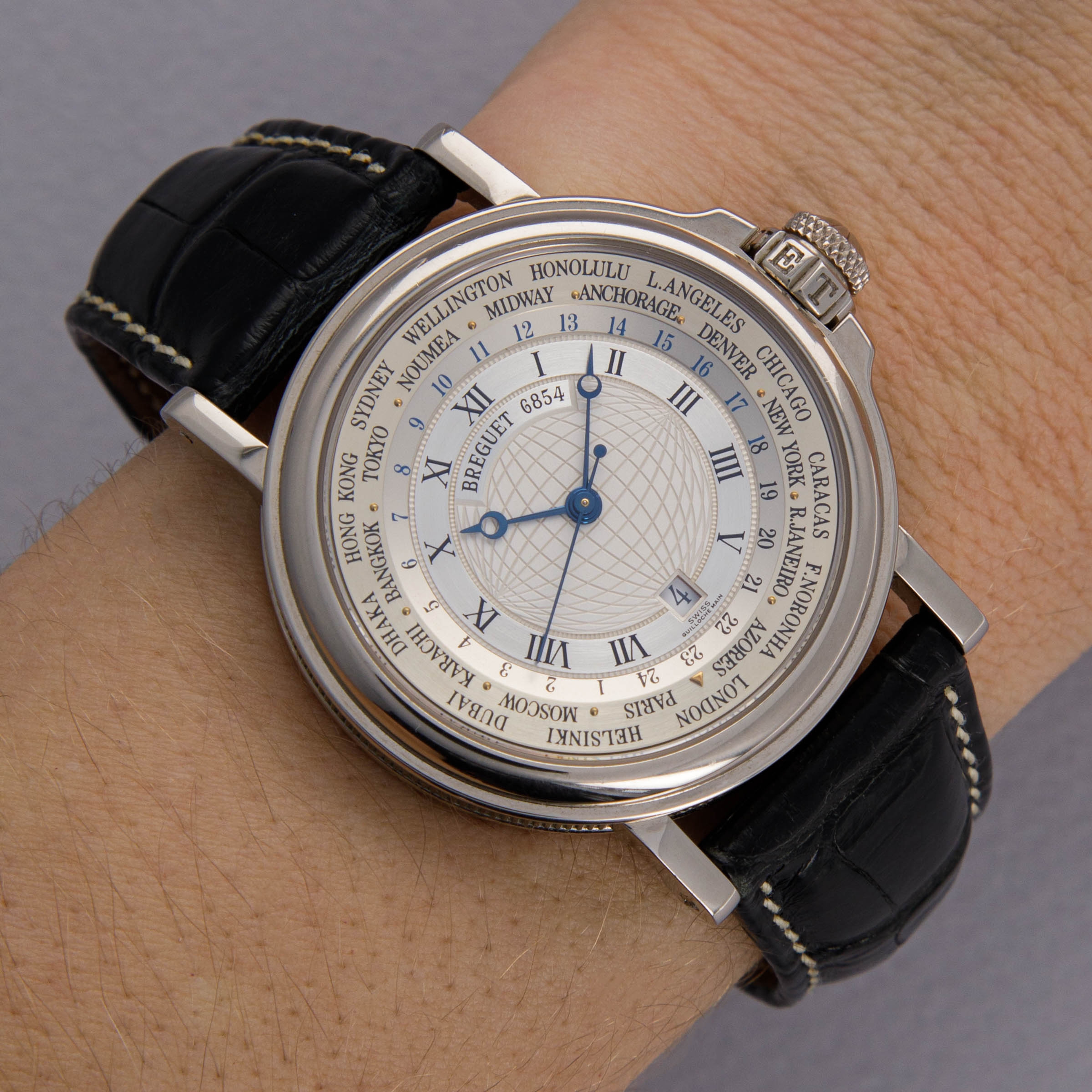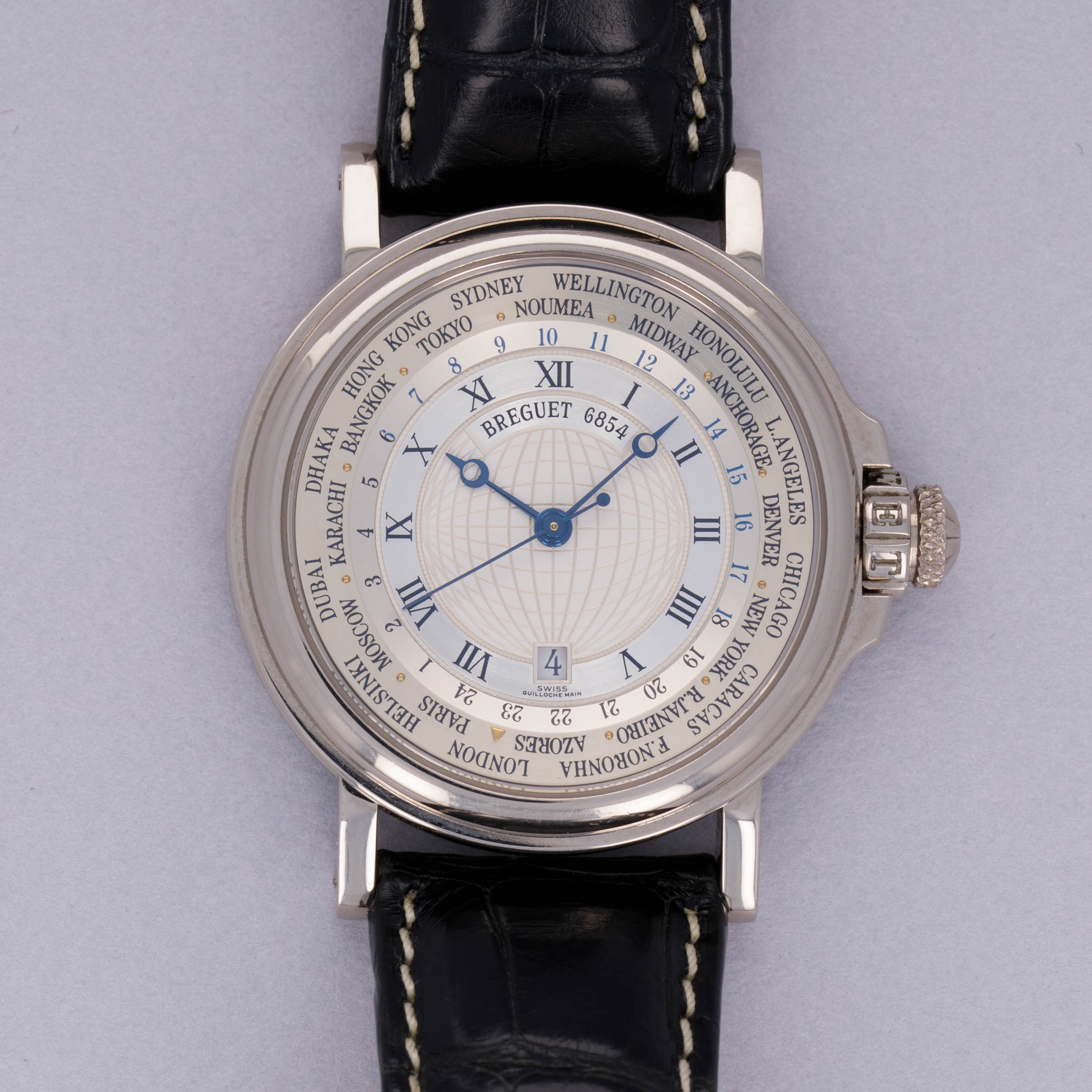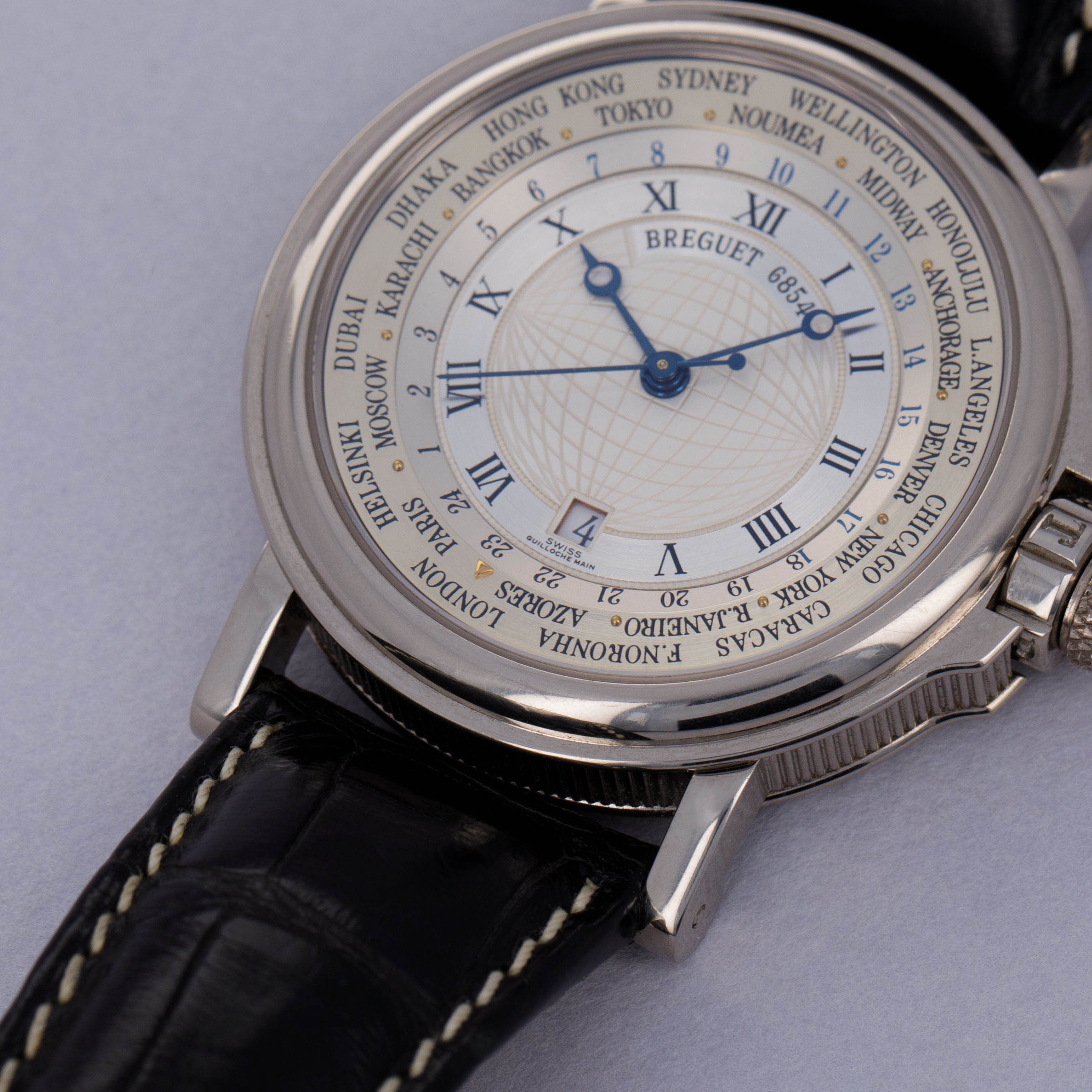 Founded by Abraham-Louis Breguet, one of horology’s most famed watchmakers, Breguet is a brand rooted in classical horological excellence. With such innovations as the tourbillon, the Breguet overcoil and their eponymous ‘Breguet’ hands and even numerals among their impressive list of accolades, Breguet are widely renowned as one of the most influential and important watchmakers in the industry. With a truly remarkable history, Breguet’s timepieces often hark back to the classical period of watchmaking through a traditional aesthetic, and this 18kt white gold Marine “Hora Mundi” (world time in Latin) does exactly that. Launched in 1996, the Hora Mundi combines Breguet’s traditionalist aesthetic with a utilitarian flair that results in a timepiece that is both elegant and useful. Boasting a perfectly round 18kt white gold case with a polished domed bezel that swoops down to a step before the midcase where Breguet’s signature coin-edge texture can be found, the Hora Mundi is exceptionally elegant. Much like its case, this Hora Mundi’s silver dial features a beautiful blend of textures, with a globe-type pattern engraved in its center along with concentrically-brushed chapter rings that house the hours in both Roman numerals and in Arabic numerals, and the cities whose time zones the Hora Mundi cover. An elegantly styled timepiece, this example is undoubtedly Breguet at their finest in just about every way from its craftsmanship, design and execution.