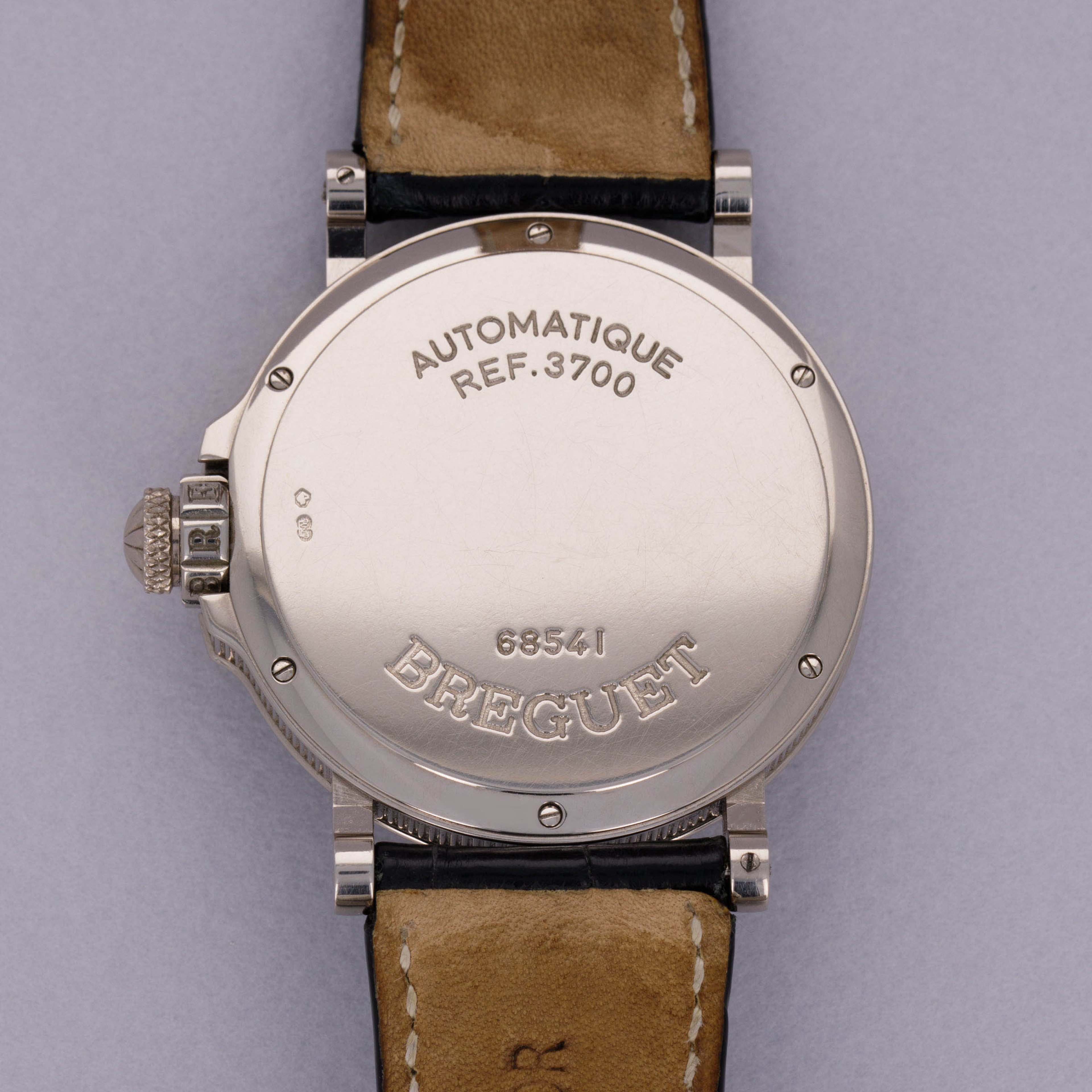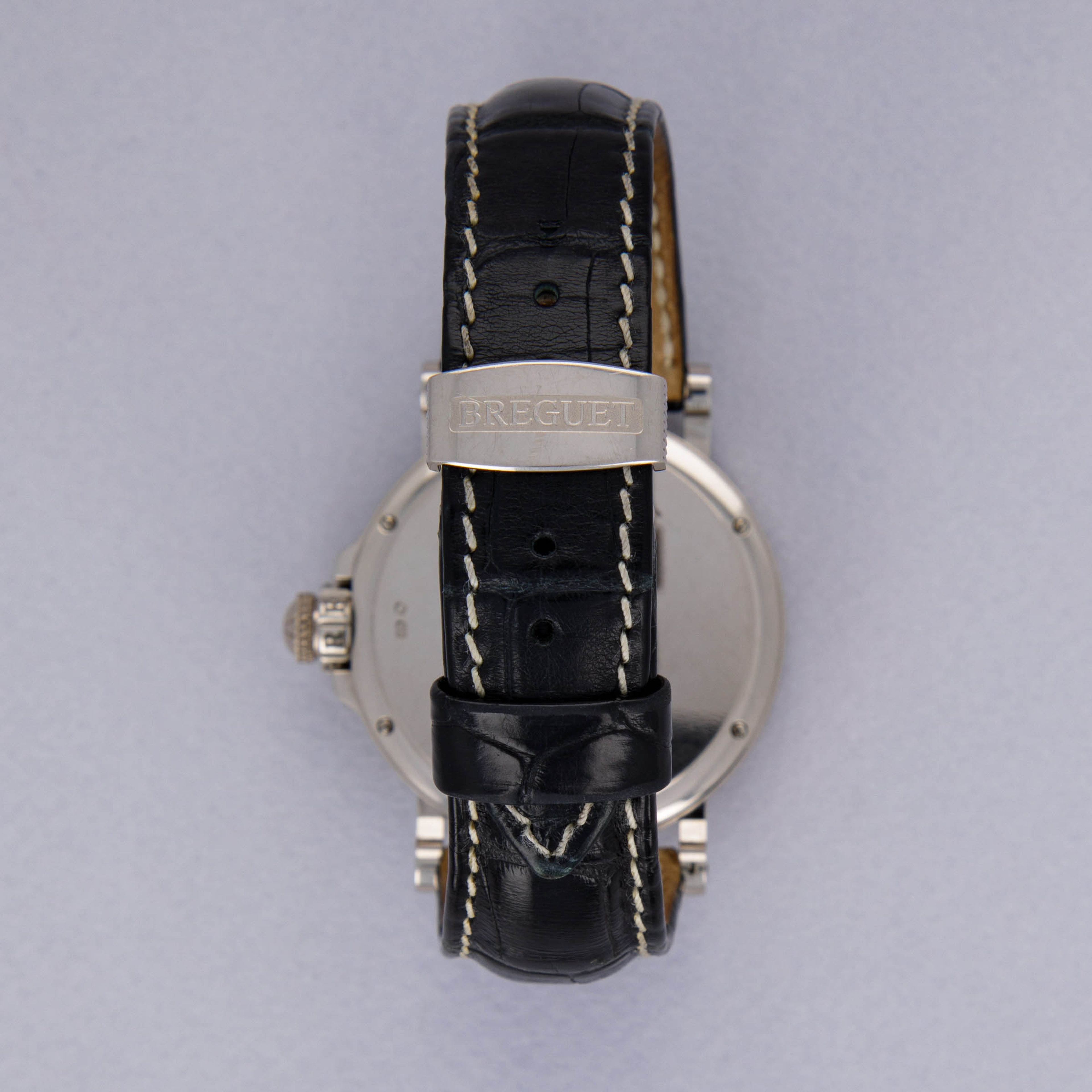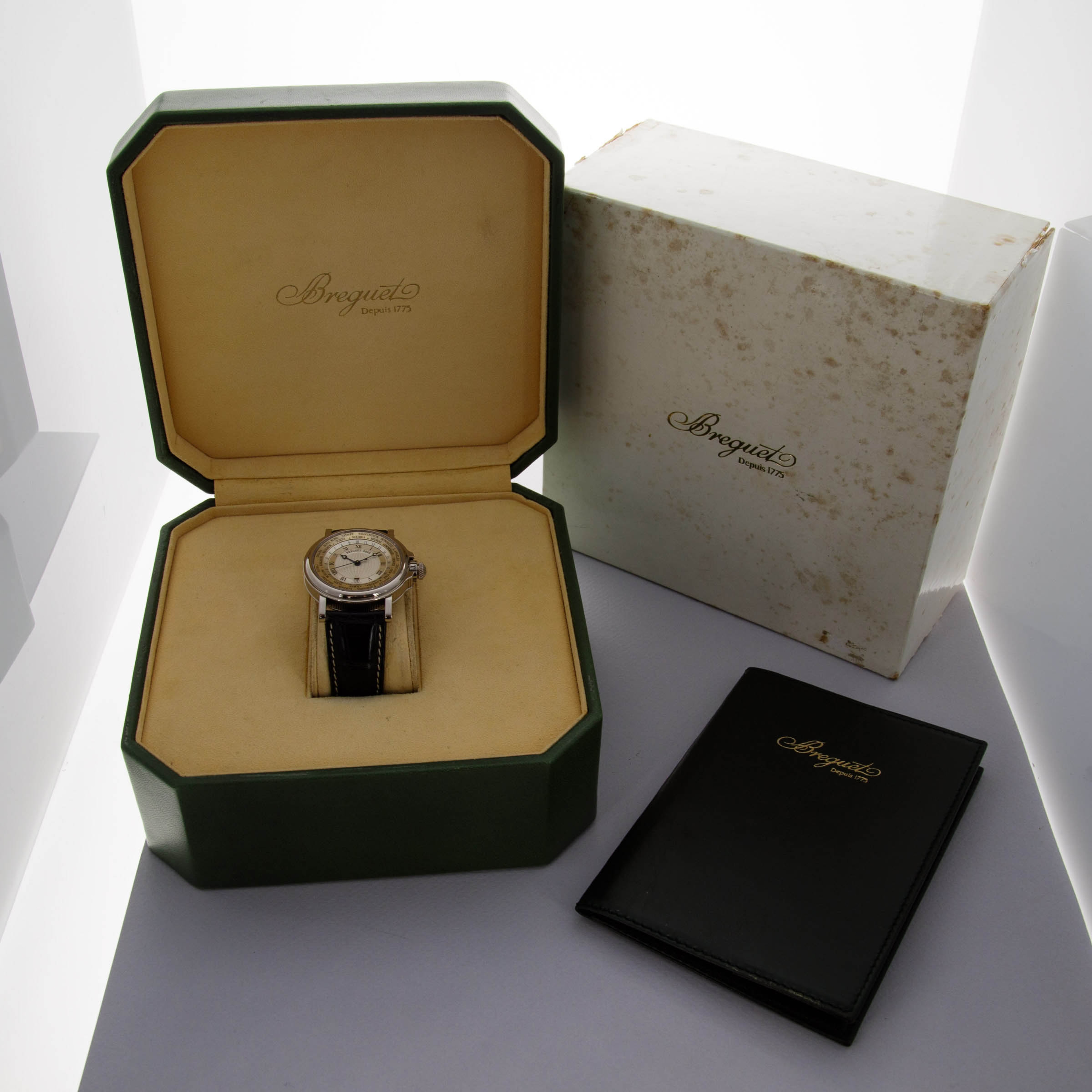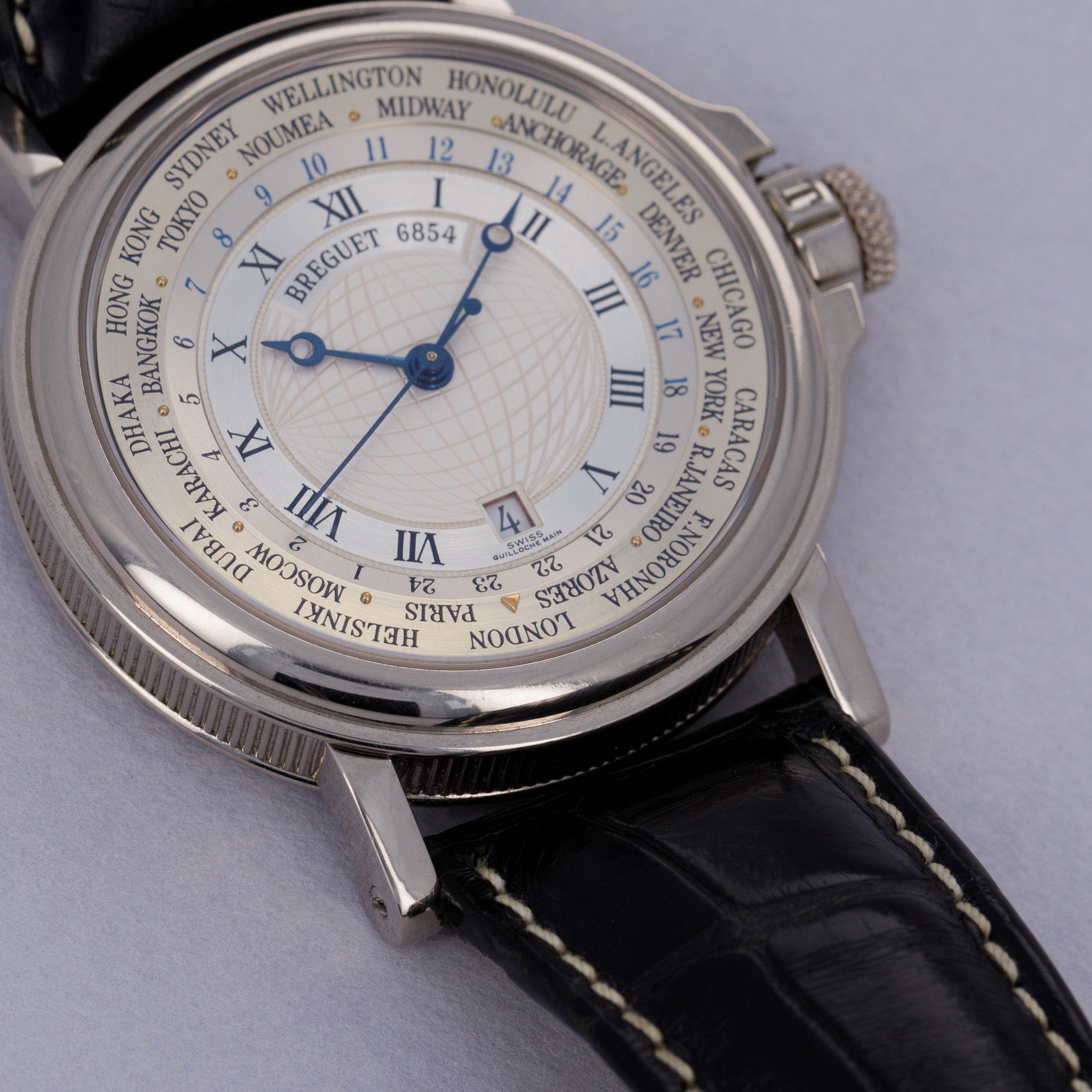 Founded by Abraham-Louis Breguet, one of horology’s most famed watchmakers, Breguet is a brand rooted in classical horological excellence. With such innovations as the tourbillon, the Breguet overcoil and their eponymous ‘Breguet’ hands and even numerals among their impressive list of accolades, Breguet are widely renowned as one of the most influential and important watchmakers in the industry. With a truly remarkable history, Breguet’s timepieces often hark back to the classical period of watchmaking through a traditional aesthetic, and this 18kt white gold Marine “Hora Mundi” (world time in Latin) does exactly that. Launched in 1996, the Hora Mundi combines Breguet’s traditionalist aesthetic with a utilitarian flair that results in a timepiece that is both elegant and useful. Boasting a perfectly round 18kt white gold case with a polished domed bezel that swoops down to a step before the midcase where Breguet’s signature coin-edge texture can be found, the Hora Mundi is exceptionally elegant. Much like its case, this Hora Mundi’s silver dial features a beautiful blend of textures, with a globe-type pattern engraved in its center along with concentrically-brushed chapter rings that house the hours in both Roman numerals and in Arabic numerals, and the cities whose time zones the Hora Mundi cover. An elegantly styled timepiece, this example is undoubtedly Breguet at their finest in just about every way from its craftsmanship, design and execution.
