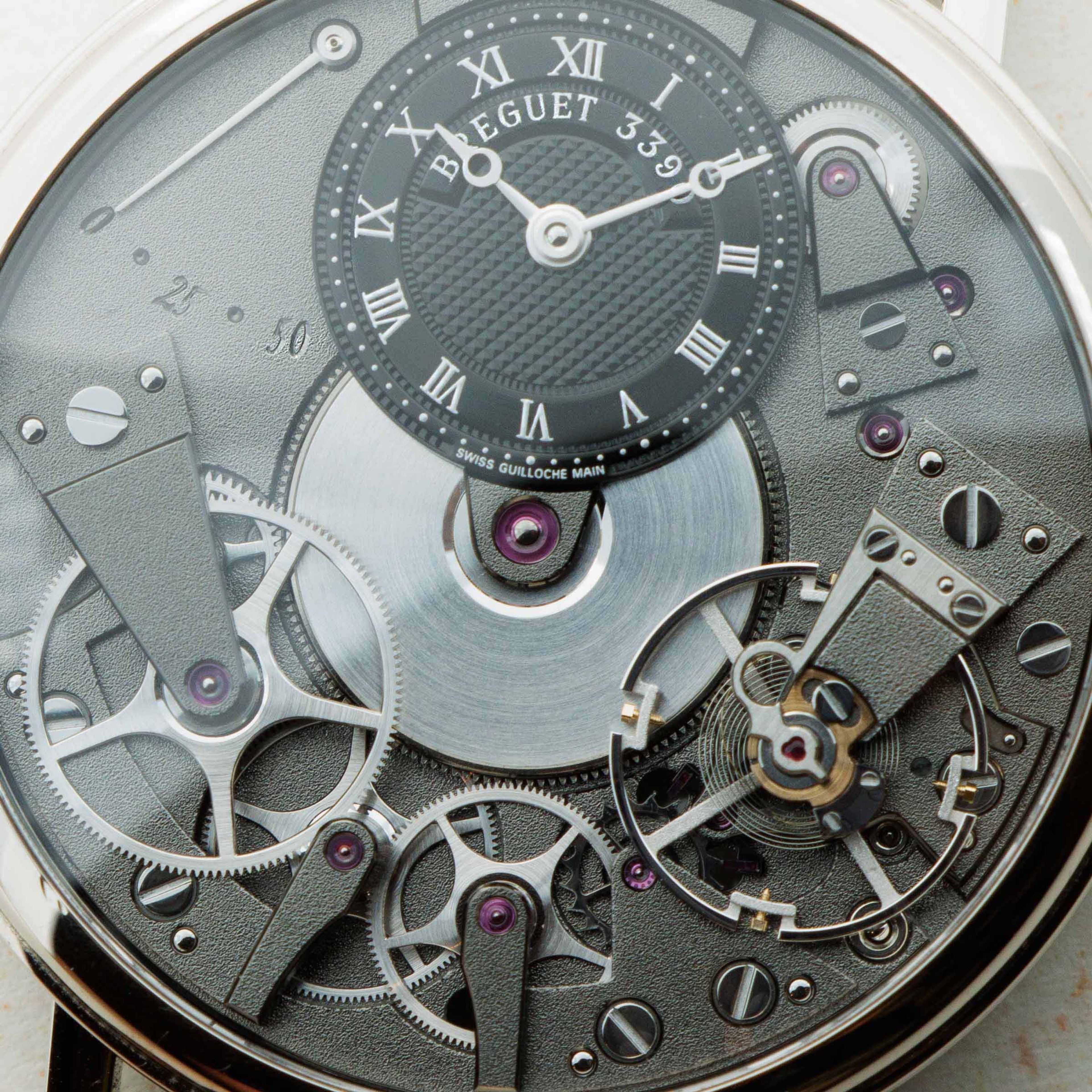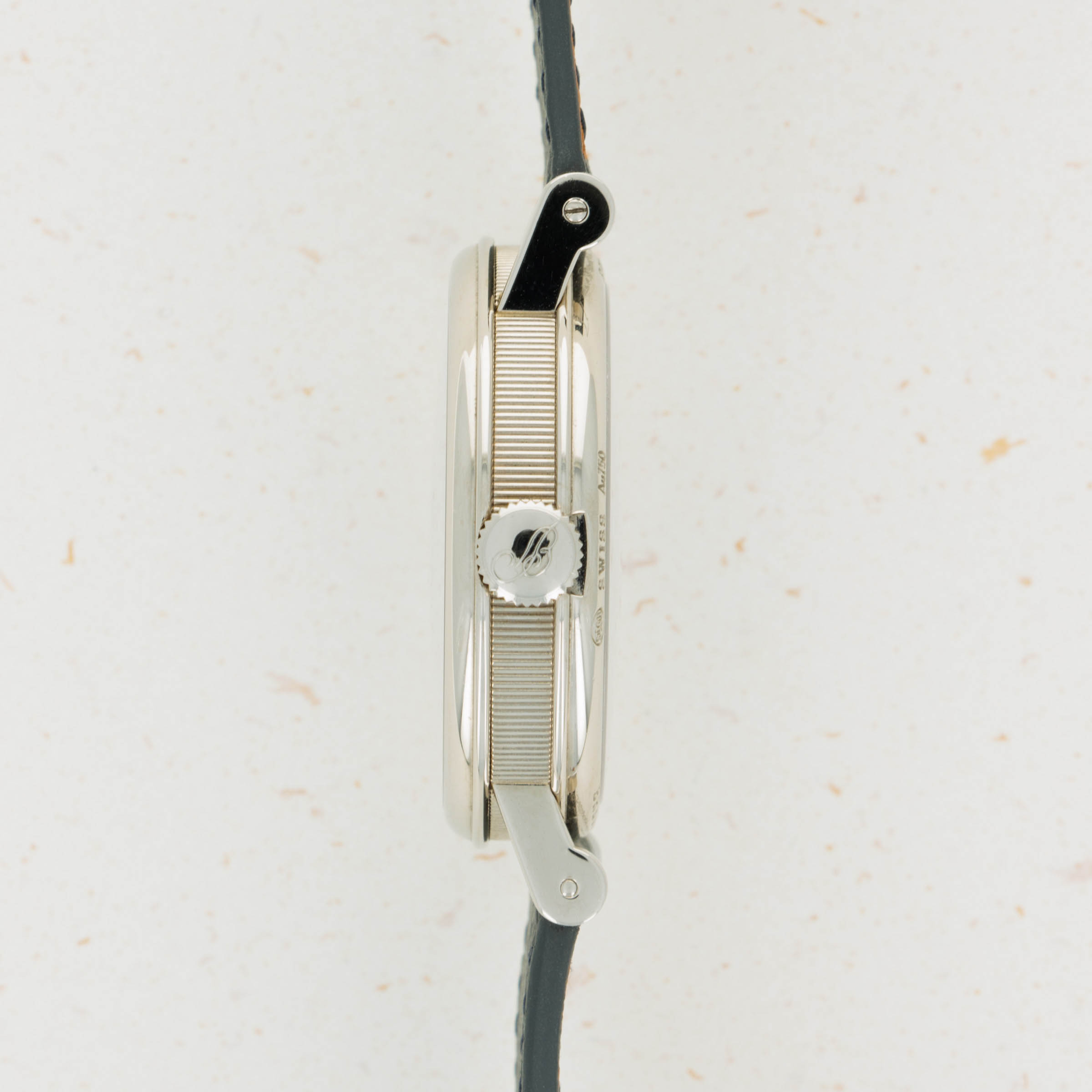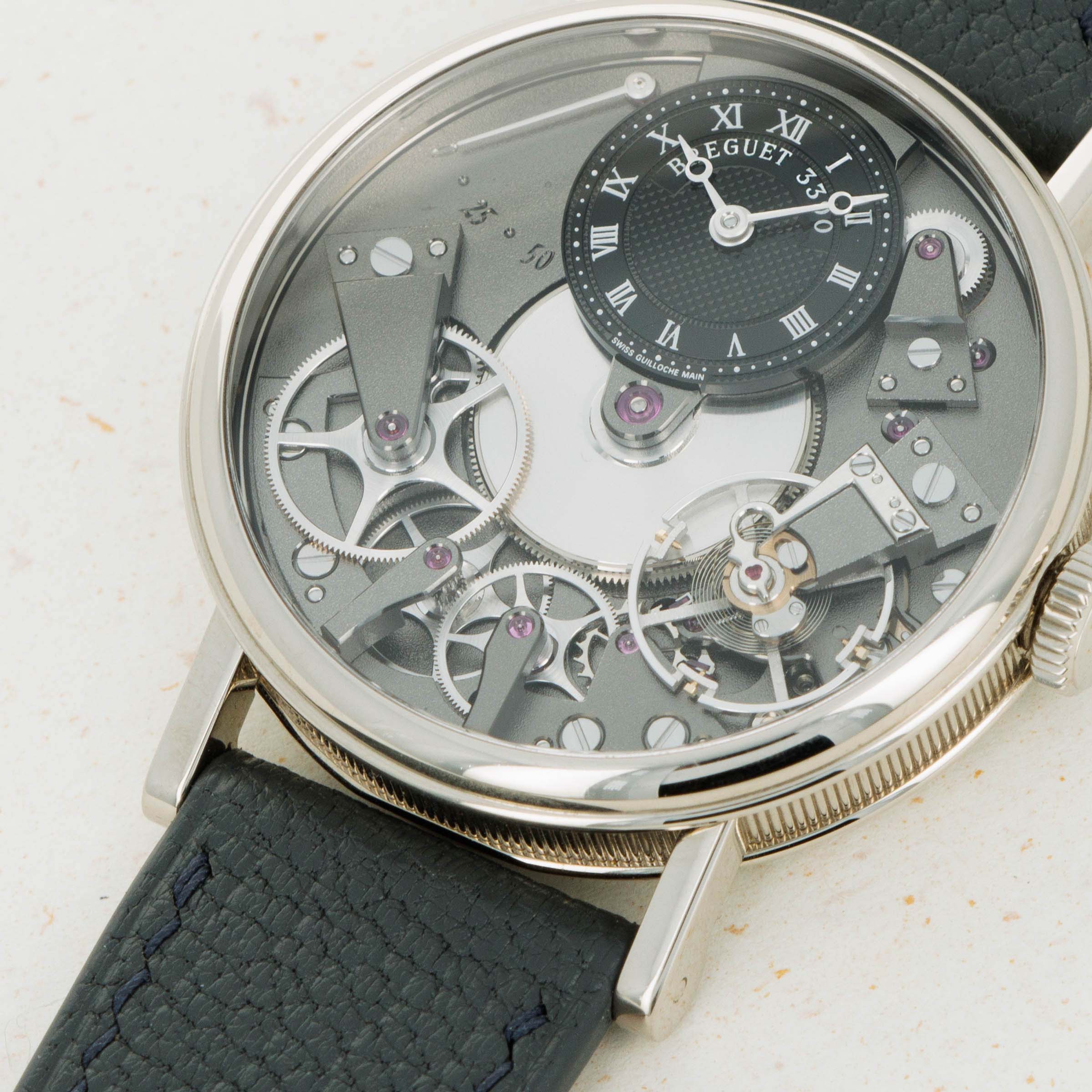 Launched in 2005 and drawing inspiration from their long heritage as a fine watch manufacturer, Breguet revealed the La Tradition collection. Rooted in the aesthetic of their early pocketwatches, the La Tradition celebrates the majesty of mechanical watchmaking by revealing the majority of its movement on the dial side of the watch by using a small dial that only obscures a very small portion of the movement. Creating a rather avant-garde aesthetic, the La Tradition brings attention to Breguet’s incredible craftsmanship with its finely finished movement on display behind both sides of its case. Powered by the manual-wind cal. 507 DR, the ref. 7027BB that we have here is rather monochromatic in execution thanks to its anthracite movement, black engine-turned dial and 18kt white gold case. Contrasting its avant-garde display is a rather classical 37mm case with a coin-edge textured mid-case and fairly straight soldered lugs and a gently domed bezel that all combine to give the La Tradition a classic look that appeals to Breguet’s traditionally conservative styling.
