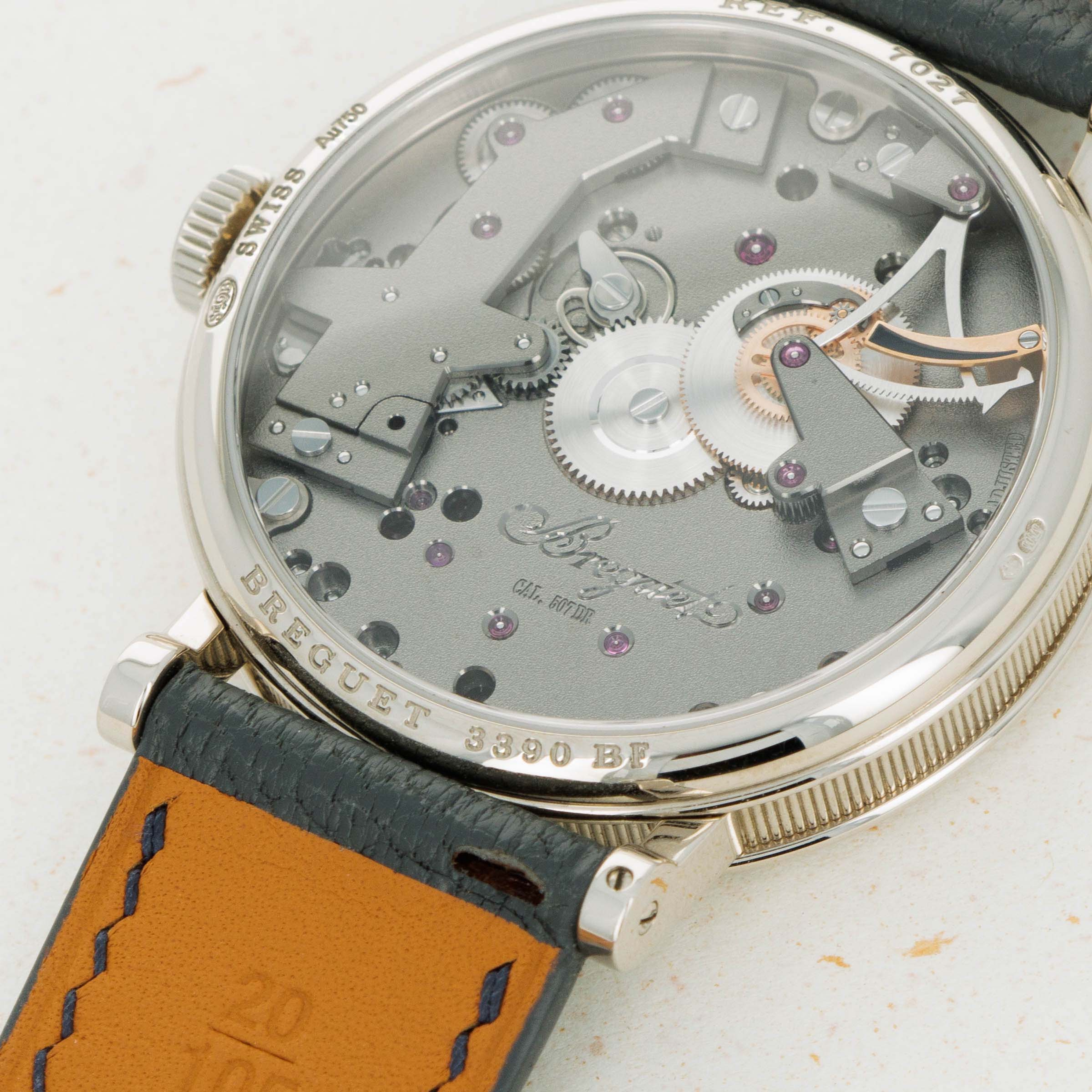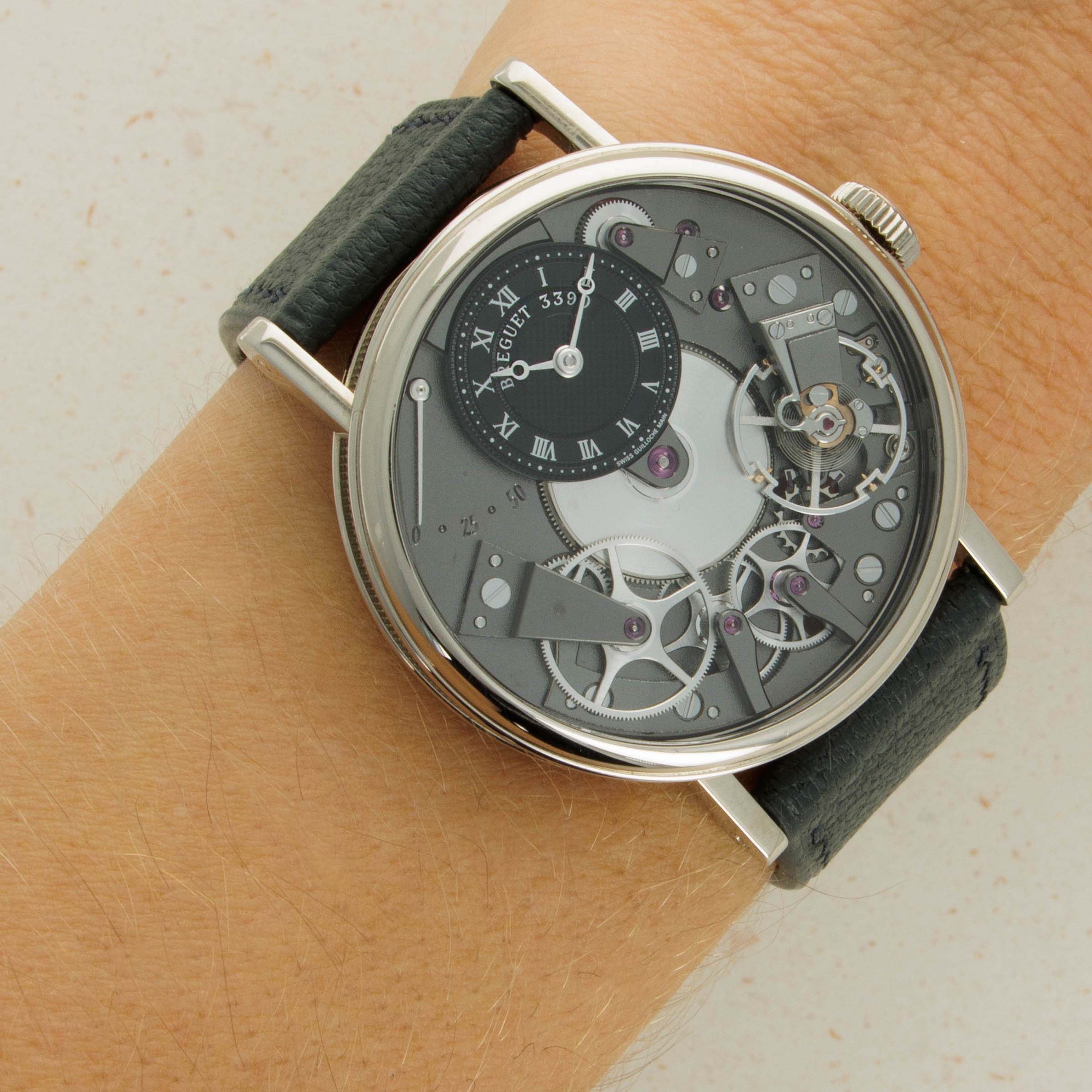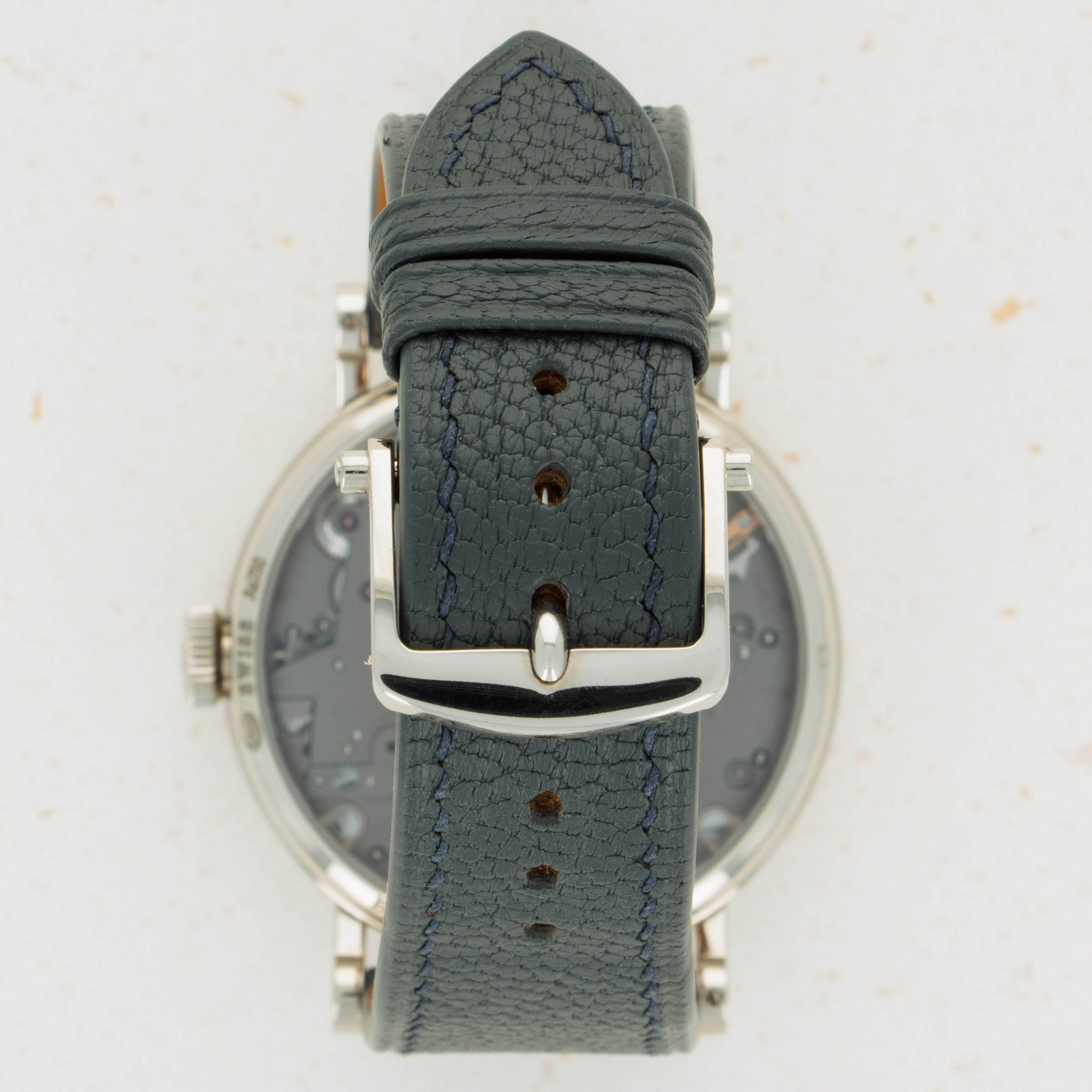 Launched in 2005 and drawing inspiration from their long heritage as a fine watch manufacturer, Breguet revealed the La Tradition collection. Rooted in the aesthetic of their early pocketwatches, the La Tradition celebrates the majesty of mechanical watchmaking by revealing the majority of its movement on the dial side of the watch by using a small dial that only obscures a very small portion of the movement. Creating a rather avant-garde aesthetic, the La Tradition brings attention to Breguet’s incredible craftsmanship with its finely finished movement on display behind both sides of its case. Powered by the manual-wind cal. 507 DR, the ref. 7027BB that we have here is rather monochromatic in execution thanks to its anthracite movement, black engine-turned dial and 18kt white gold case. Contrasting its avant-garde display is a rather classical 37mm case with a coin-edge textured mid-case and fairly straight soldered lugs and a gently domed bezel that all combine to give the La Tradition a classic look that appeals to Breguet’s traditionally conservative styling.