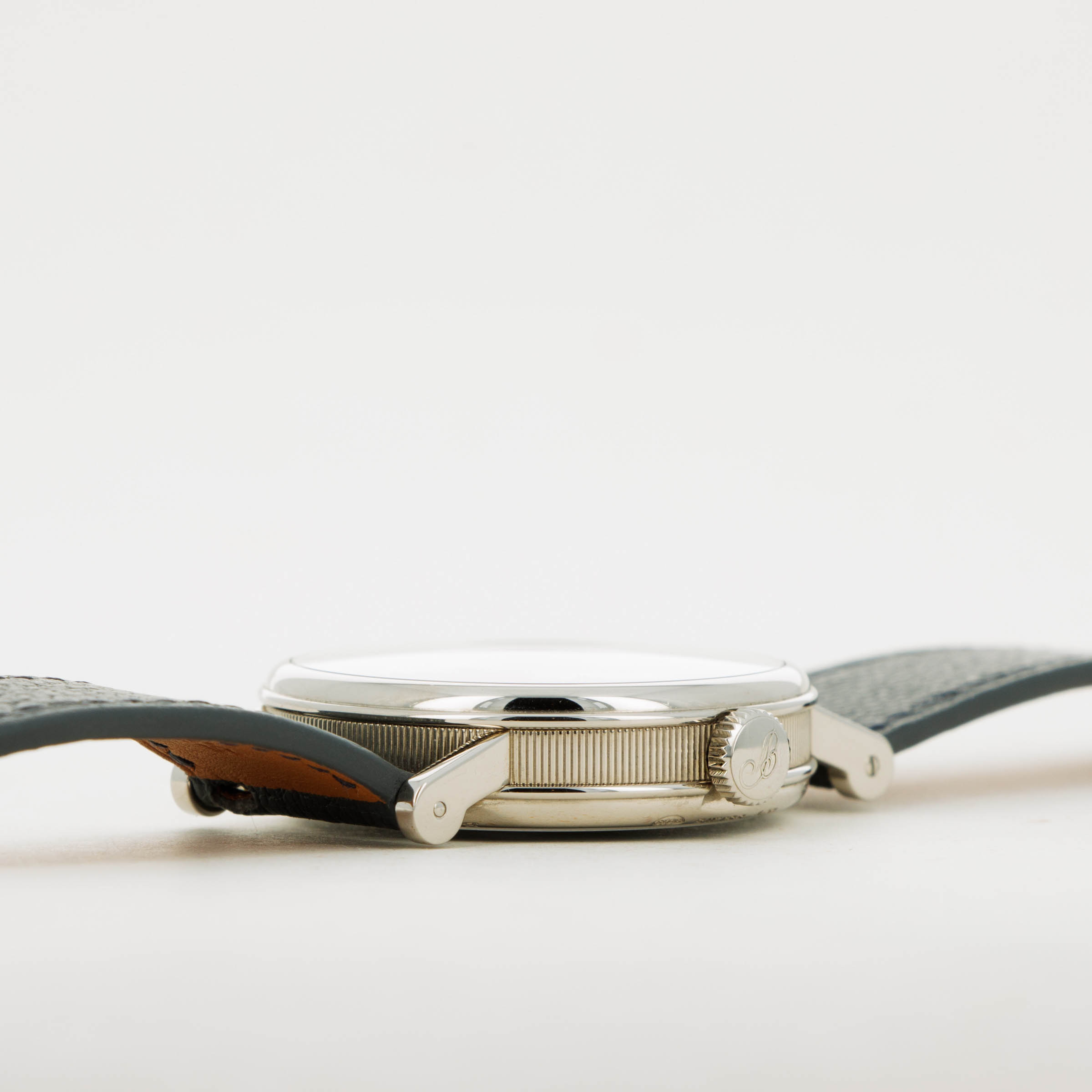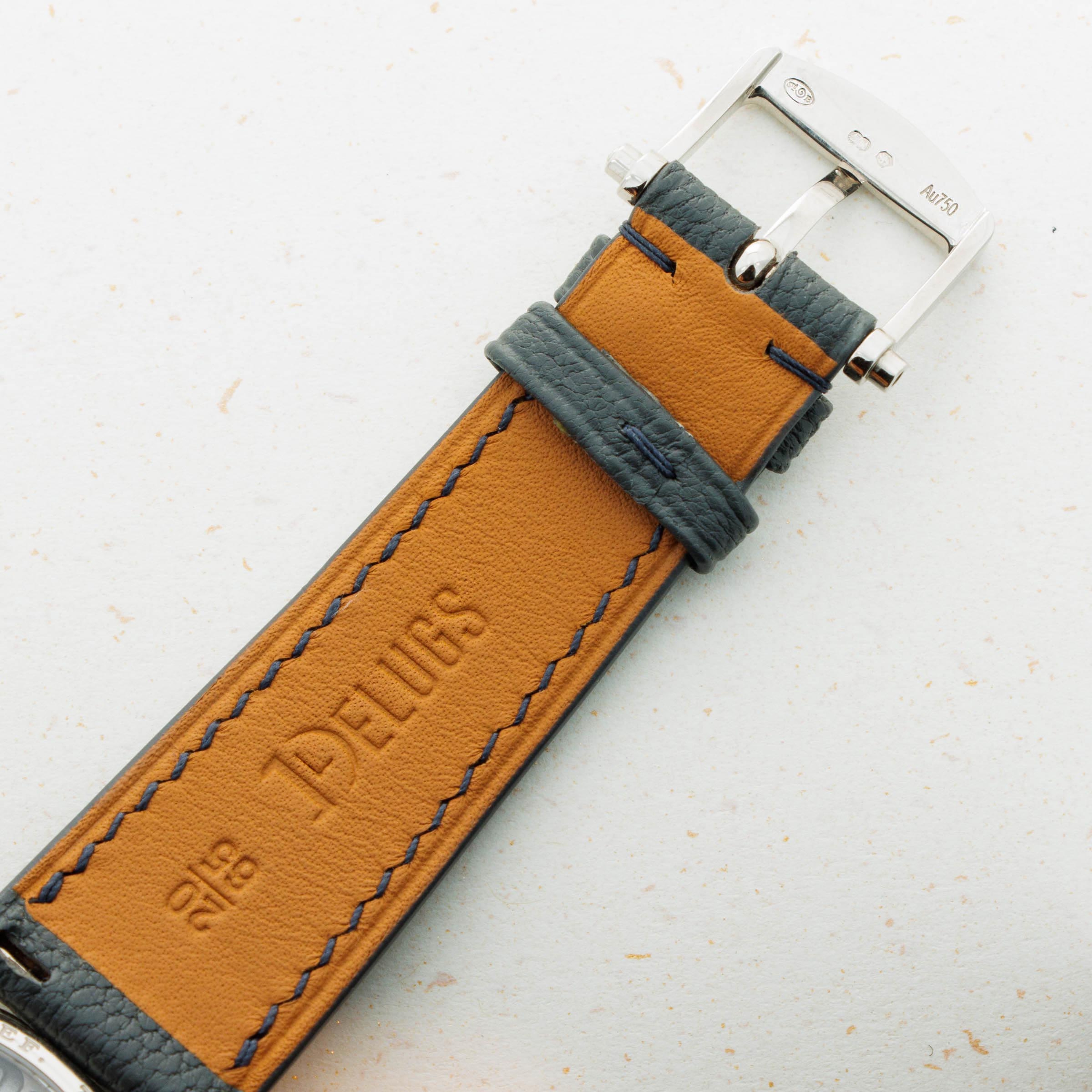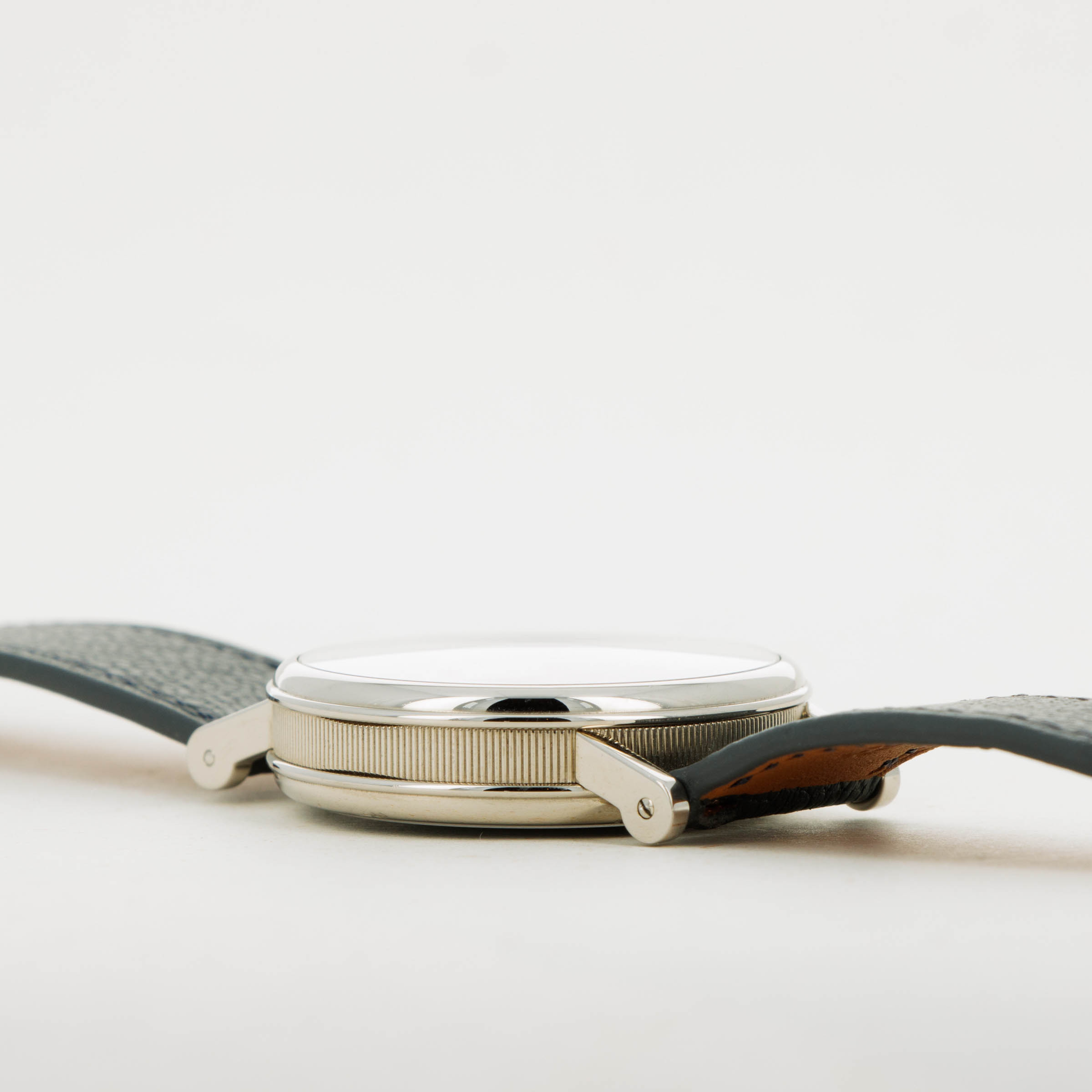 Watch is in overall near mint condition, appearing to have been only sparingly worn over the years. No major damage visible, only light sings of surface wear evident. The original strap has been replaced with an aftermarket one finished in french calf. Original buckle is included with the watch, as are the box and original paperwork.