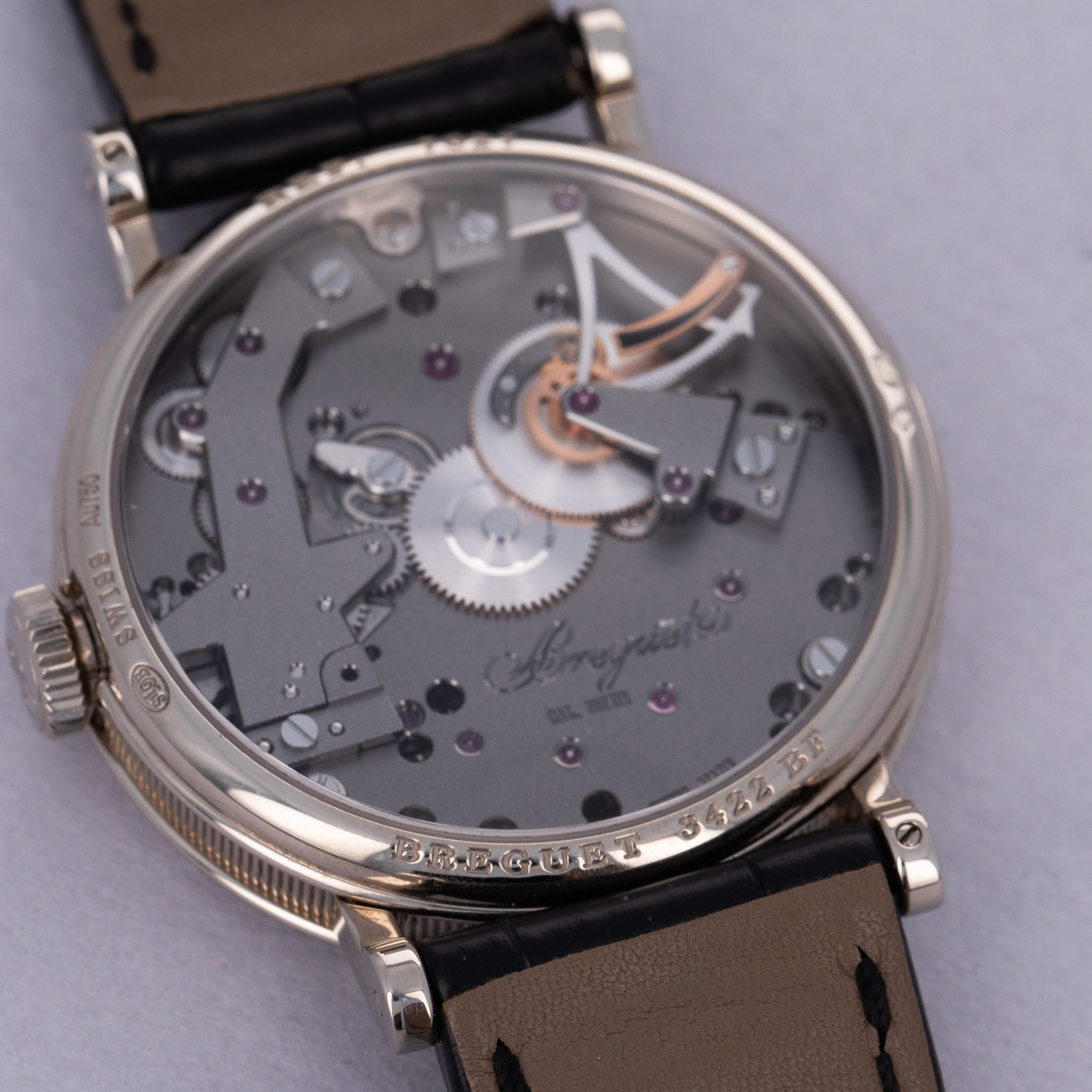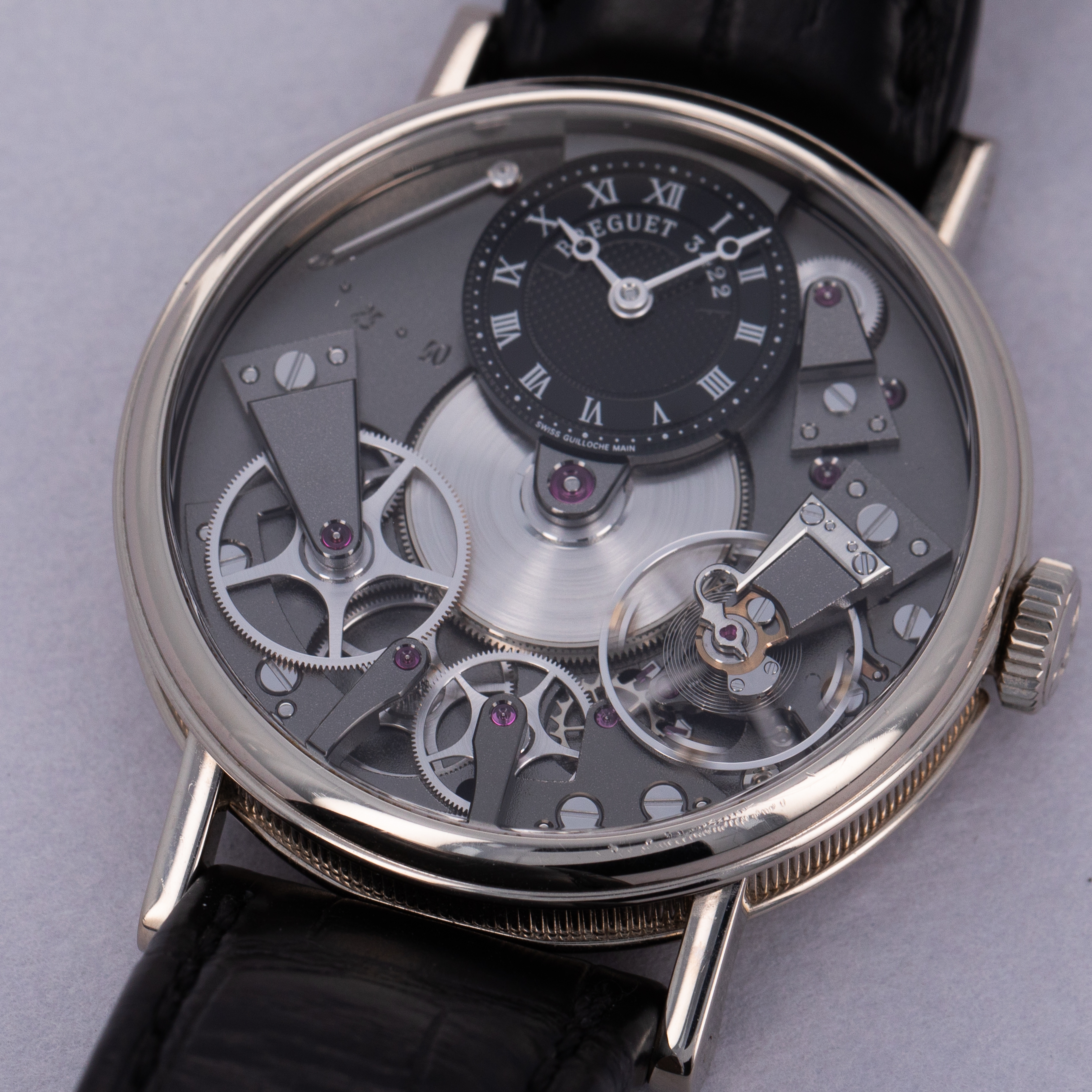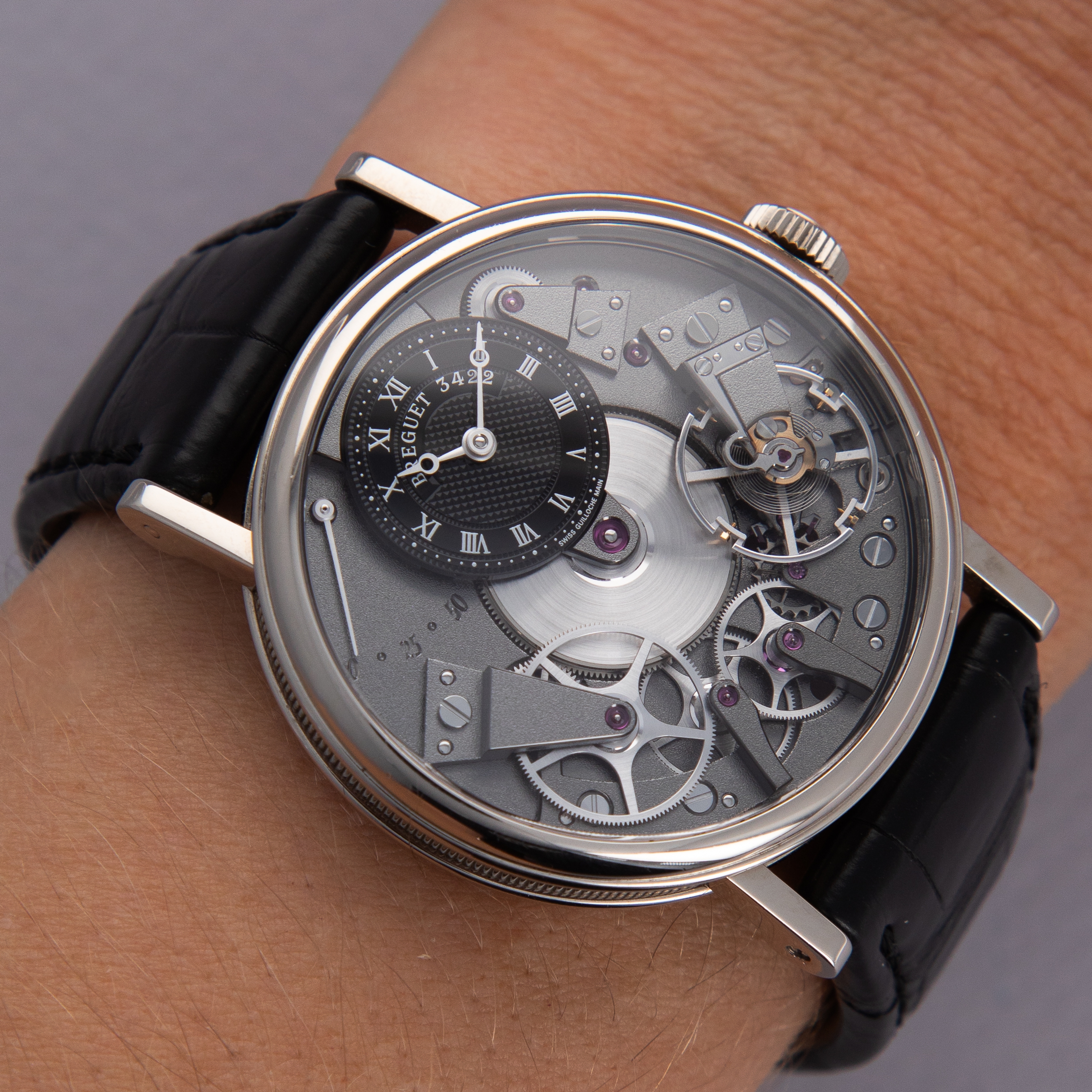 Launched in 2005 and drawing inspiration from their long heritage as a fine watch manufacturer, Breguet revealed the La Tradition collection. Rooted in the aesthetic of their early pocketwatches, the La Tradition celebrates the majesty of mechanical watchmaking by revealing the majority of its movement on the dial side of the watch by using a small dial that only obscures a very small portion of the movement. Creating a rather avant-garde aesthetic, the La Tradition brings attention to Breguet’s incredible craftsmanship with its finely finished movement on display behind both sides of its case. Powered by the manual-wind cal. 507 DR, the ref. 7027BB that we have here is rather monochromatic in execution thanks to its anthracite movement, black engine-turned dial and 18kt white gold case. Contrasting its avant-garde display is a rather classical 37mm case with a coin-edge textured mid-case and fairly straight soldered lugs and a gently domed bezel that all combine to give the La Tradition a classic look that appeals to Breguet’s traditionally conservative styling.