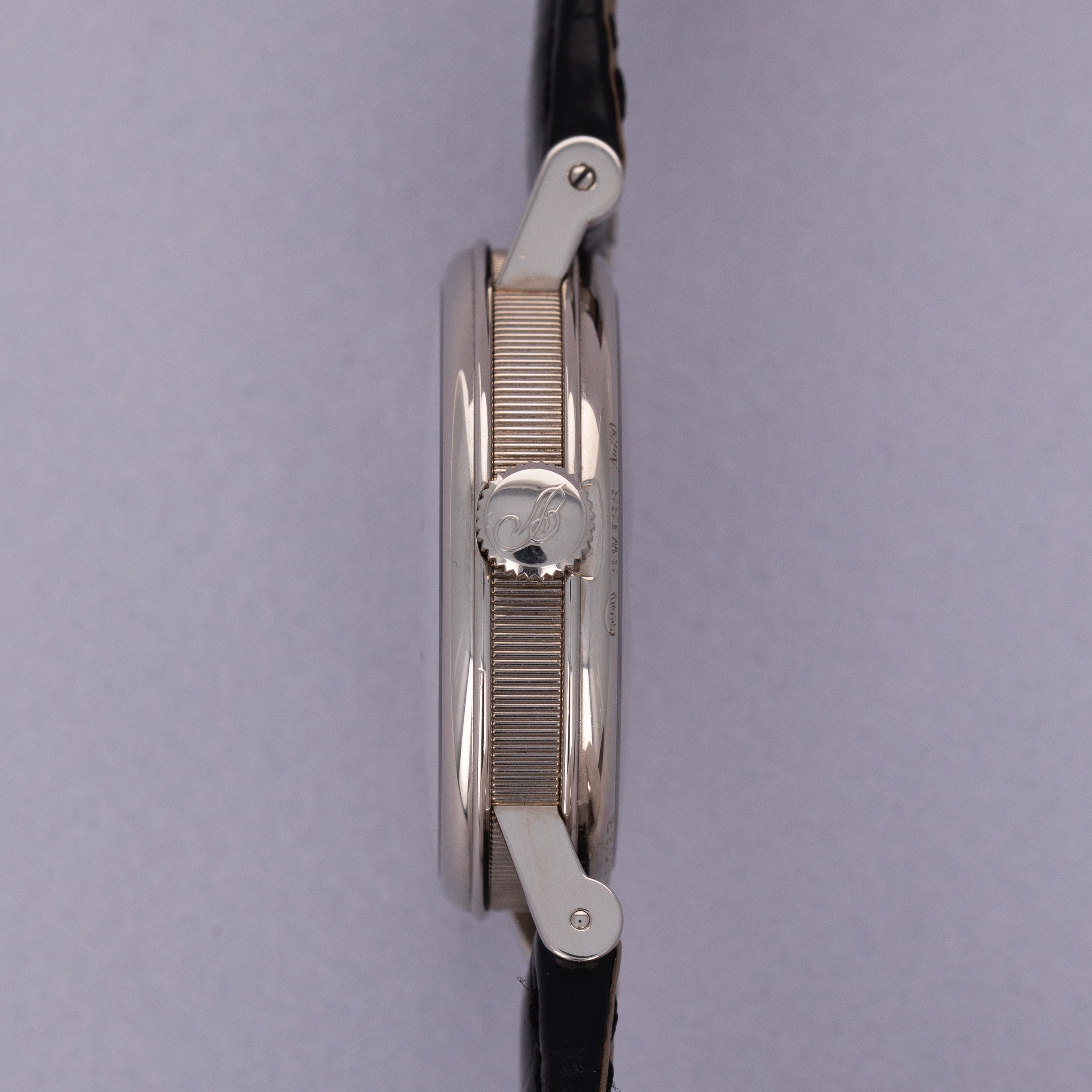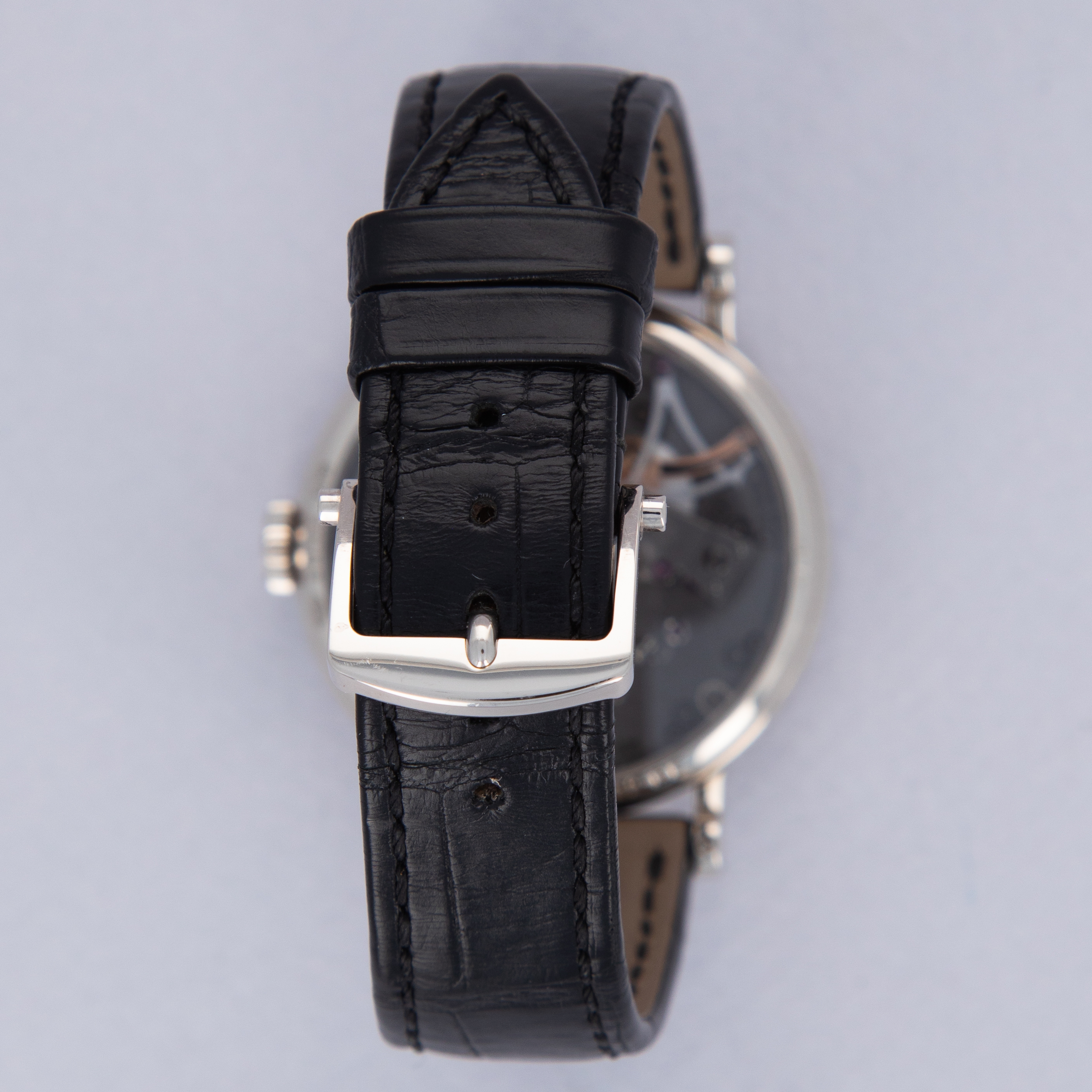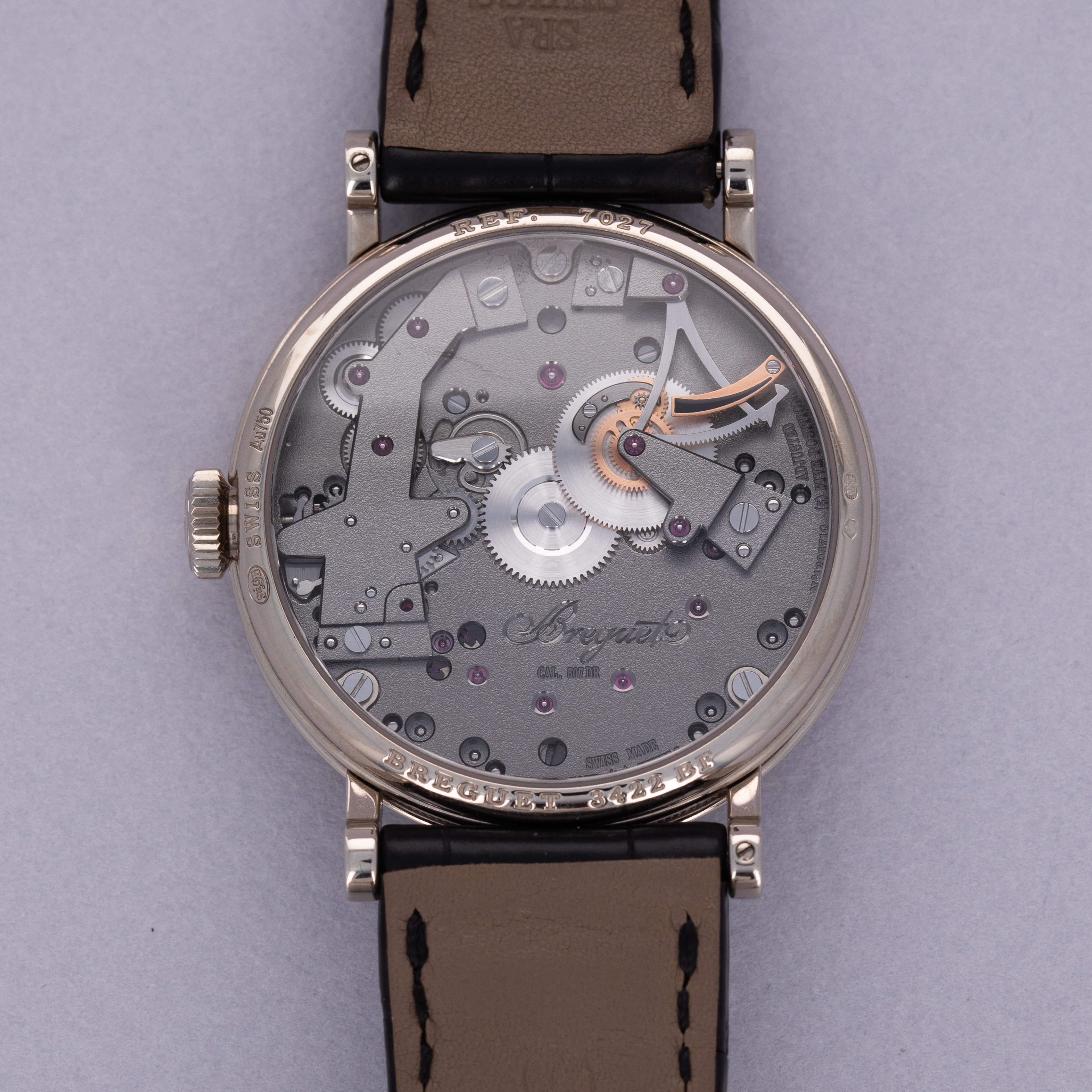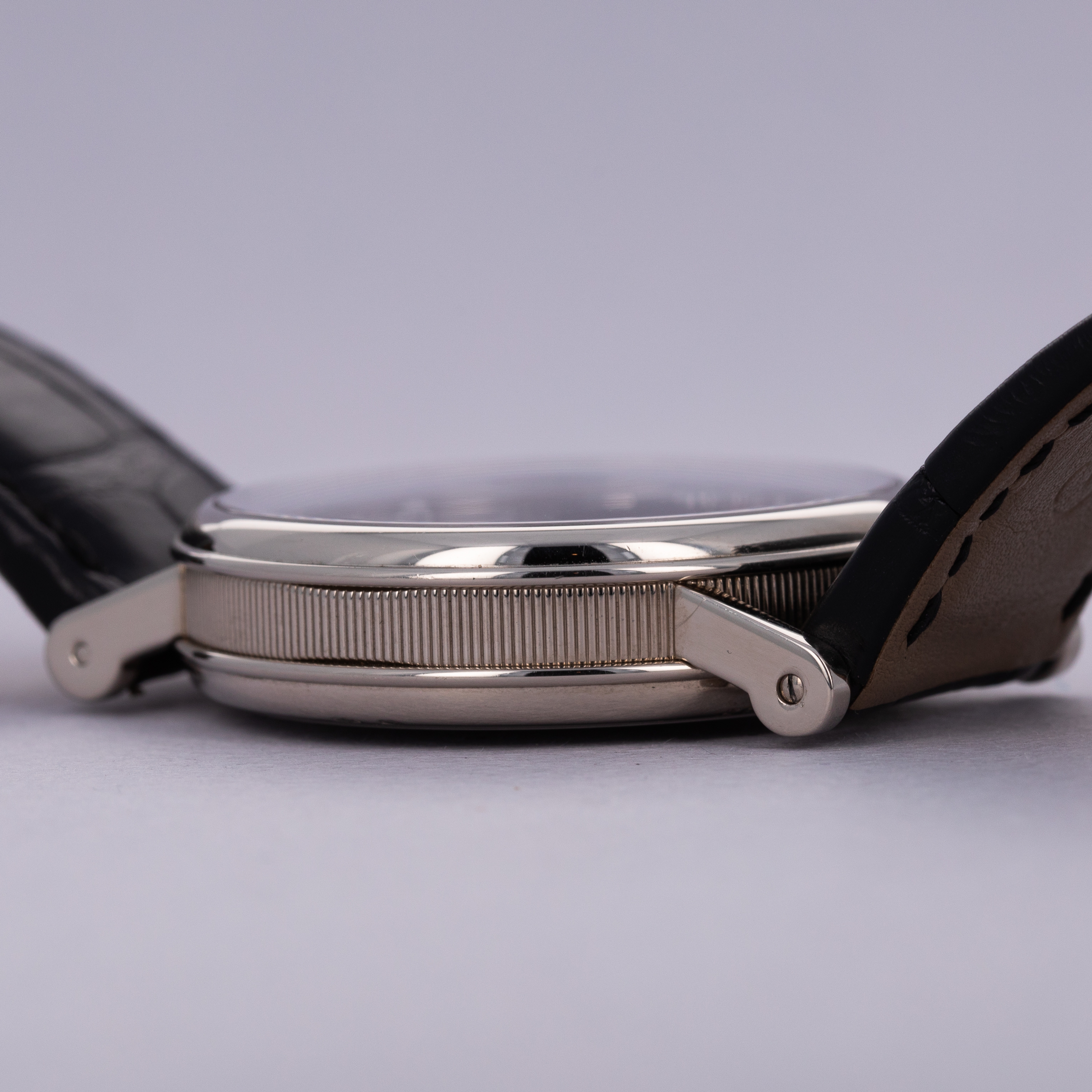 Launched in 2005 and drawing inspiration from their long heritage as a fine watch manufacturer, Breguet revealed the La Tradition collection. Rooted in the aesthetic of their early pocketwatches, the La Tradition celebrates the majesty of mechanical watchmaking by revealing the majority of its movement on the dial side of the watch by using a small dial that only obscures a very small portion of the movement. Creating a rather avant-garde aesthetic, the La Tradition brings attention to Breguet’s incredible craftsmanship with its finely finished movement on display behind both sides of its case. Powered by the manual-wind cal. 507 DR, the ref. 7027BB that we have here is rather monochromatic in execution thanks to its anthracite movement, black engine-turned dial and 18kt white gold case. Contrasting its avant-garde display is a rather classical 37mm case with a coin-edge textured mid-case and fairly straight soldered lugs and a gently domed bezel that all combine to give the La Tradition a classic look that appeals to Breguet’s traditionally conservative styling.