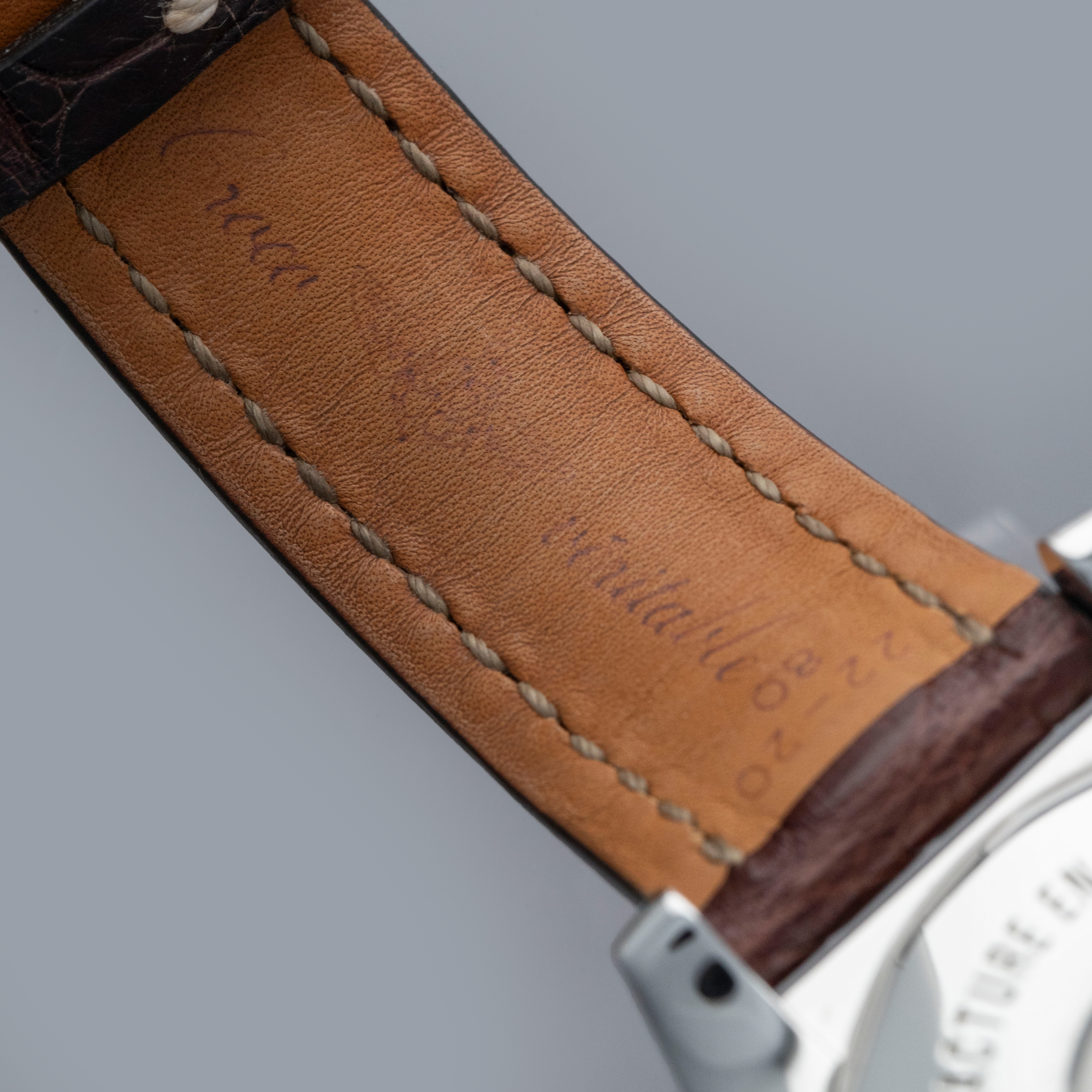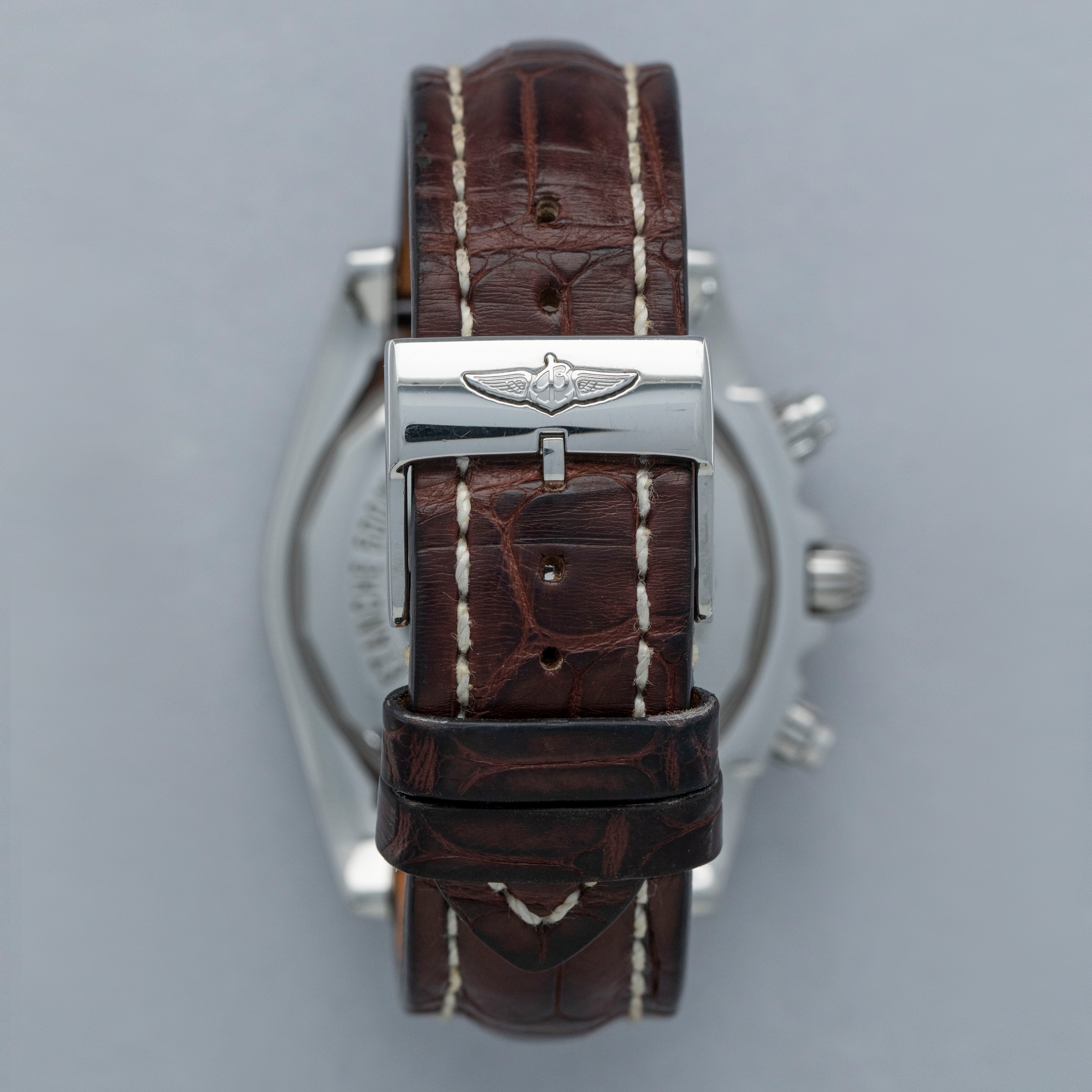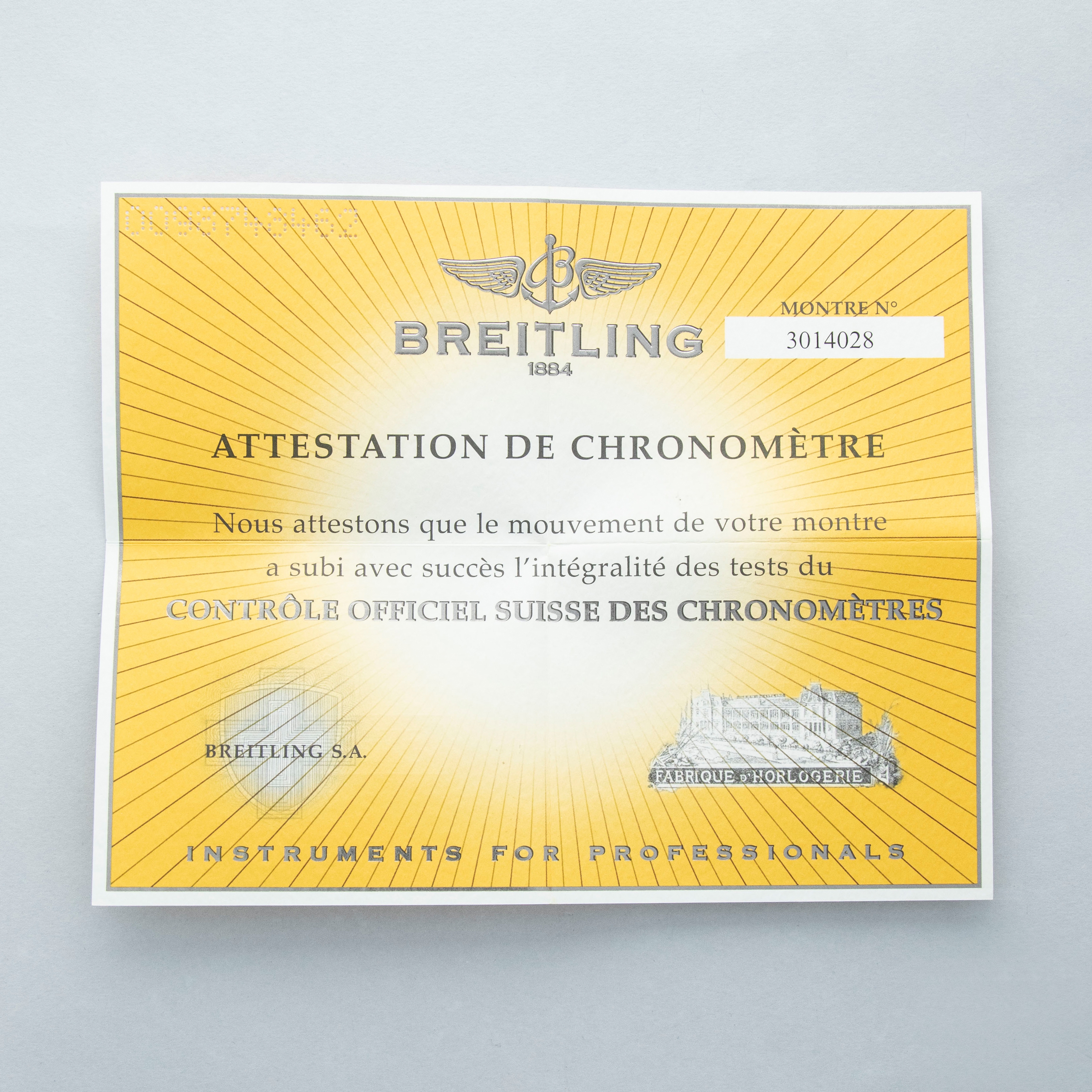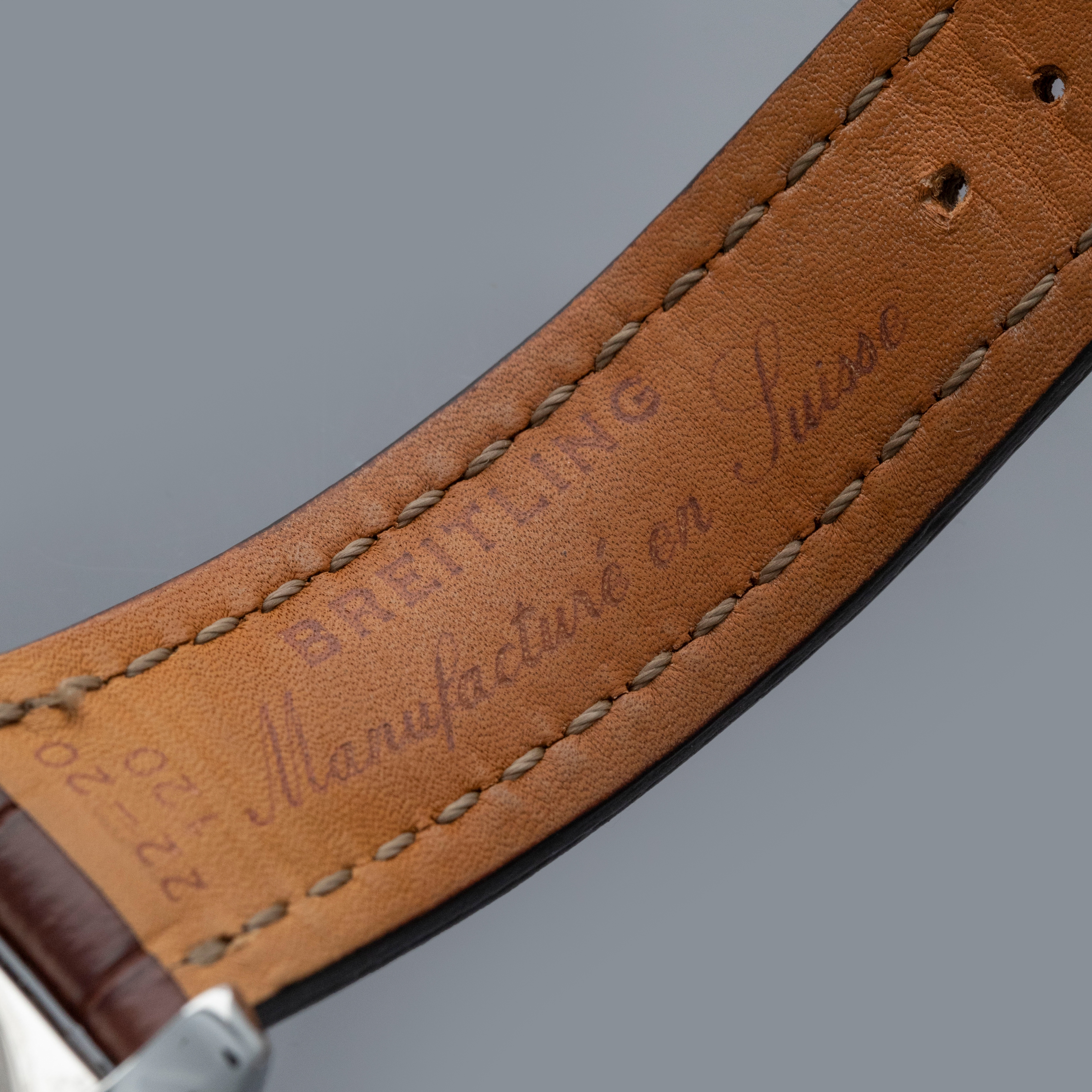 Watch is in overall excellent condition. The steel case shows some marks and scratches from wear, particularly on the inner bezel and on the rotating bezel. The case back has deep engravings and further wear marks. The dial is near mint and the hands are very clean. It is fitted with a Breitling crocodile strap and steel pin buckle in excellent condition. Comes with inner and outer boxes, guarantee, chronometer certificate, booklet and document holder.