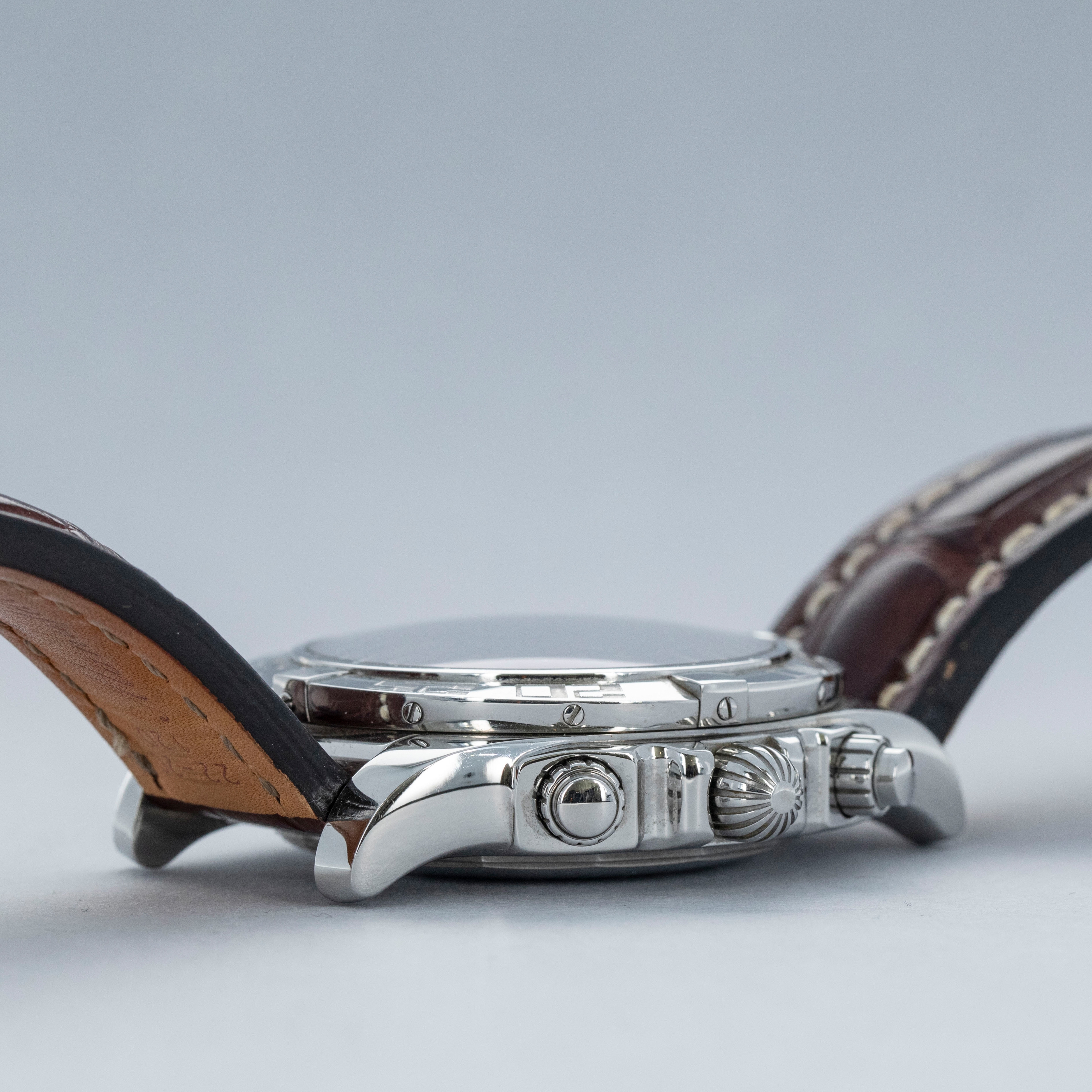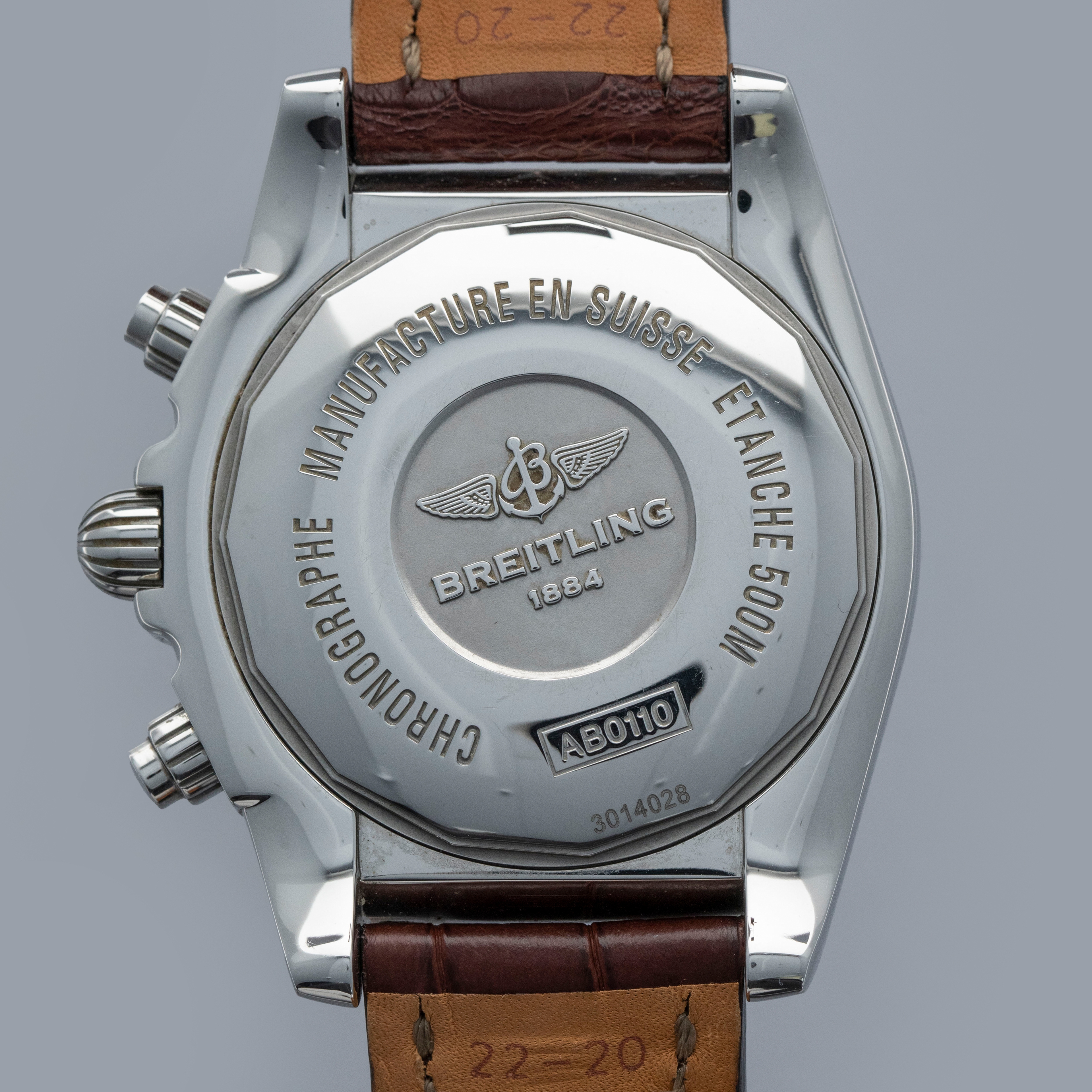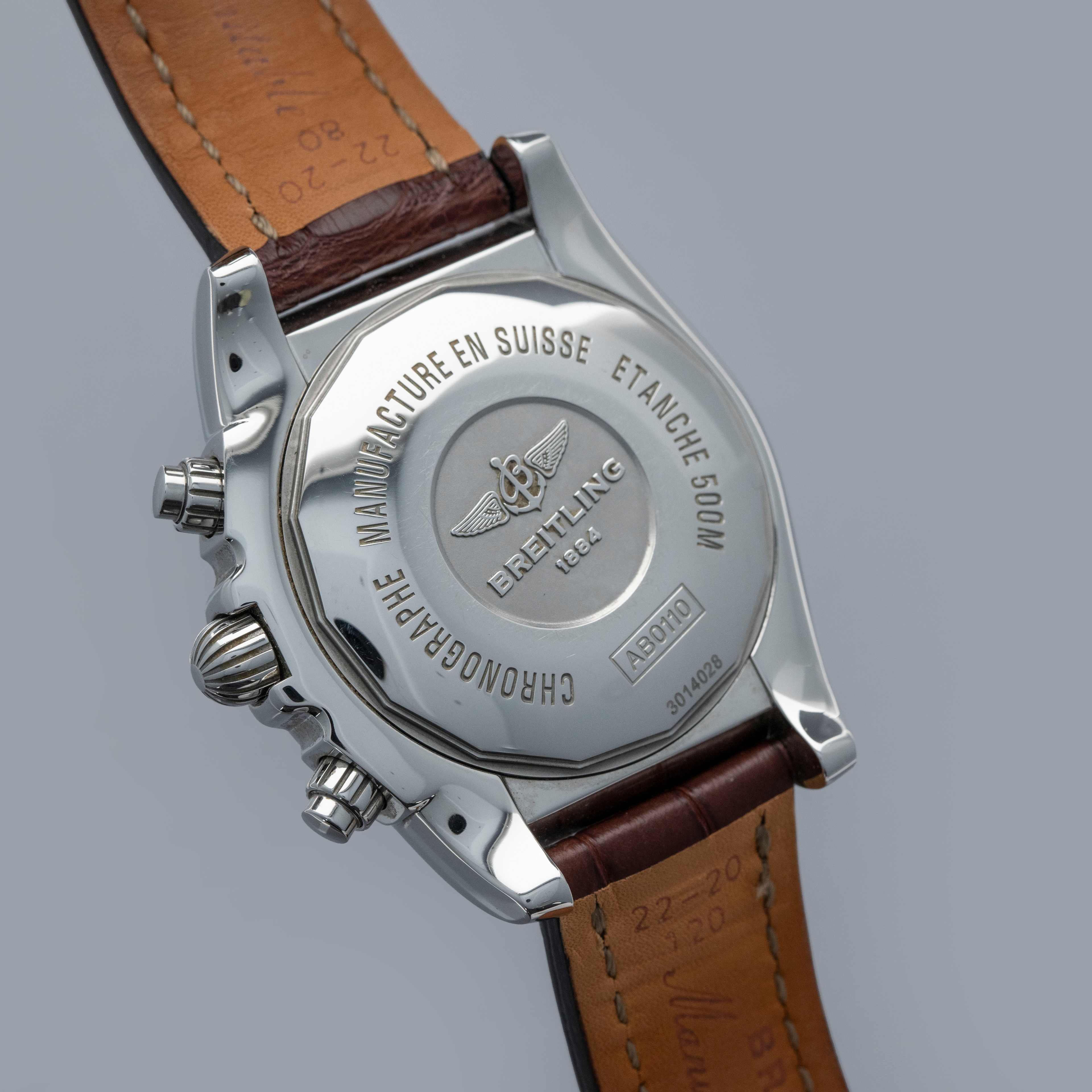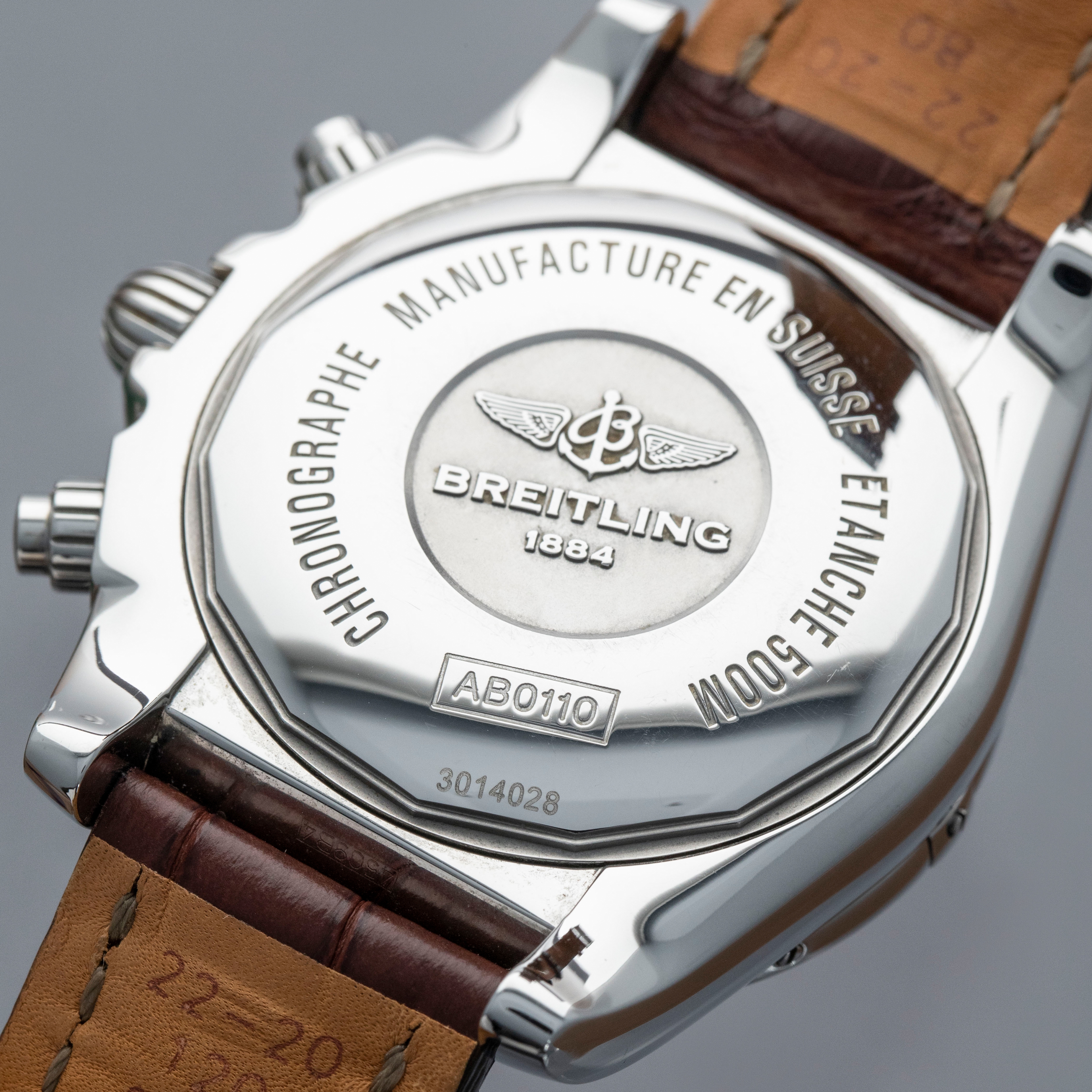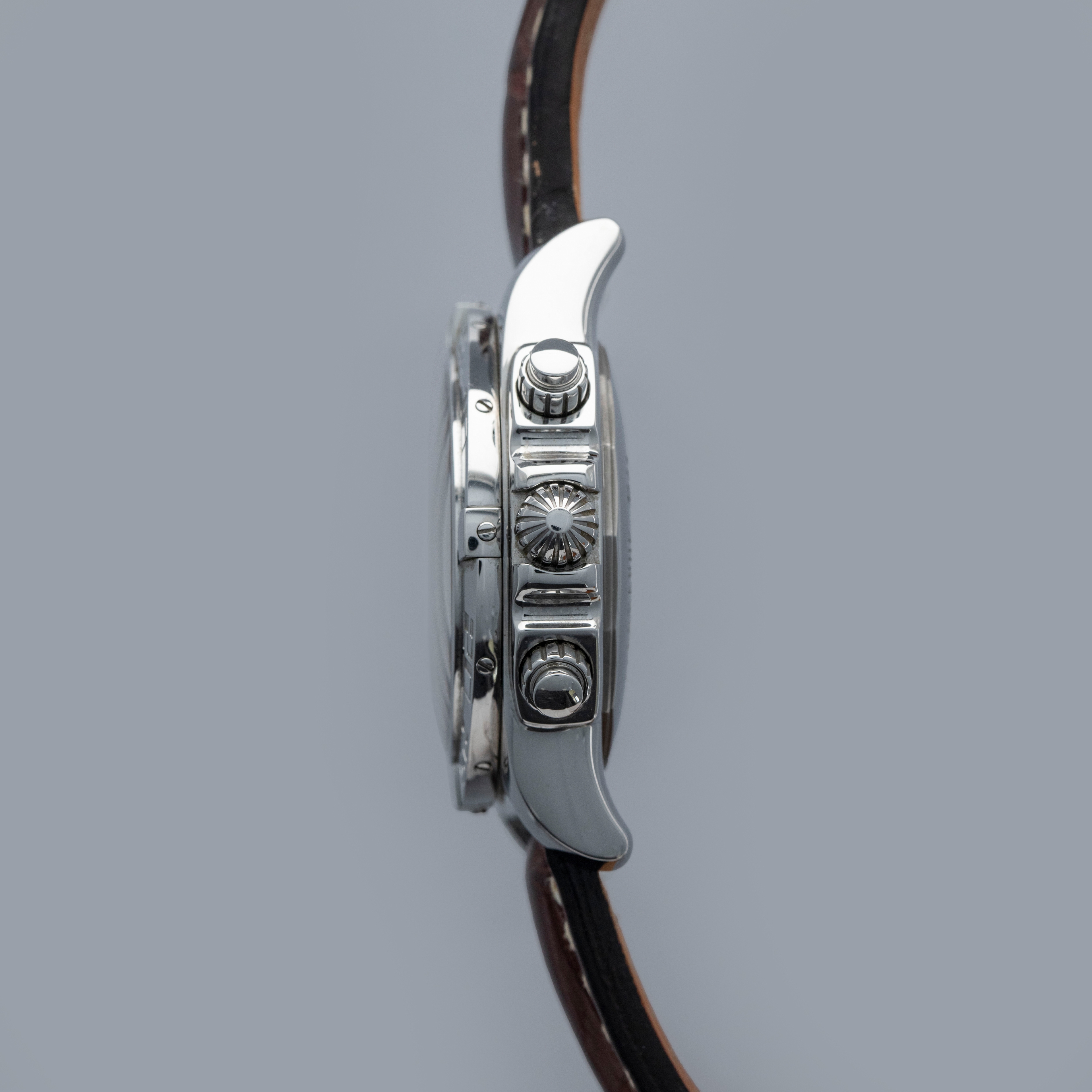 Watch is in overall excellent condition. The steel case shows some marks and scratches from wear, particularly on the inner bezel and on the rotating bezel. The case back has deep engravings and further wear marks. The dial is near mint and the hands are very clean. It is fitted with a Breitling crocodile strap and steel pin buckle in excellent condition. Comes with inner and outer boxes, guarantee, chronometer certificate, booklet and document holder.
